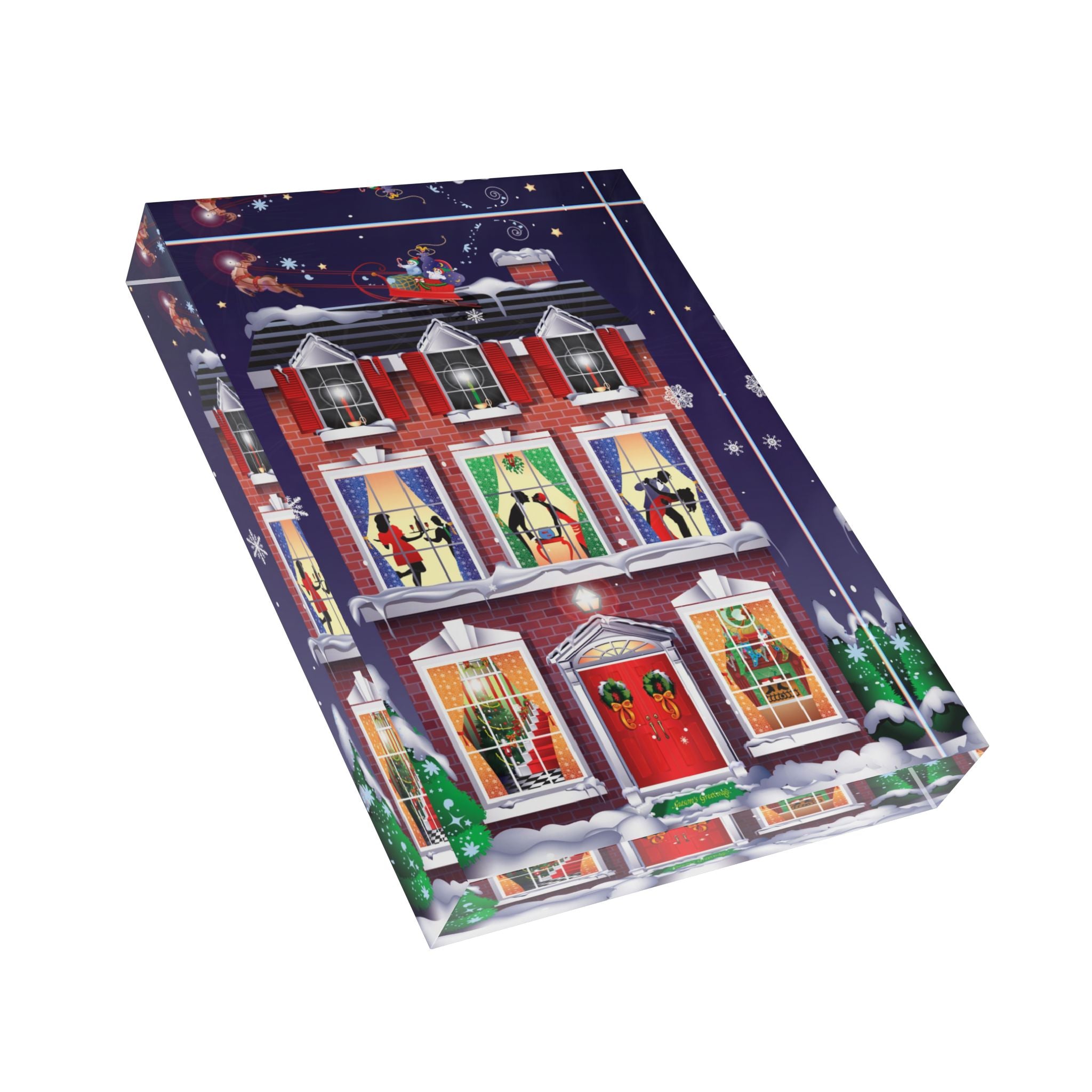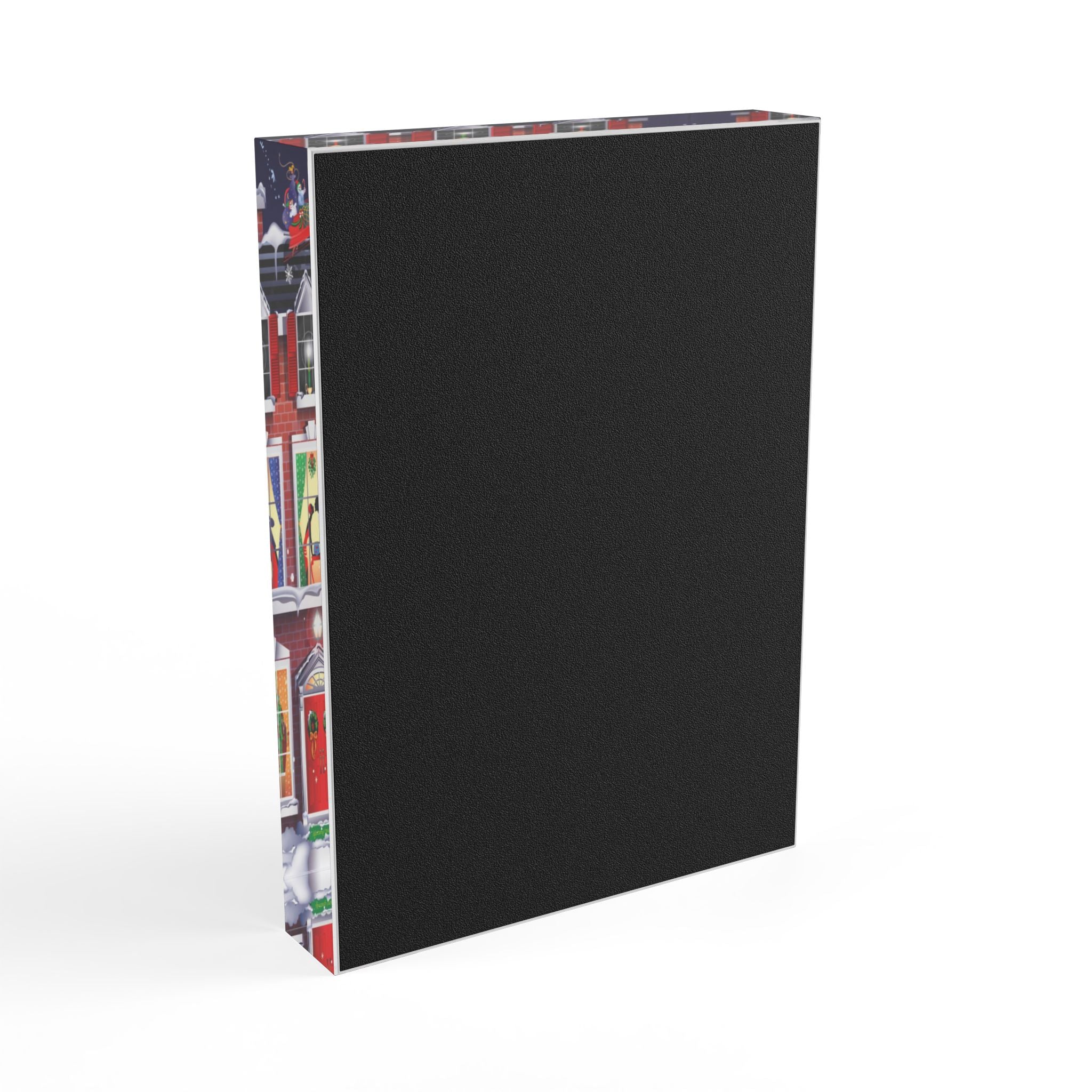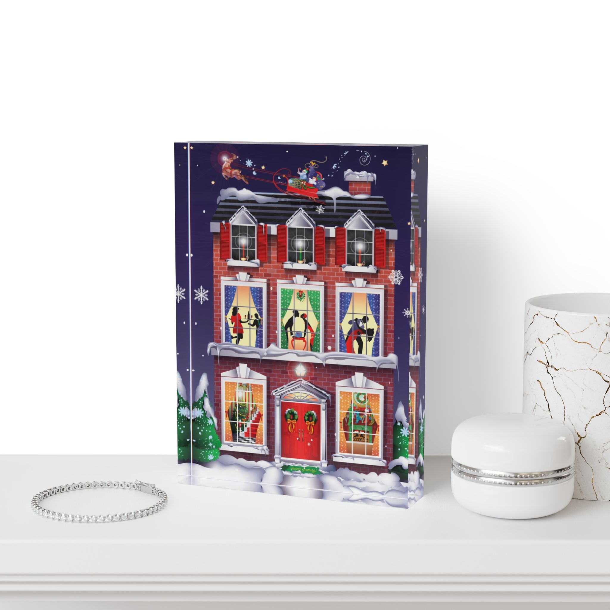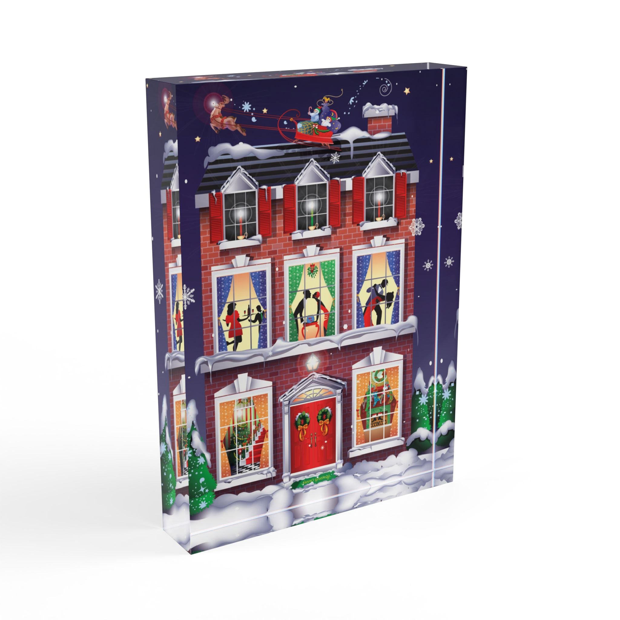 Add a touch of holiday magic to your home with this acrylic art block, designed to uplift any space with festive charm. Printed with the AcryliPrint®HD process, the glossy surface shines like fresh snow on the townhouse rooftop, while the sturdy acrylic build reflects light as beautifully as the candles glowing in its windows.