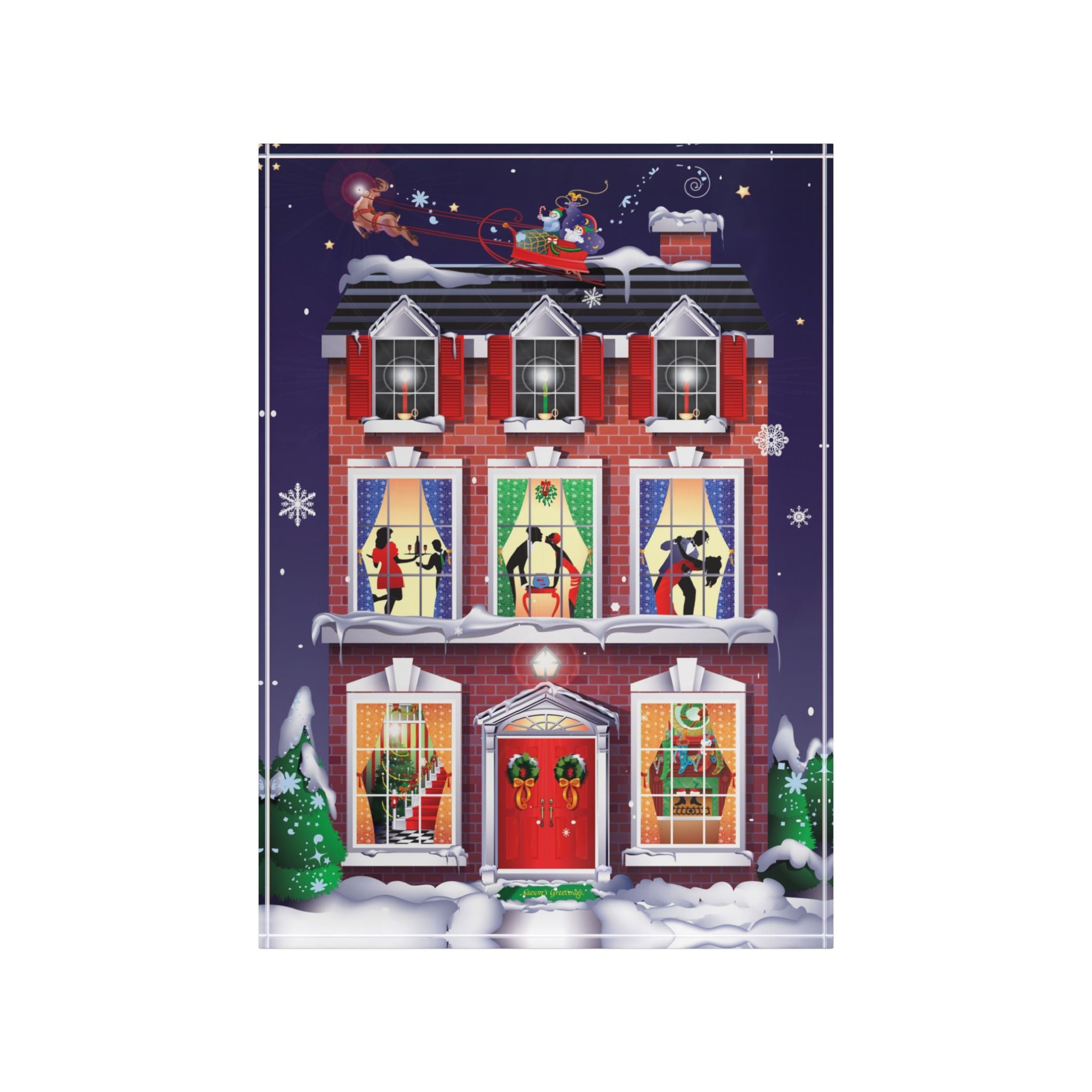 The artwork transforms the block into a glowing centerpiece: Santa and his sleigh drift across a starry sky, while inside the brick townhouse families dance, share treats, and gather by the fire. Wreaths on the red doors, stockings hung with care, and twinkling lights add layers of detail that sparkle as the block catches the light.