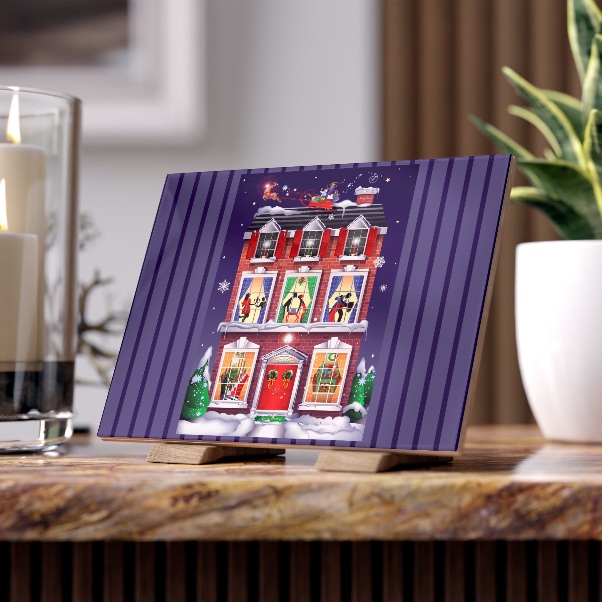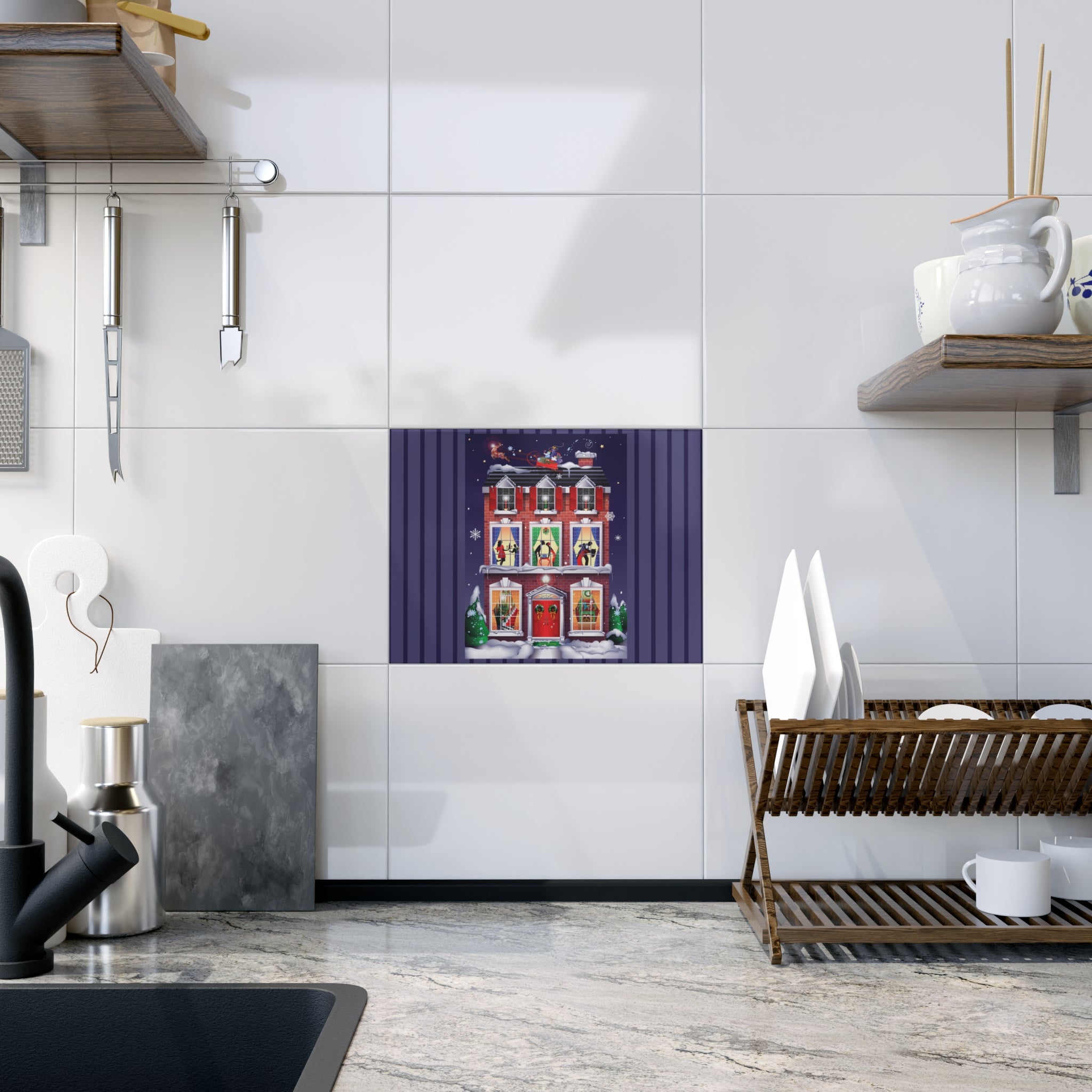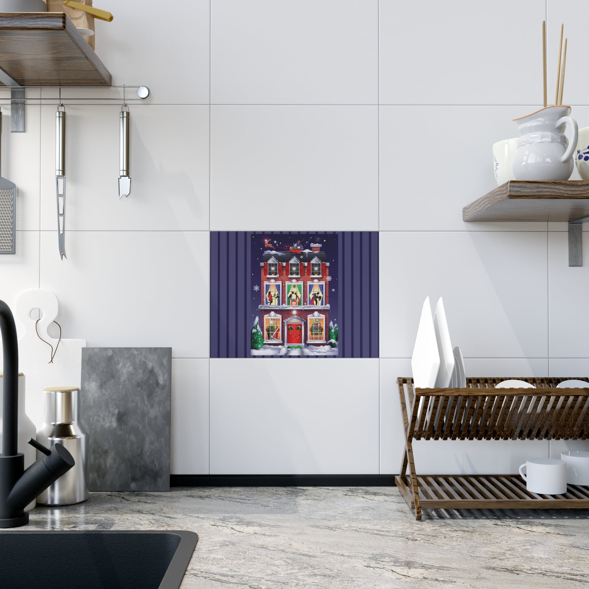 Across the tile, the festive scene comes alive: Santa gliding across a starry night sky, a brick townhouse glowing with warmth, and families inside dancing, sharing treats, and gathering by the fire. Wreaths on the red doors, stockings hung with care, candles glowing in the windows, and twinkling lights all capture the magic of Christmas Eve.