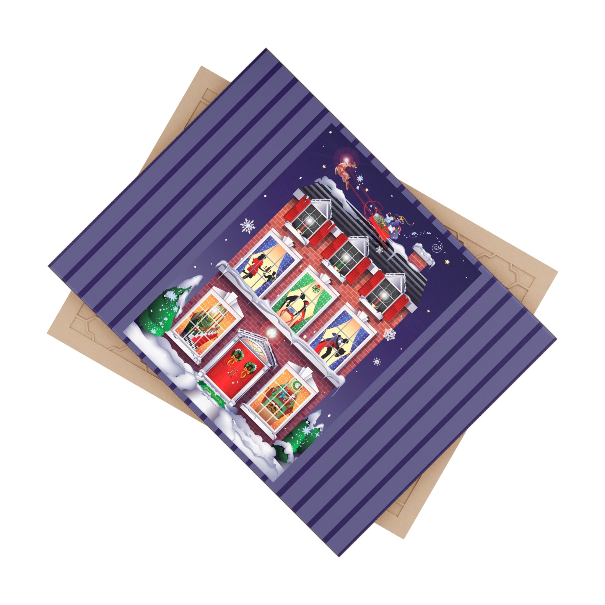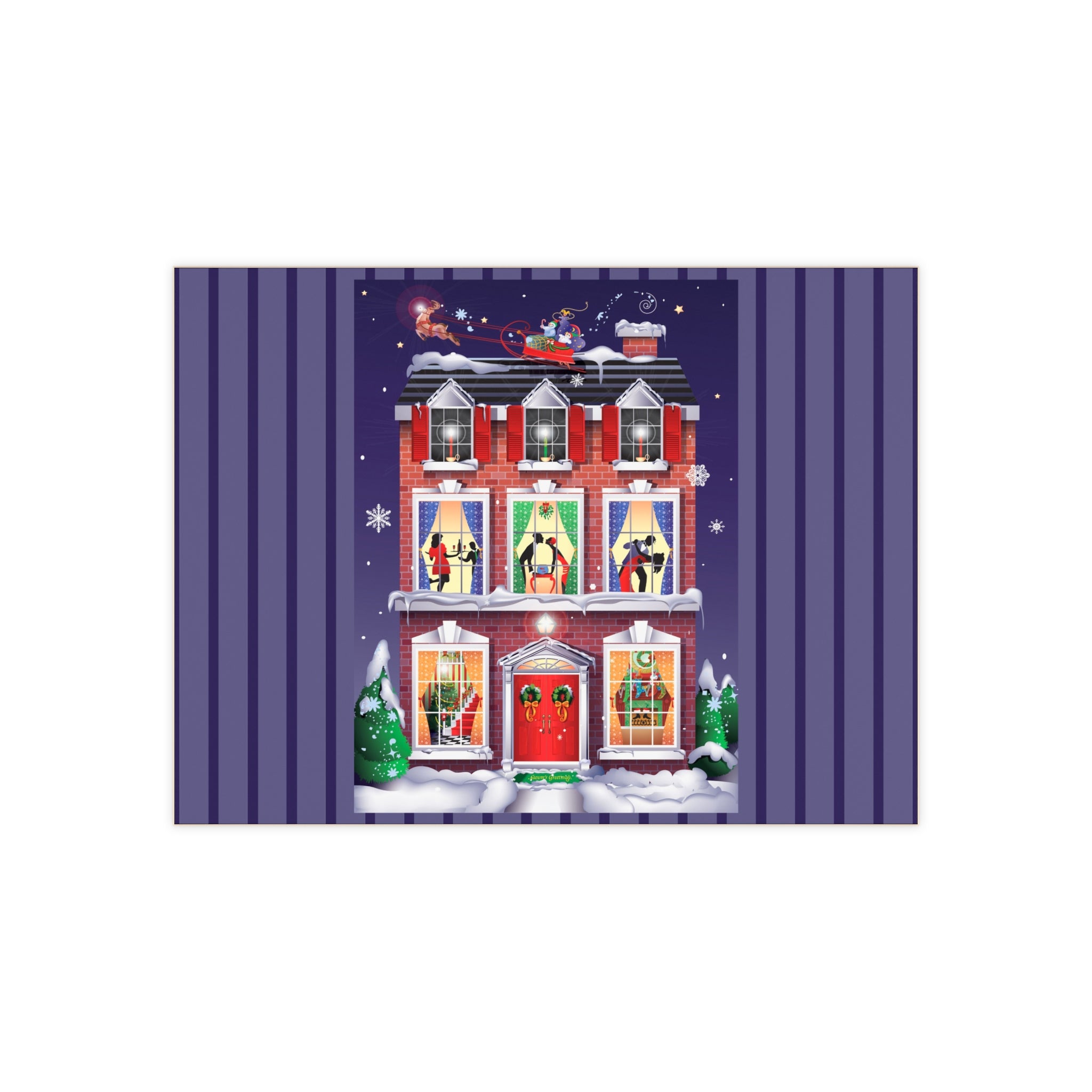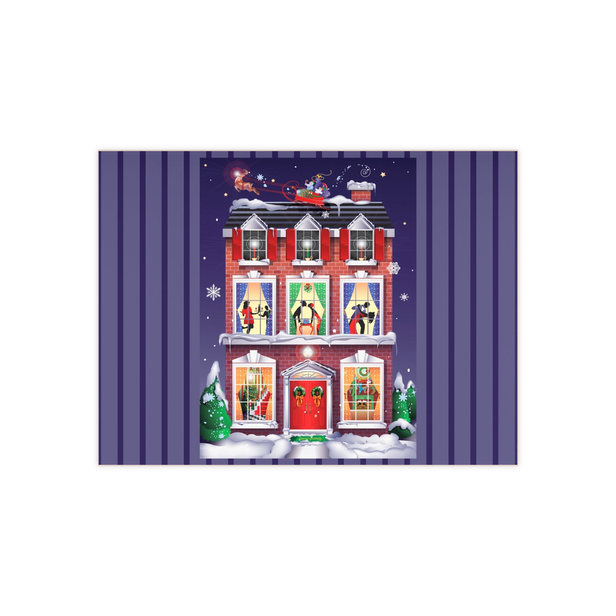 Across the tile, the festive scene comes alive: Santa gliding across a starry night sky, a brick townhouse glowing with warmth, and families inside dancing, sharing treats, and gathering by the fire. Wreaths on the red doors, stockings hung with care, candles glowing in the windows, and twinkling lights all capture the magic of Christmas Eve.
