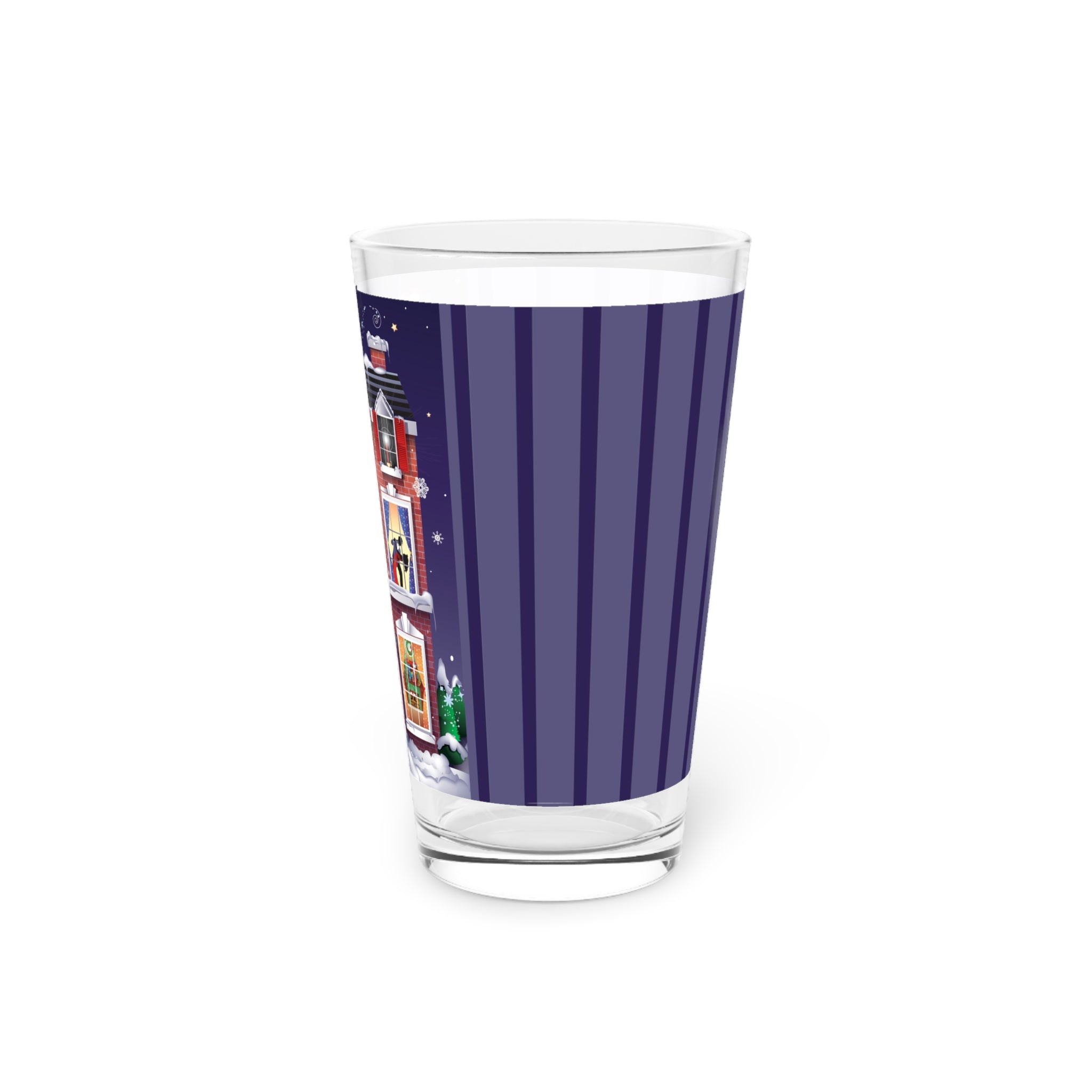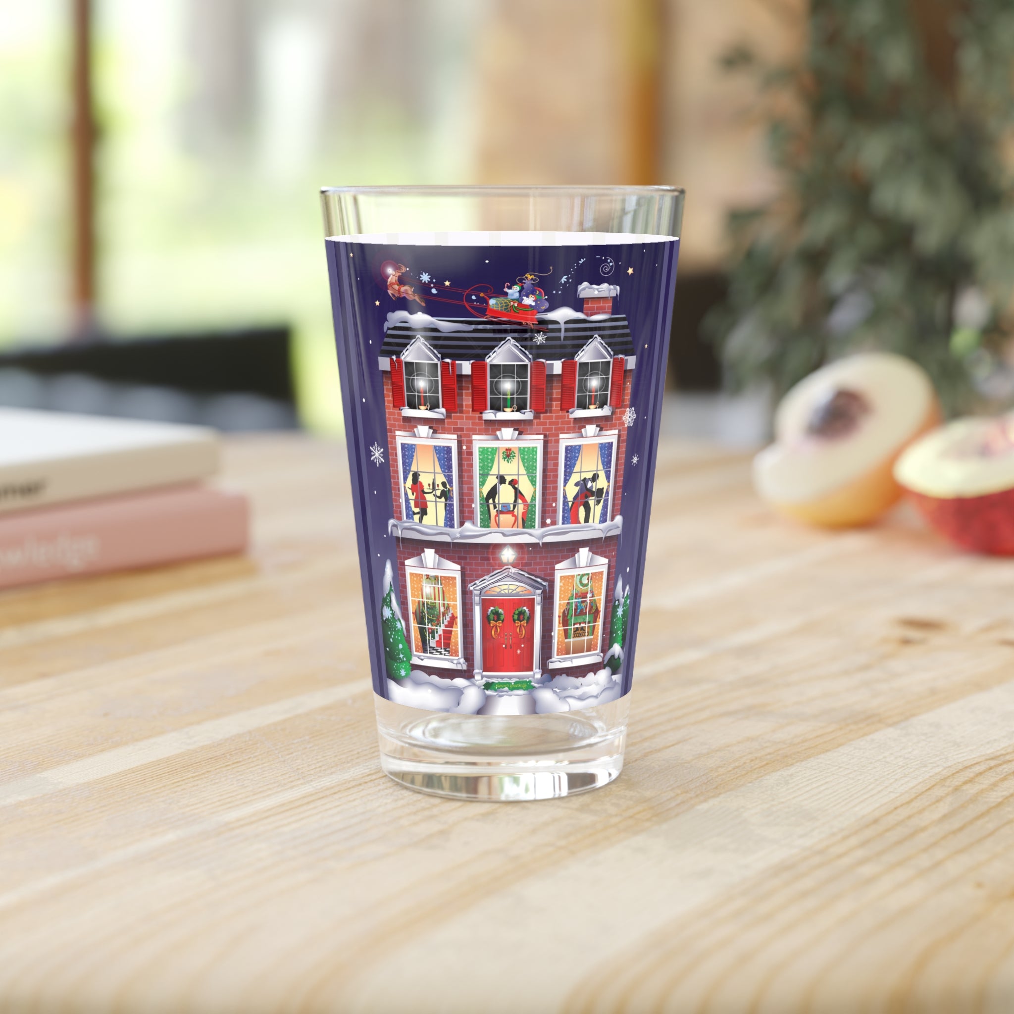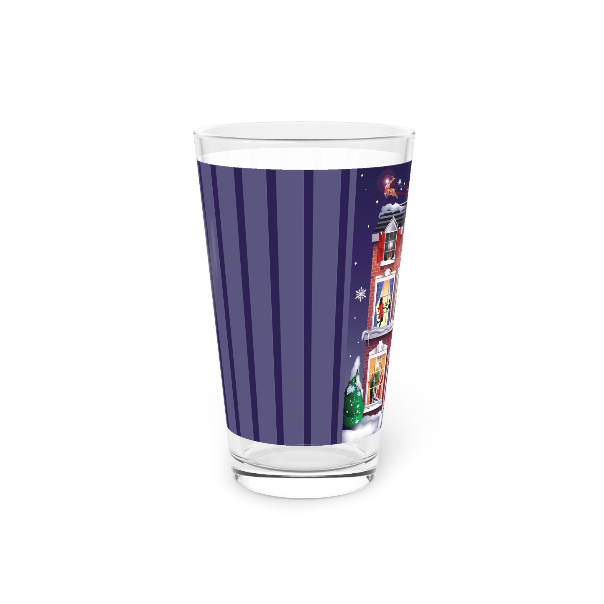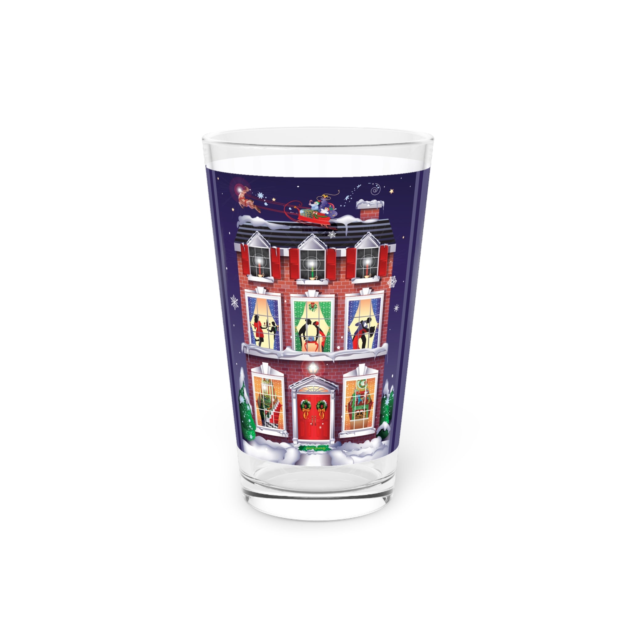 Families can be seen through frosted windows — dancing, sharing treats, and waiting by the fireplace where stockings hang. Each sip highlights new details: wreaths on the red front doors, candles glowing warmly, and a Christmas tree rising along the staircase. Versatile enough for beer, soda, or sparkling water, this durable glass blends everyday use with timeless holiday magic, making it a thoughtful gift and a staple in any home.
