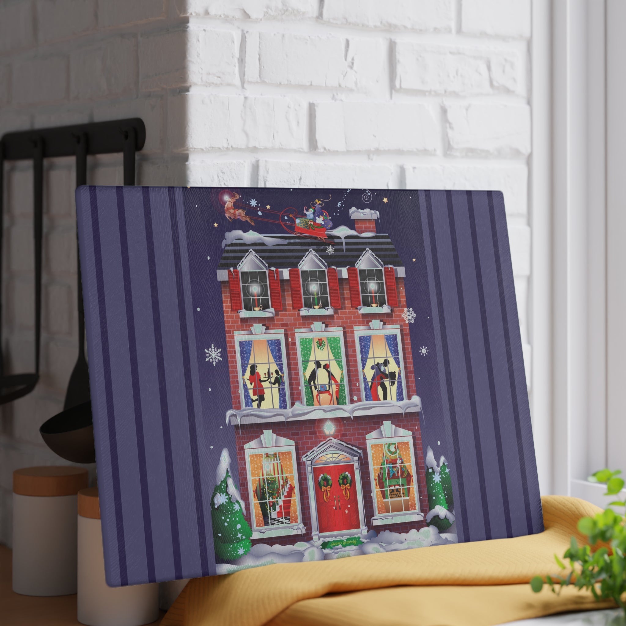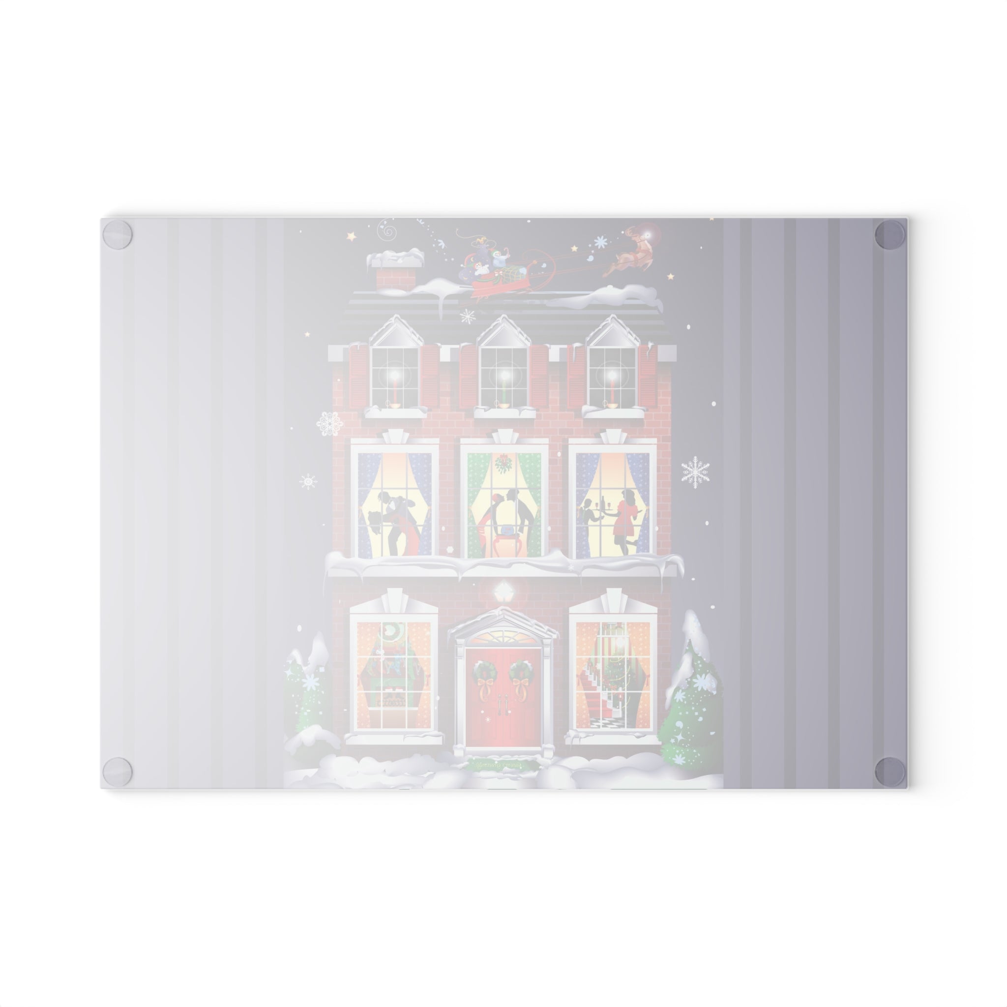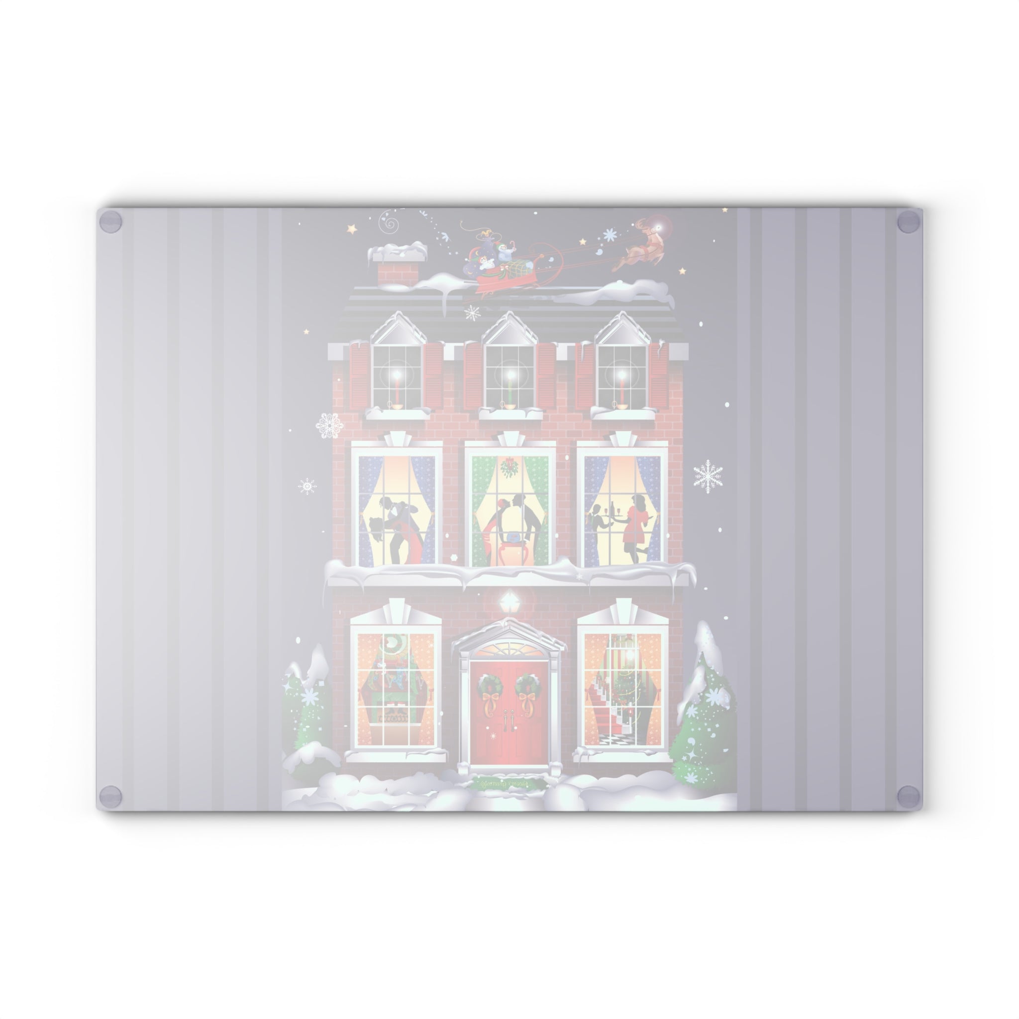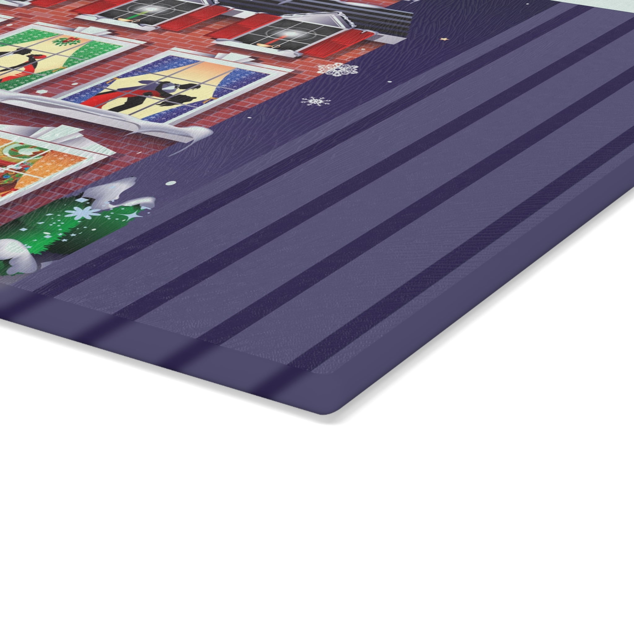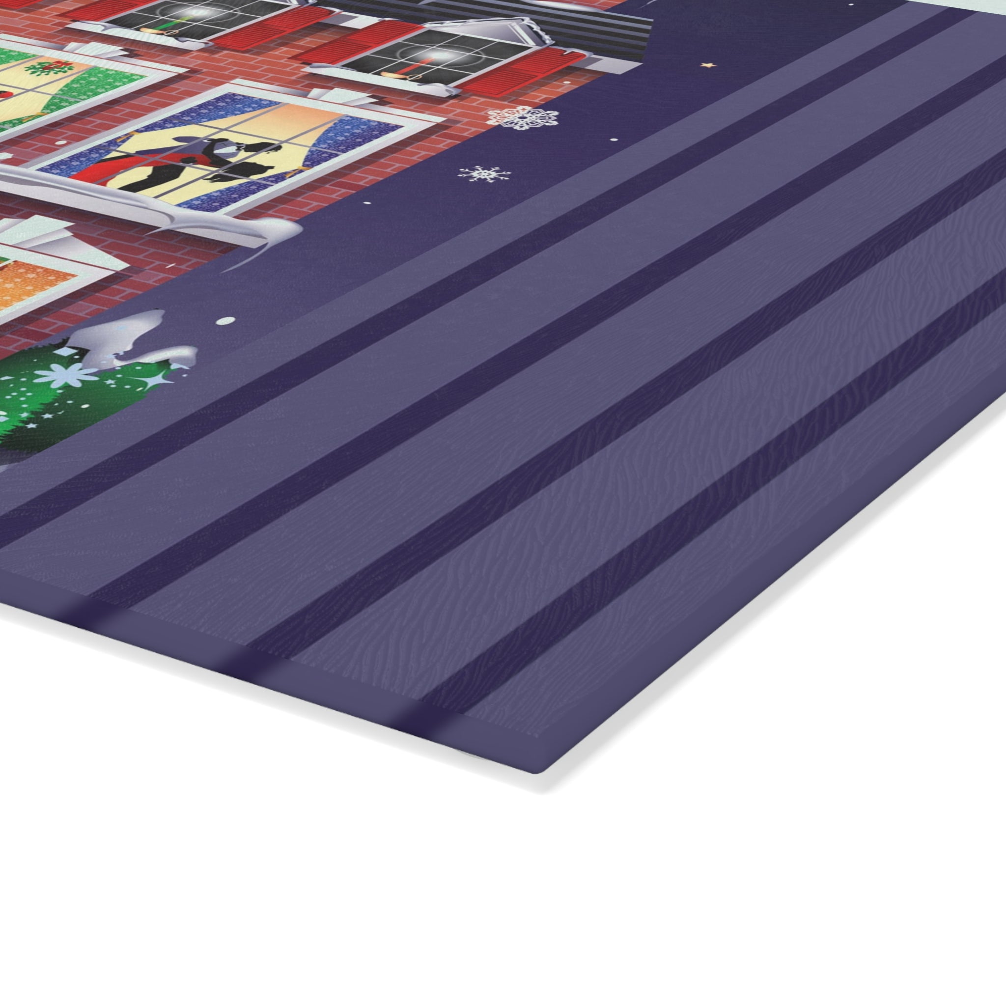Bring festive charm into the heart of your kitchen with this tempered glass cutting board, available in two sizes: 8" x 11" and 11" x 15". Its durable build is as sturdy as the snow-covered brick townhouse in the design, while the textured surface makes chopping and slicing as reliable as the wreaths and stockings neatly in place by the fire.