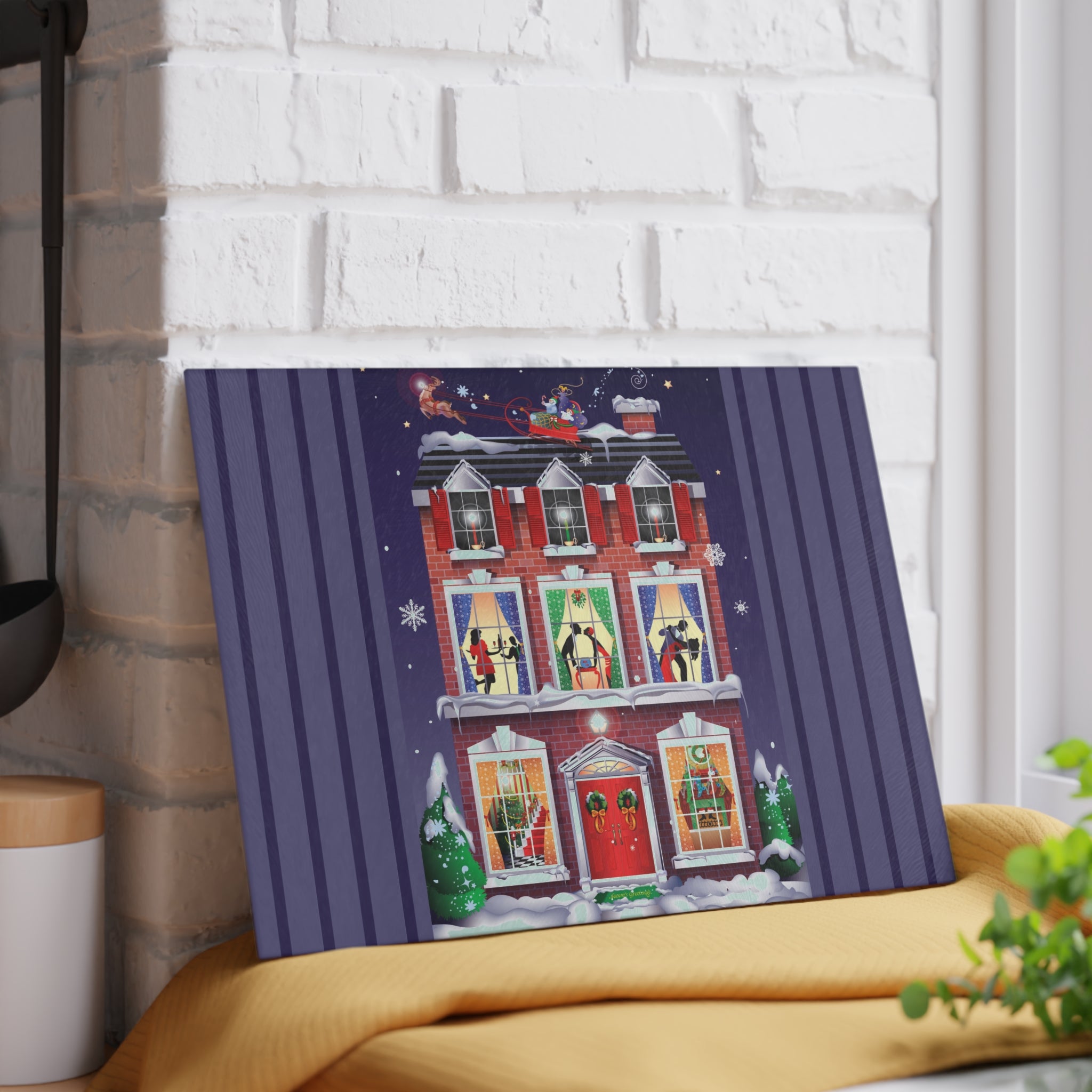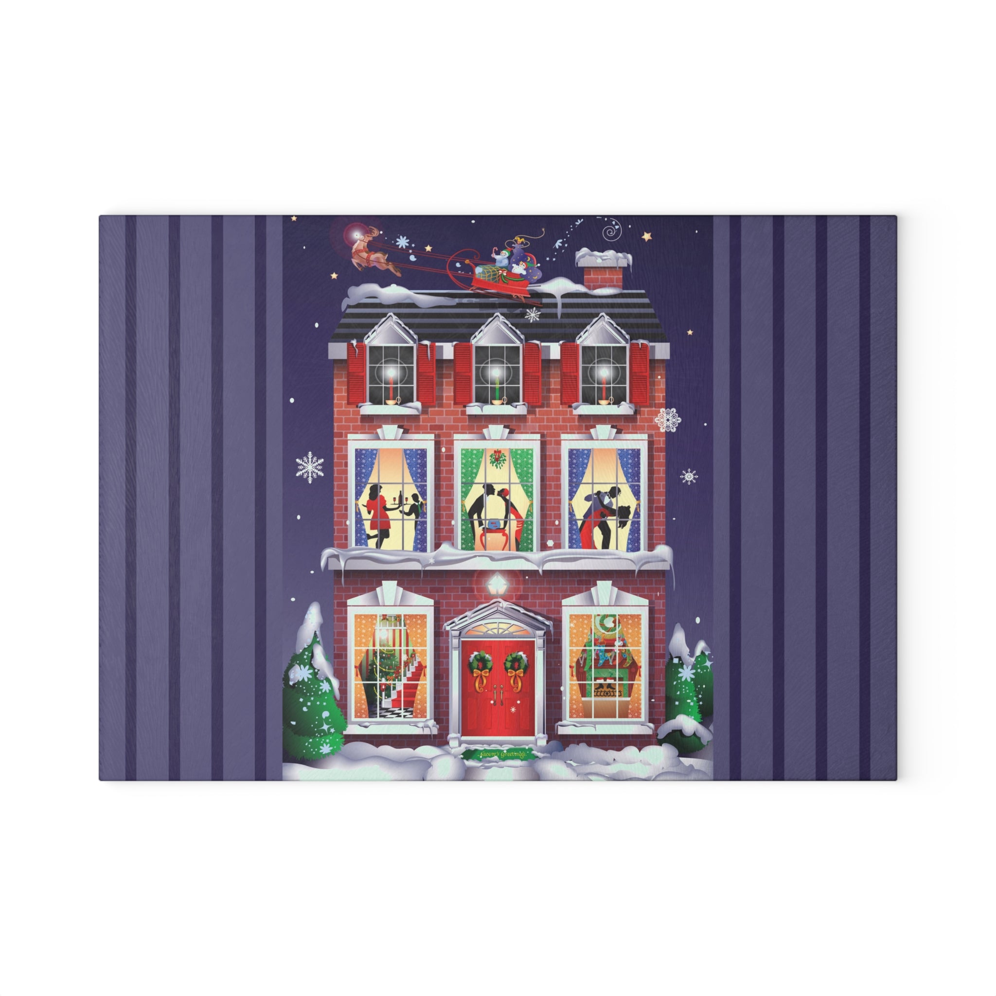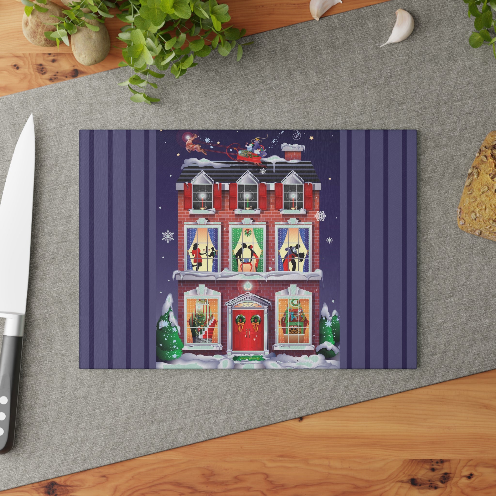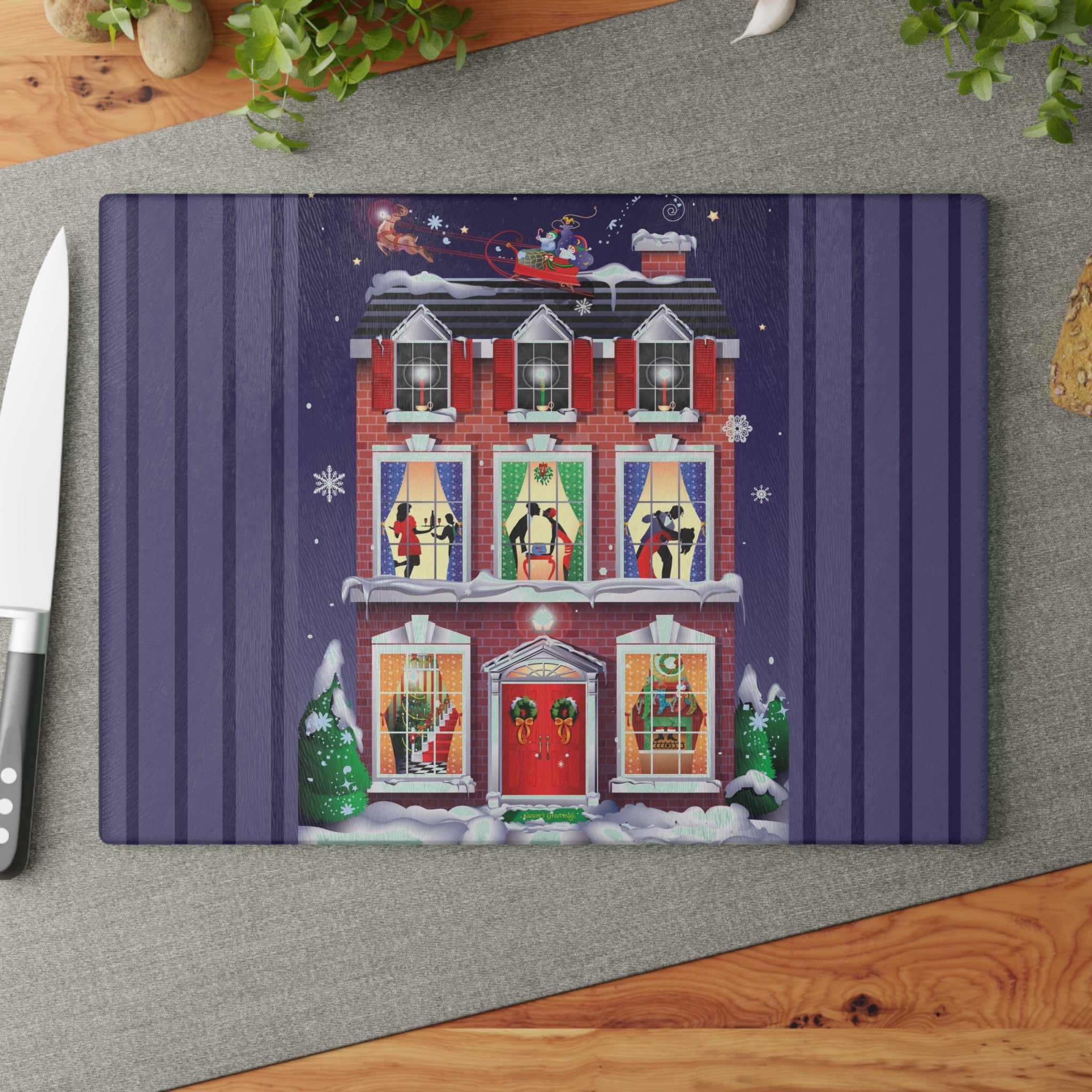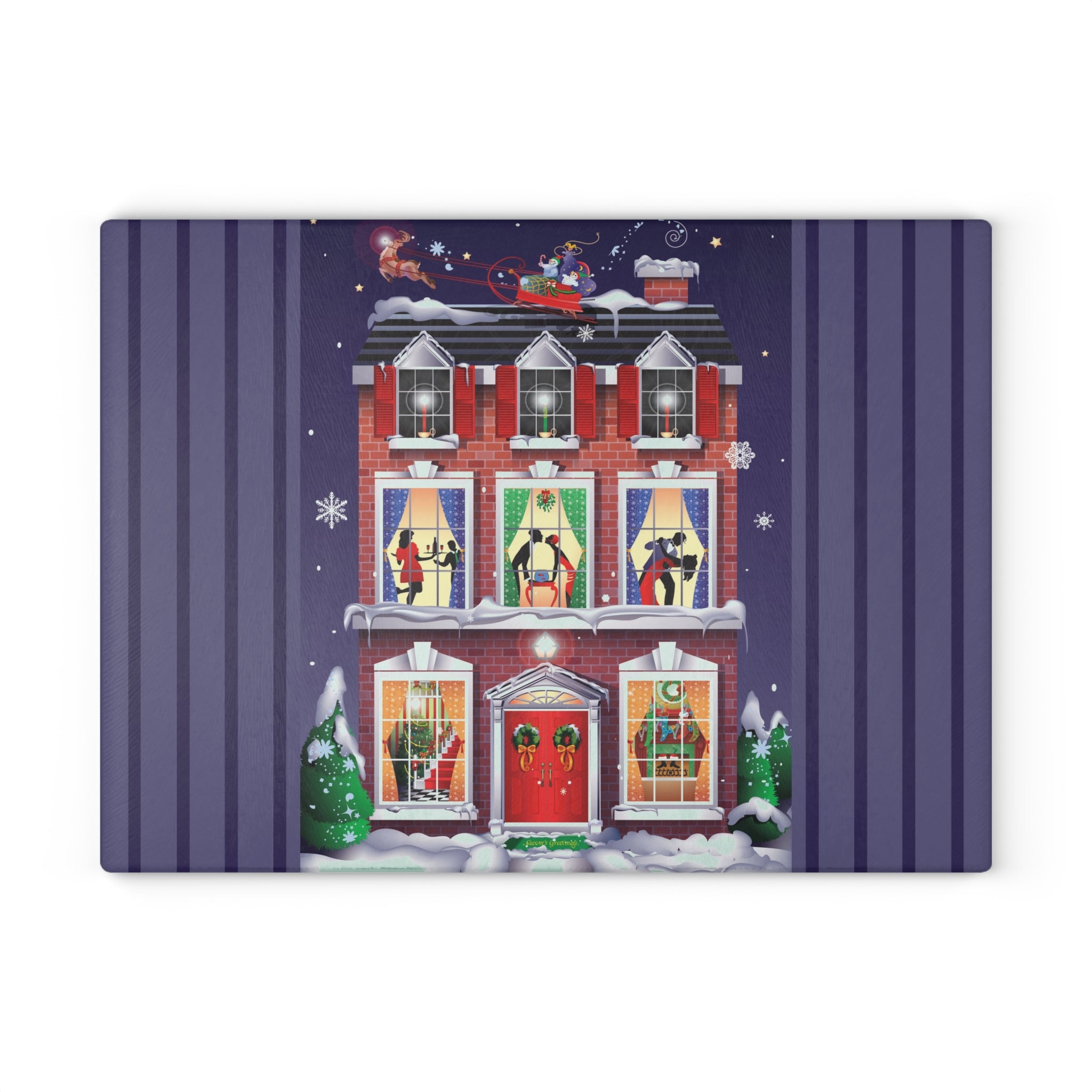 Bring festive charm into the heart of your kitchen with this tempered glass cutting board, available in two sizes: 8" x 11" and 11" x 15". Its durable build is as sturdy as the snow-covered brick townhouse in the design, while the textured surface makes chopping and slicing as reliable as the wreaths and stockings neatly in place by the fire.