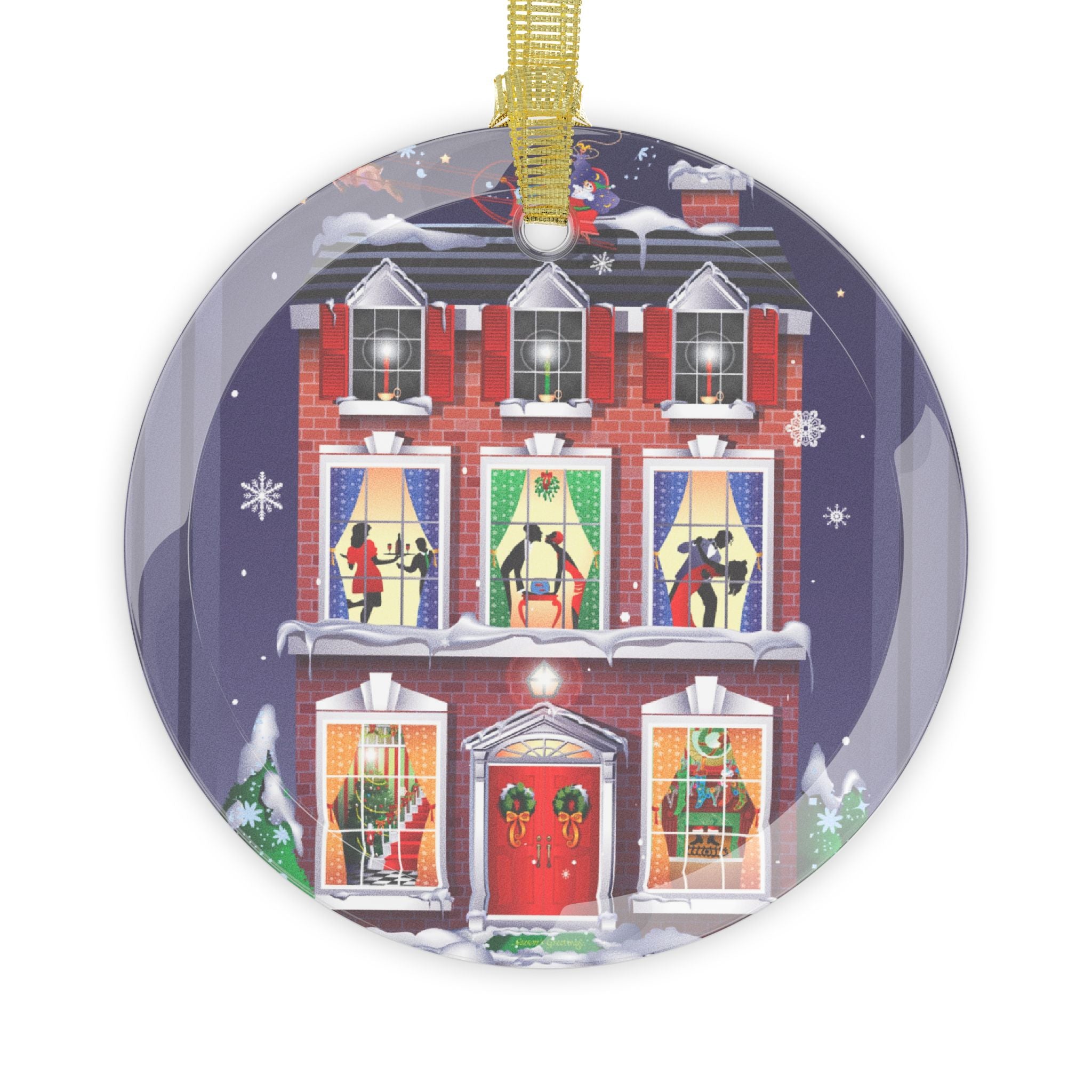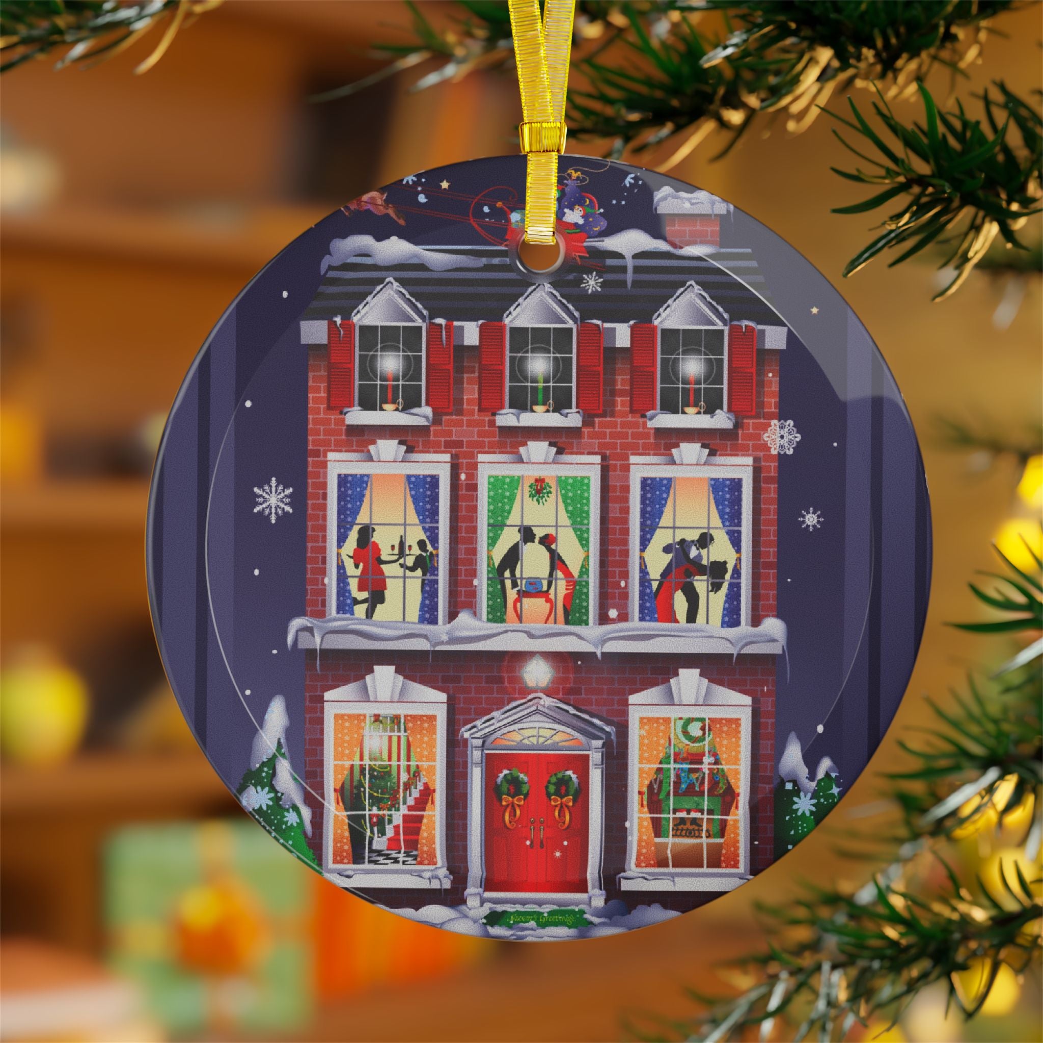 The artwork wraps the ornament in festive charm: Santa and his sleigh glide across the starry sky above a snow-covered brick townhouse glowing with warmth. Through the windows, families gather to dance, share treats, and wait by the fire, while stockings, twinkling lights, and a Christmas tree rise within. Each turn of the ornament catches a new detail, making it feel like a sparkling window into Christmas Eve itself.