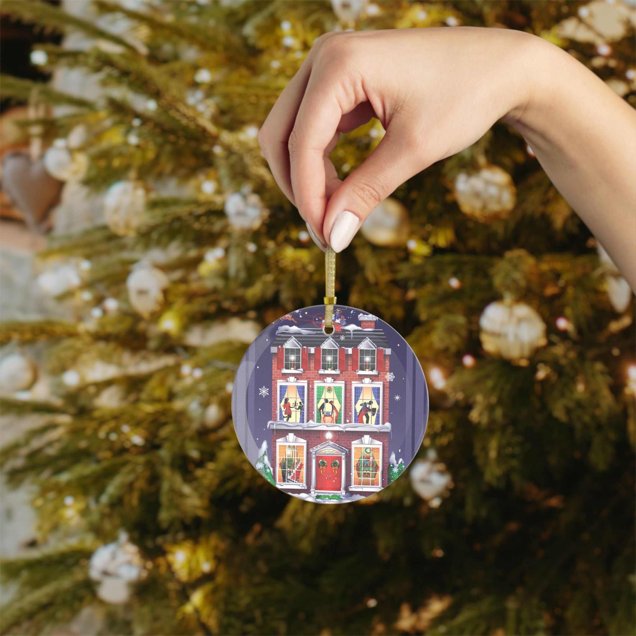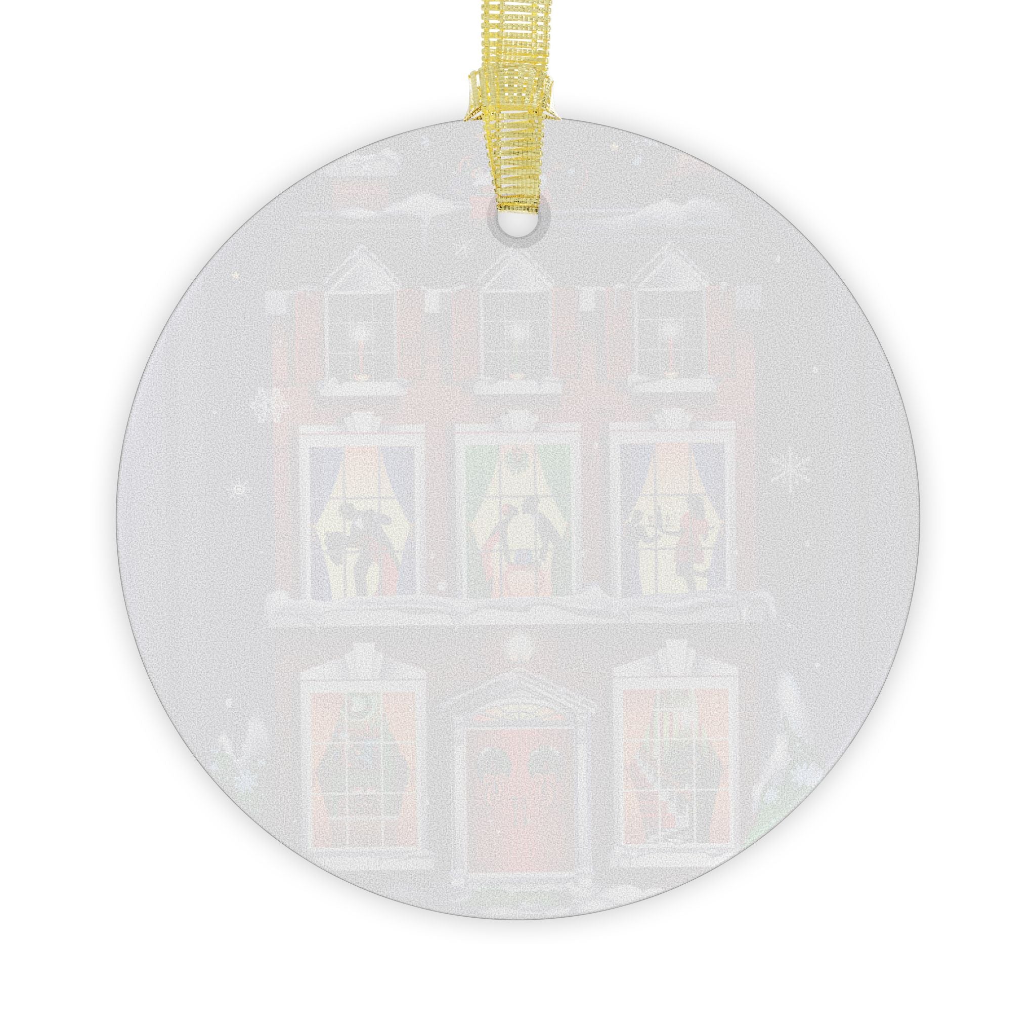 This 3.5" glass ornament turns a timeless holiday scene into a keepsake you can hang with pride. Crafted from 100% glass with beveled edges, it reflects the glow of tree lights just like the candles shining in the townhouse windows of its design. A golden ribbon completes the look, adding the same elegant touch as the wreaths adorning the red doors.