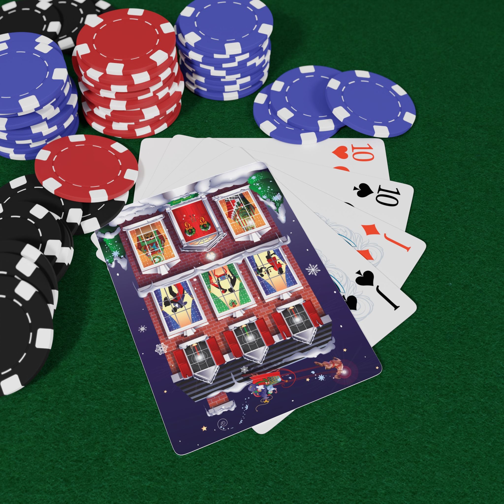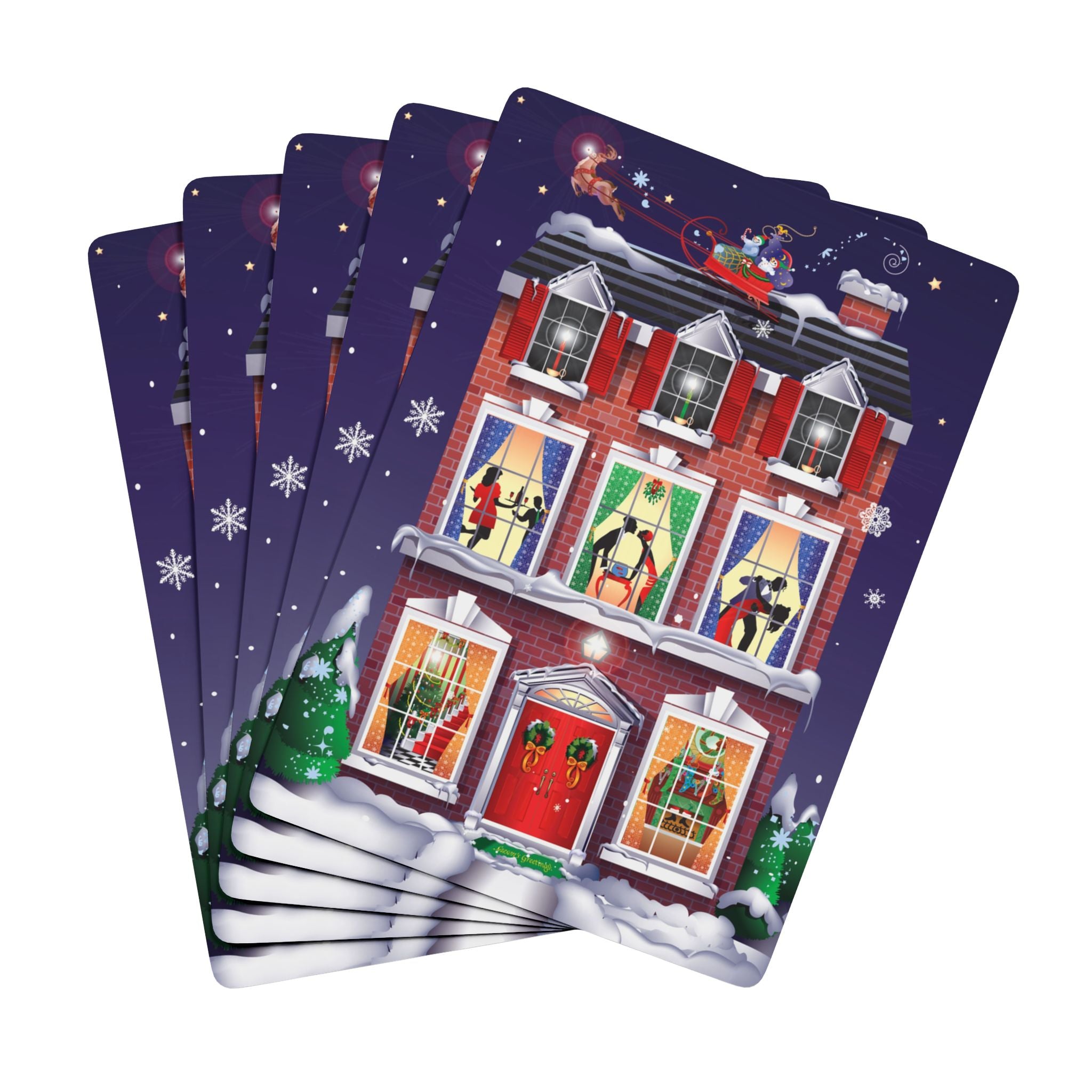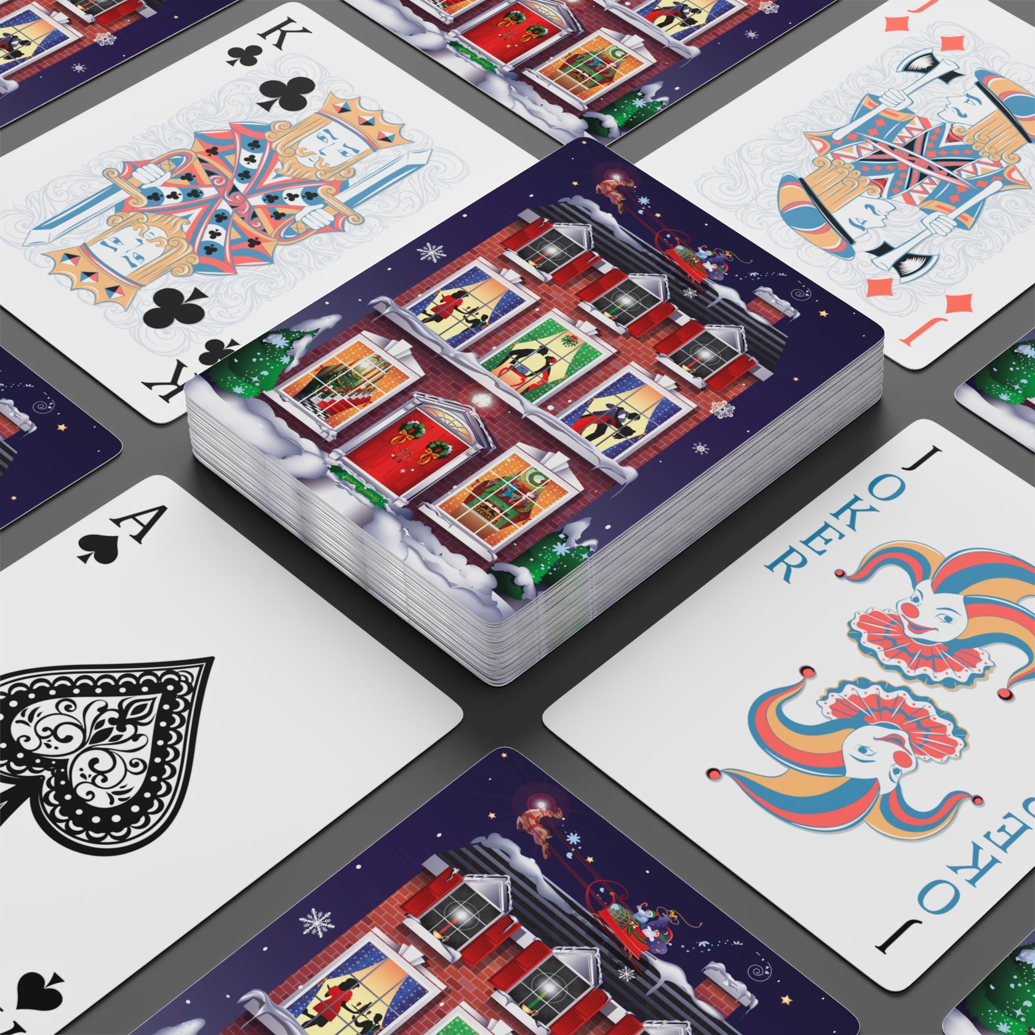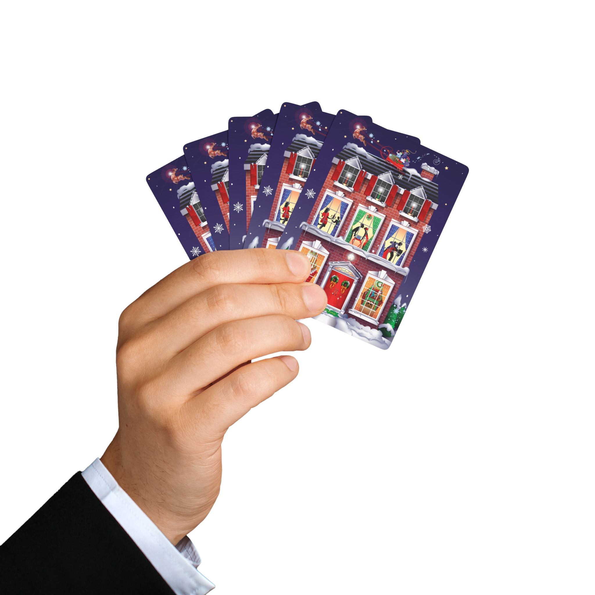 Game nights become a holiday tradition with this festive deck of A Christmas Eve Celebration playing cards. Printed on 300gsm premium card stock, each card feels smooth in hand, shuffles beautifully, and deals with the same ease as snow falling on the townhouse rooftops in the design. Standard poker size at 2.5" x 3.5", the deck includes 52 playing cards and 2 Jokers, making it ready for every game you love to play.