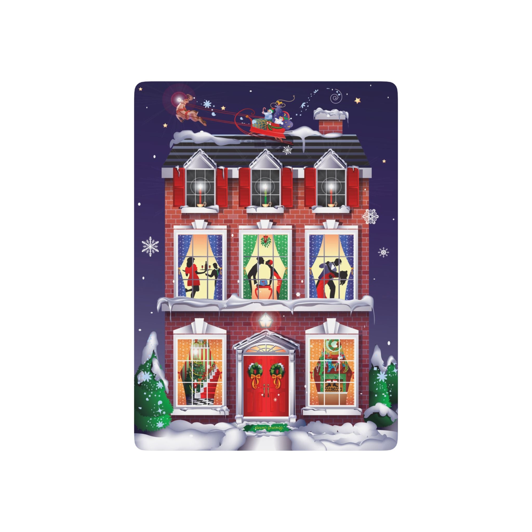 The backs of the cards transform your table into a window into Christmas Eve: Santa’s sleigh soaring across a starlit sky, a snow-covered brick townhouse glowing with warmth, and families inside dancing, sharing treats, and waiting by the fire. Wreaths on the doors, stockings by the hearth, and twinkling lights across the façade capture the timeless joy of the holiday.