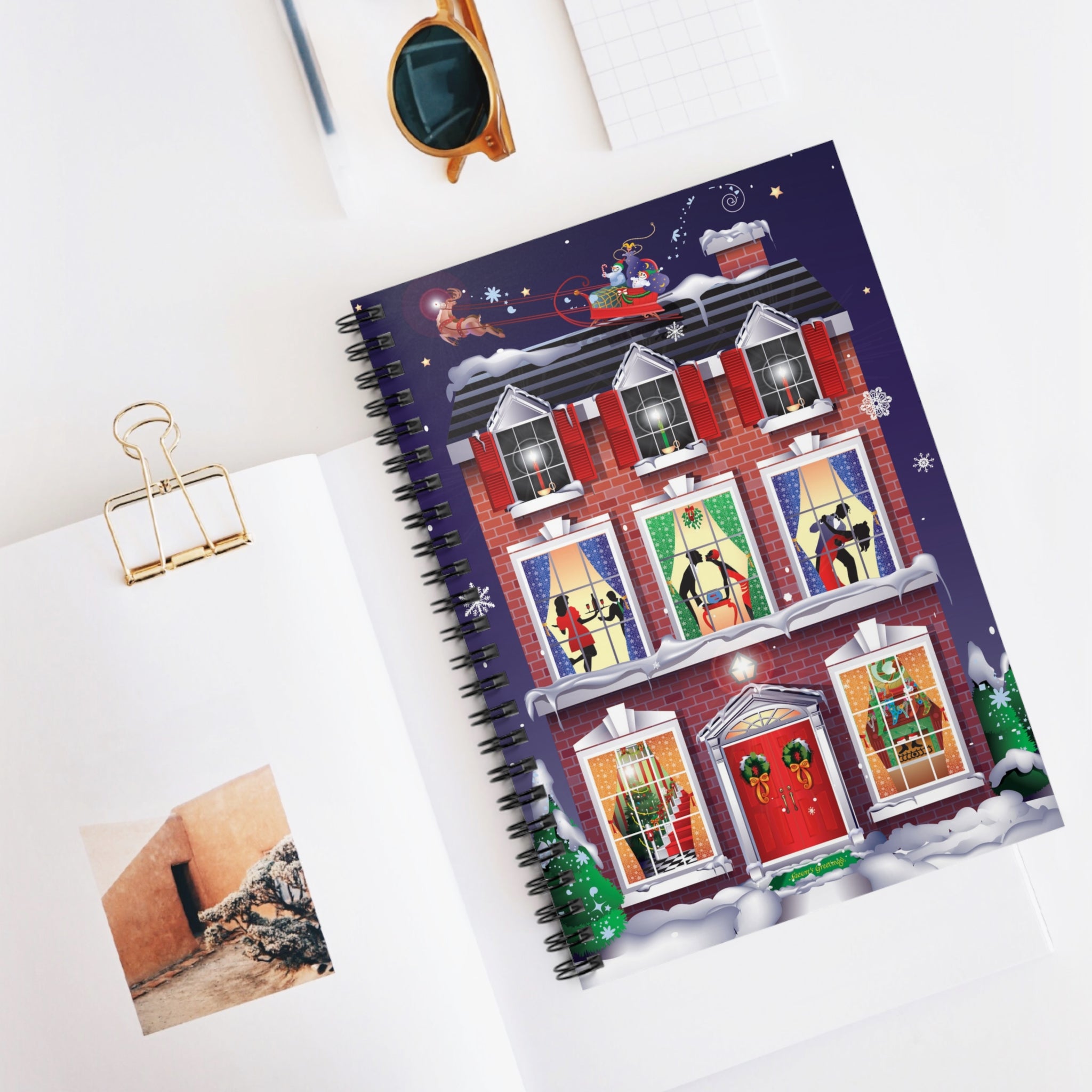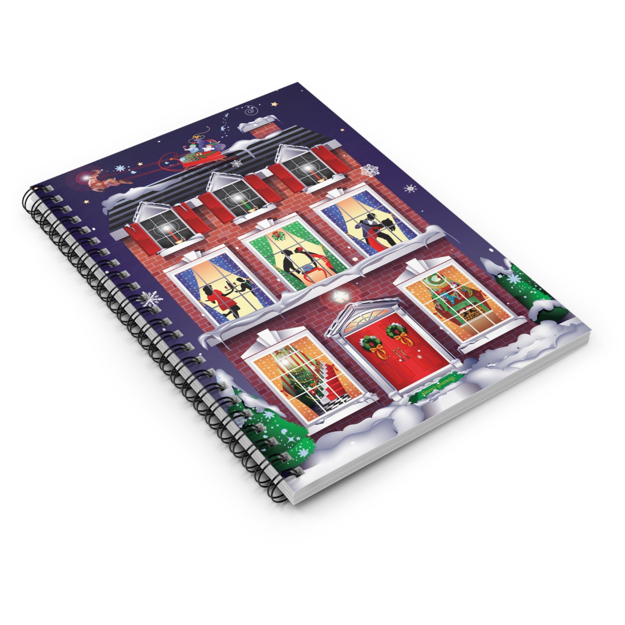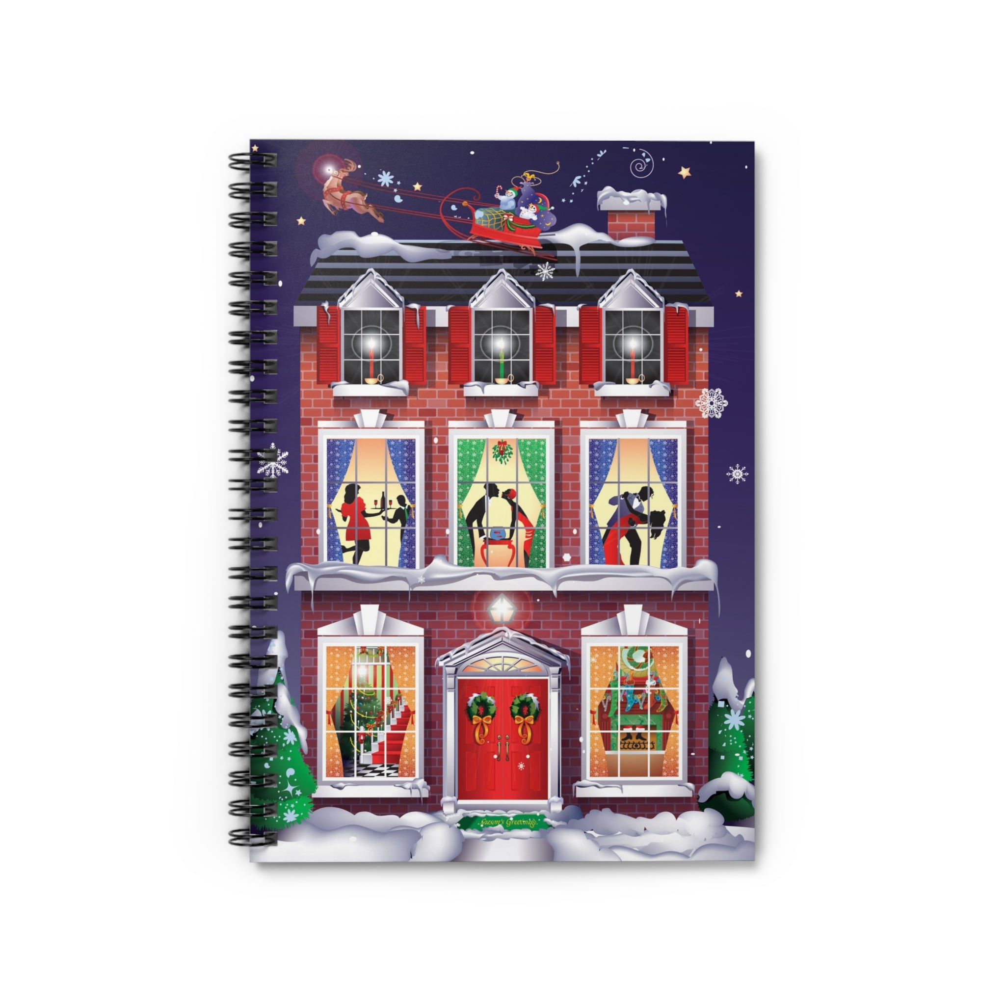 Across the glossy cover, a snow-covered brick townhouse glows with warmth, Santa and his sleigh drift across the starry sky, and families inside dance, share treats, and gather by the fire. Wreaths on the red doors, stockings by the hearth, candles in the windows, and a sparkling tree add layers of cheer that make this notebook as inspiring as it is practical.