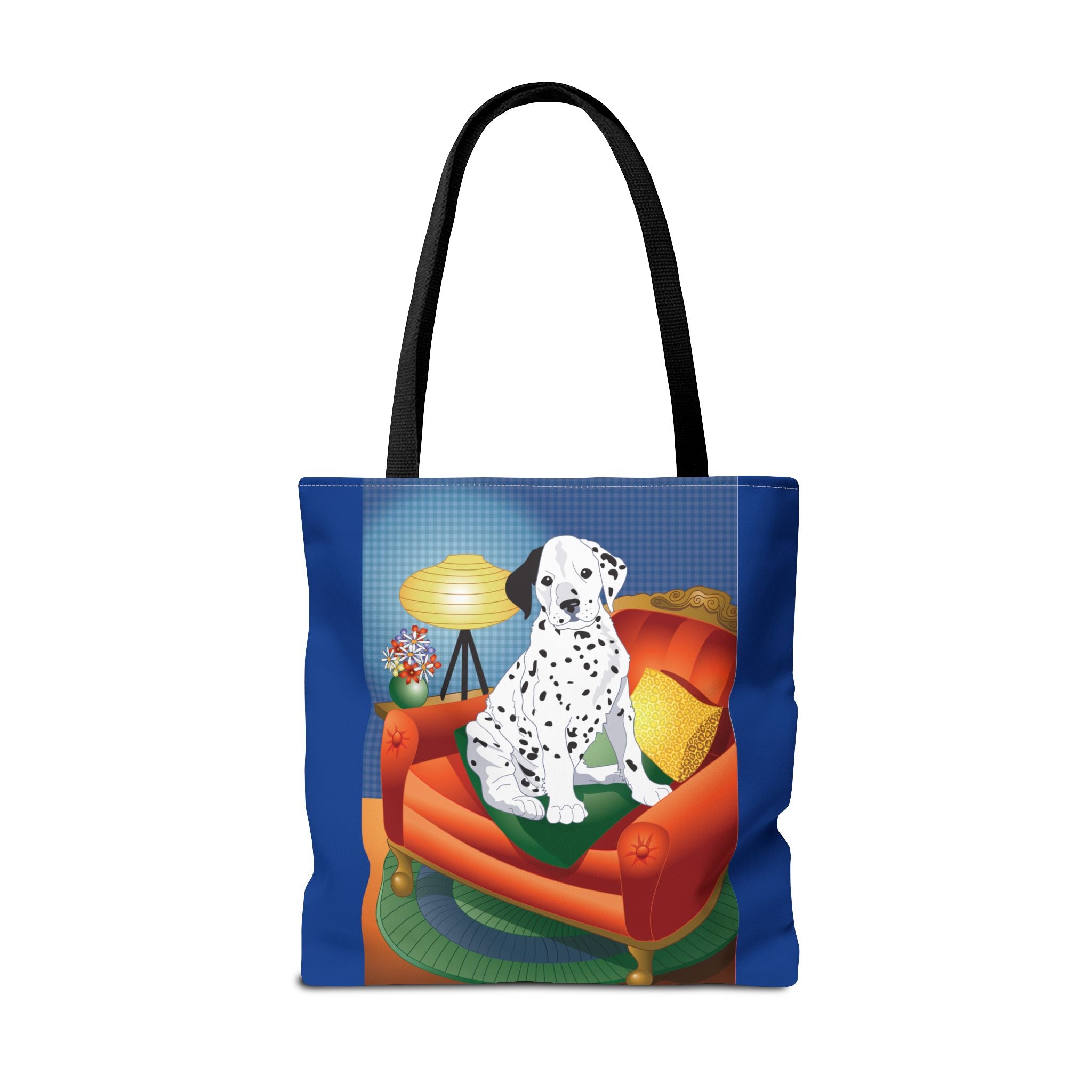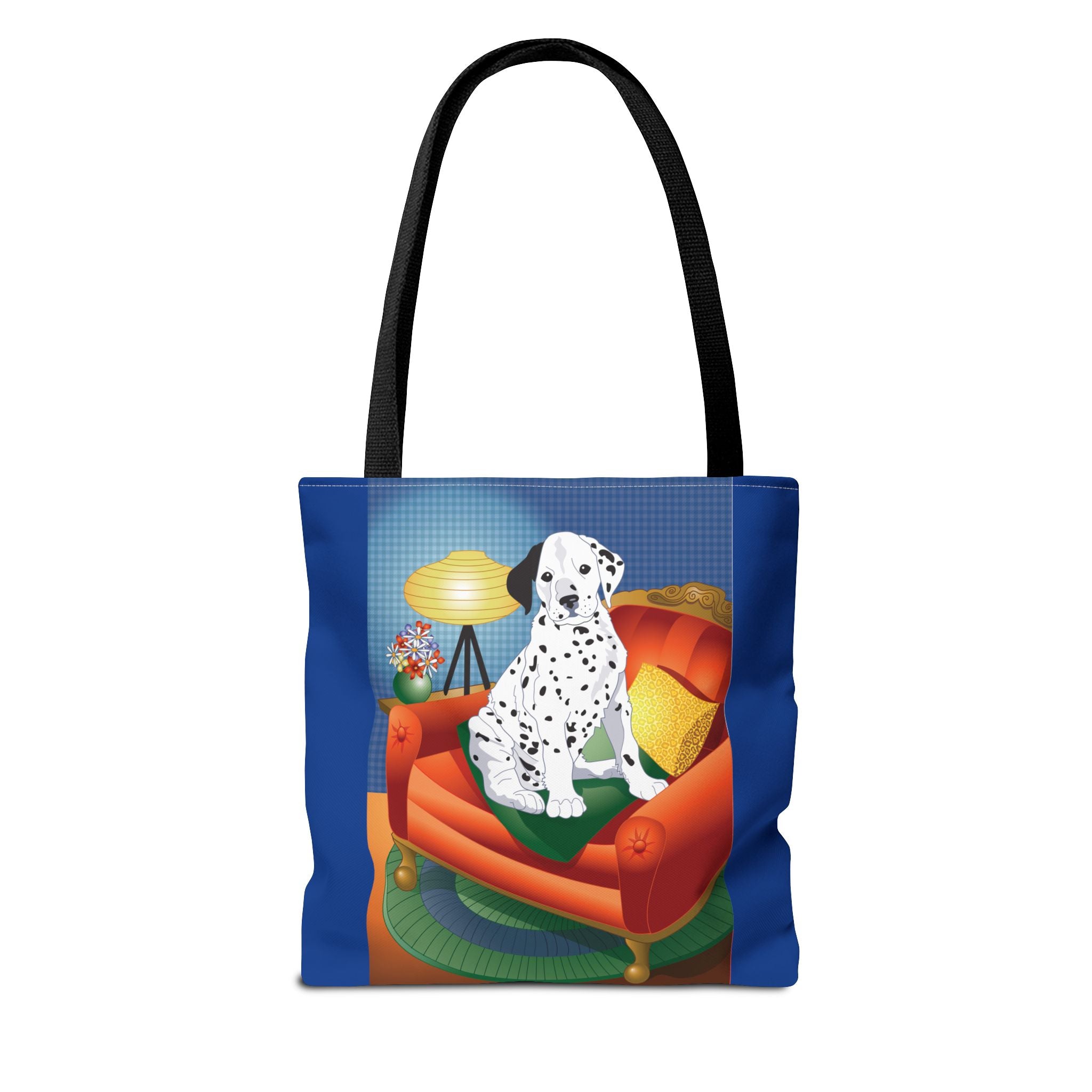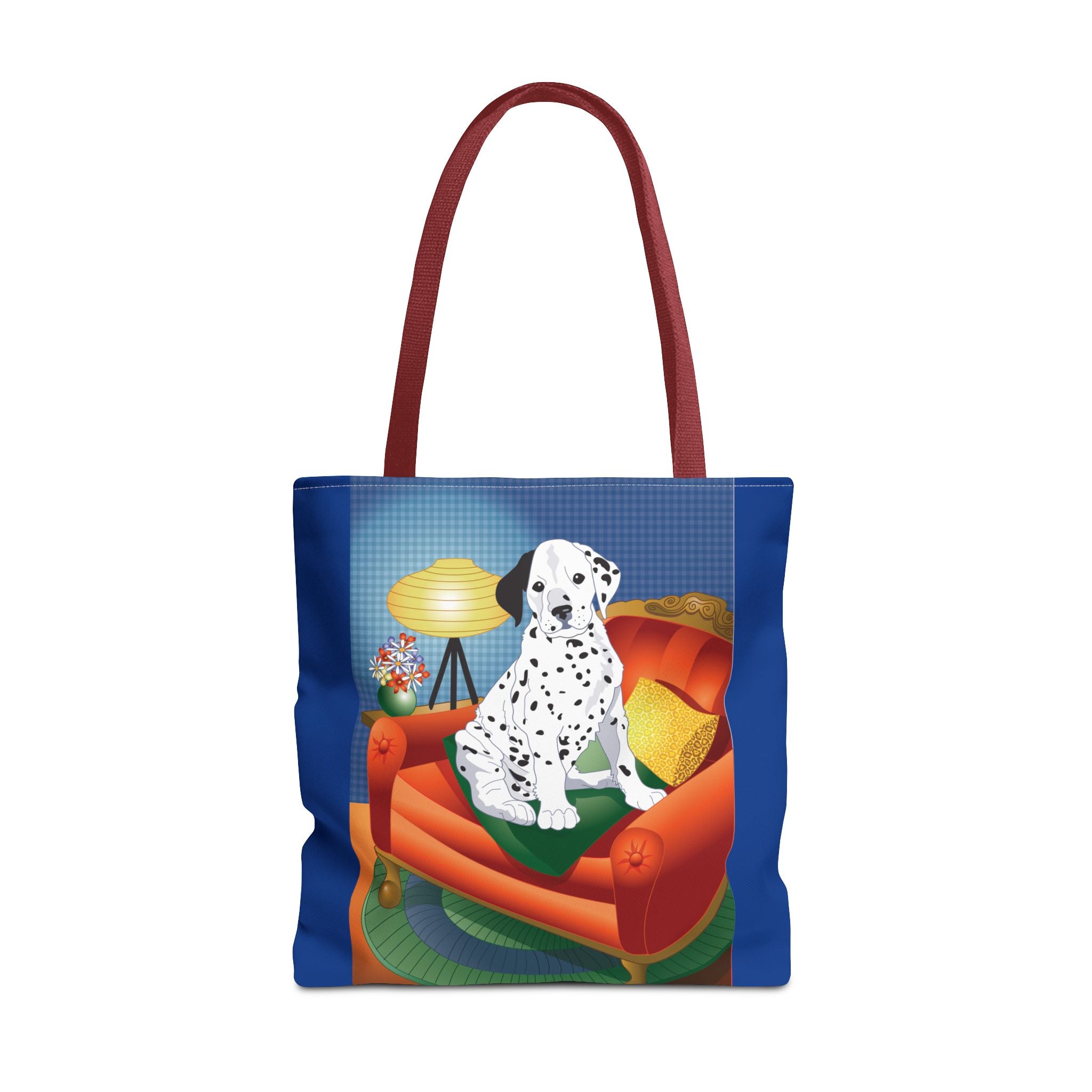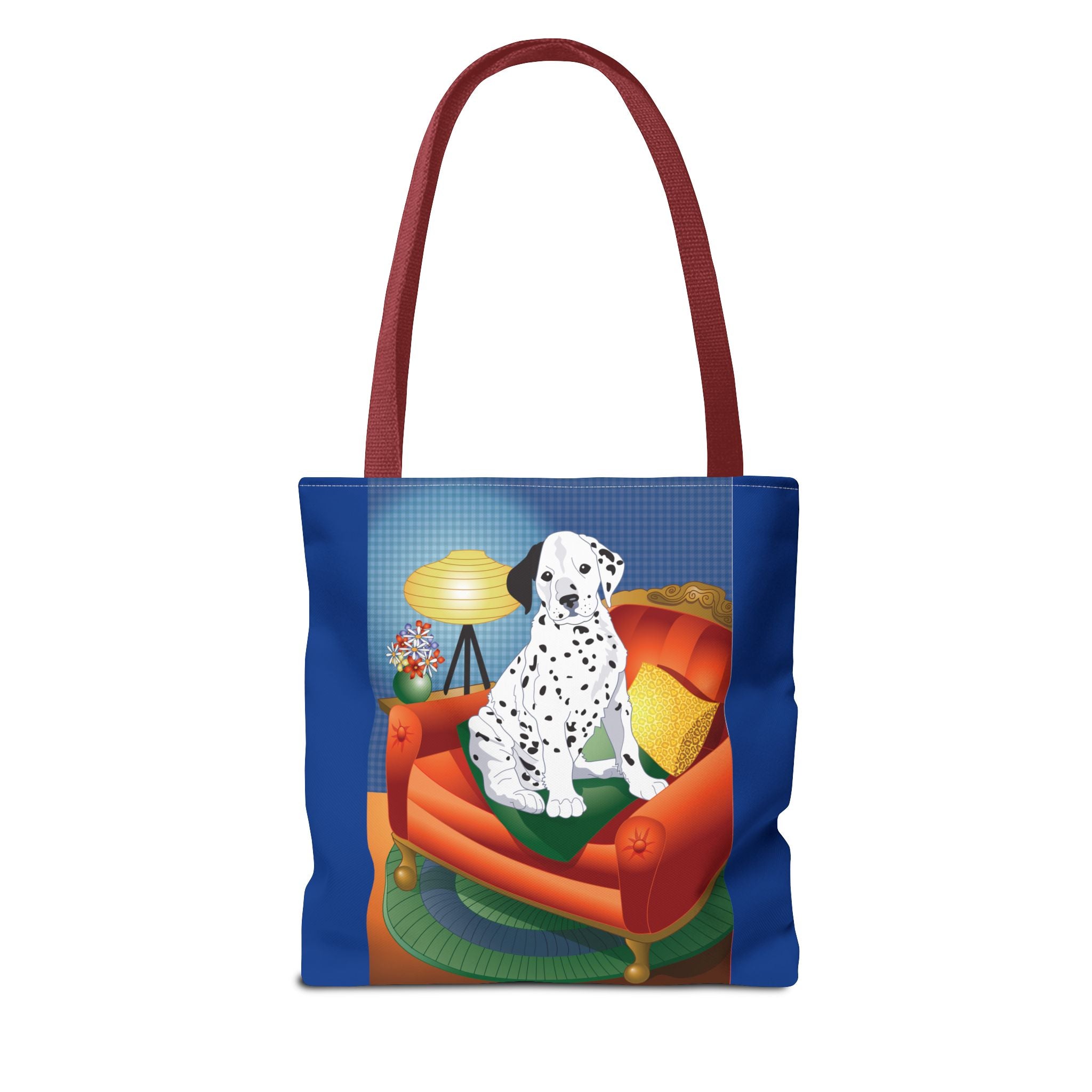 A stylish and functional tote bag featuring a bold, contemporary artwork of a Dalmatian dog sitting on a red chair, surrounded by colorful pillows and a round rug. Perfect for dog lovers and art enthusiasts, this tote bag is ideal for everyday use and can add a pop of color to any outfit. Great for carrying groceries, books, or any essentials, this tote bag is a must-have accessory for animal lovers and those who appreciate unique design.