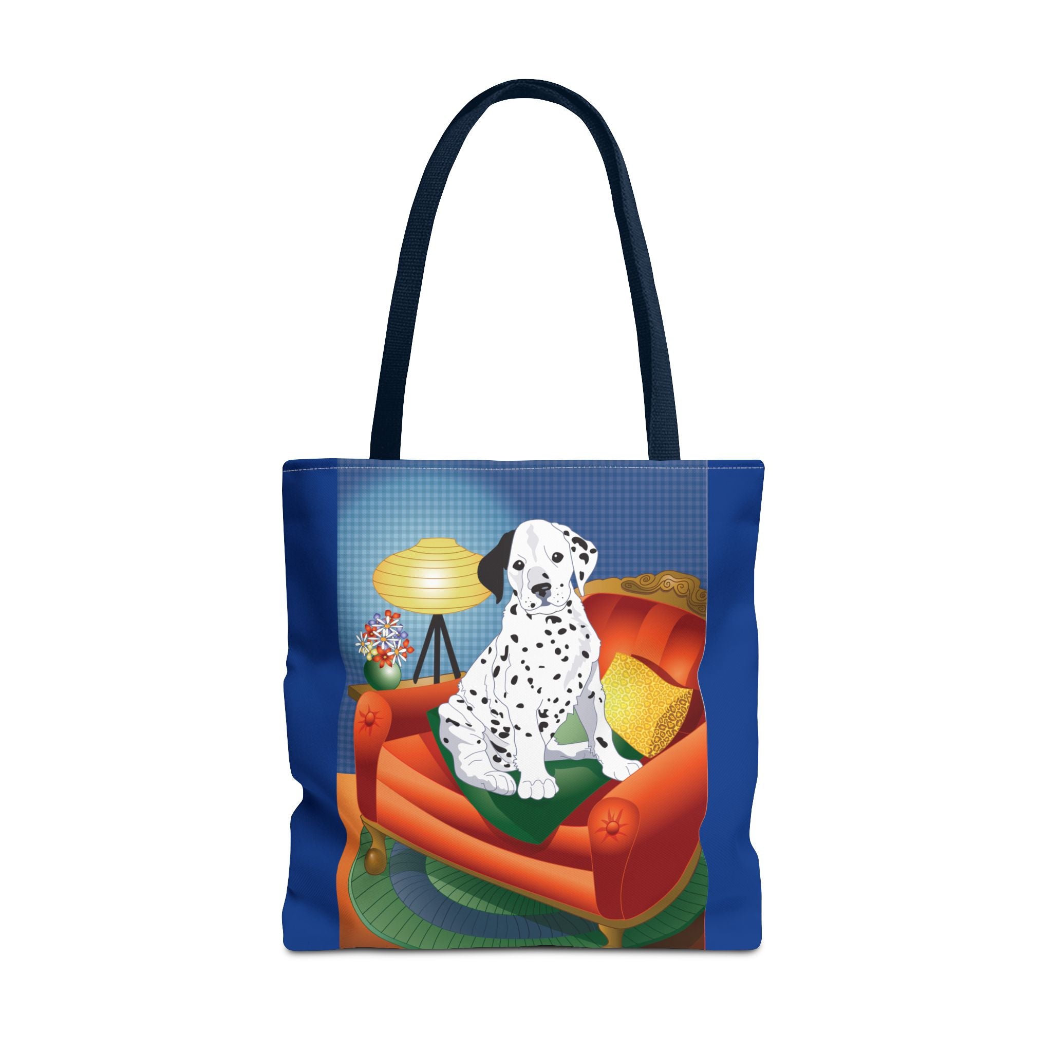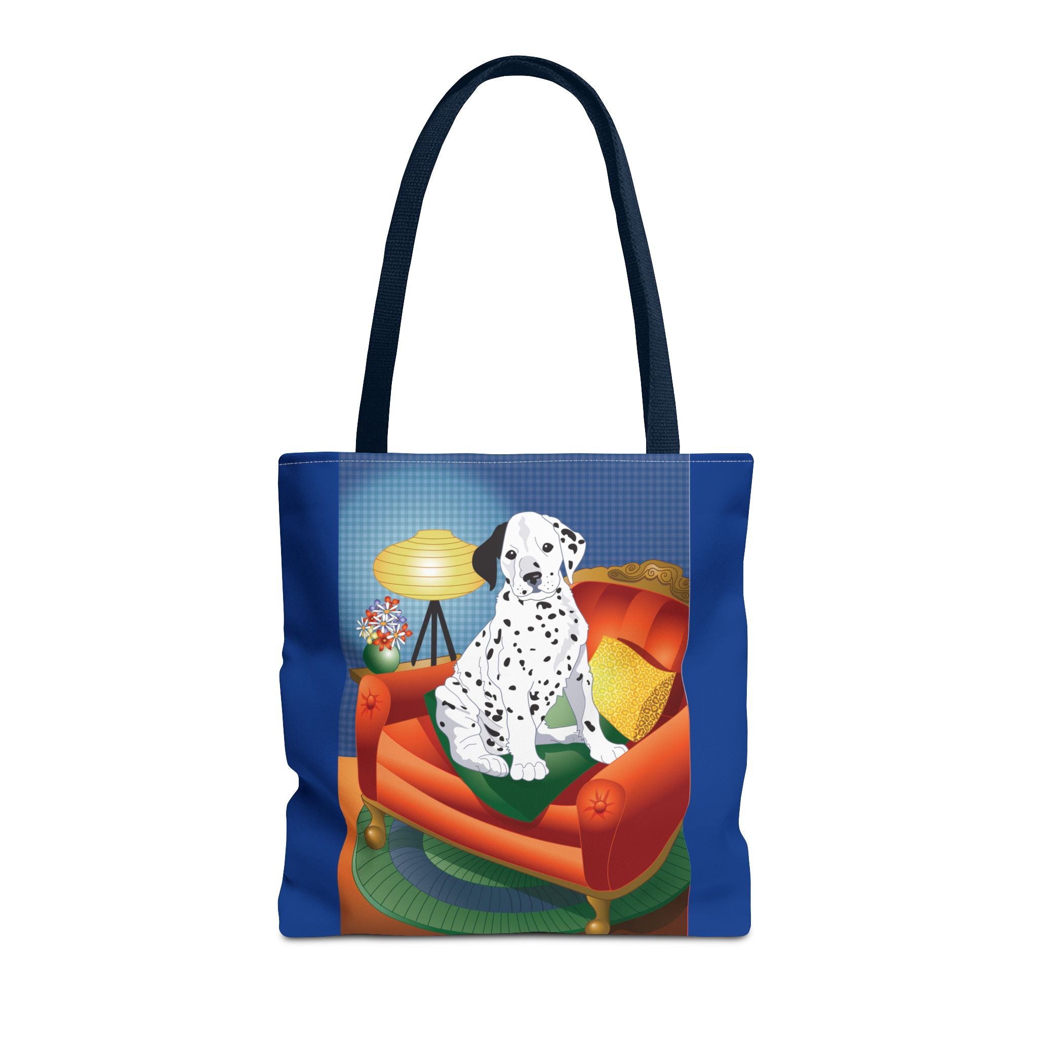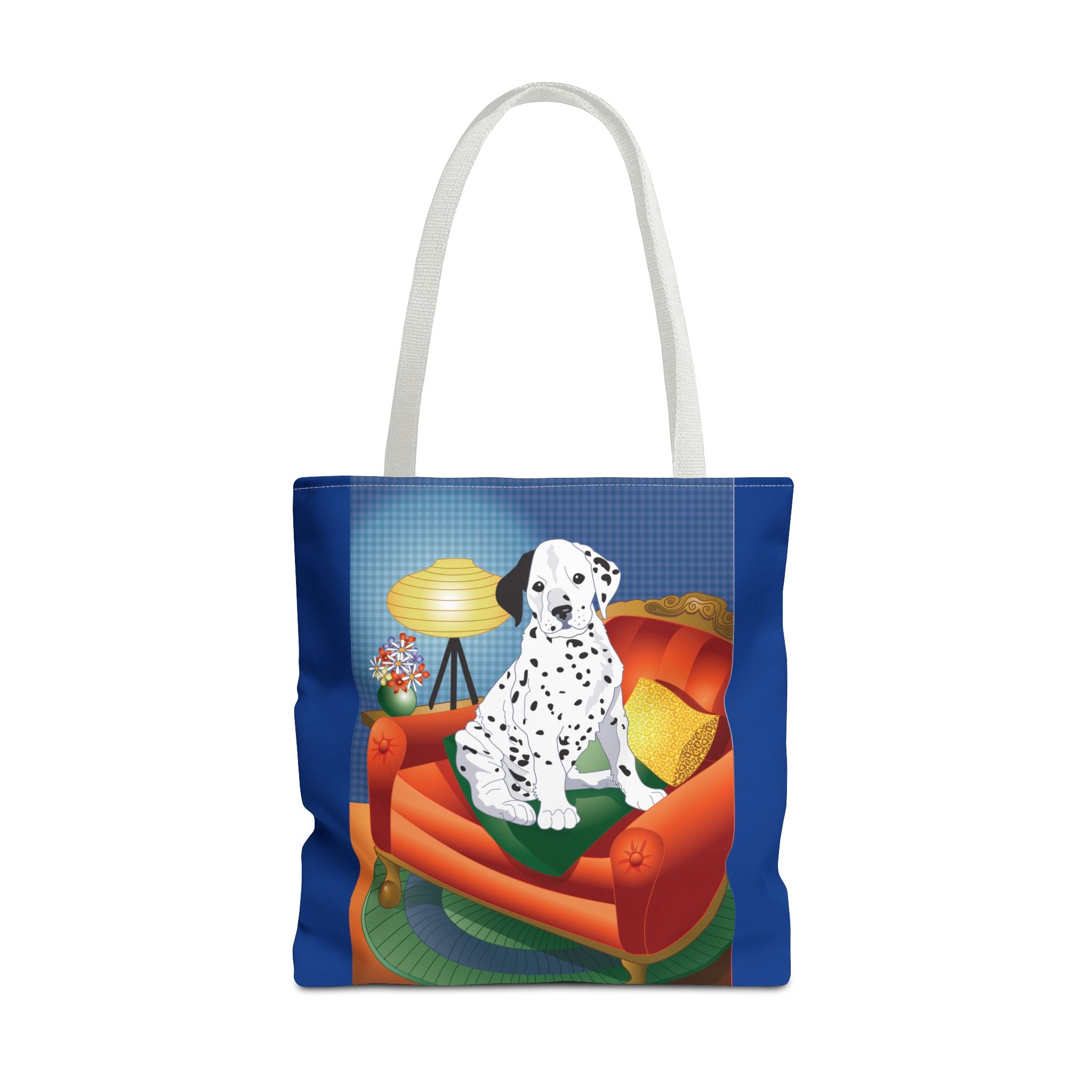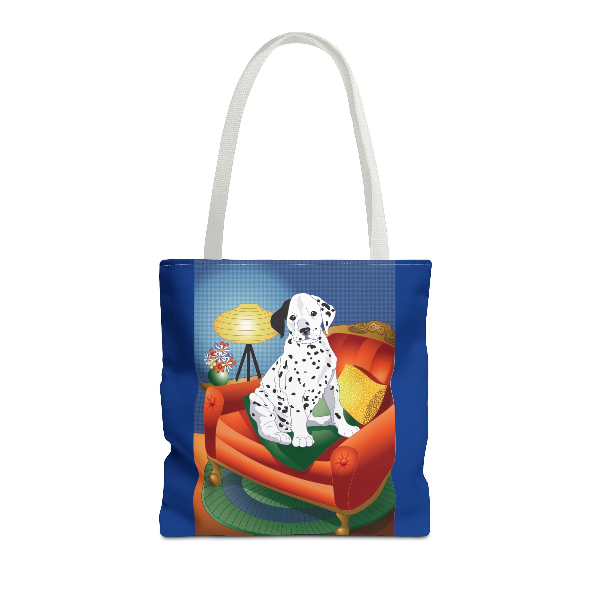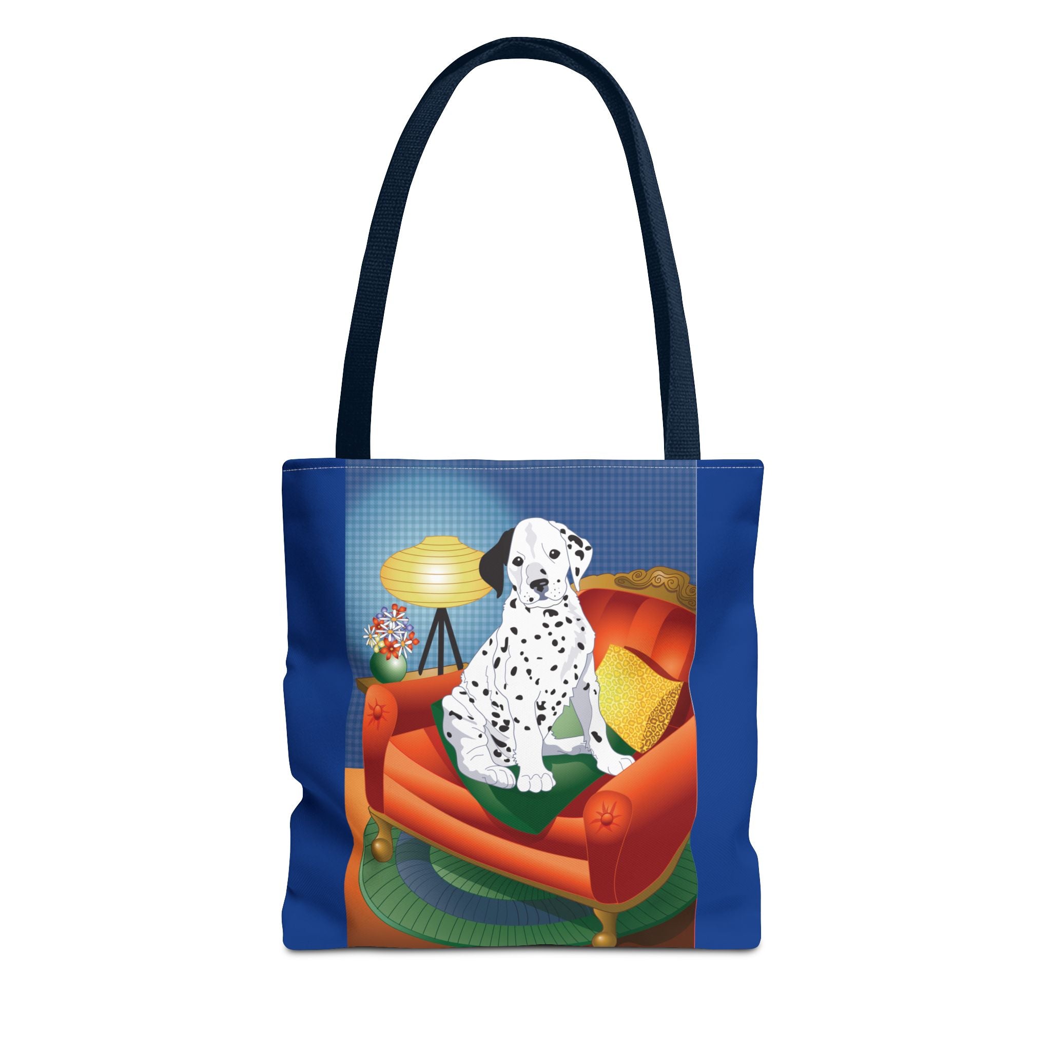 A stylish and functional tote bag featuring a bold, contemporary artwork of a Dalmatian dog sitting on a red chair, surrounded by colorful pillows and a round rug. Perfect for dog lovers and art enthusiasts, this tote bag is ideal for everyday use and can add a pop of color to any outfit. Great for carrying groceries, books, or any essentials, this tote bag is a must-have accessory for animal lovers and those who appreciate unique design.
