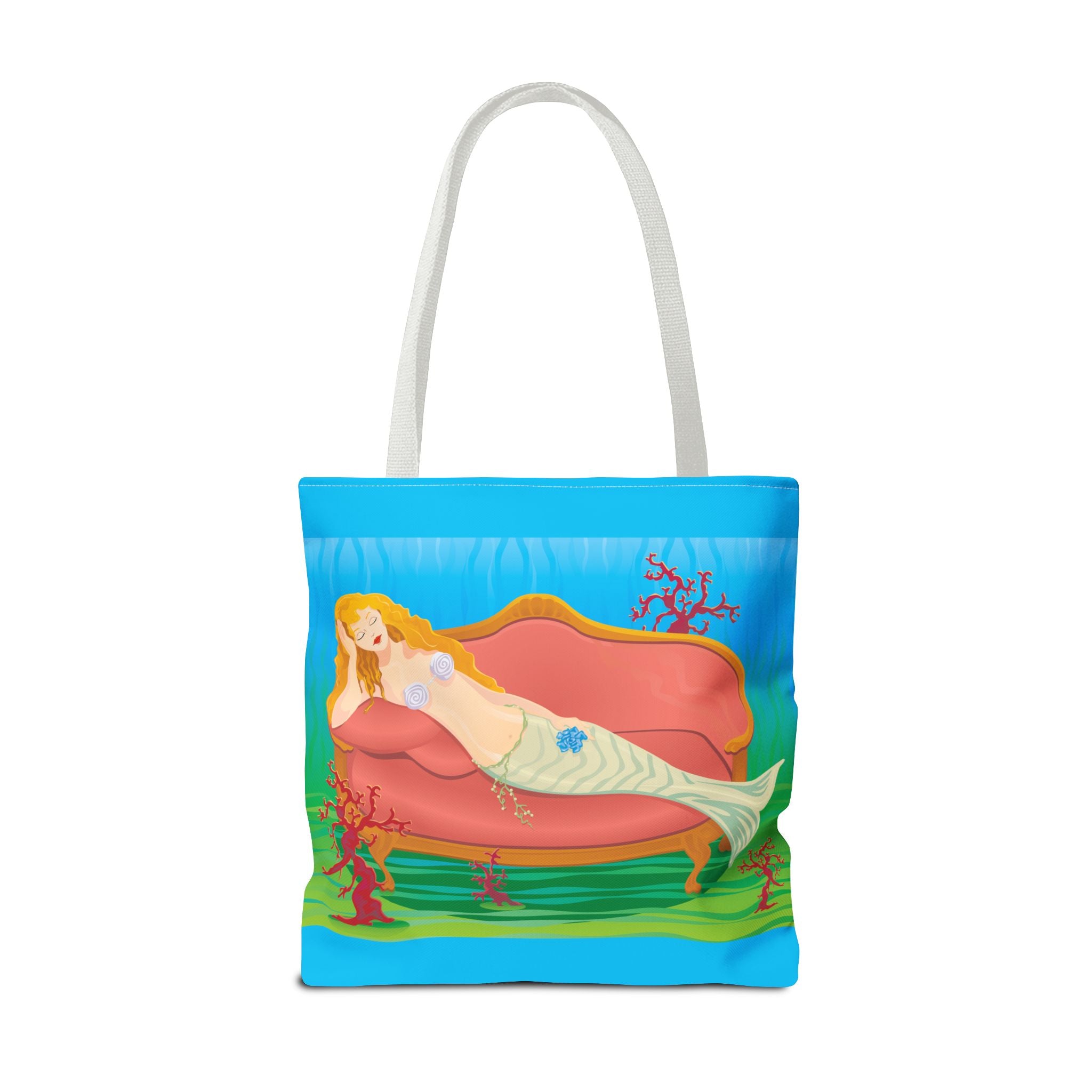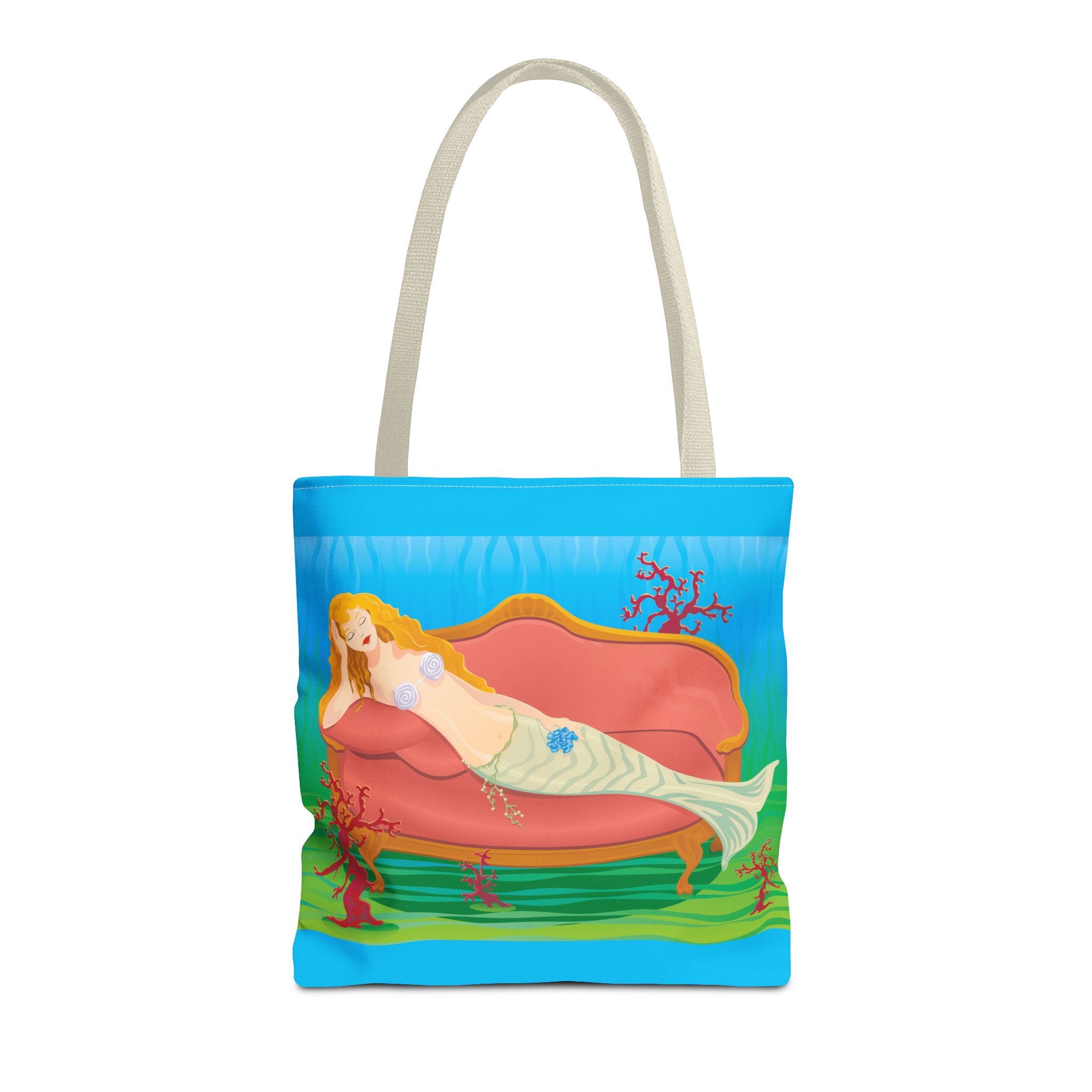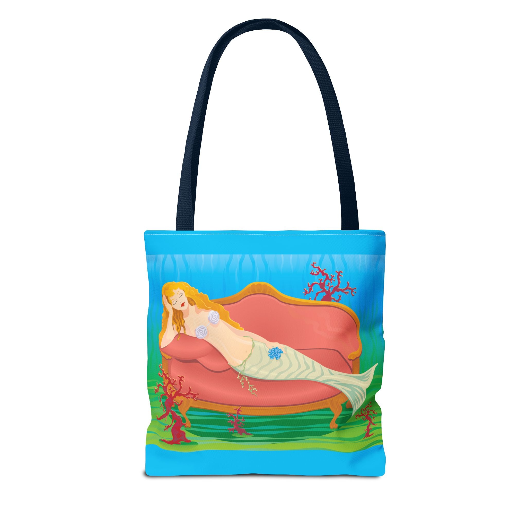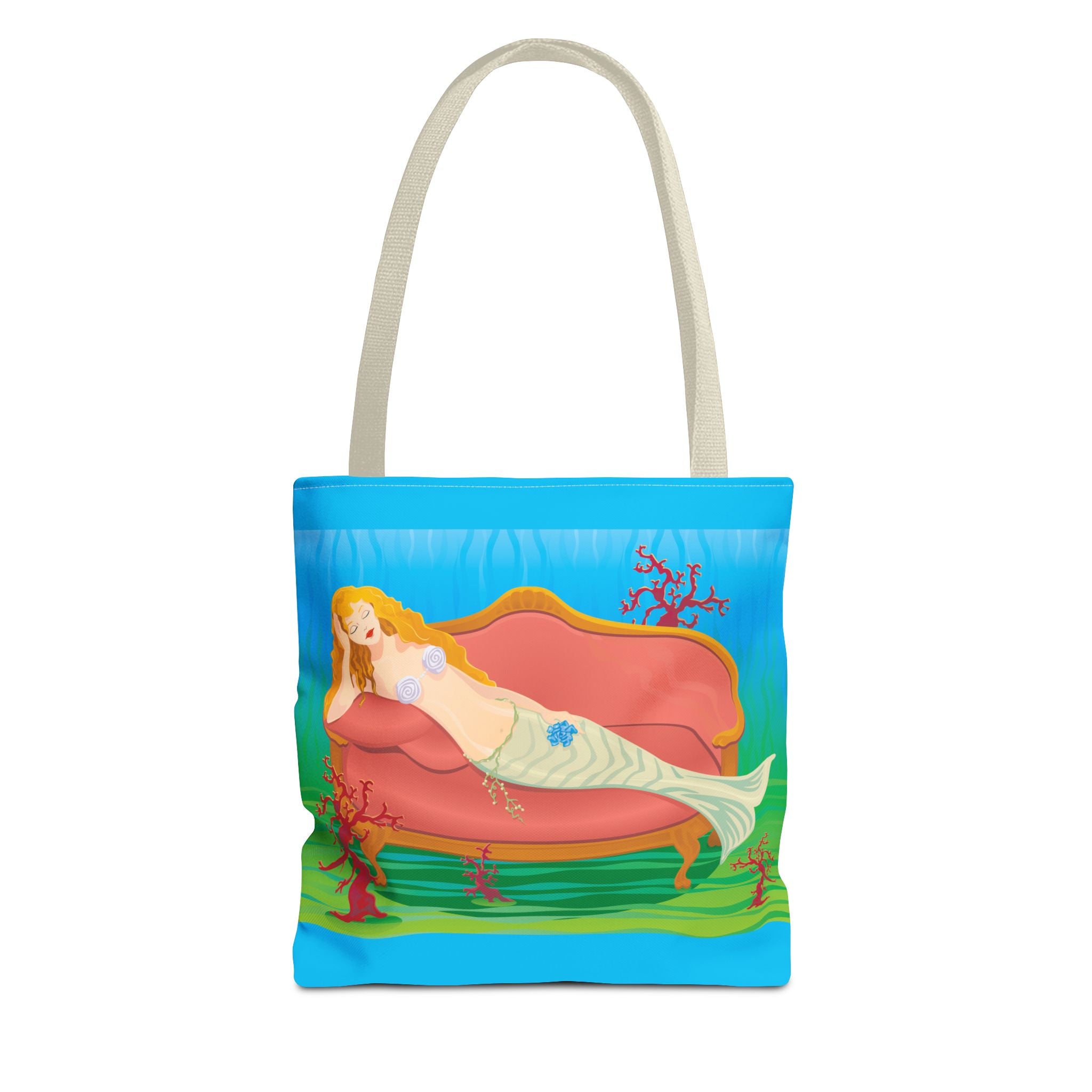 This vibrant tote bag features a bold and contemporary artwork of a mermaid reclining on a coral divan at the bottom of the sea. It gives a whimsical and artistic vibe, perfect for beach trips, summer outings, and casual everyday use. Ideal for mermaid lovers, ocean enthusiasts, and art appreciators. Great for gifting on birthdays, beach vacations, and summer holidays.