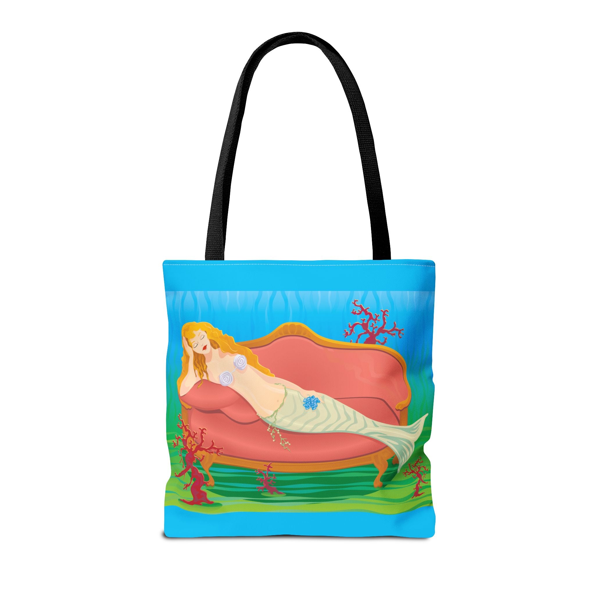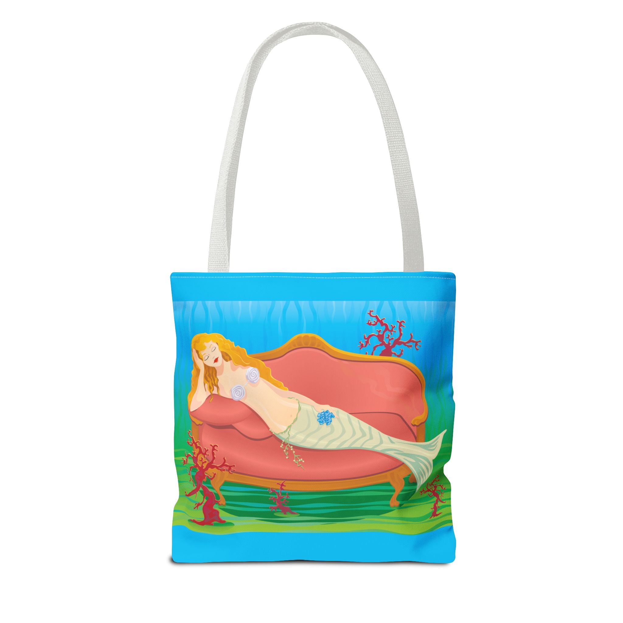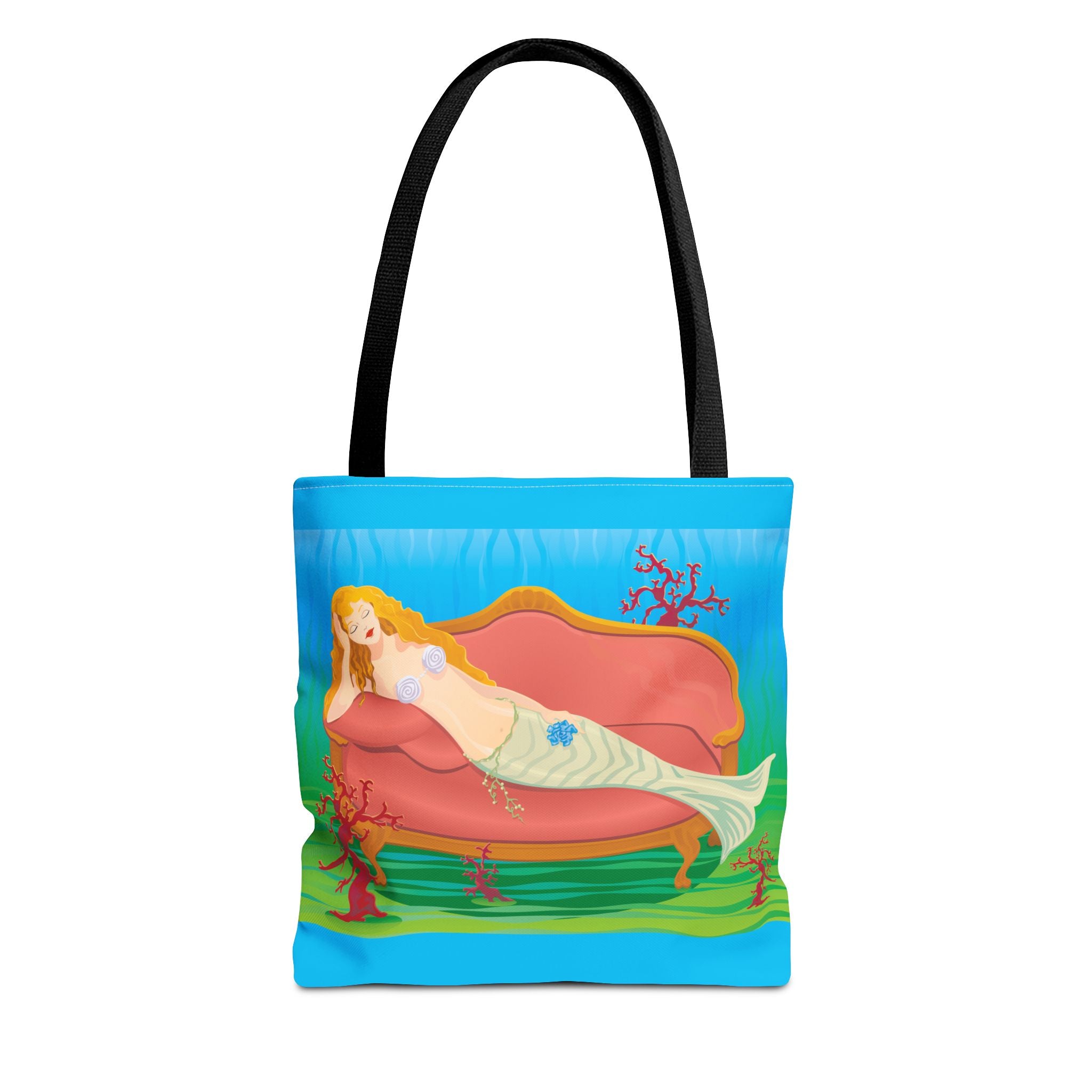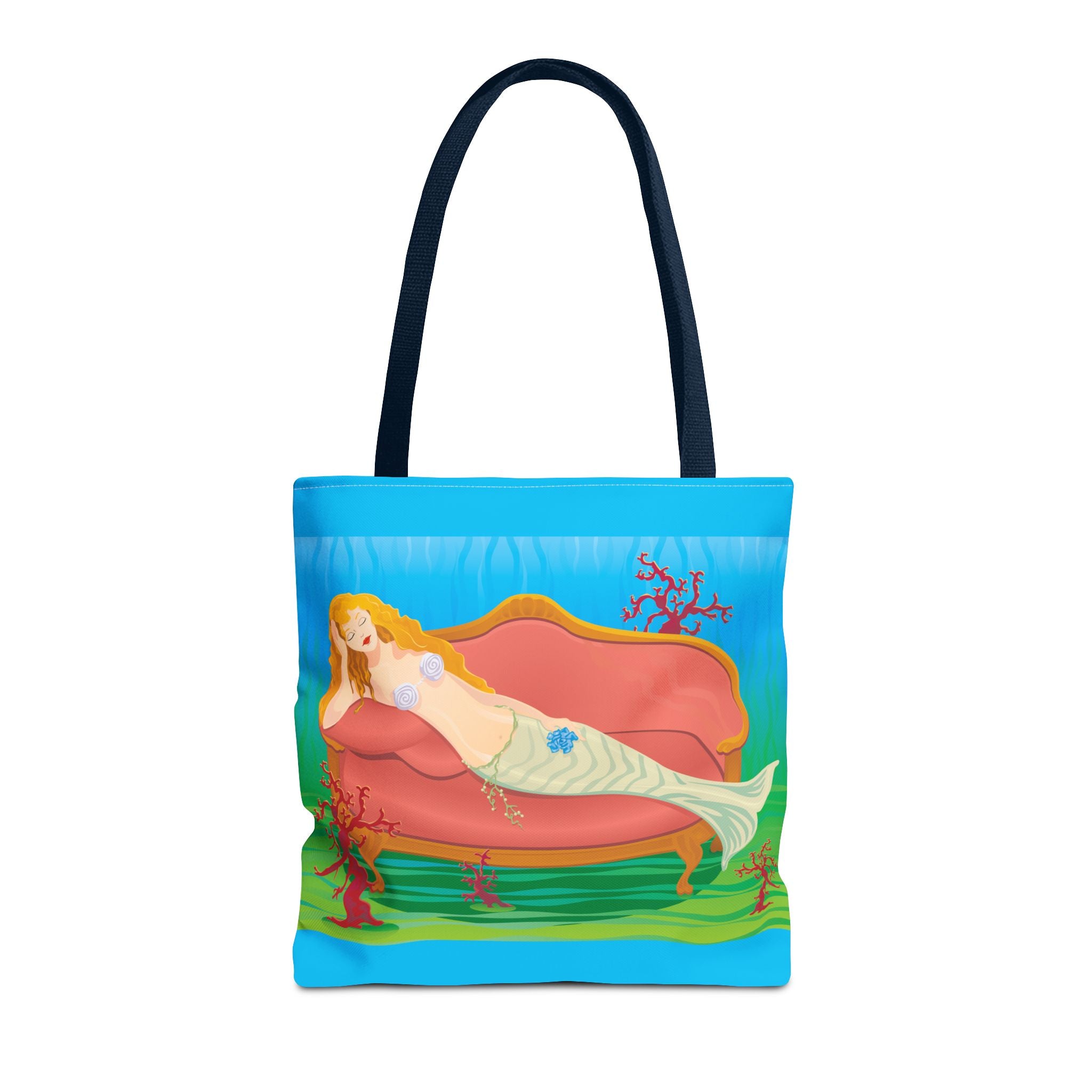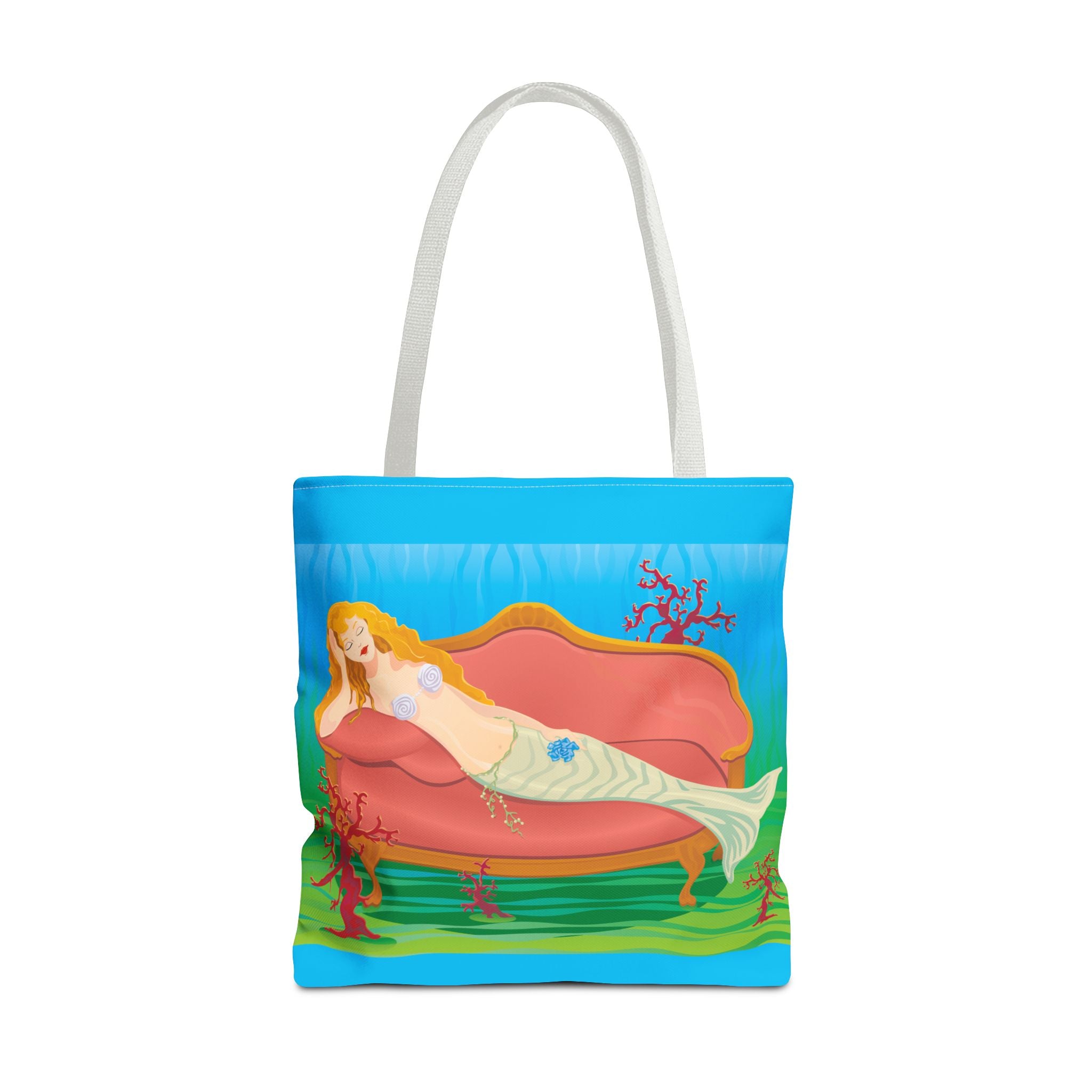 This vibrant tote bag features a bold and contemporary artwork of a mermaid reclining on a coral divan at the bottom of the sea. It gives a whimsical and artistic vibe, perfect for beach trips, summer outings, and casual everyday use. Ideal for mermaid lovers, ocean enthusiasts, and art appreciators. Great for gifting on birthdays, beach vacations, and summer holidays.