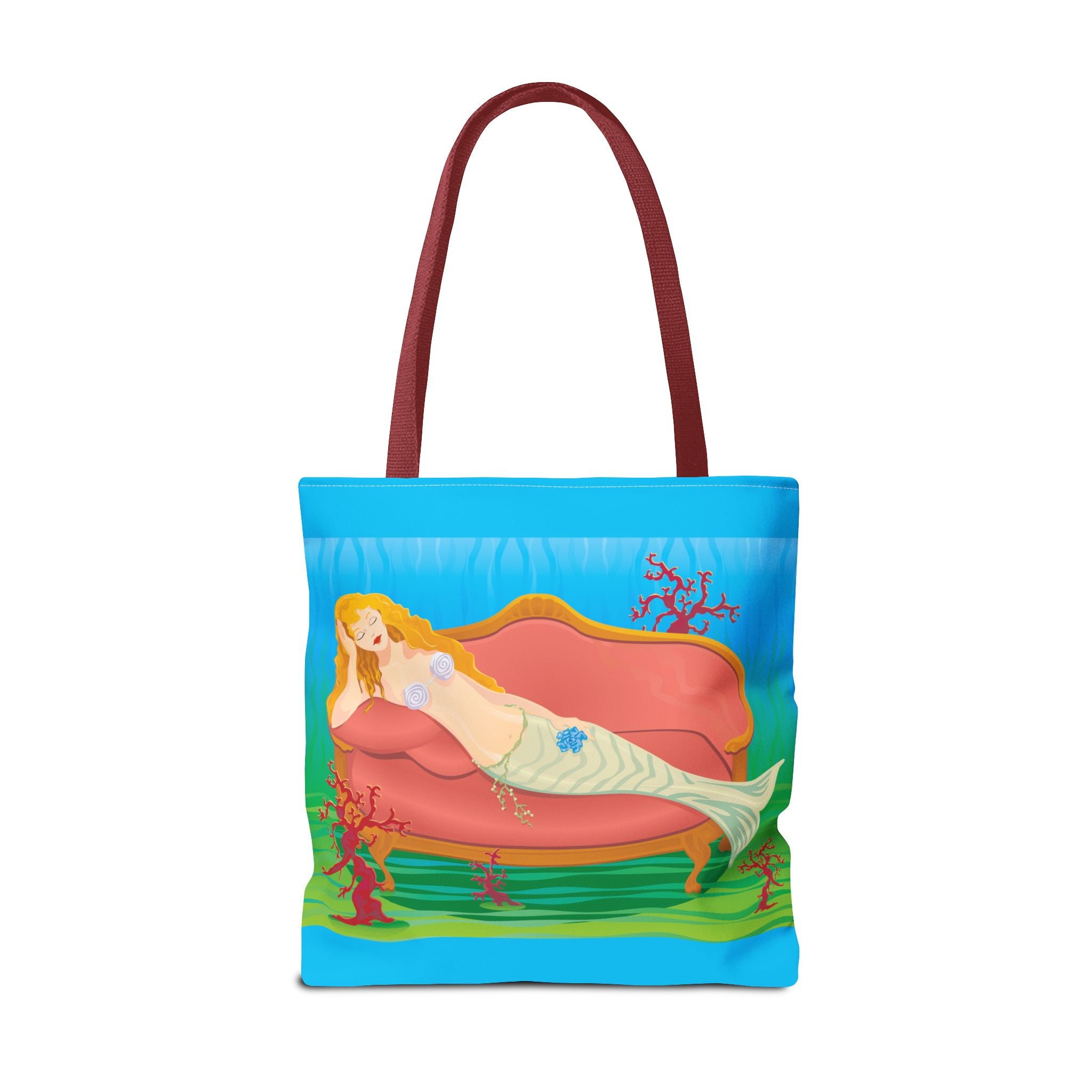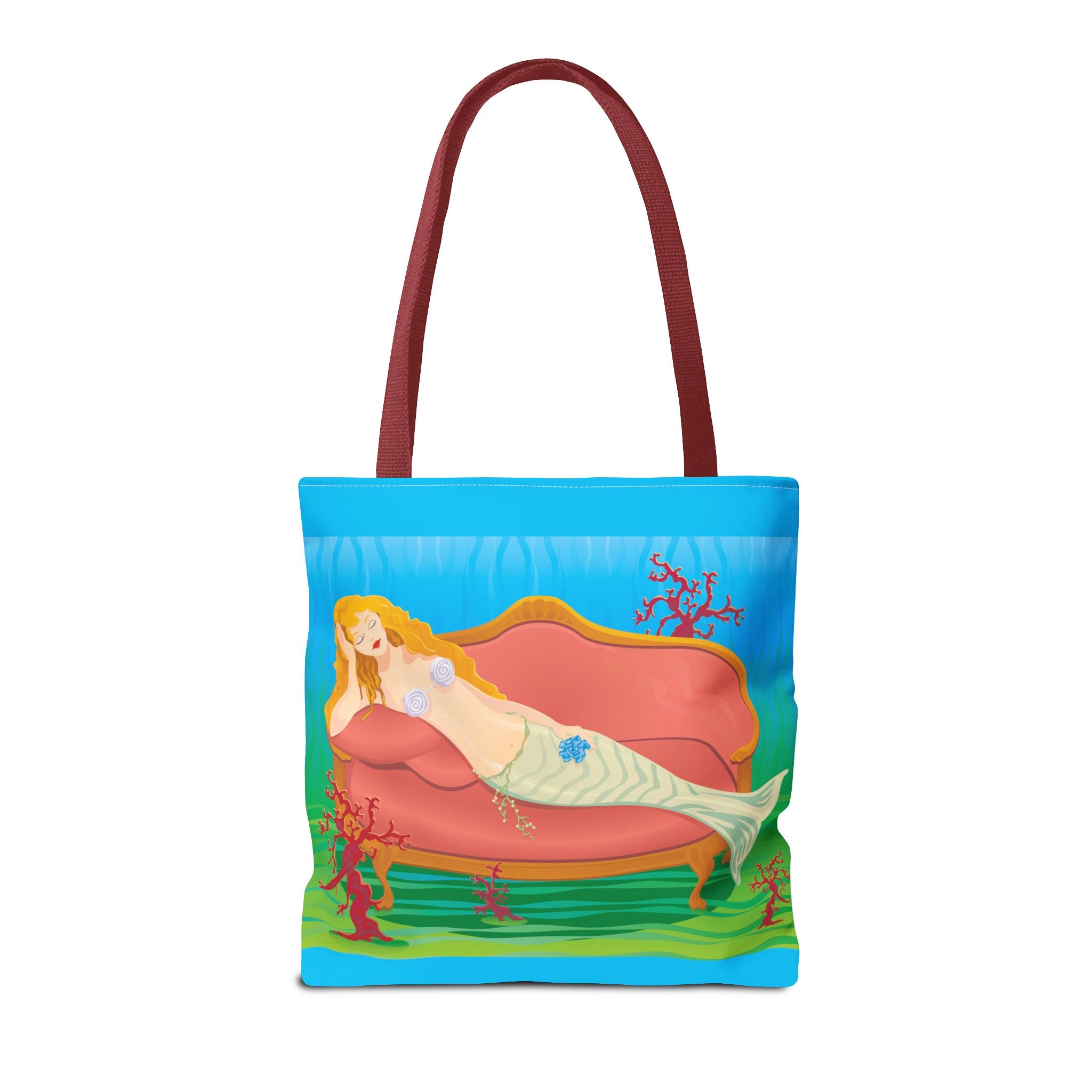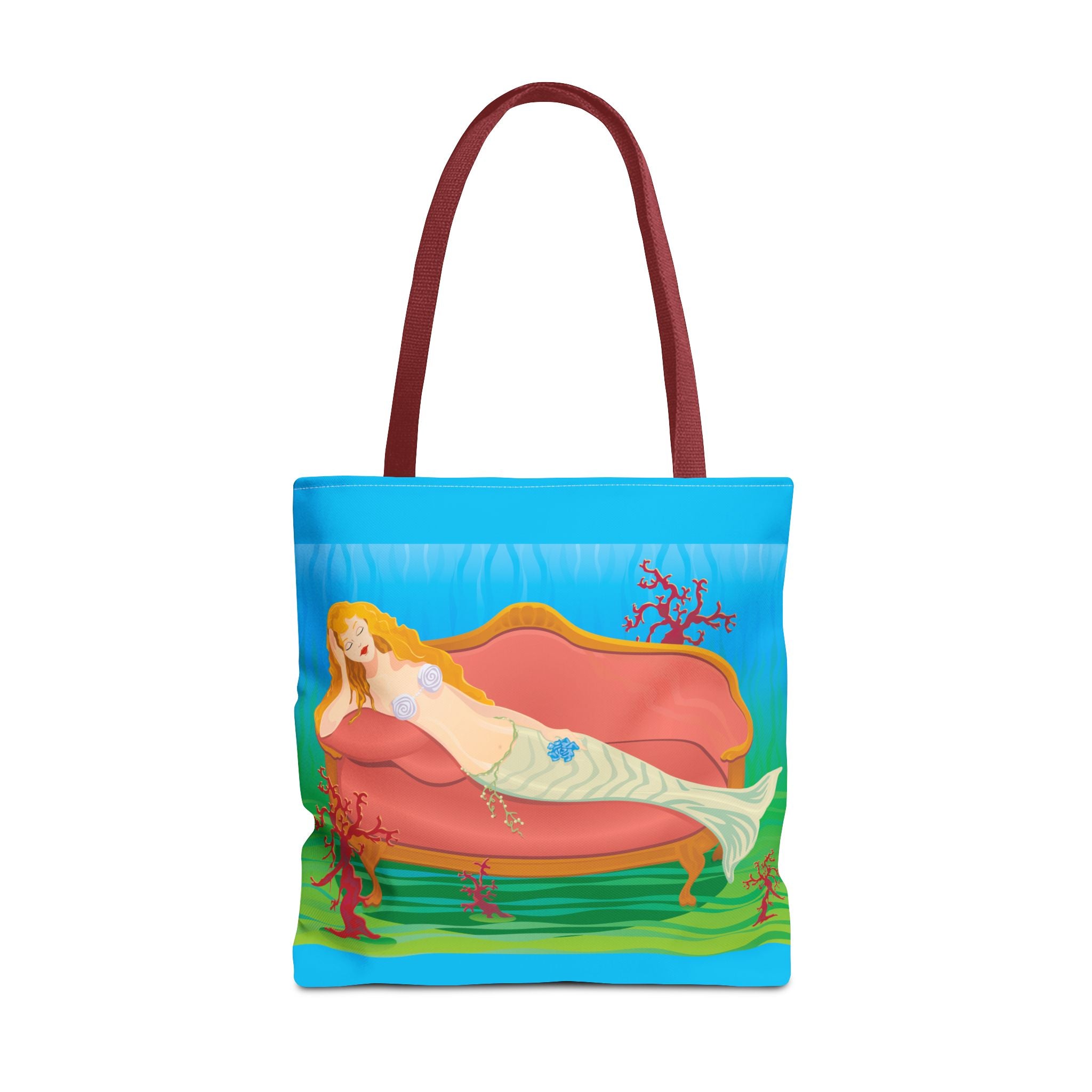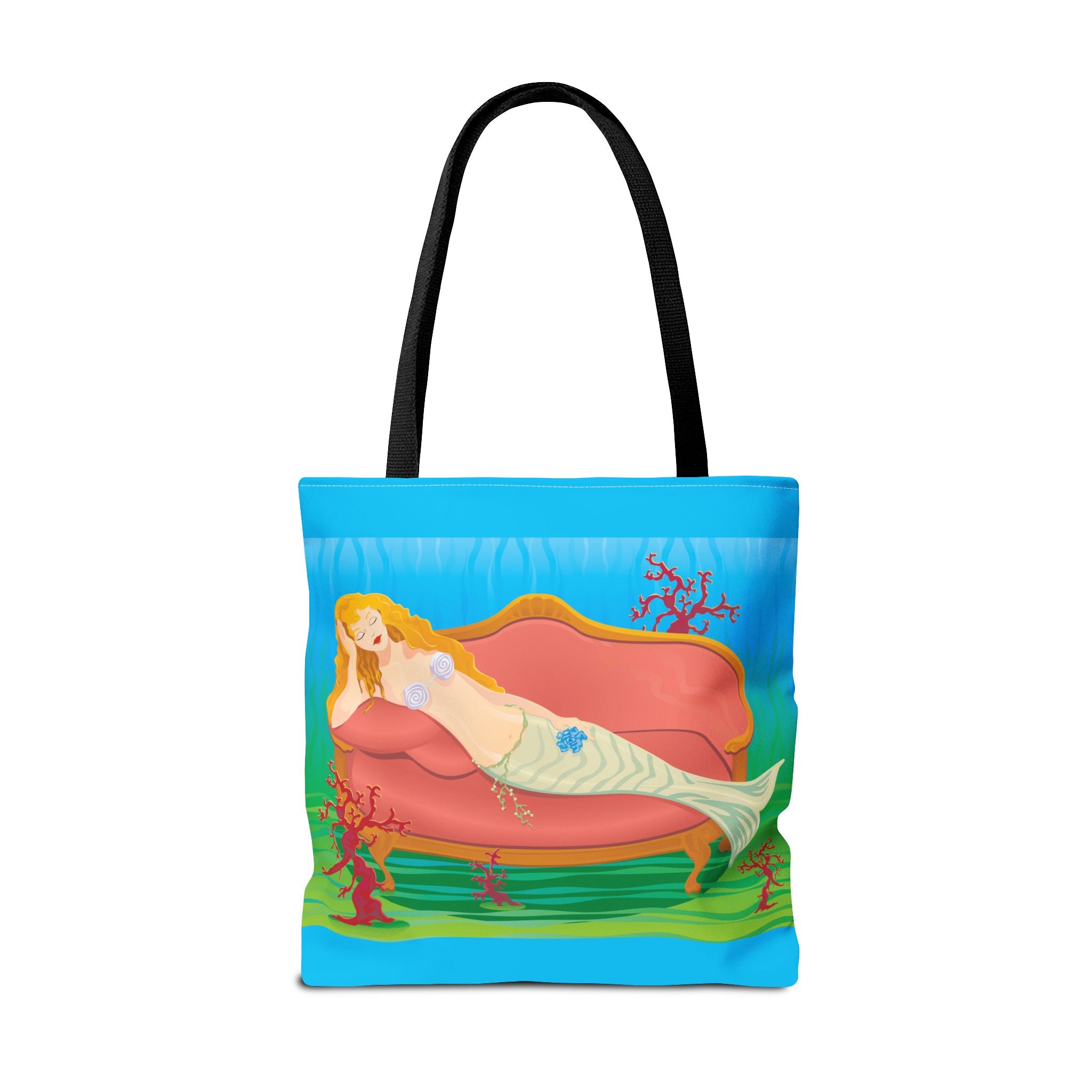 This vibrant tote bag features a bold and contemporary artwork of a mermaid reclining on a coral divan at the bottom of the sea. It gives a whimsical and artistic vibe, perfect for beach trips, summer outings, and casual everyday use. Ideal for mermaid lovers, ocean enthusiasts, and art appreciators. Great for gifting on birthdays, beach vacations, and summer holidays.