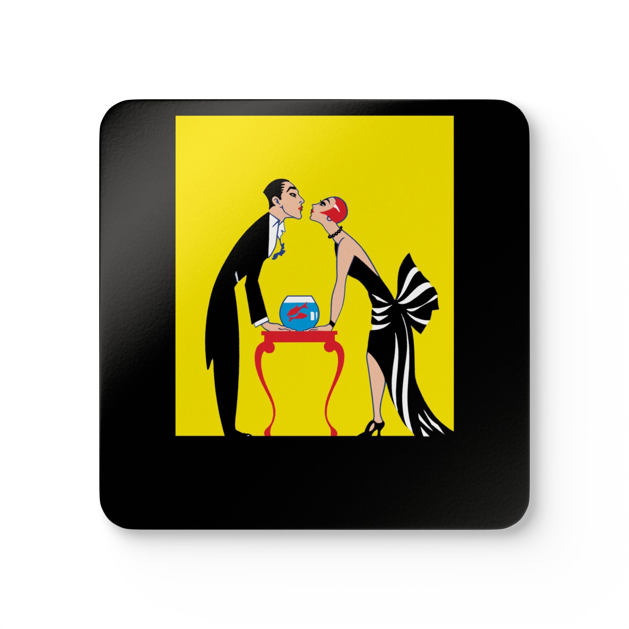 Artwork designed and digitally remastered by Sarasvati Designs. This stunning 1920s Art Deco composition unfolds against a radiant yellow backdrop, where an elegant couple shares a tender kiss. Between them, a delicate fishbowl shimmers, home to two graceful goldfish that mirror the lovers’ harmony. The scene captures the era’s blend of intimacy, luxury, and artistic finesse — a moment suspended in time, filled with beauty, passion, and poise.