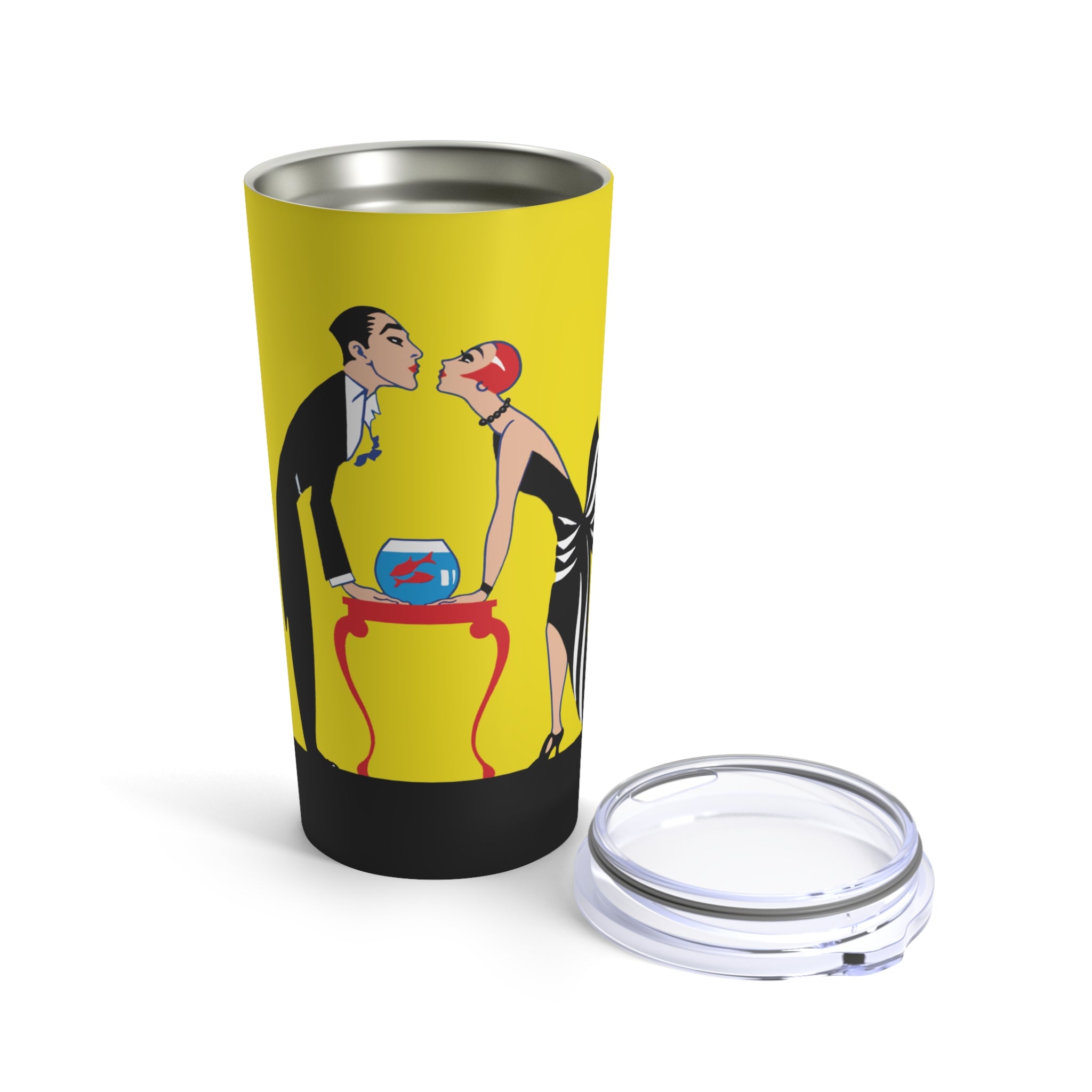 Artwork designed and digitally remastered by Sarasvati Designs. In this captivating 1920s art deco image, set against a brilliant yellow background, an atmosphere of elegance and romance unfolds. At the heart of the composition, an elegant man and woman share a passionate kiss, their embrace framed by a captivating scene. Between the couple, a fishbowl takes center stage, housing two vibrant goldfish that gracefully swim amidst the water.