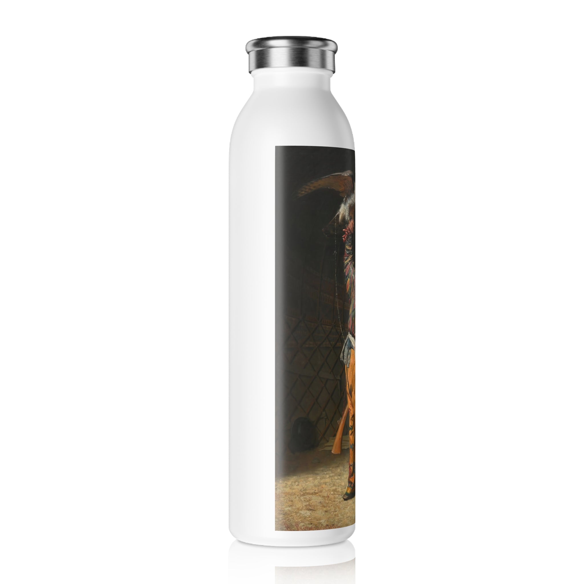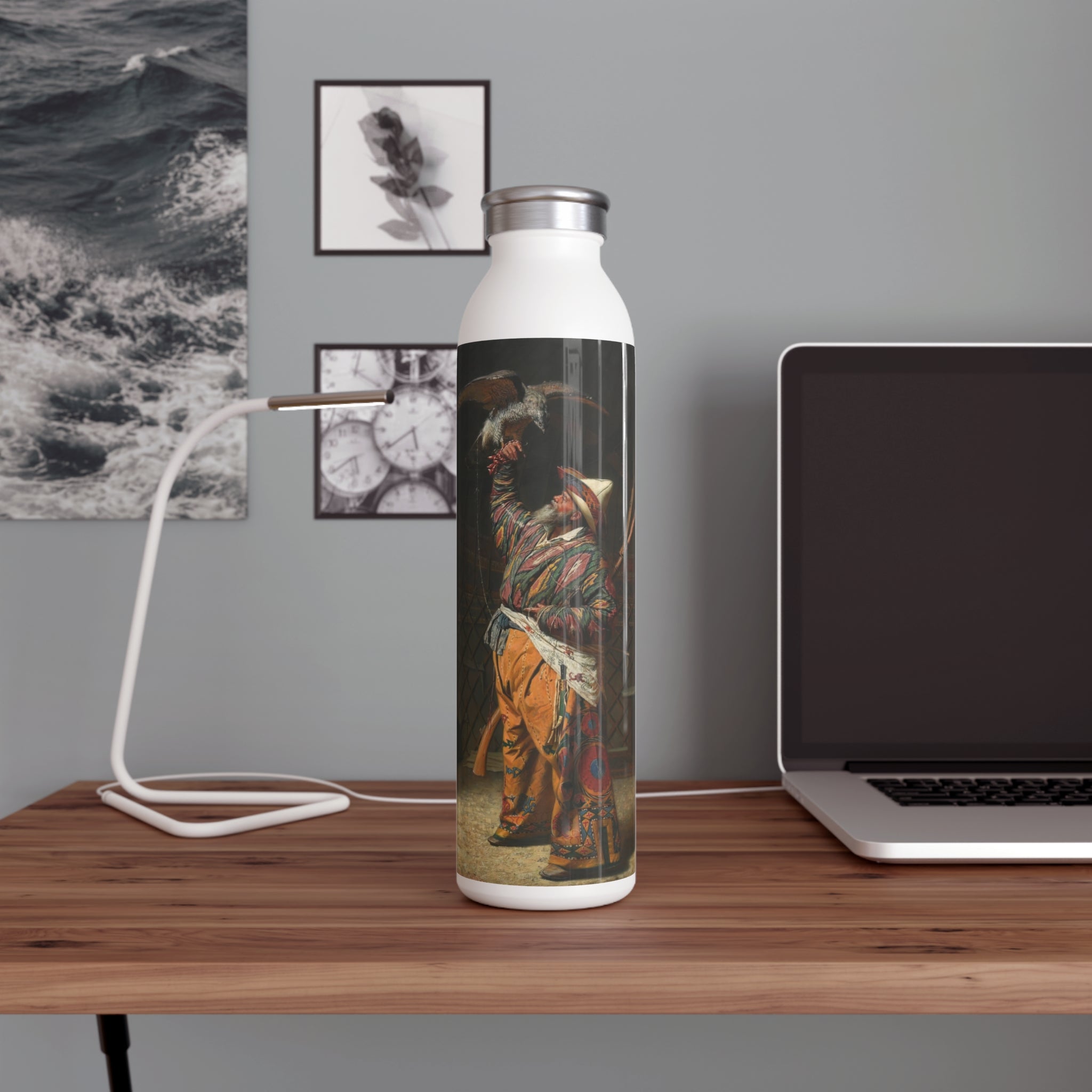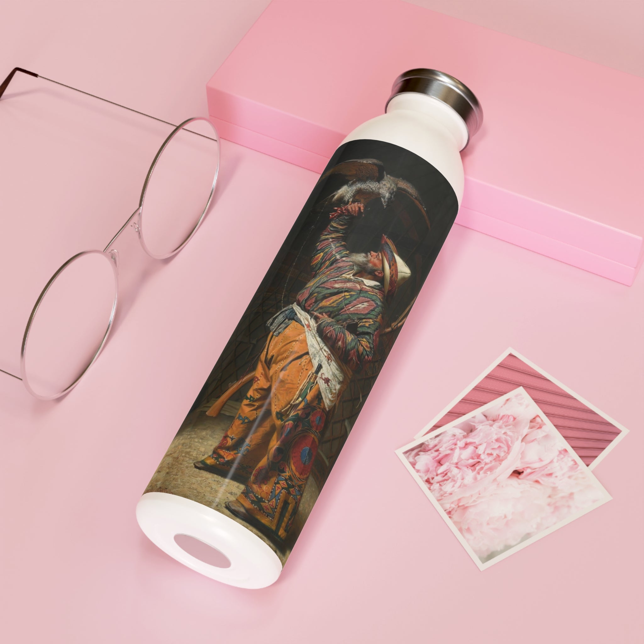 This artful water bottle boasts a 20oz capacity, a trendy lid, double-wall stainless steel construction, and employs vacuum insulation to maintain the ideal temperature of your beverages for extended periods. The vintage art design comes alive in vibrant detail against the chic matte finish.