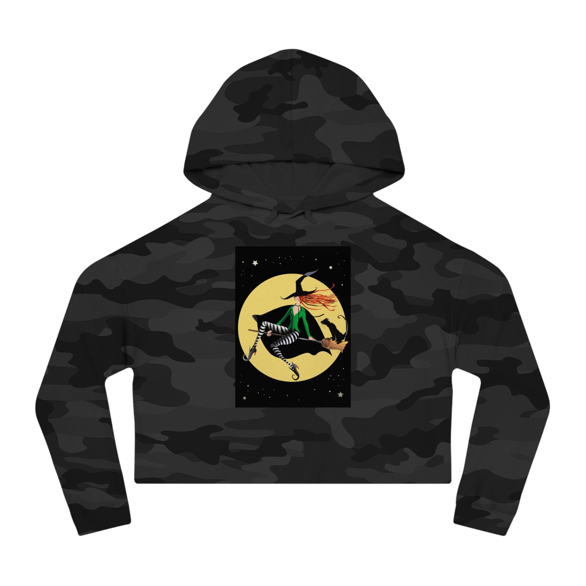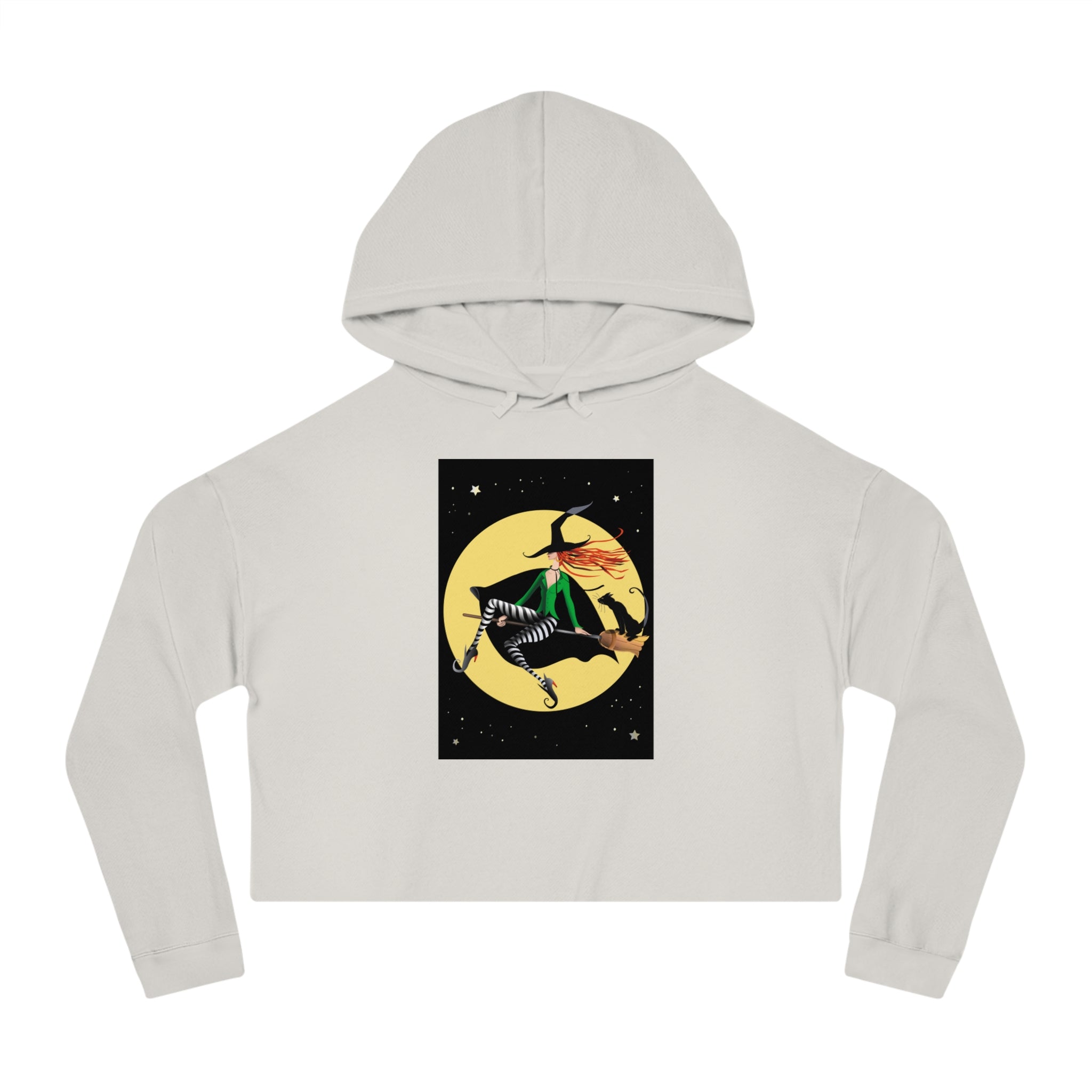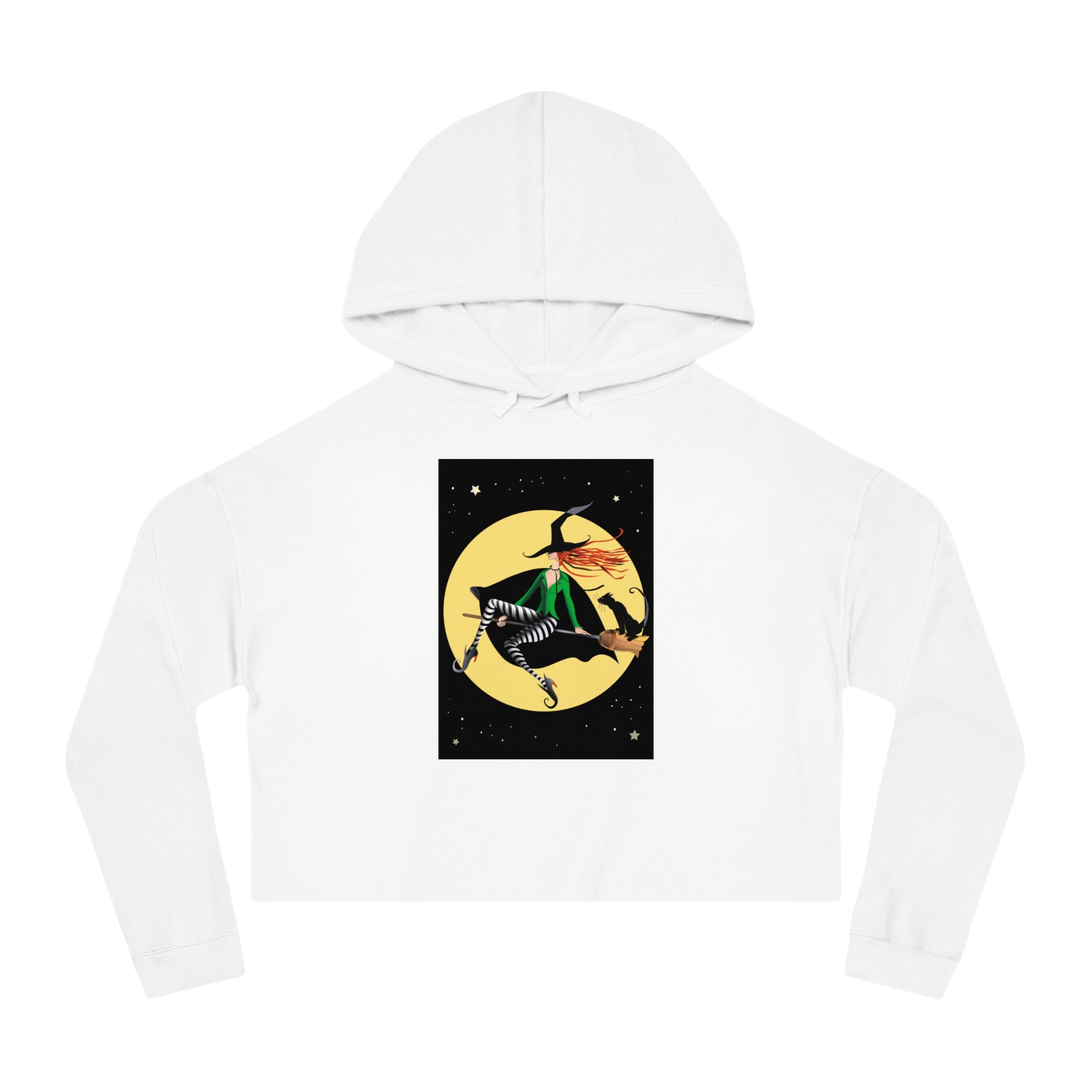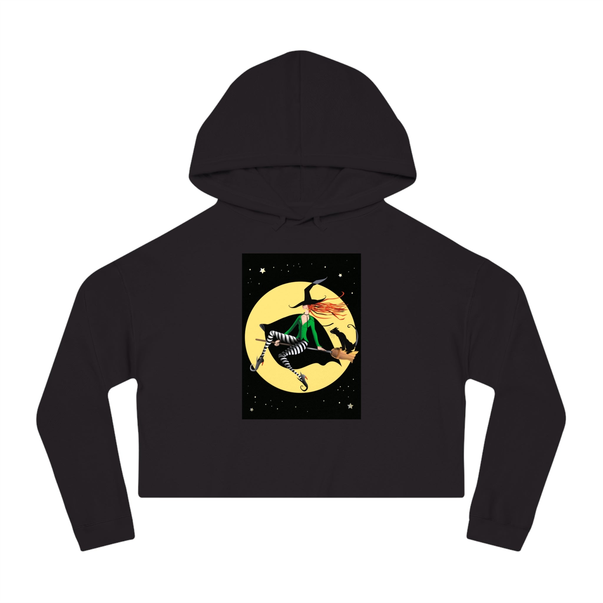 Artwork created, designed and digitally remastered by Sarasvati Designs. A chic witch glides through the night sky on her broom, set against a radiant yellow full moon. Her flowing red hair streams behind her, partially obscured by a stylish black hat. She wears a fashionable green shirt, complemented by black and white striped tights, sleek black boots, and a dramatic black cape. Perched on the back of her broom is a poised black cat, adding a touch of charm to their magical journey. The backdrop is a deep, star-filled night sky, enhancing the whimsical and enchanting atmosphere of the scene.