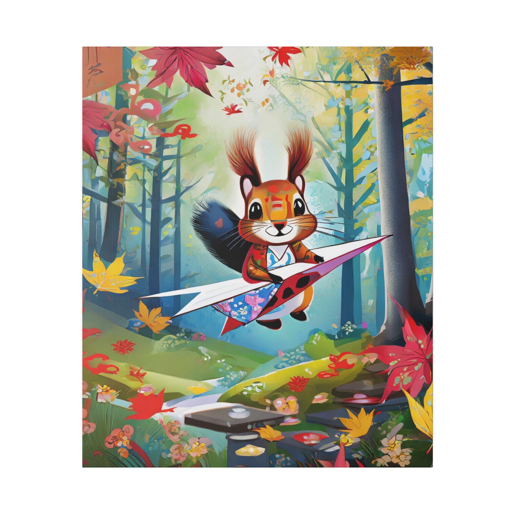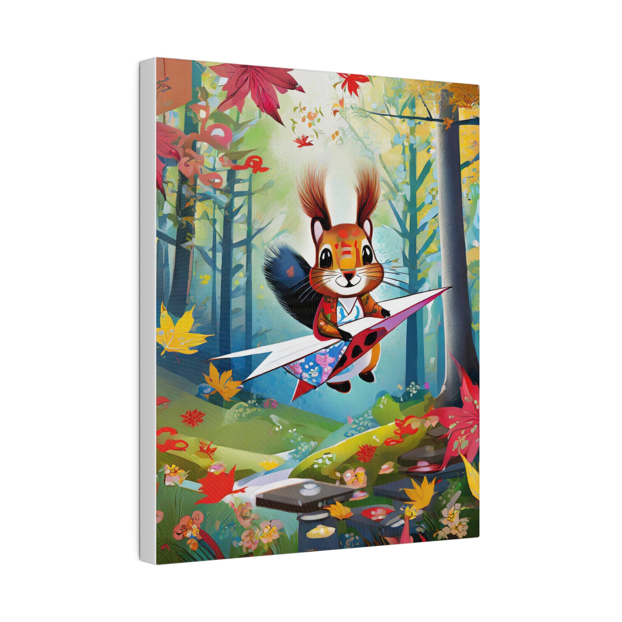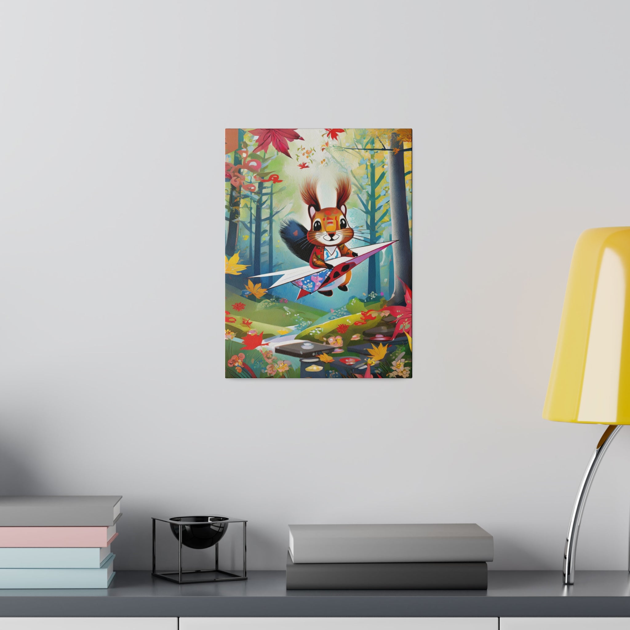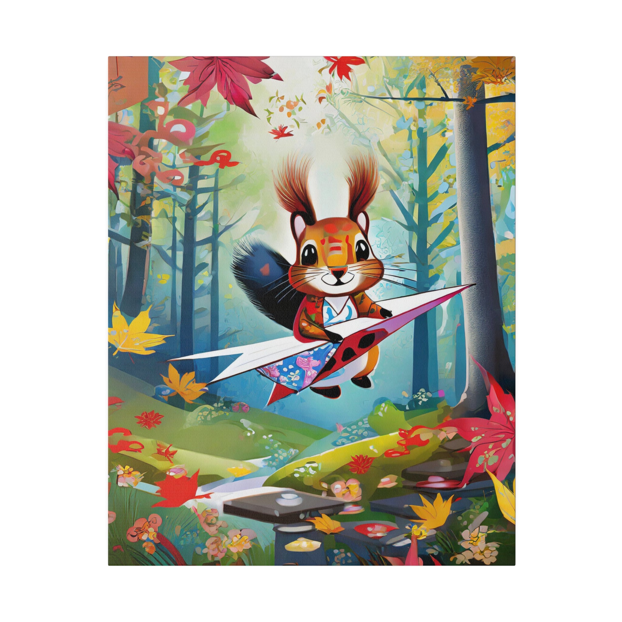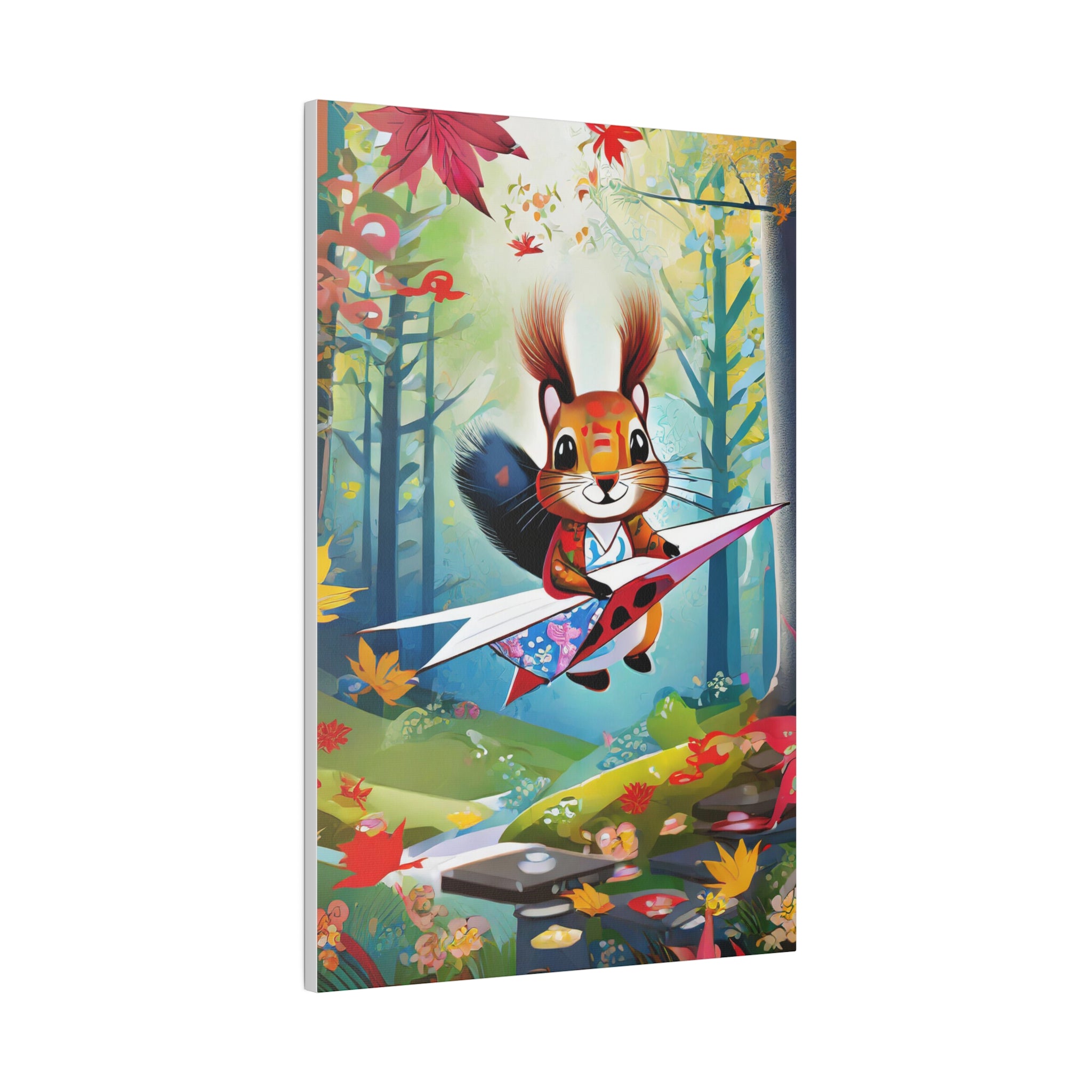 Artwork created, designed and digitally remastered by Sarasvati Designs. A whimsical scene of a charming squirrel flying a paper airplane through a forest.