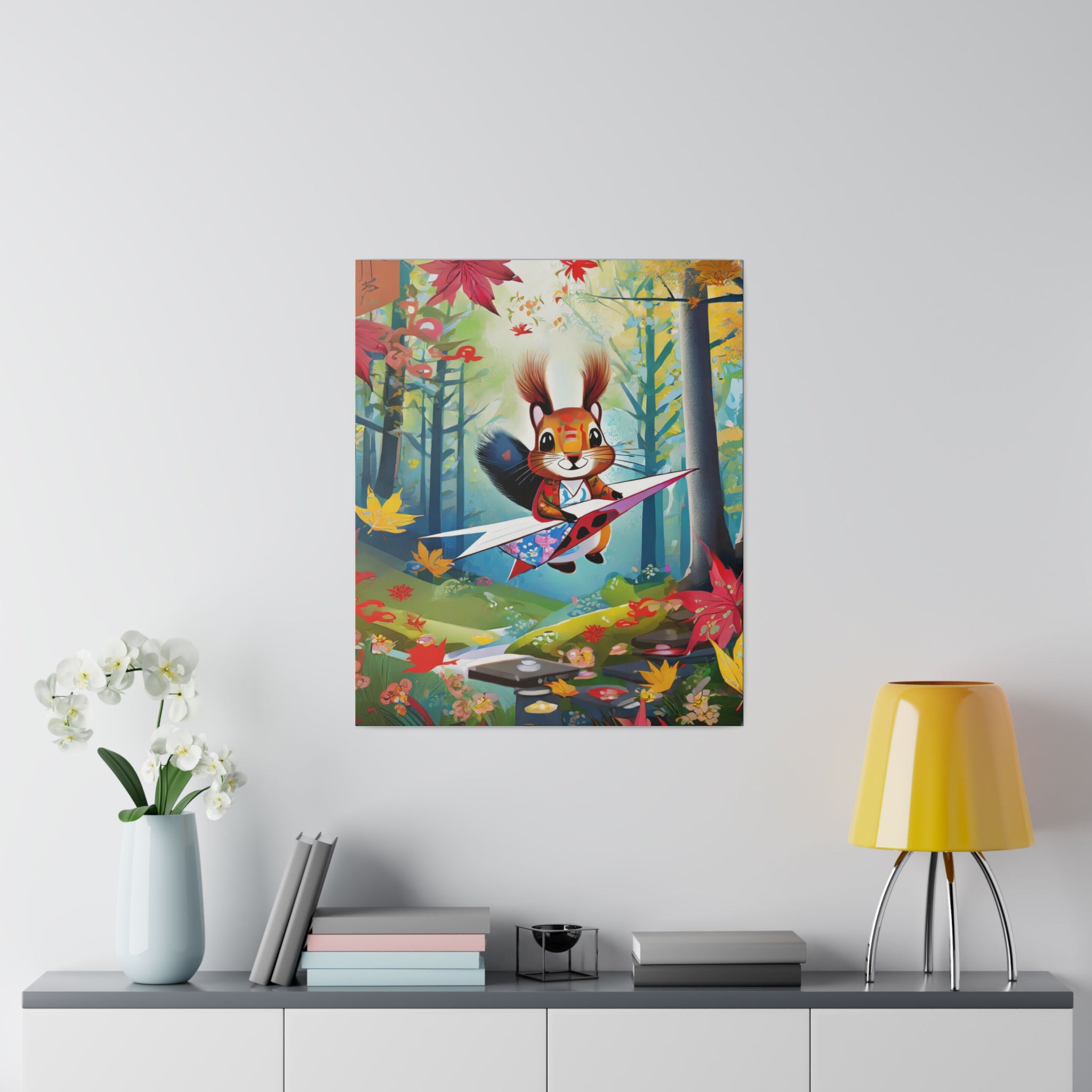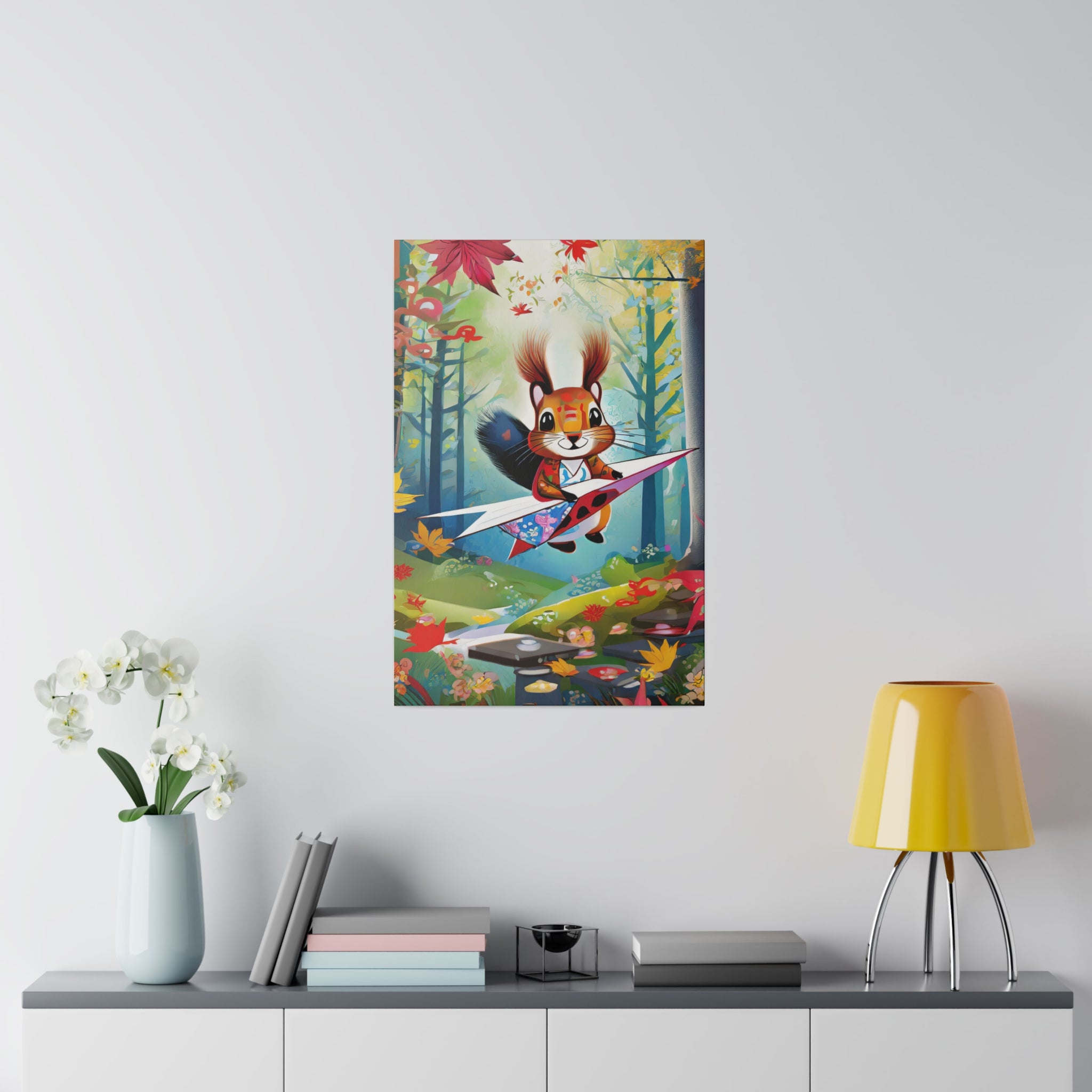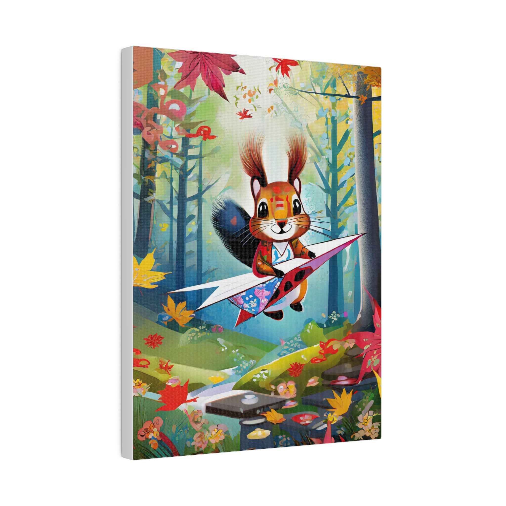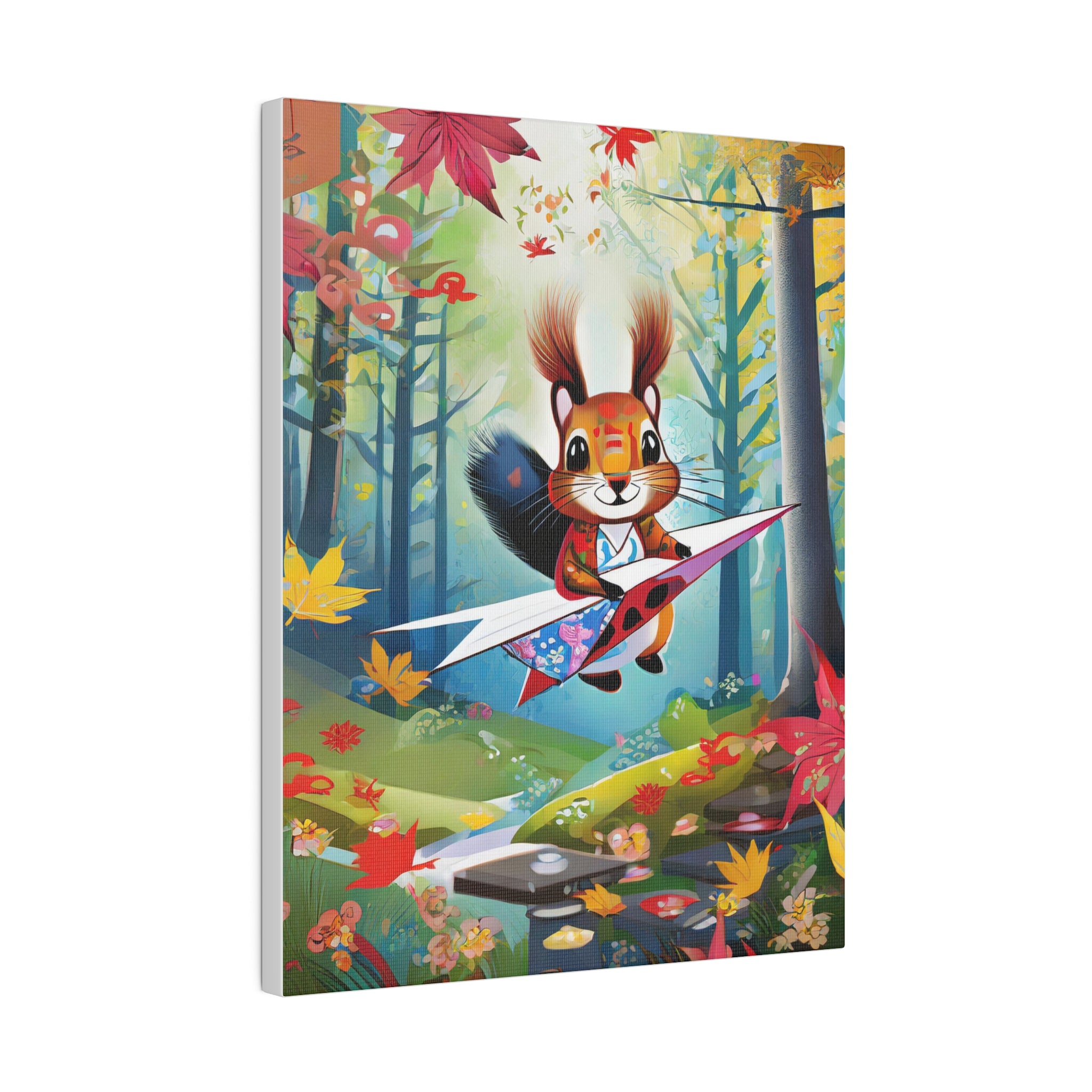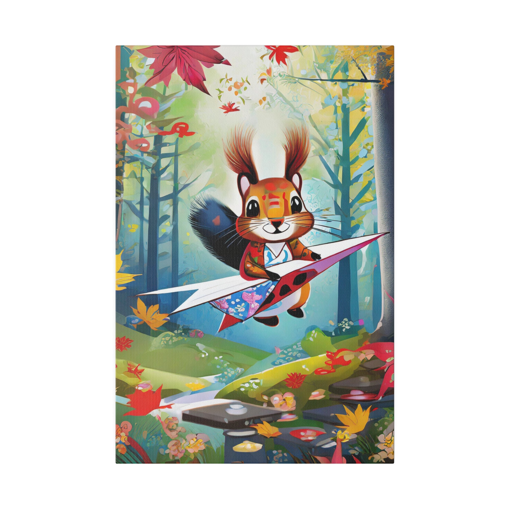 Artwork created, designed and digitally remastered by Sarasvati Designs. A whimsical scene of a charming squirrel flying a paper airplane through a forest.