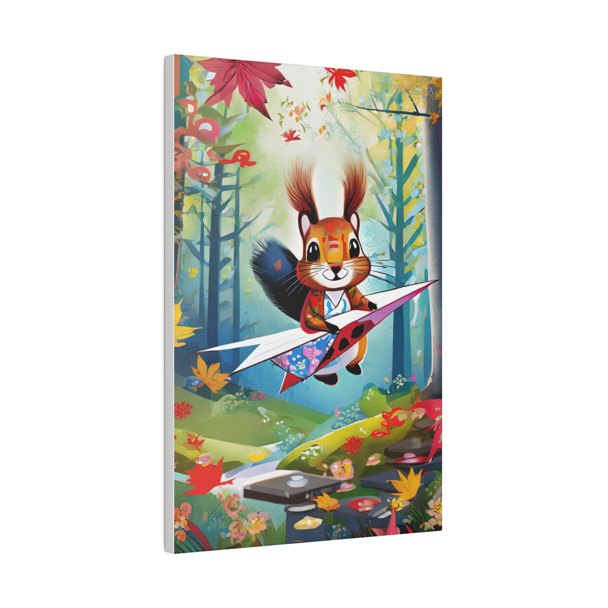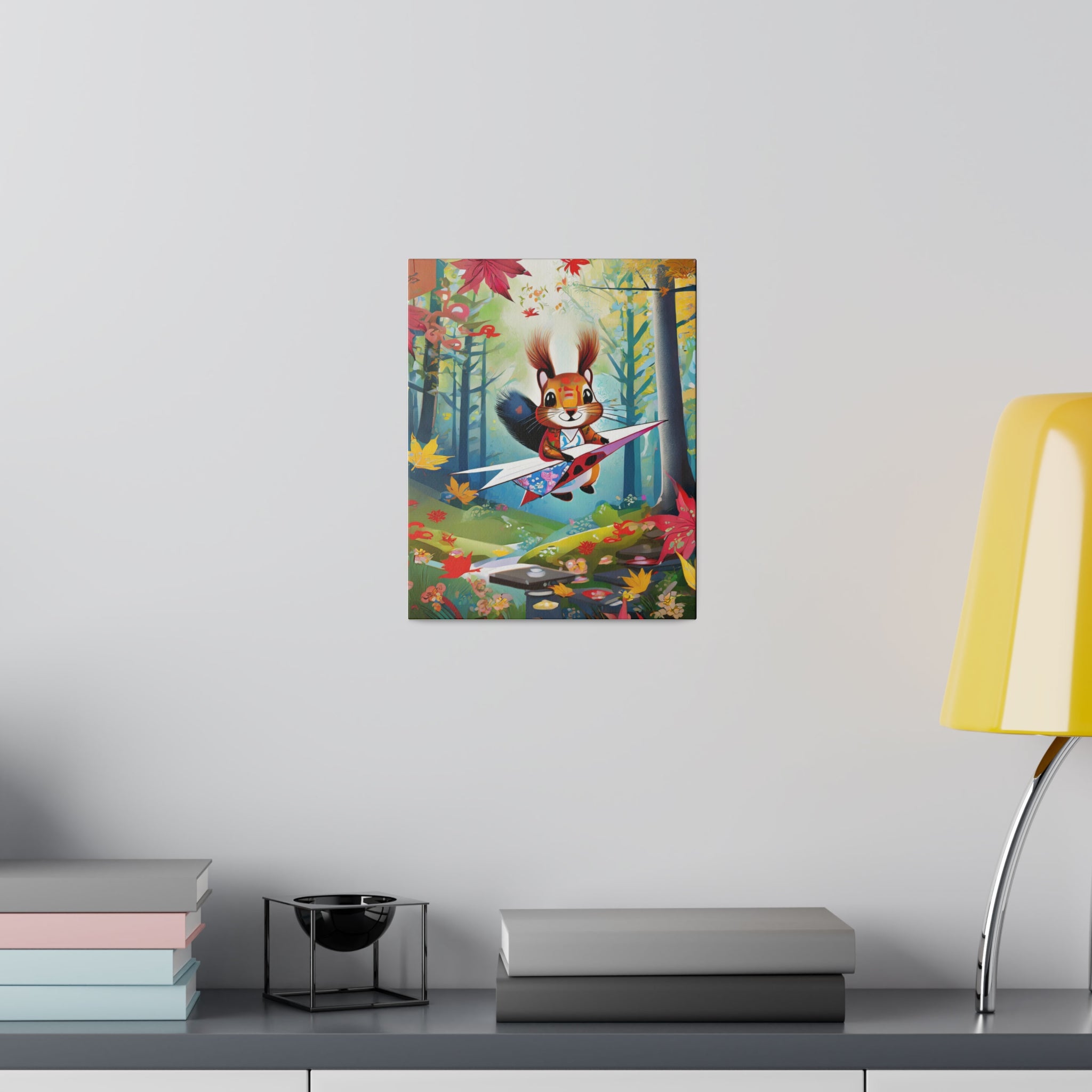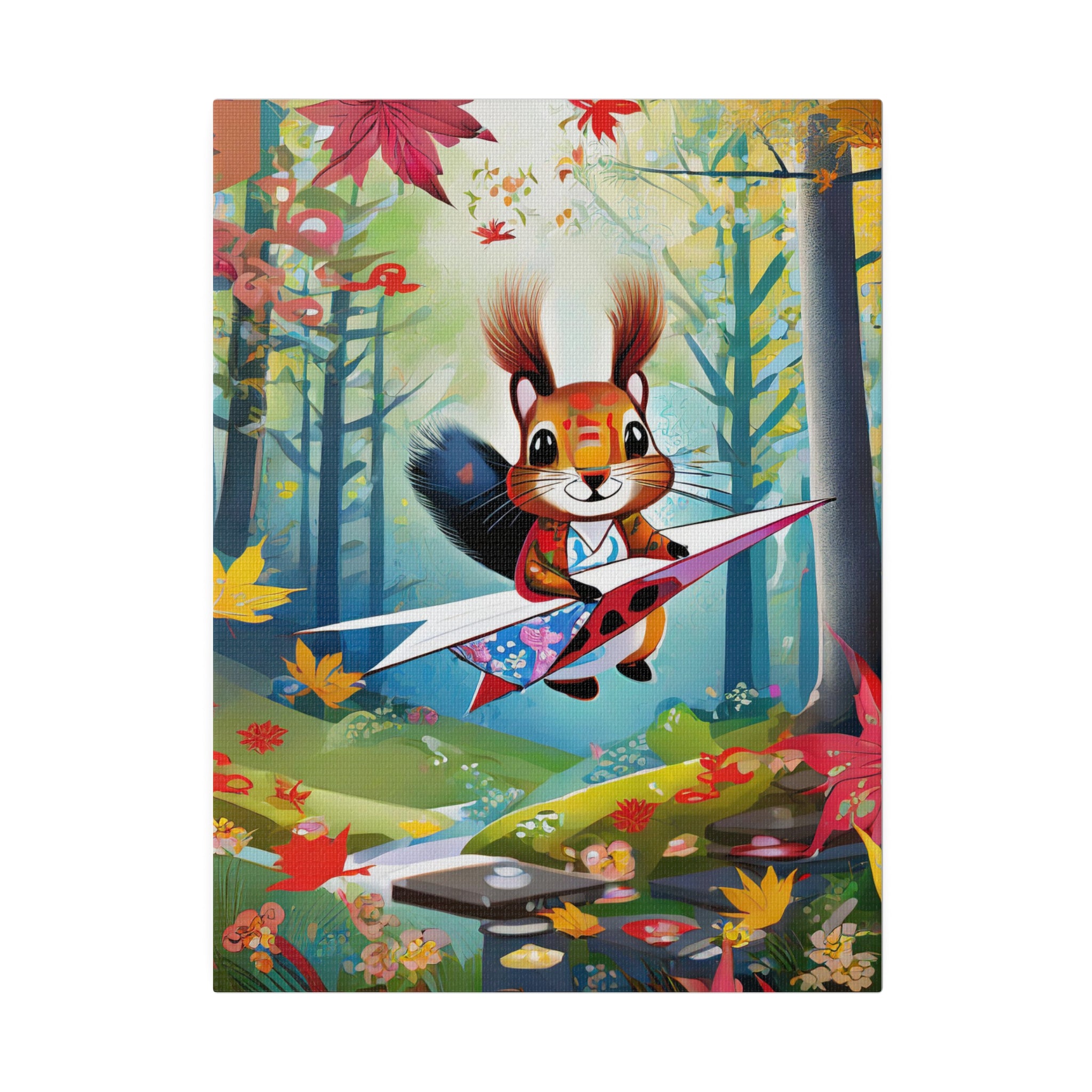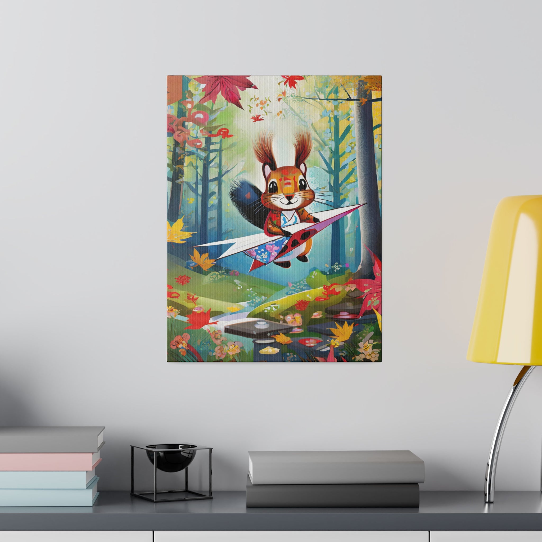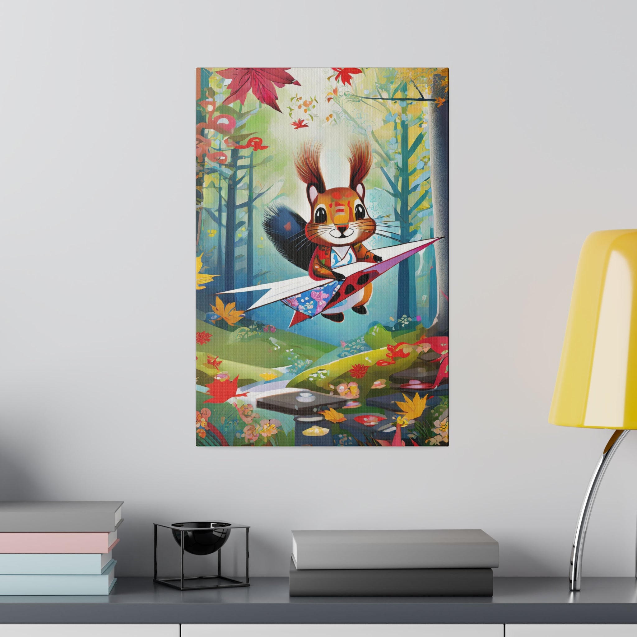 Artwork created, designed and digitally remastered by Sarasvati Designs. A whimsical scene of a charming squirrel flying a paper airplane through a forest.