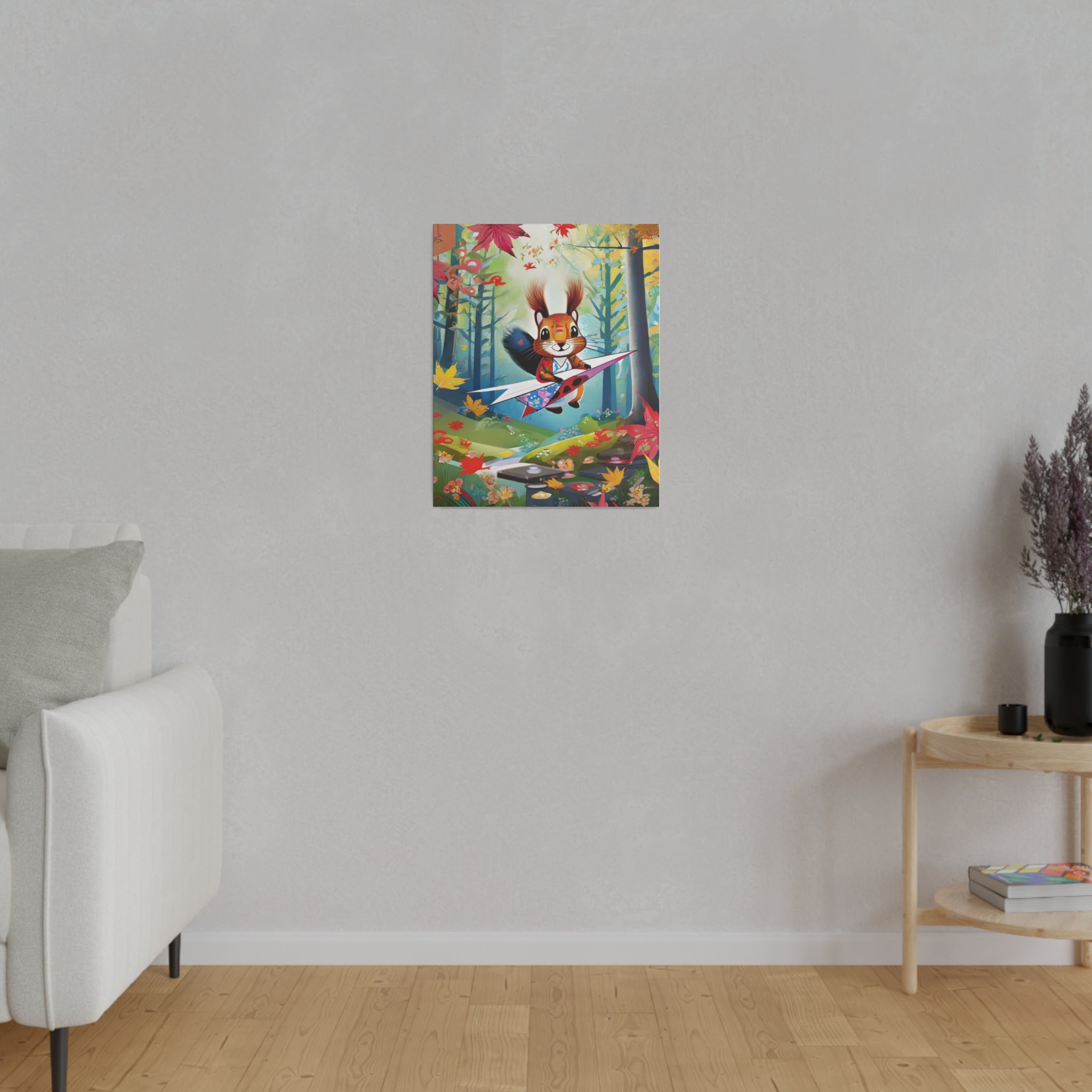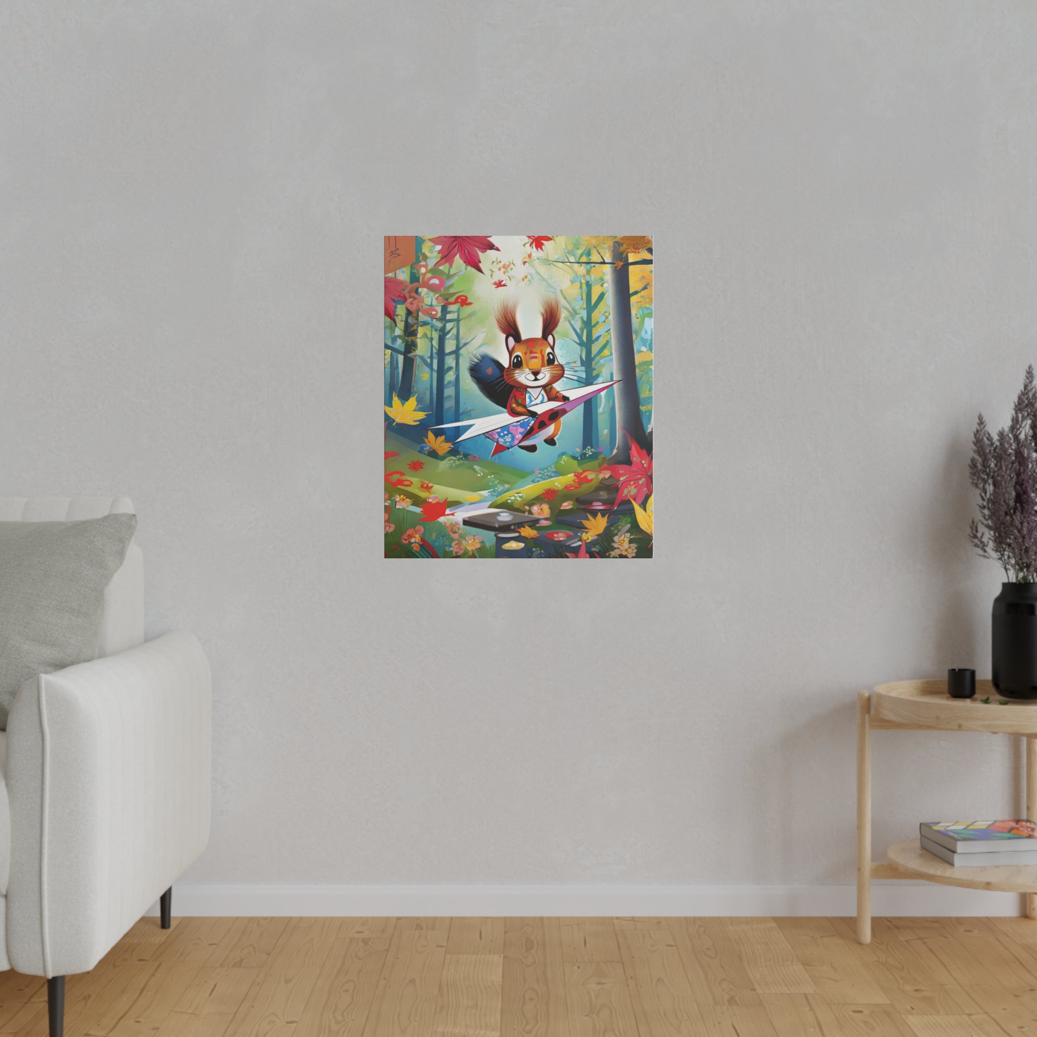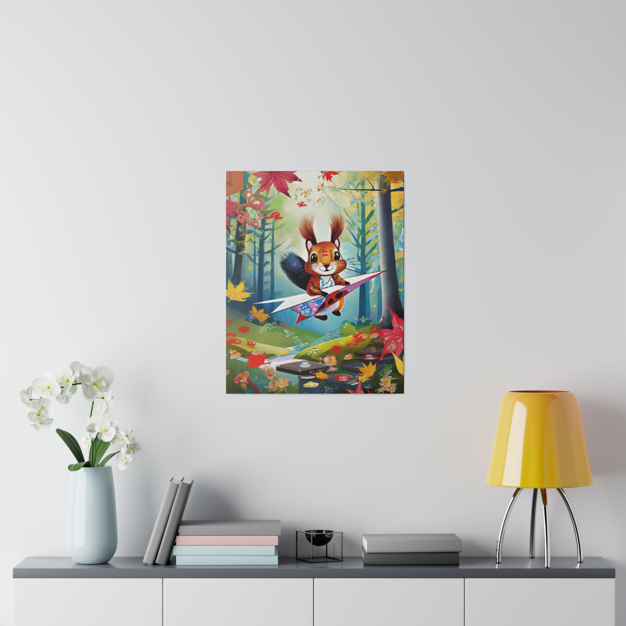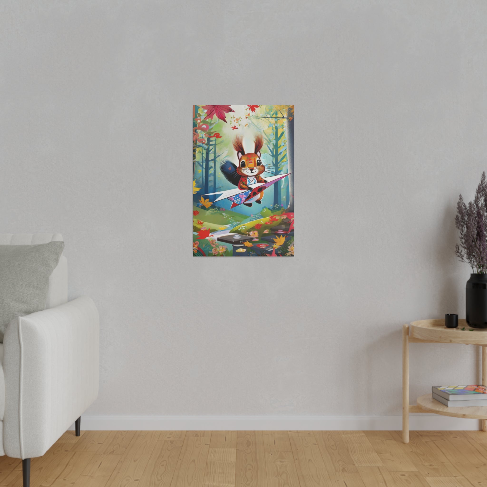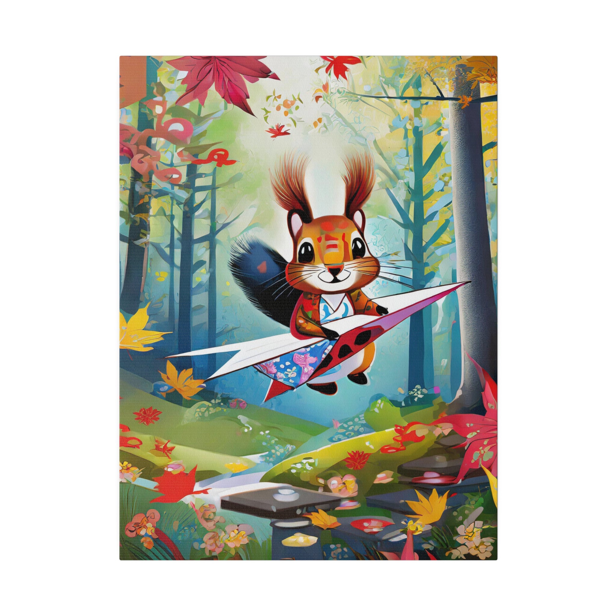 Artwork created, designed and digitally remastered by Sarasvati Designs. A whimsical scene of a charming squirrel flying a paper airplane through a forest.