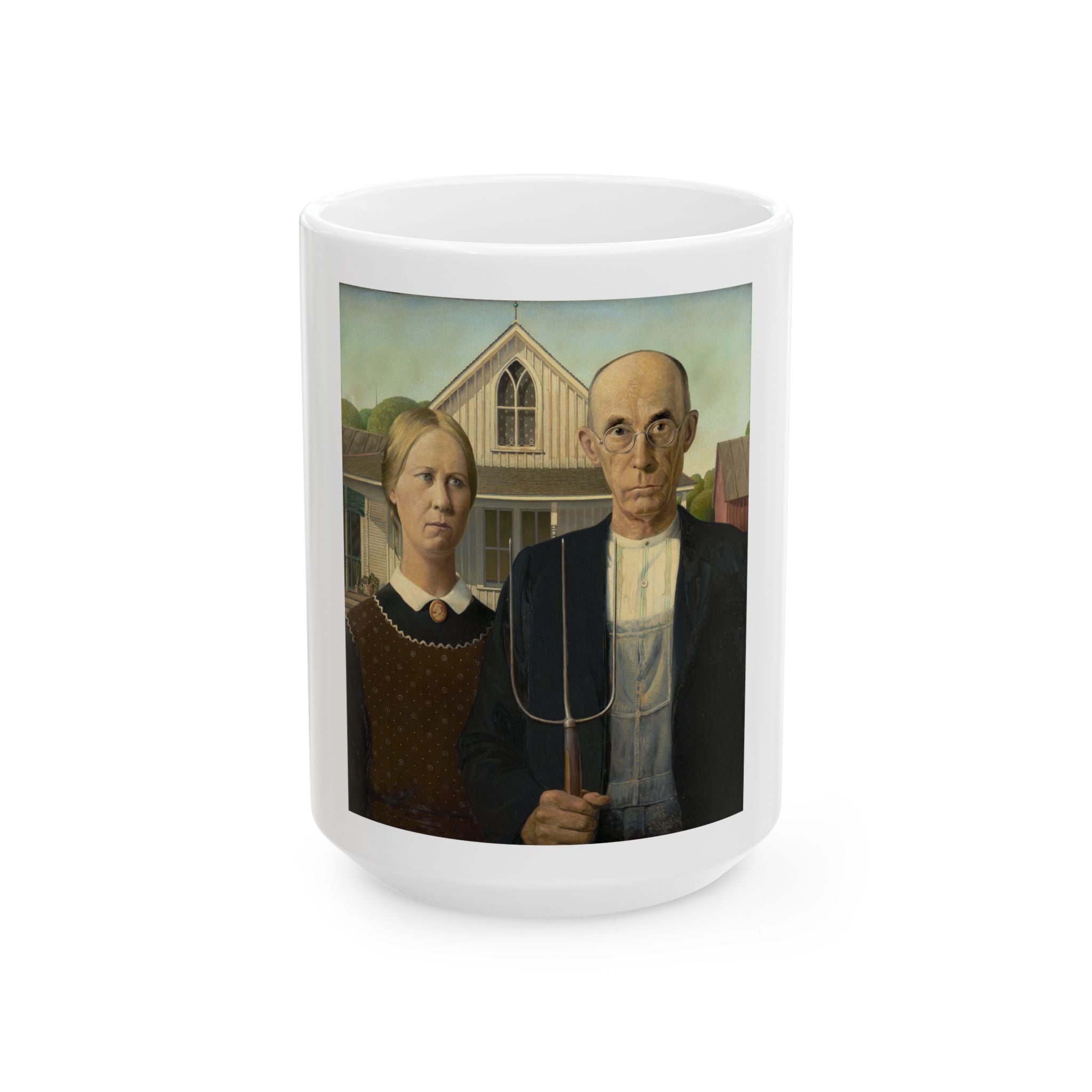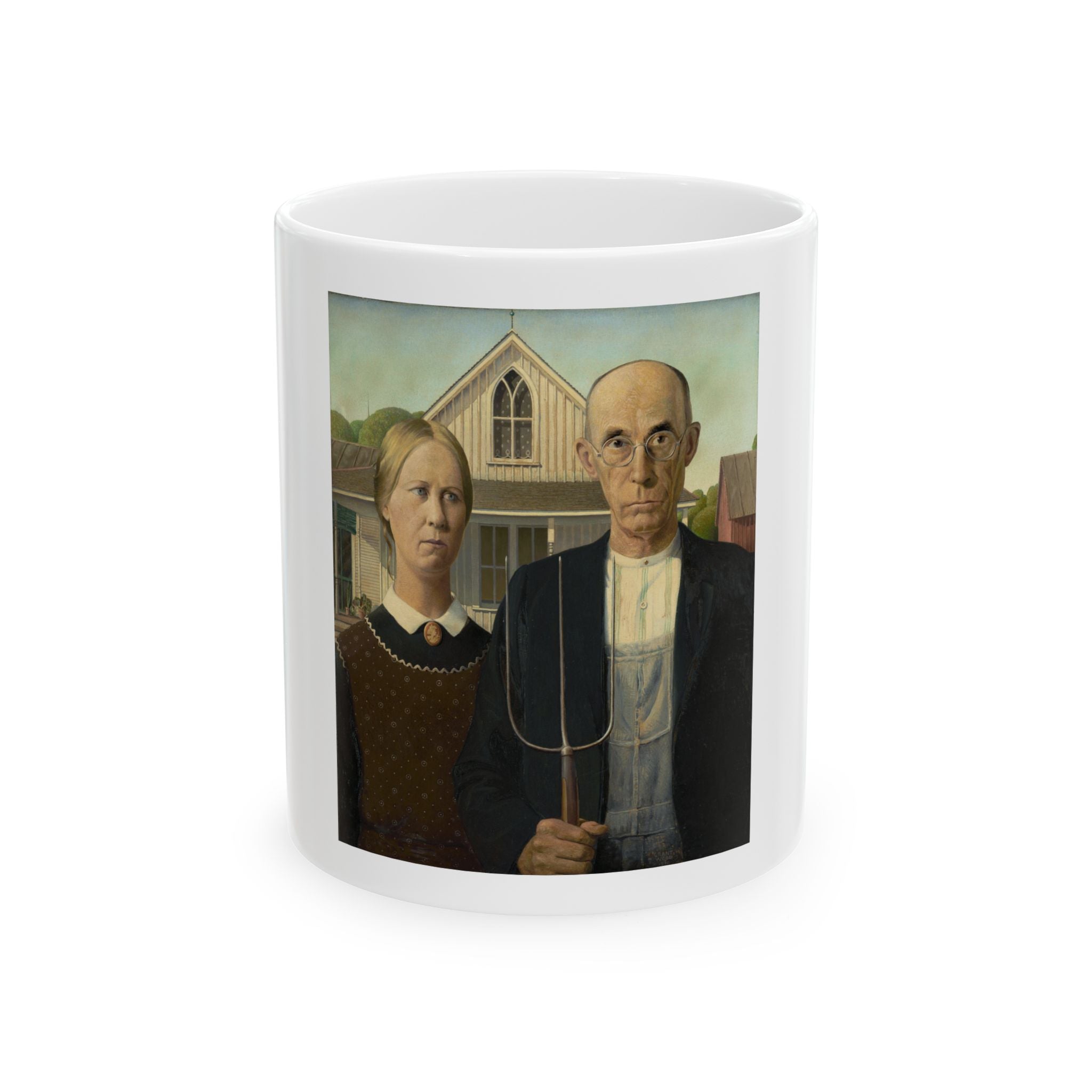 Artwork designed and digitally remastered by Sarasvati Designs. American Gothic is a 1930 painting by Grant Wood in the collection of the Art Institute of Chicago. Wood was inspired to paint what is now known as the American Gothic House in Eldon, Iowa, along with "the kind of people [he] fancied should live in that house". It depicts a farmer standing beside his daughter – often mistakenly assumed to be his wife. The painting's name is a word play on the house's architectural style, Carpenter Gothic. Wood was quoted in this period as stating, "All the good ideas I've ever had came to me while I was milking a cow." Wood intended the painting to depict the farmer and his daughter as survivors, to pay homage to the strength of the rural community, and to provide reassurance in a time of great economic upset. American Gothic is a masterpiece of American art.