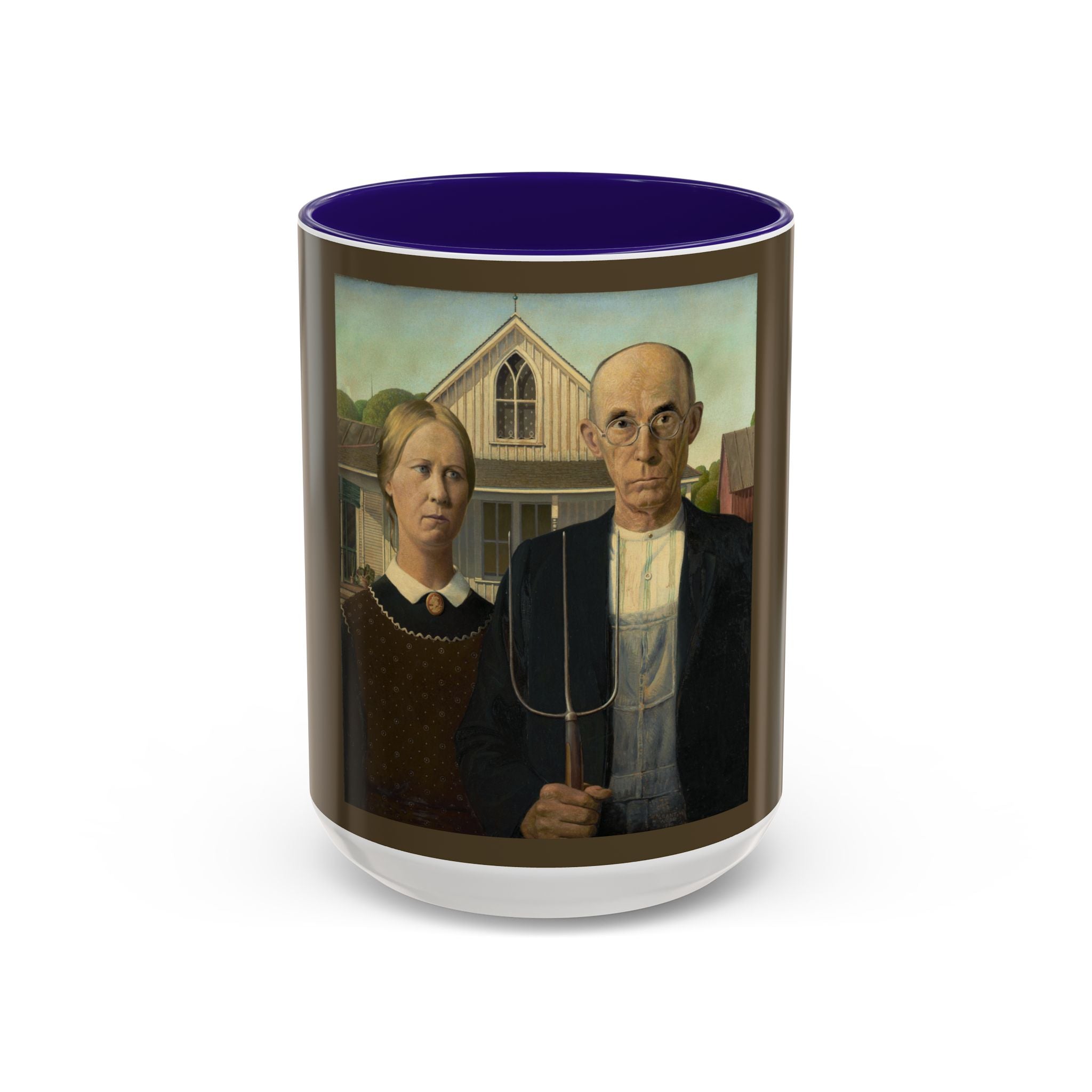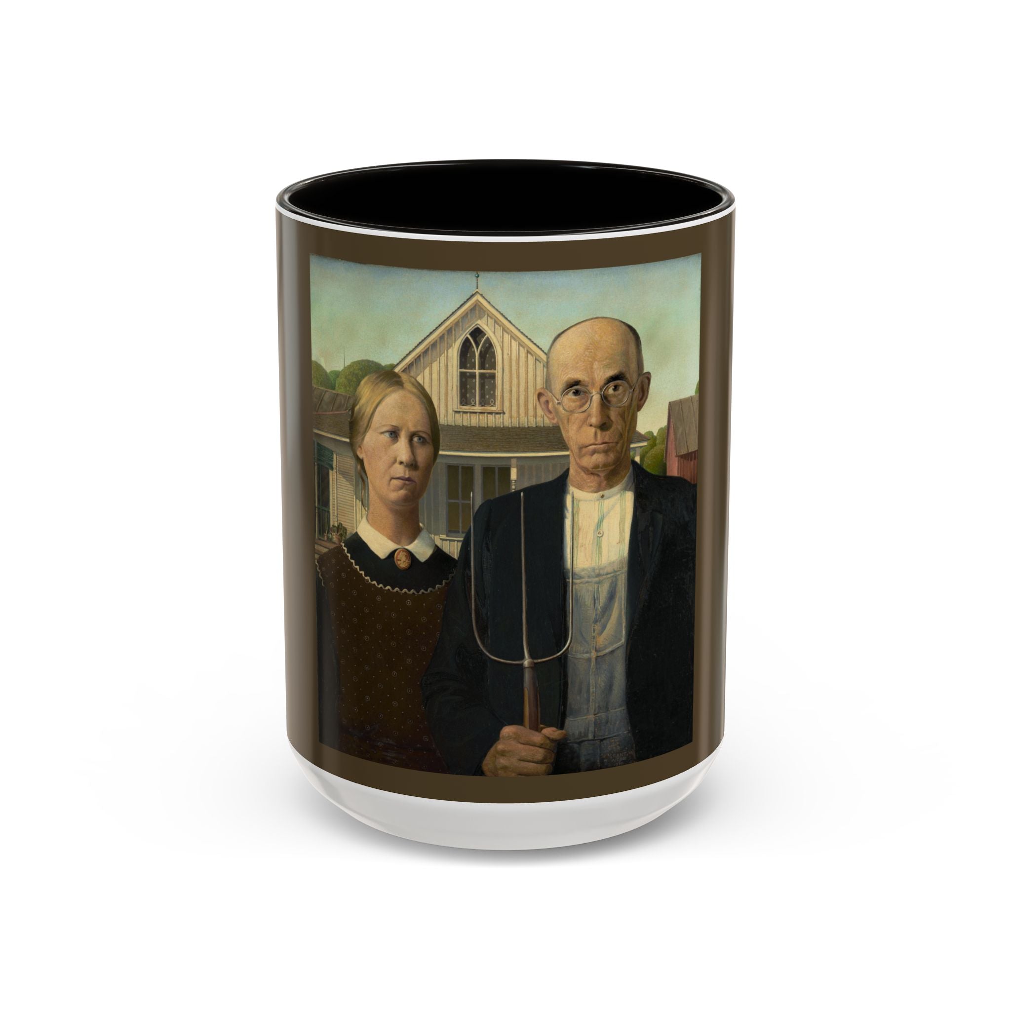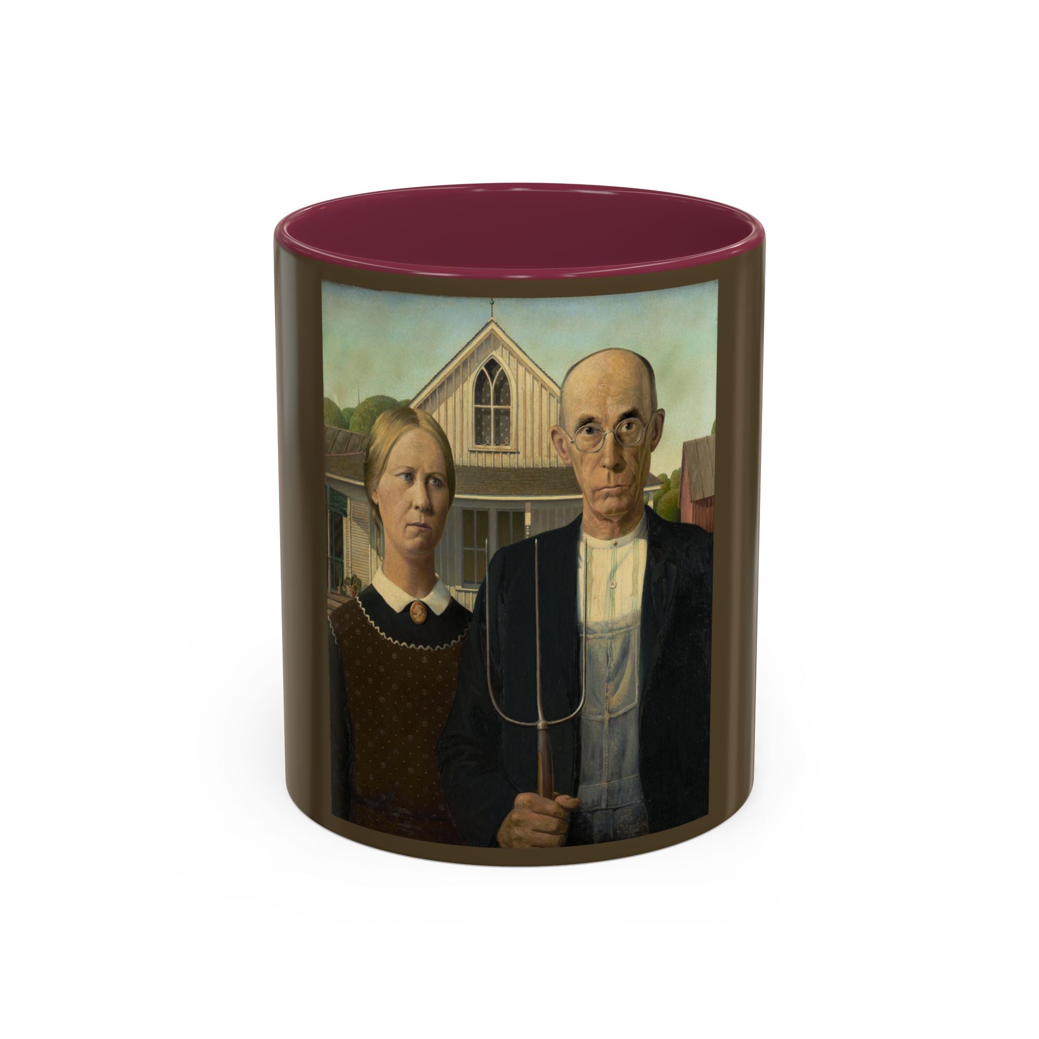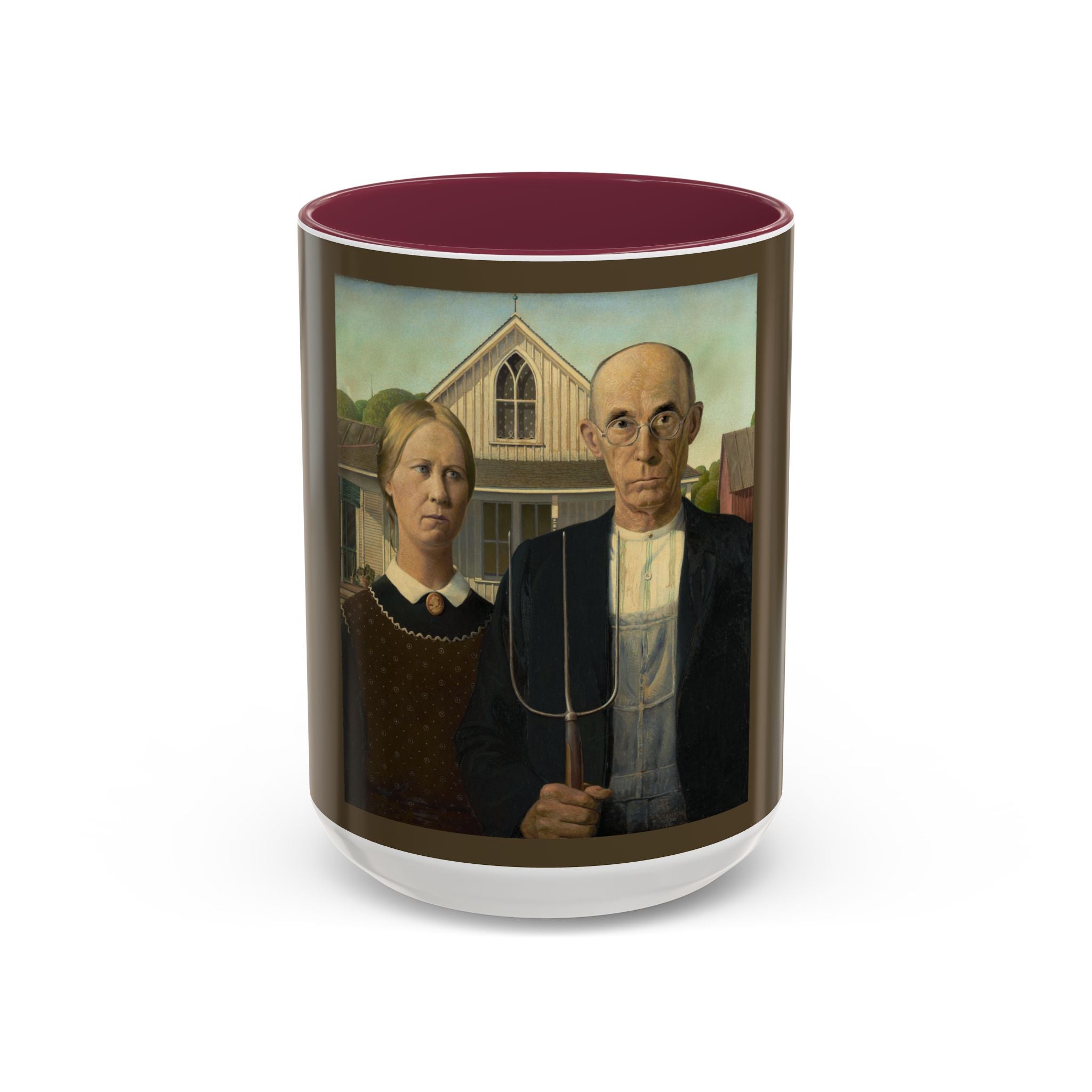 Artwork designed and digitally remastered by Sarasvati Designs. American Gothic is a 1930 painting by Grant Wood in the collection of the Art Institute of Chicago. Wood was inspired to paint what is now known as the American Gothic House in Eldon, Iowa, along with "the kind of people [he] fancied should live in that house". It depicts a farmer standing beside his daughter – often mistakenly assumed to be his wife. The painting's name is a word play on the house's architectural style, Carpenter Gothic. Wood was quoted in this period as stating, "All the good ideas I've ever had came to me while I was milking a cow." Wood intended the painting to depict the farmer and his daughter as survivors, to pay homage to the strength of the rural community, and to provide reassurance in a time of great economic upset. American Gothic is a masterpiece of American art.