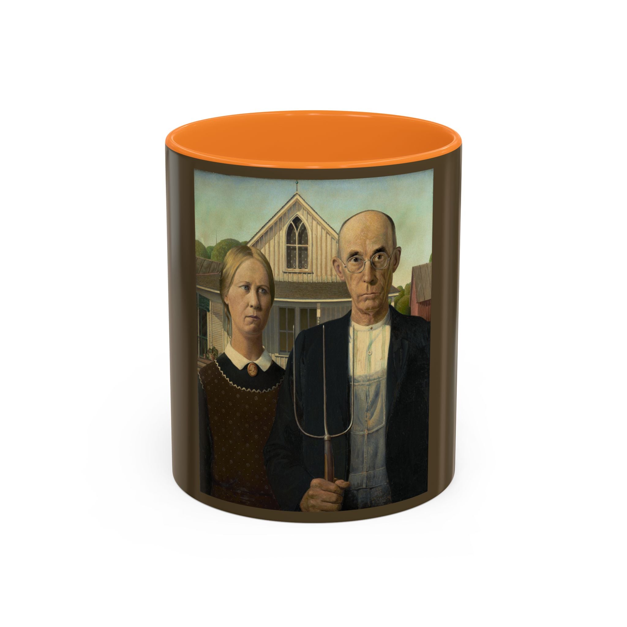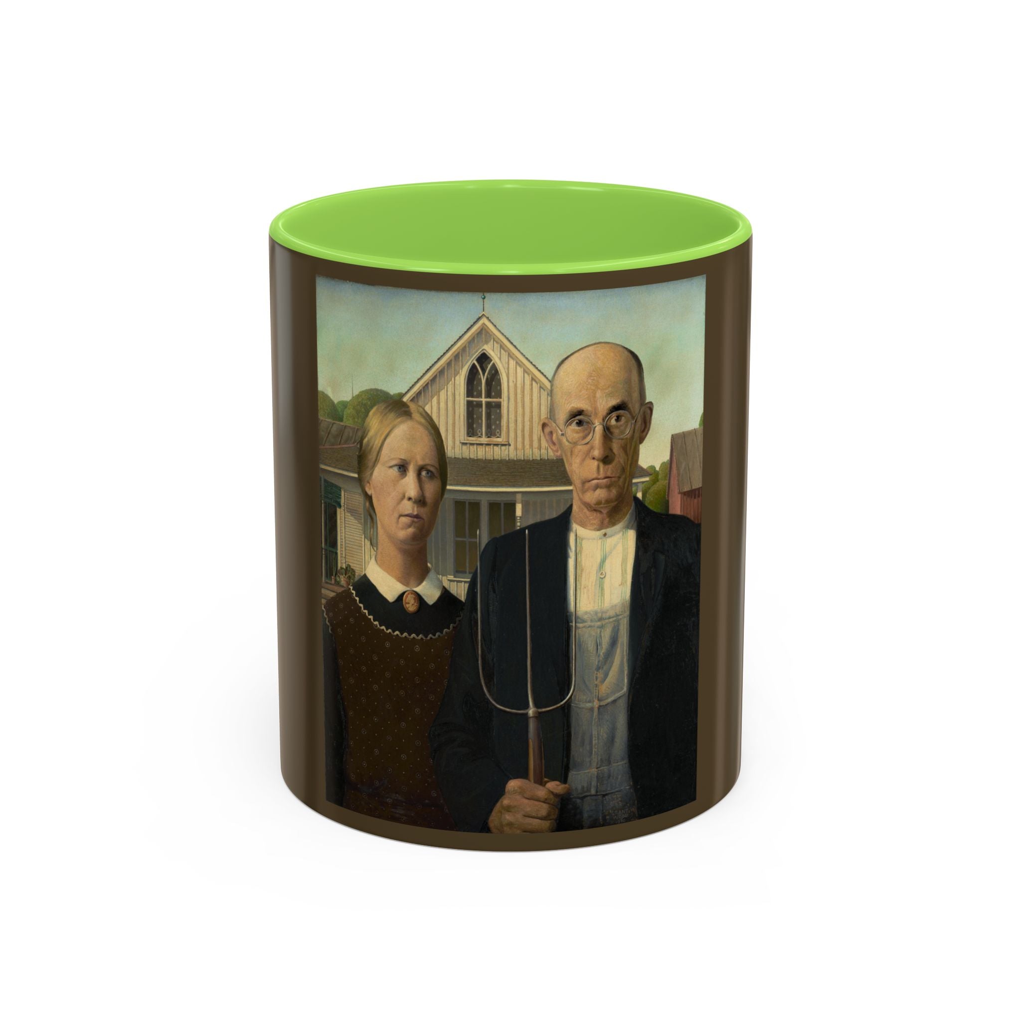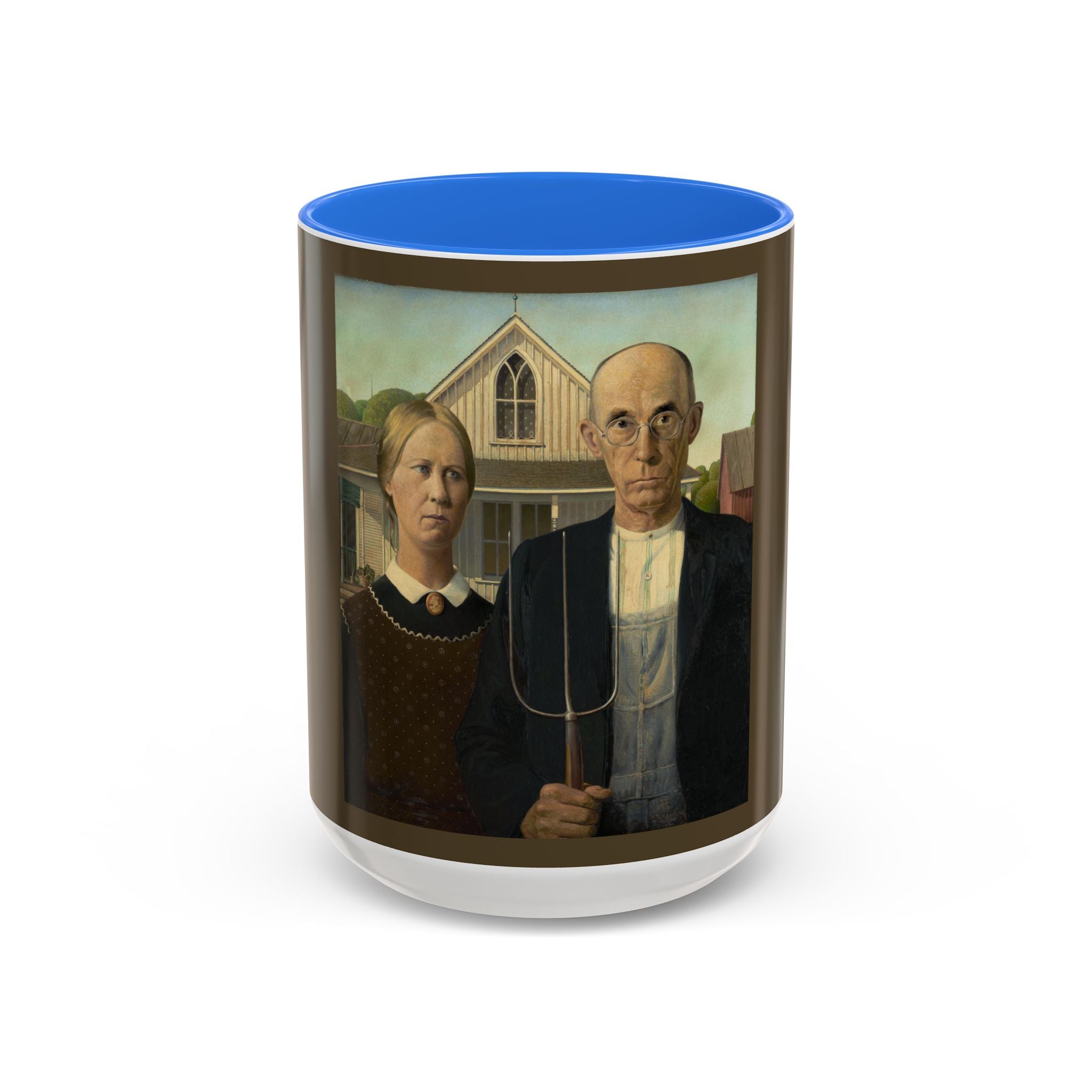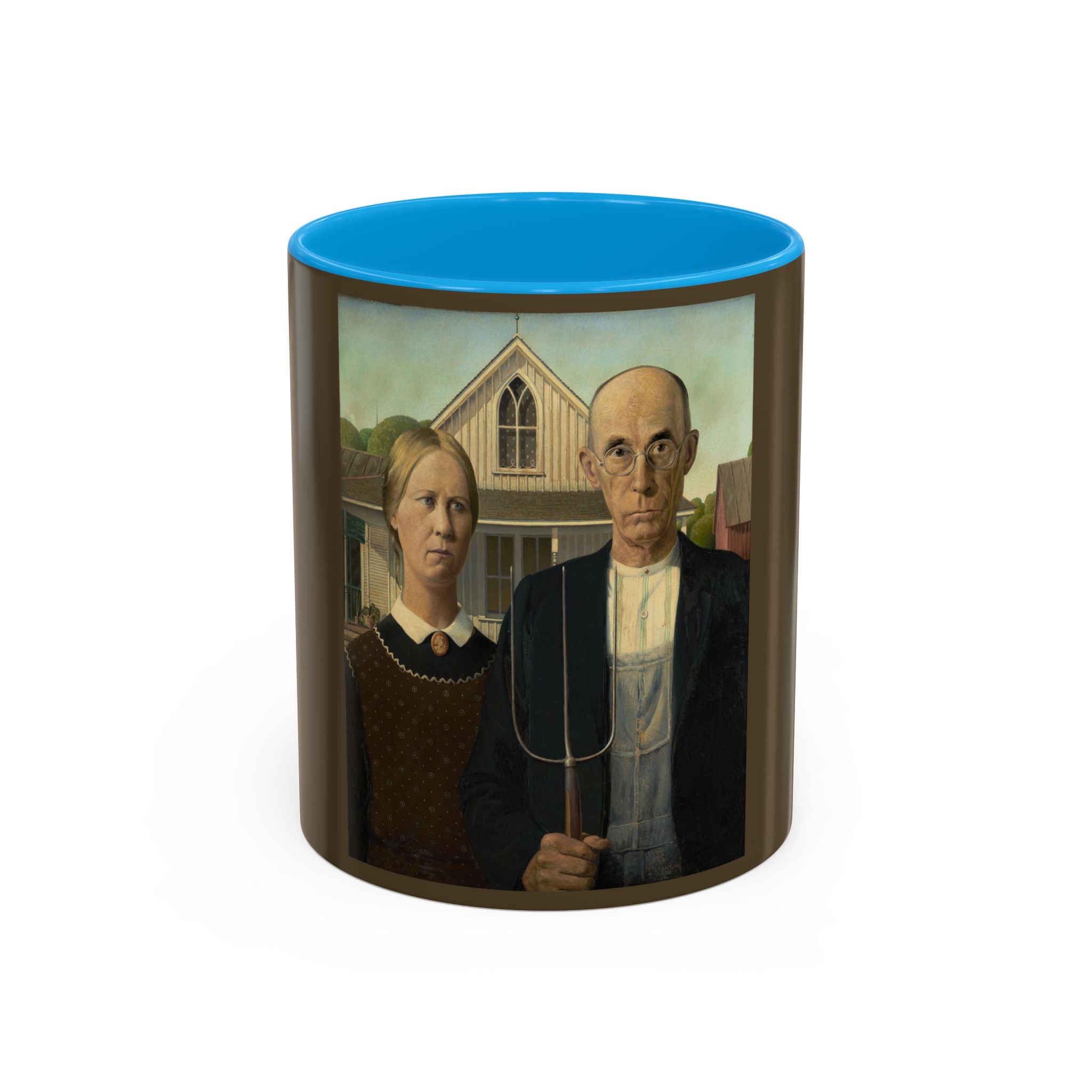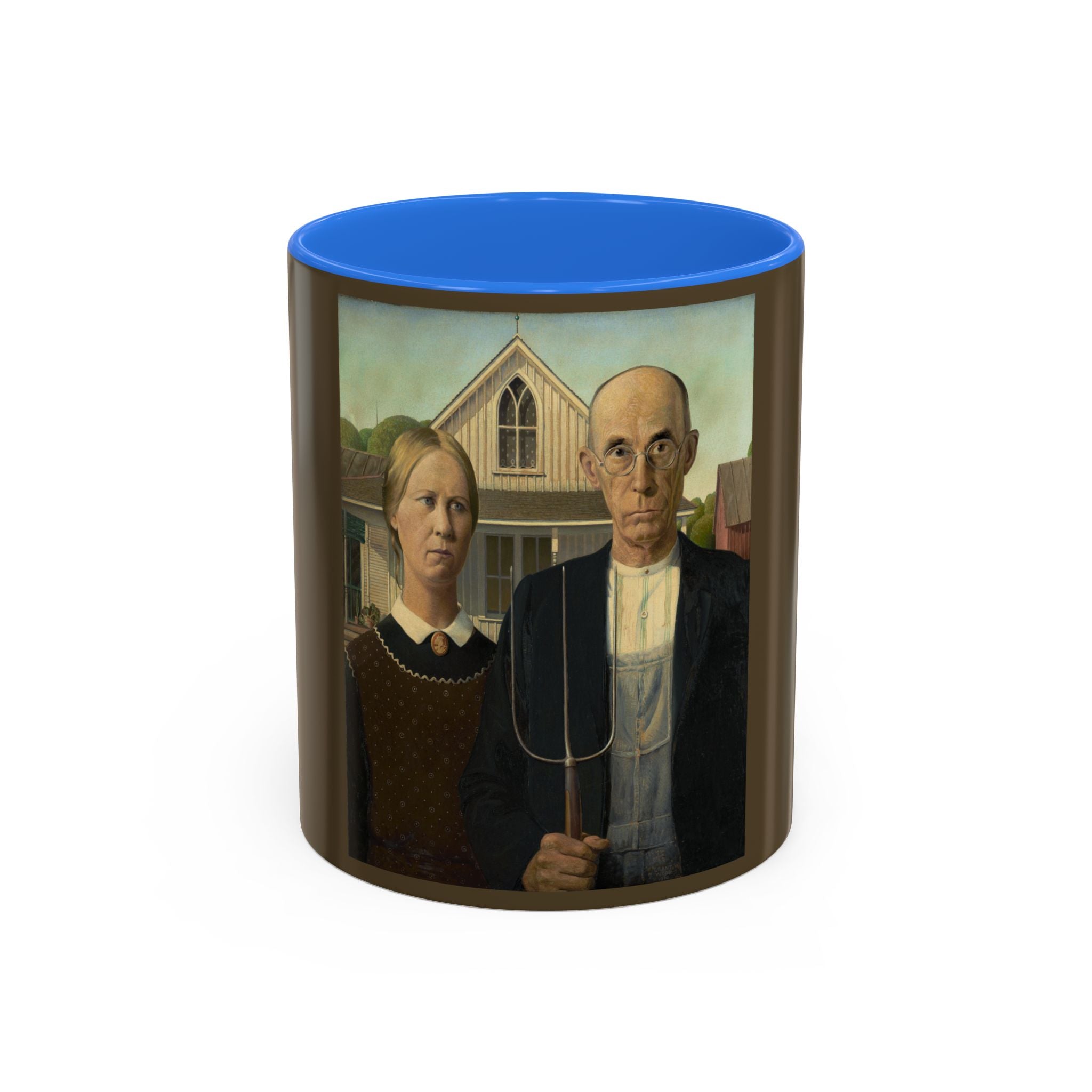 Artwork designed and digitally remastered by Sarasvati Designs. American Gothic is a 1930 painting by Grant Wood in the collection of the Art Institute of Chicago. Wood was inspired to paint what is now known as the American Gothic House in Eldon, Iowa, along with "the kind of people [he] fancied should live in that house". It depicts a farmer standing beside his daughter – often mistakenly assumed to be his wife. The painting's name is a word play on the house's architectural style, Carpenter Gothic. Wood was quoted in this period as stating, "All the good ideas I've ever had came to me while I was milking a cow." Wood intended the painting to depict the farmer and his daughter as survivors, to pay homage to the strength of the rural community, and to provide reassurance in a time of great economic upset. American Gothic is a masterpiece of American art.