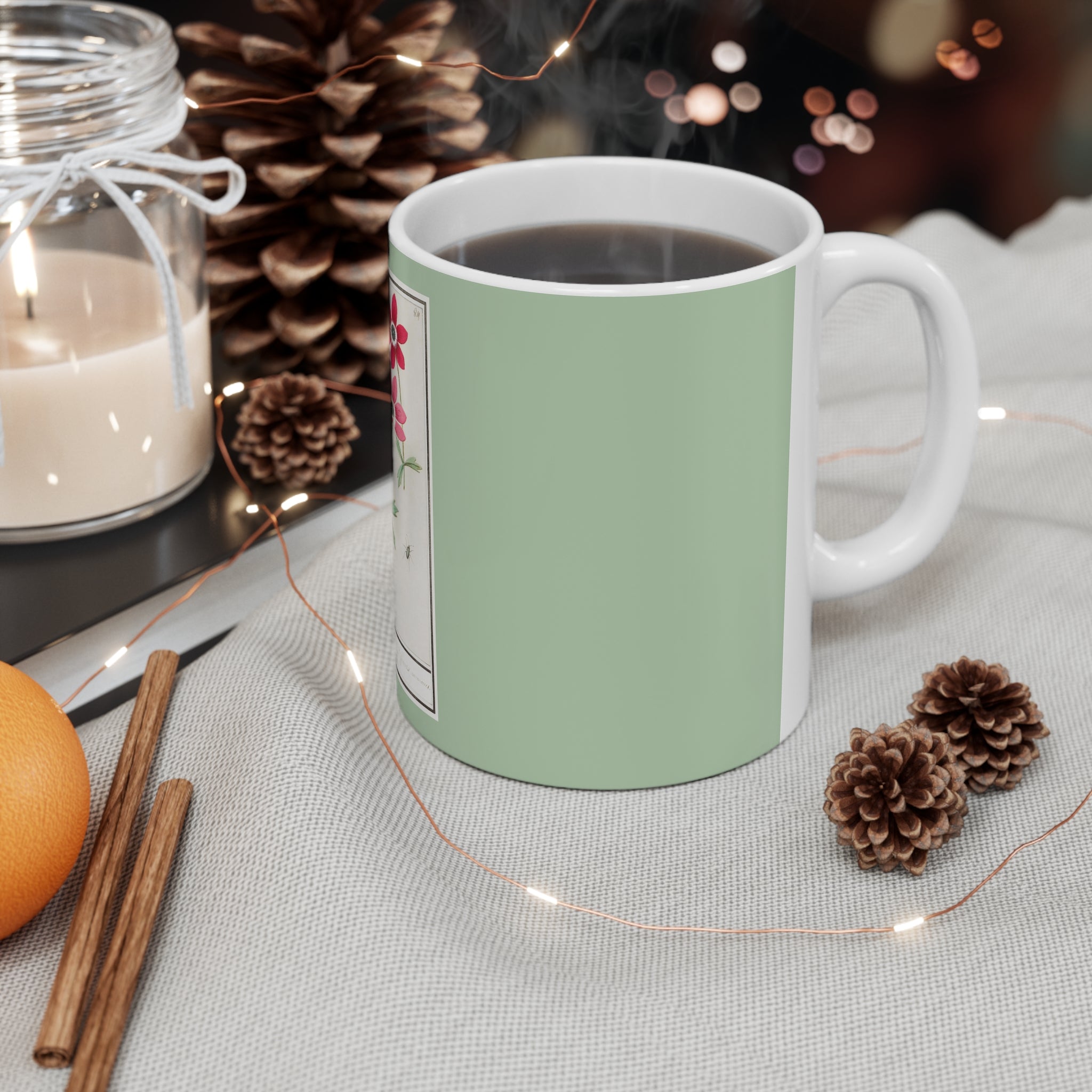 This 11 oz ceramic mug is the perfect gift for coffee, tea, and chocolate lovers. It's made of high-quality white ceramic that is lead and BPA-free, and it's microwave and dishwasher safe for easy cleanup. The mug has rounded corners and a comfortable C-handle for a secure grip.