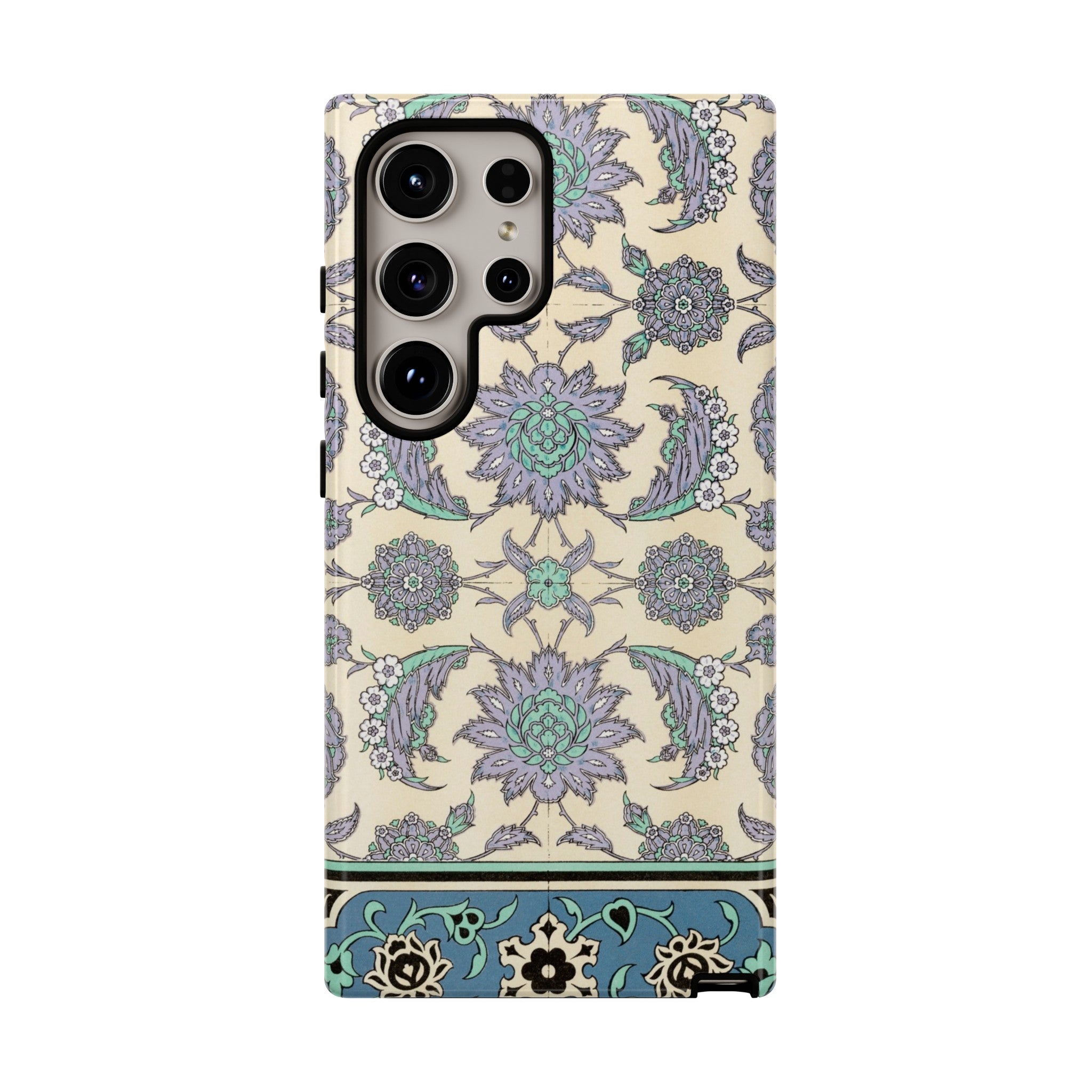 Artwork designed and digitally remastered by Sarasvati Designs. This Arabic art pattern, meticulously documented by Emile Prisses d’Avennes in "La Decoration Arabe," showcases the exquisite complexity and geometric precision characteristic of Arabic decorative arts. The pattern features an intricate arrangement of interlocking motifs that include geometric shapes, stylized floral forms, and calligraphic elements. The use of repetitive, symmetrical designs not only achieves a mesmerizing visual effect but also reflects the cultural and spiritual significance of infinity and continuity in Islamic art. The careful balance between the detailed elements and the overall composition exemplifies the artistic mastery and deep understanding of mathematics and aesthetics that are foundational to Arabic ornamentation. This piece serves as a vibrant testament to the rich artistic traditions that have been preserved and celebrated in Arabic culture.