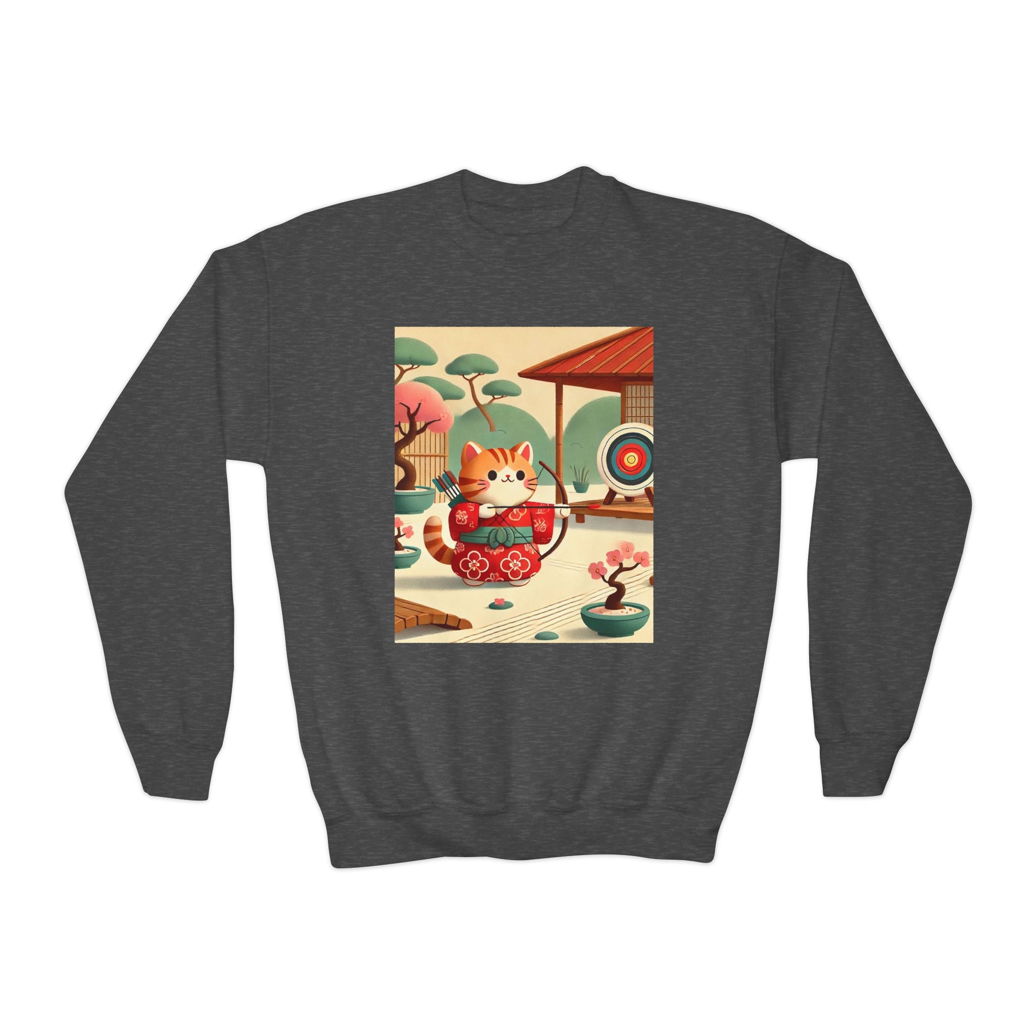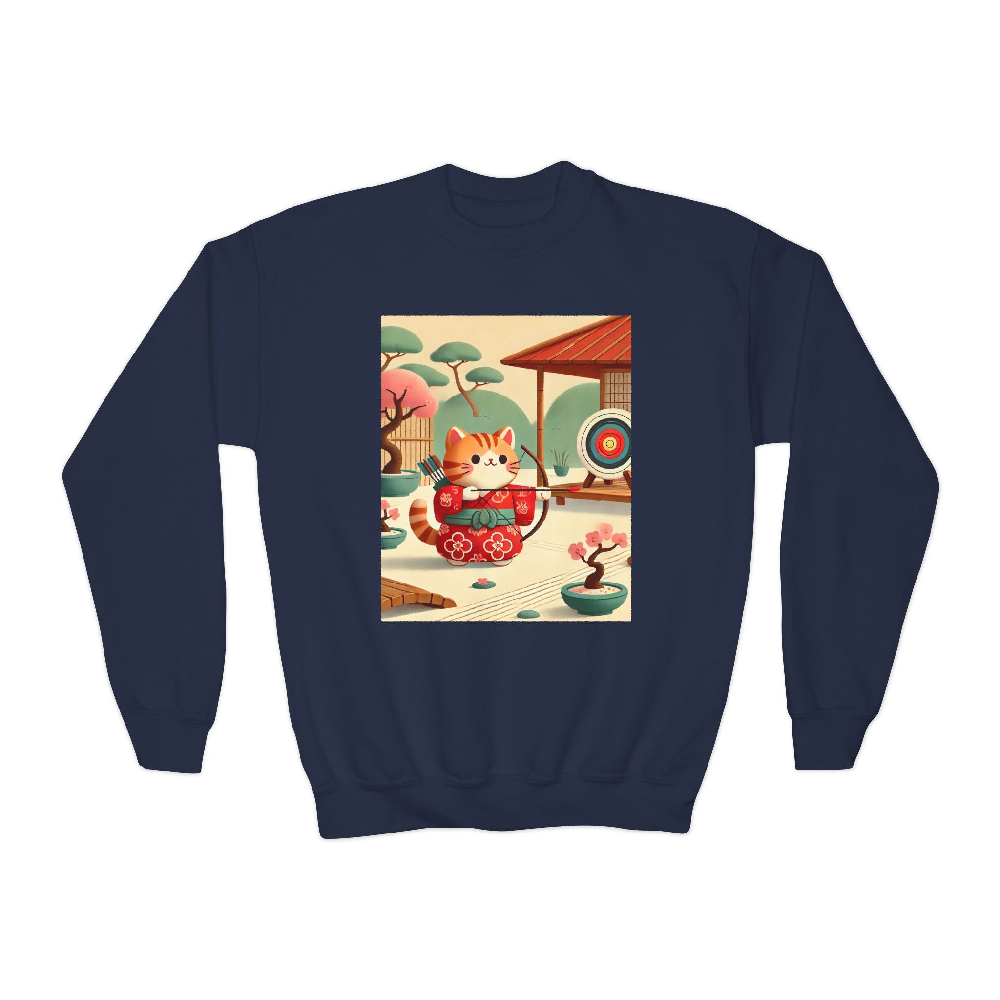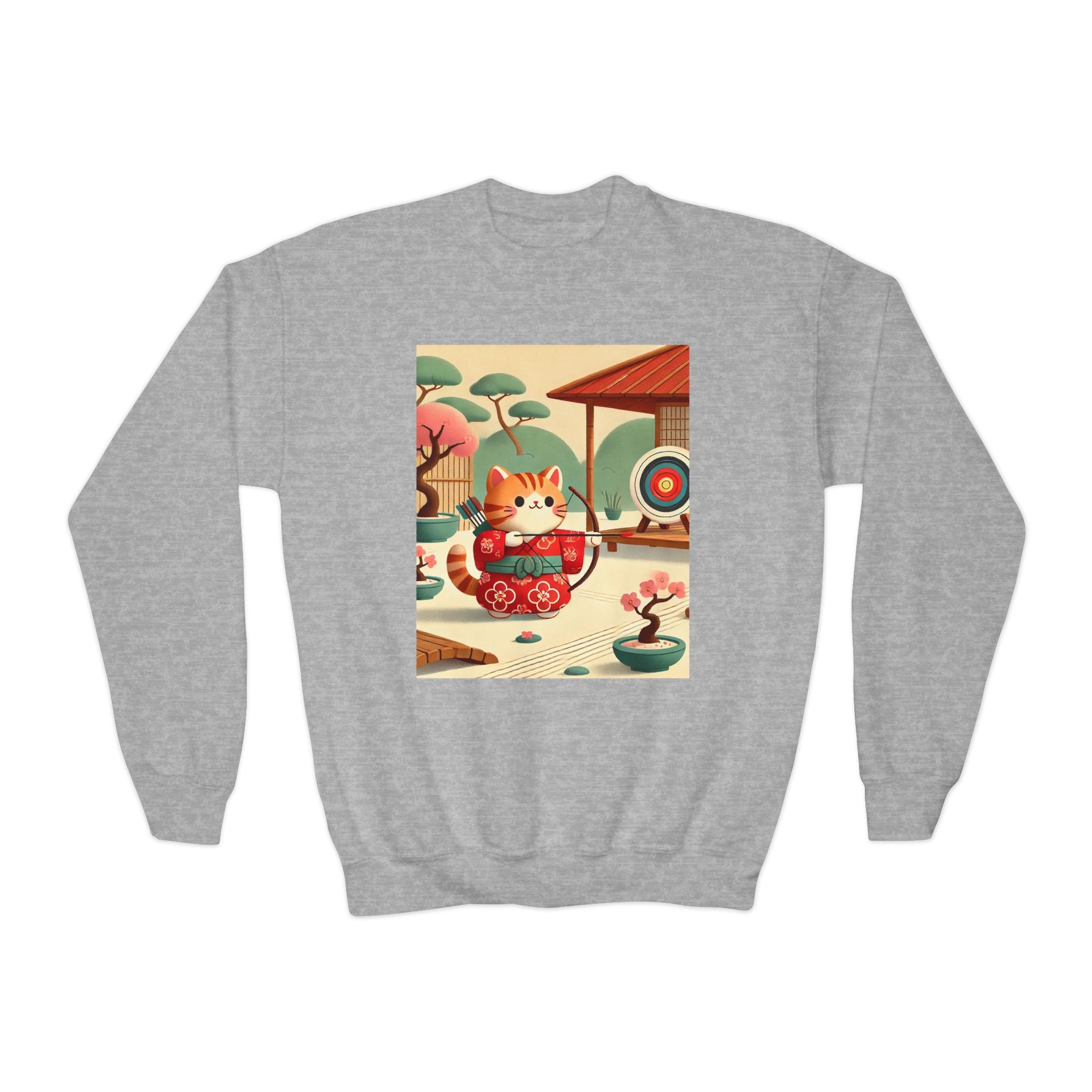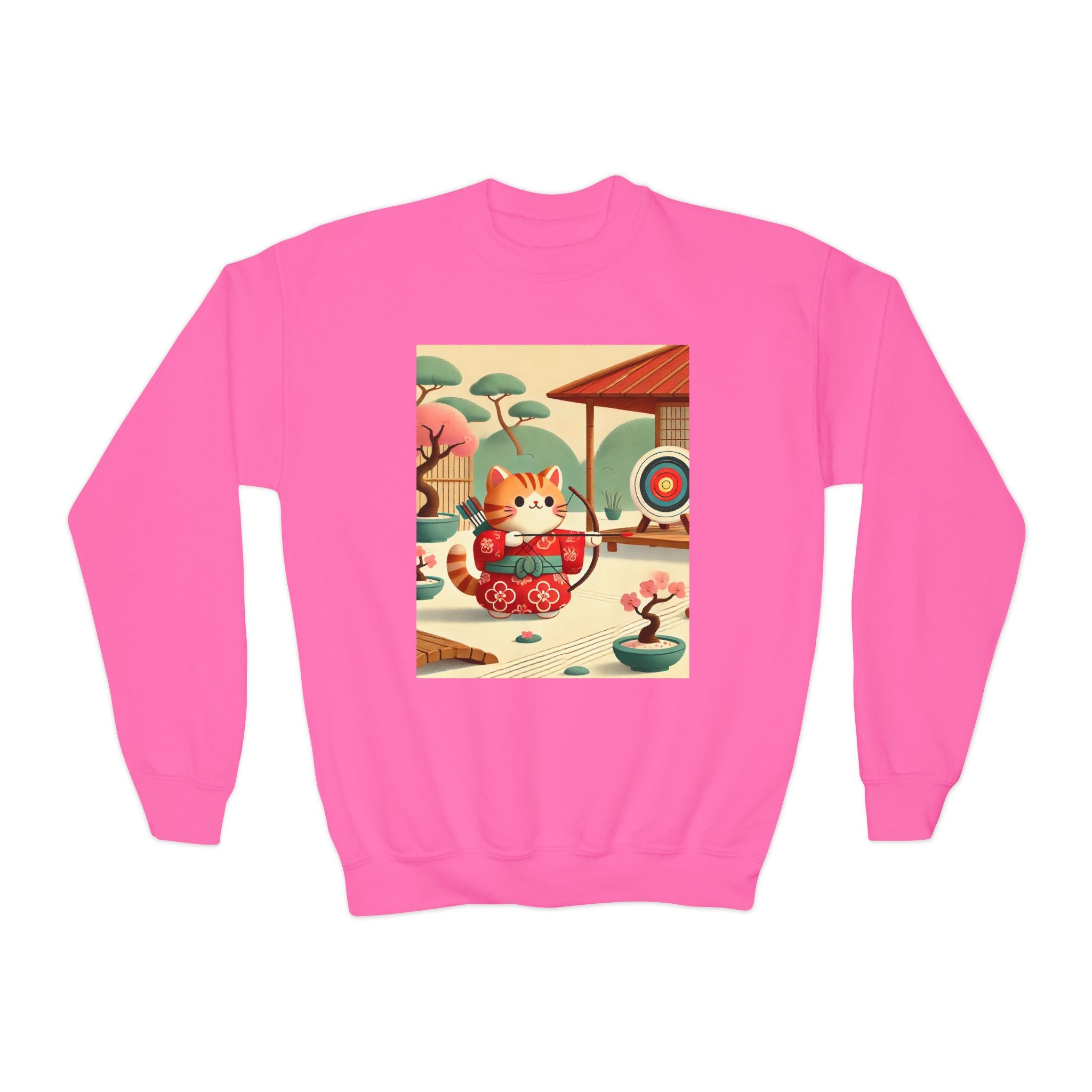 This charming design features a chubby orange tabby kitten dressed in a red kimono adorned with plum blossom patterns, carefully practicing archery in a serene Zen garden. The peaceful setting—complete with raked sand, stone lanterns, and bonsai trees—creates a perfect balance between playfulness and tranquility. The whimsical yet graceful illustration captures both focus and fun, making this sweatshirt a stylish and imaginative favorite for any young explorer.