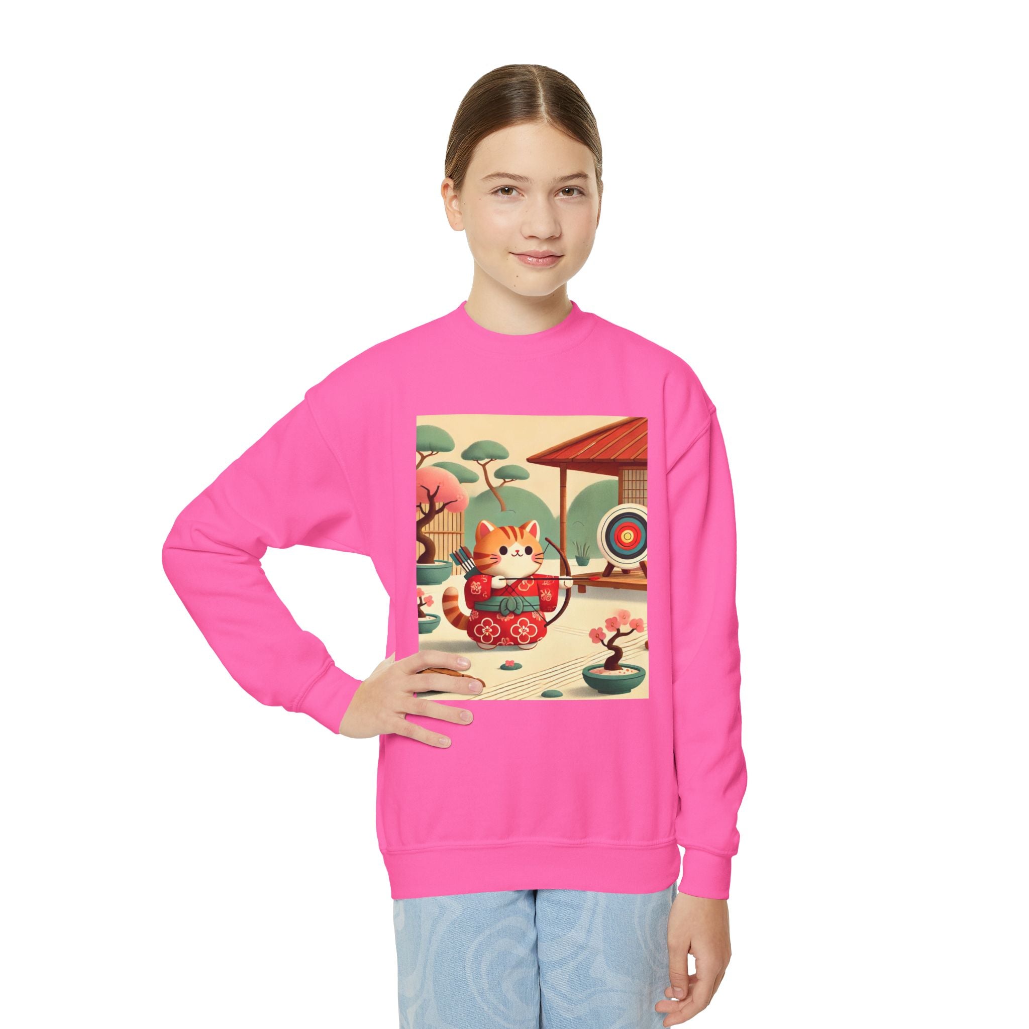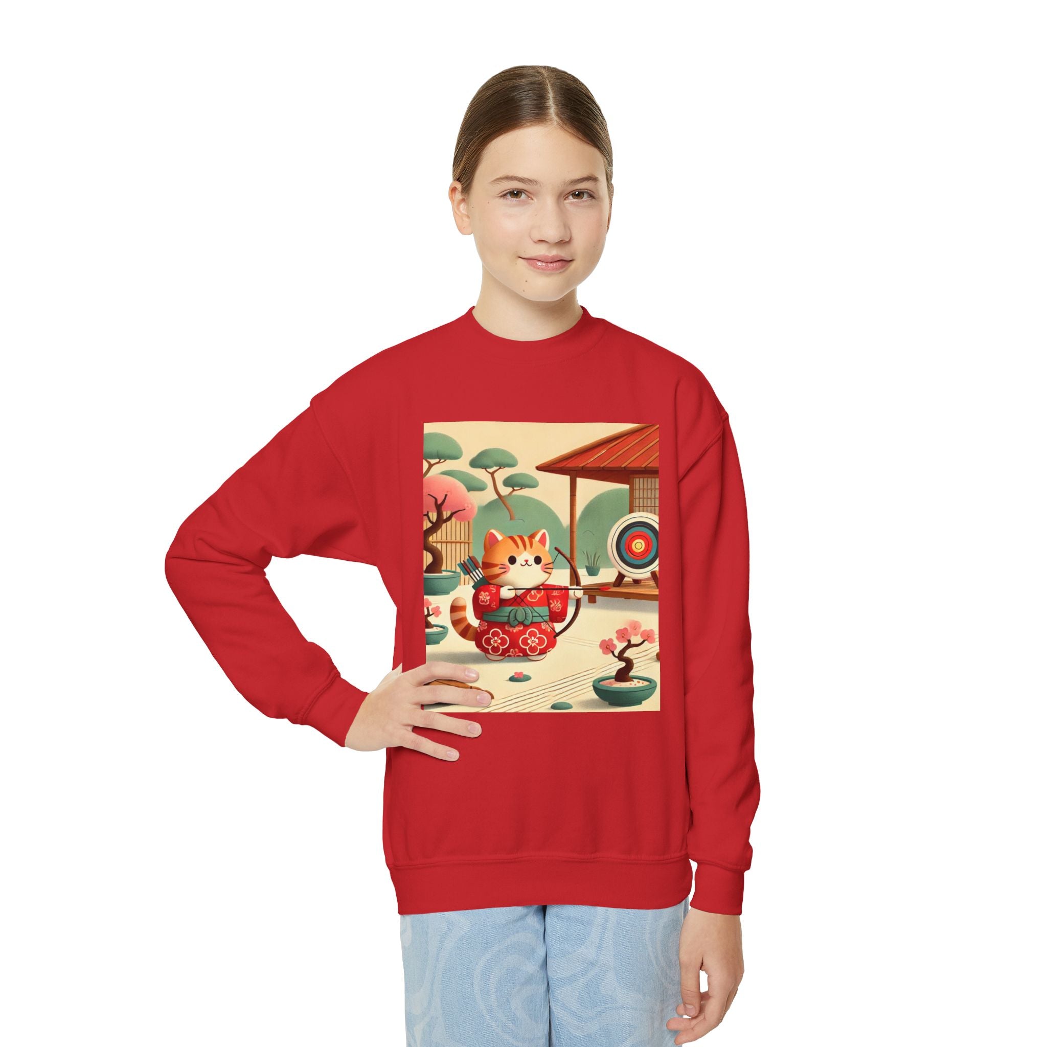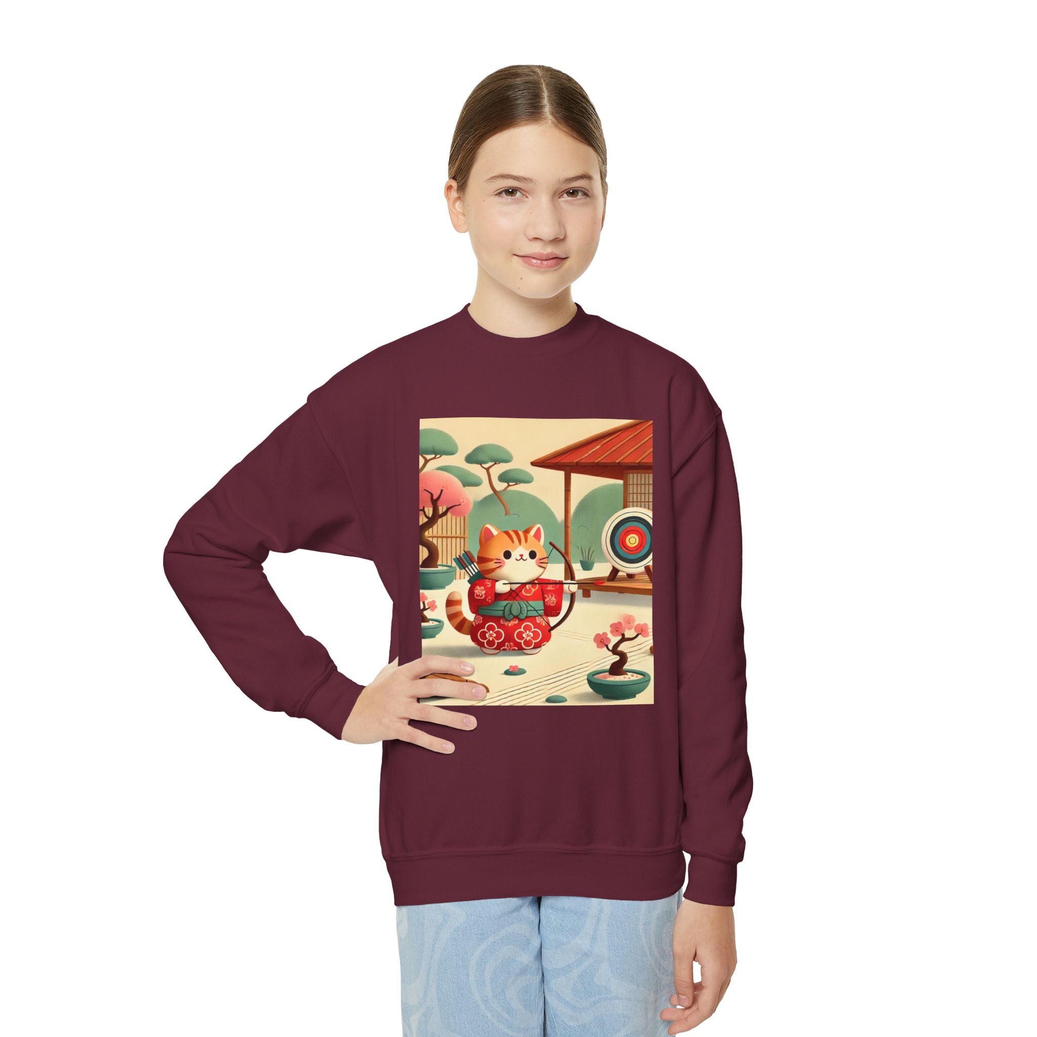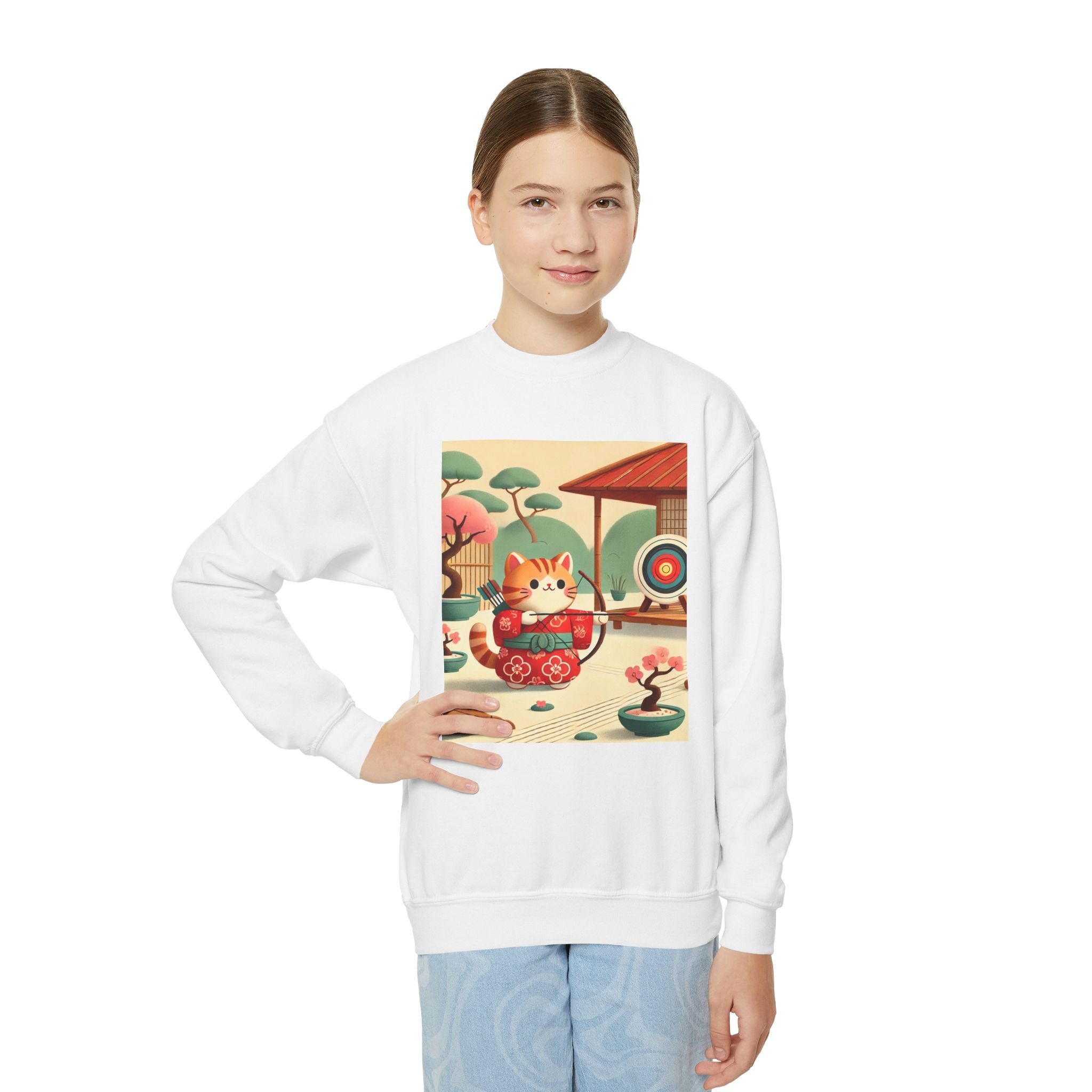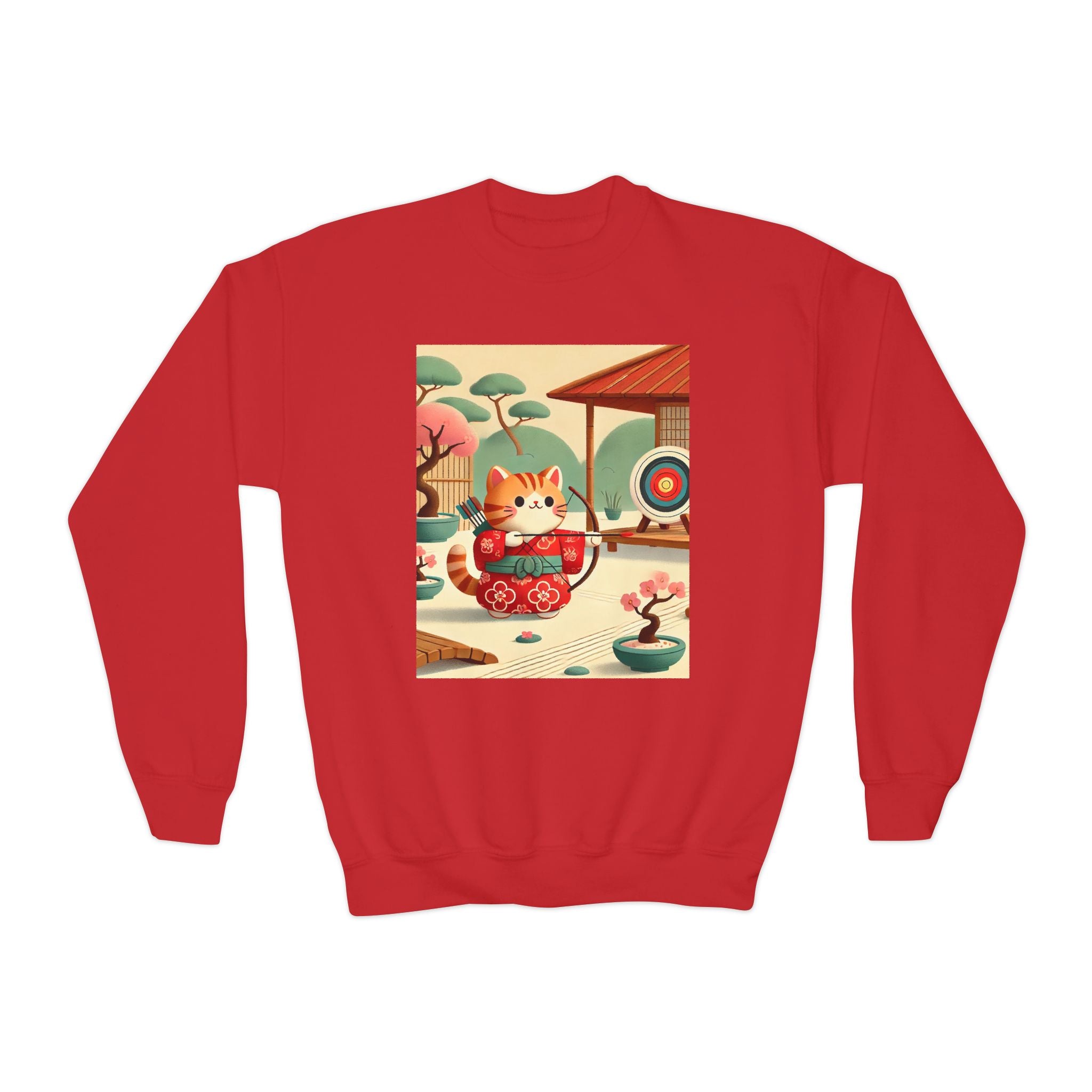 This charming design features a chubby orange tabby kitten dressed in a red kimono adorned with plum blossom patterns, carefully practicing archery in a serene Zen garden. The peaceful setting—complete with raked sand, stone lanterns, and bonsai trees—creates a perfect balance between playfulness and tranquility. The whimsical yet graceful illustration captures both focus and fun, making this sweatshirt a stylish and imaginative favorite for any young explorer.