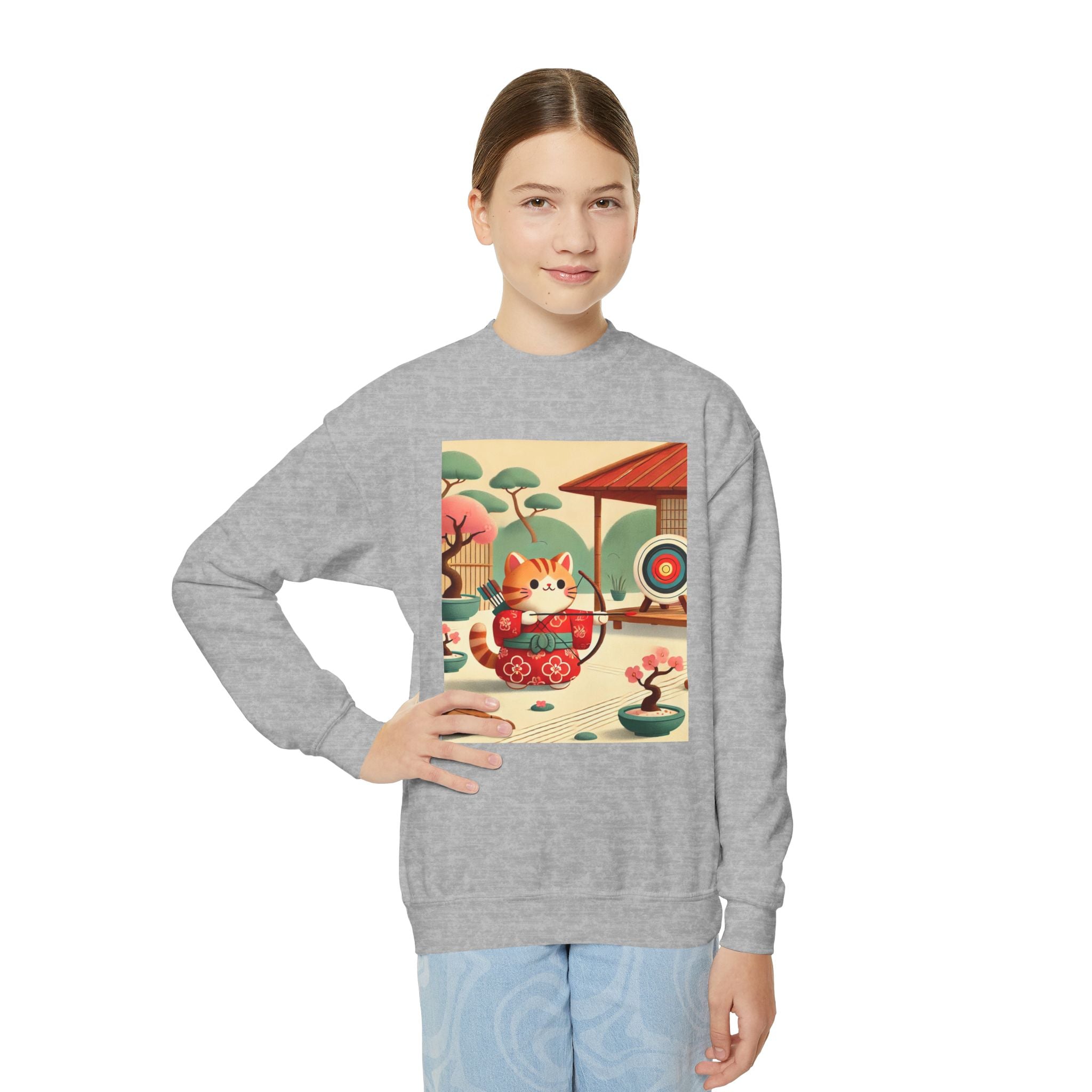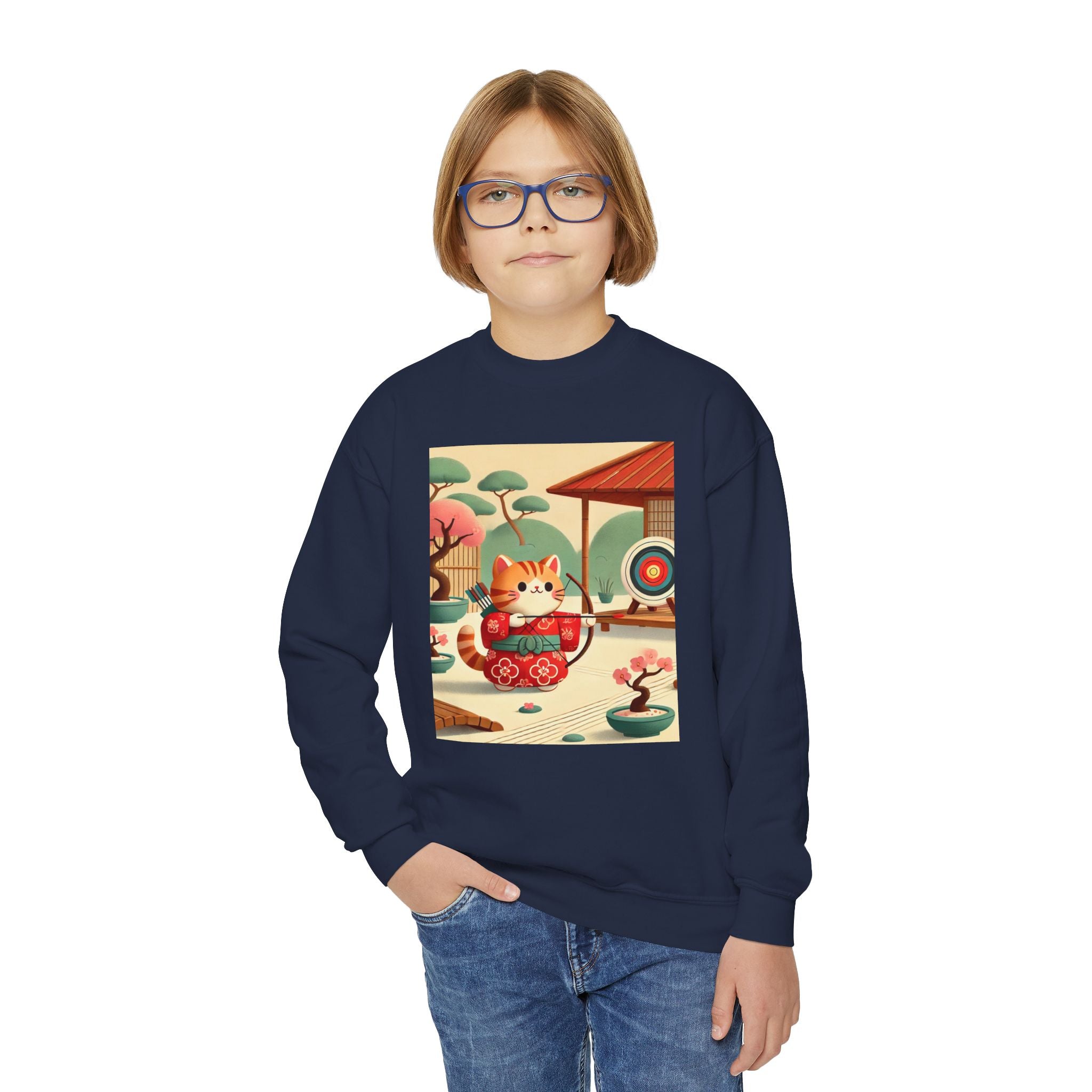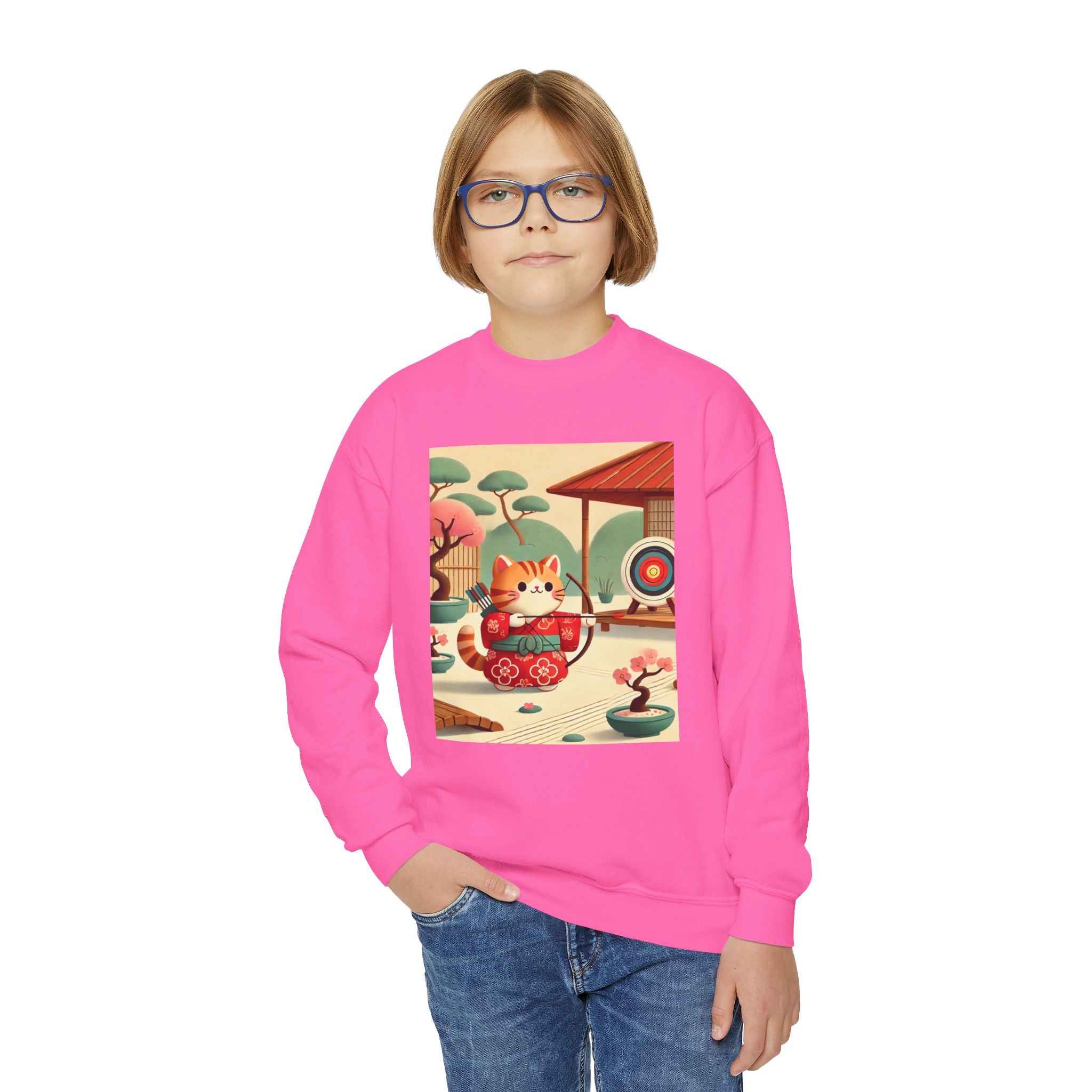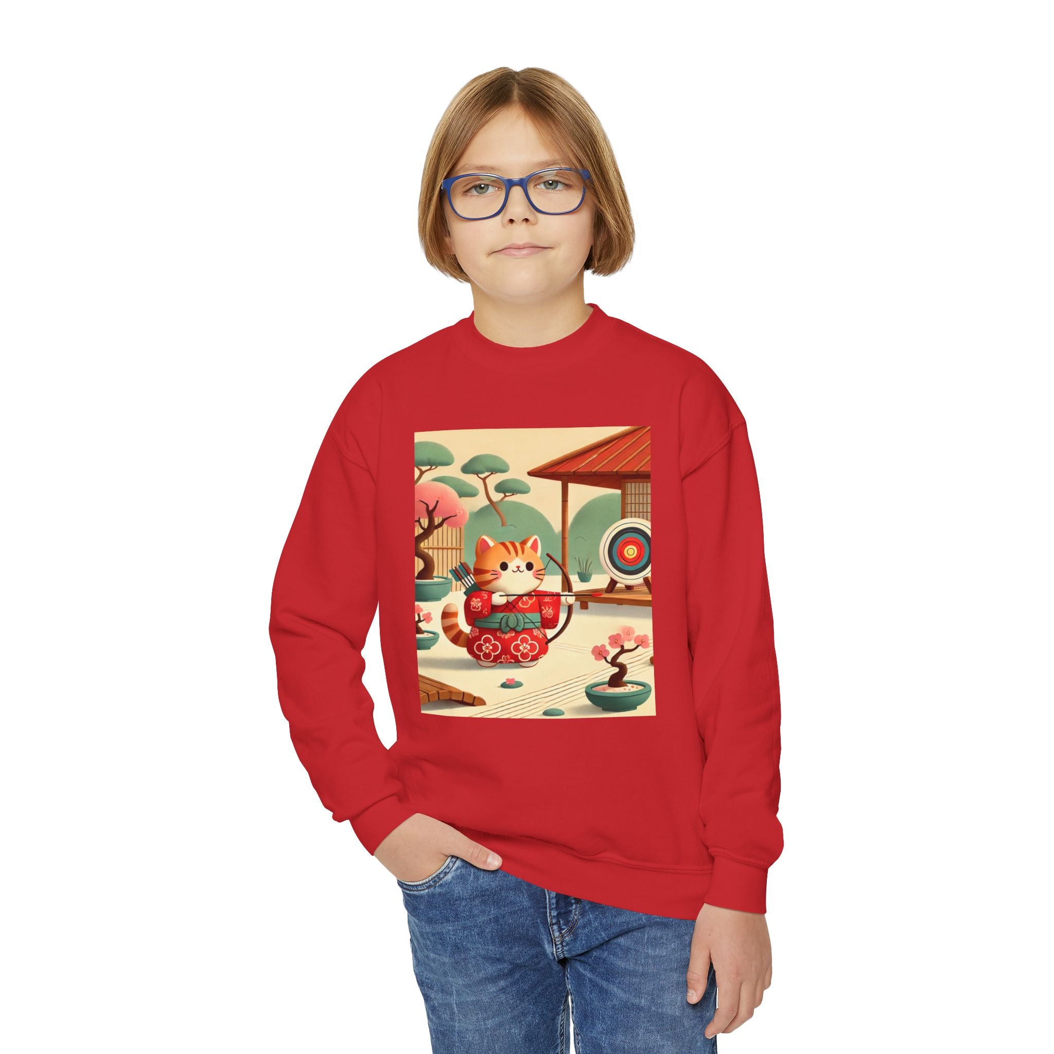 This charming design features a chubby orange tabby kitten dressed in a red kimono adorned with plum blossom patterns, carefully practicing archery in a serene Zen garden. The peaceful setting—complete with raked sand, stone lanterns, and bonsai trees—creates a perfect balance between playfulness and tranquility. The whimsical yet graceful illustration captures both focus and fun, making this sweatshirt a stylish and imaginative favorite for any young explorer.