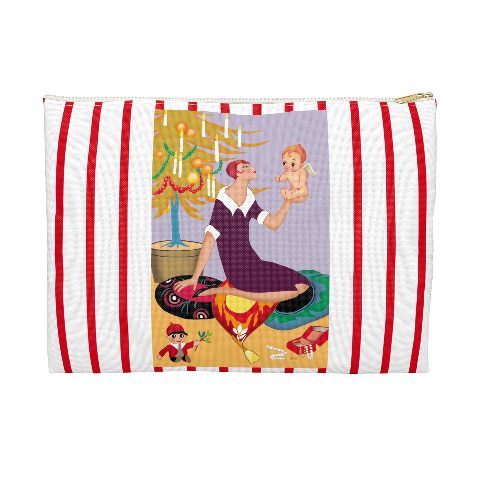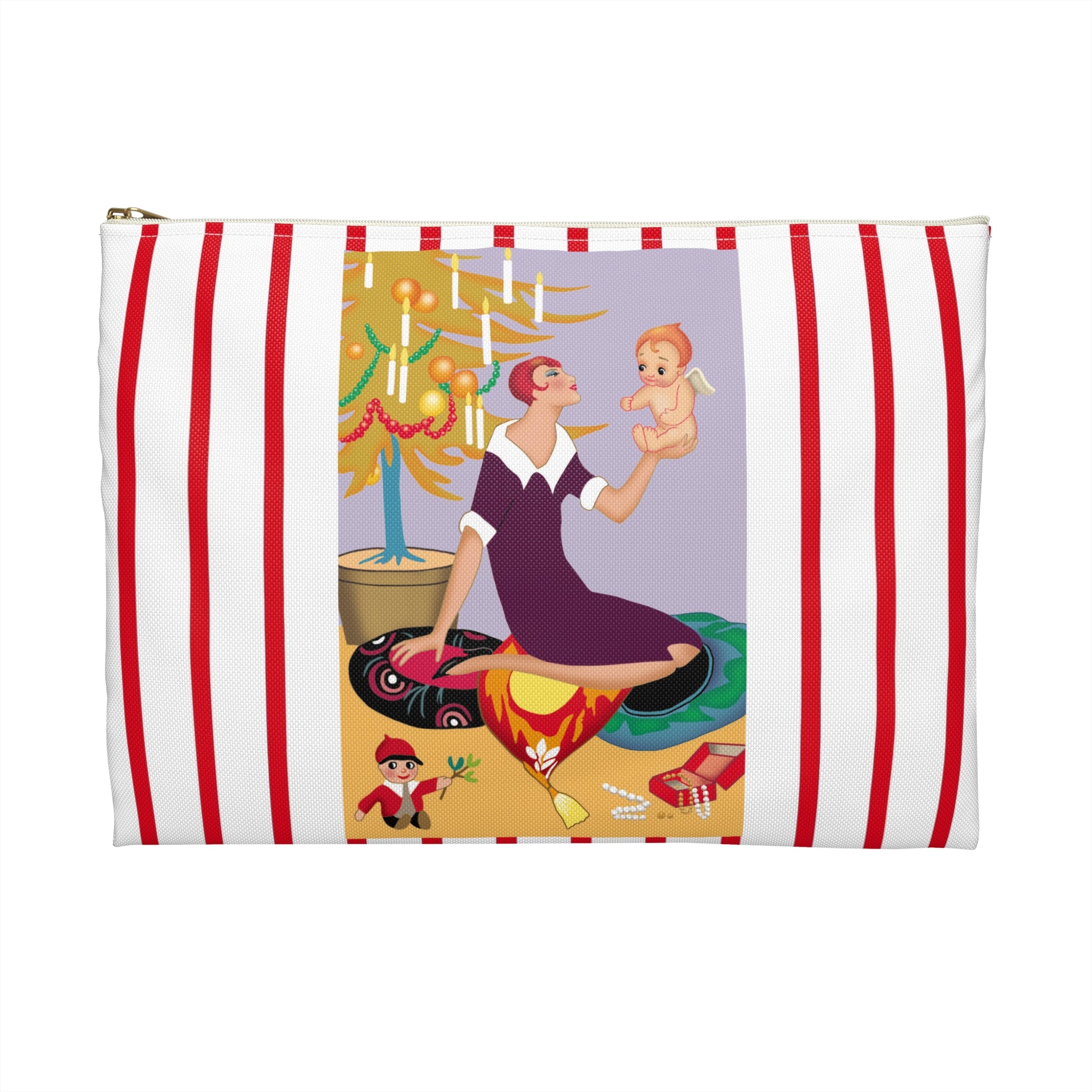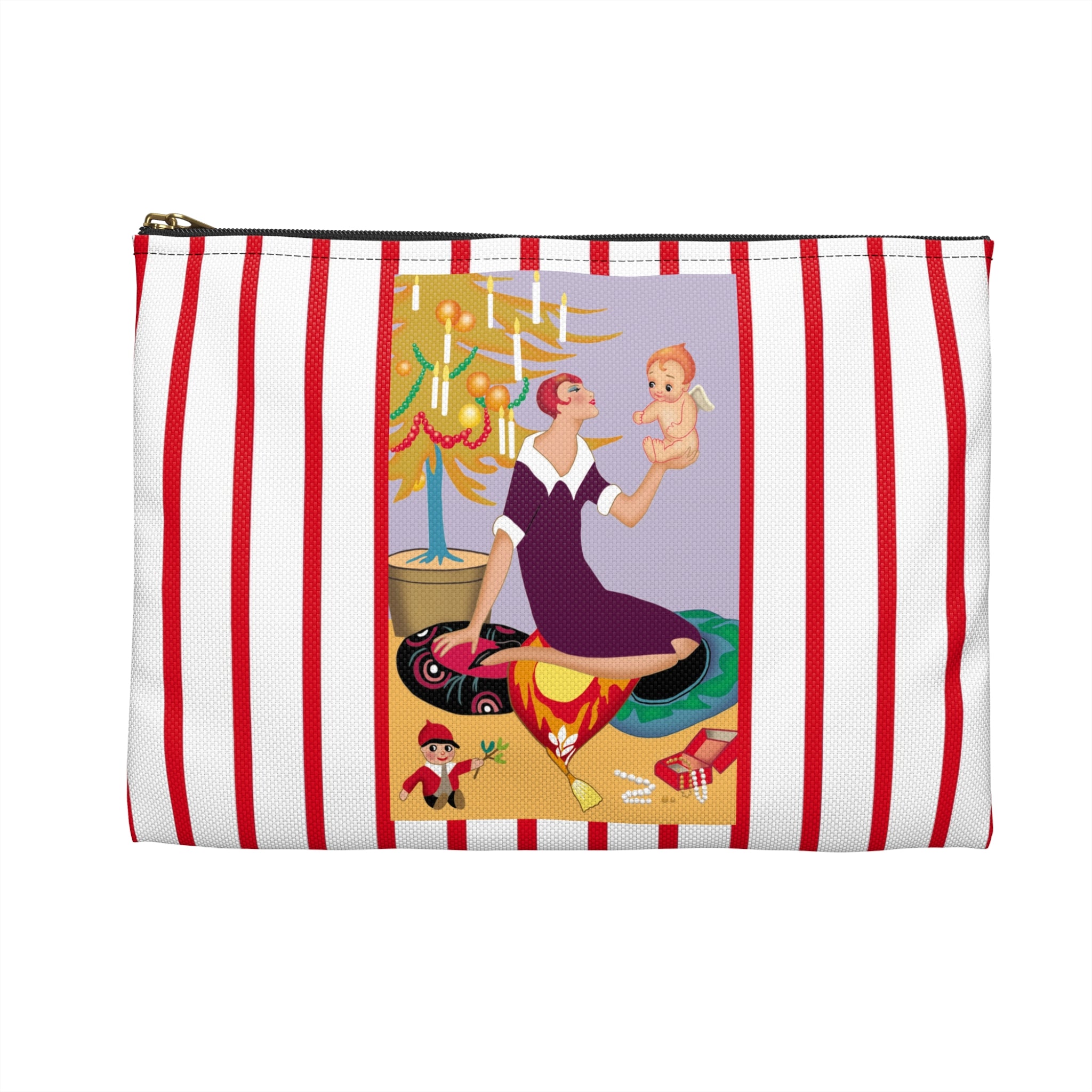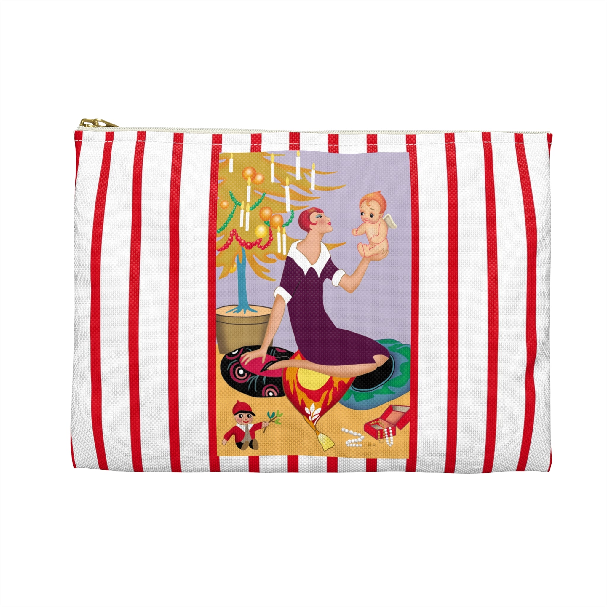 What makes this pouch truly special is the artwork it carries. A graceful woman in a deep plum dress sits elegantly on colorful cushions beside a radiant Christmas tree adorned with glowing candles, golden baubles, and festive garlands. She gently lifts a tiny angel into the air, her joy captured in the warm glow of the scene. At her feet, playful touches—an elf doll, strands of beads, and wrapped gifts—add a festive note. With bold colors, clean lines, and whimsical detail, this Art Deco–inspired design celebrates tradition, joy, and the timeless magic of Christmas, turning a simple pouch into a keepsake.