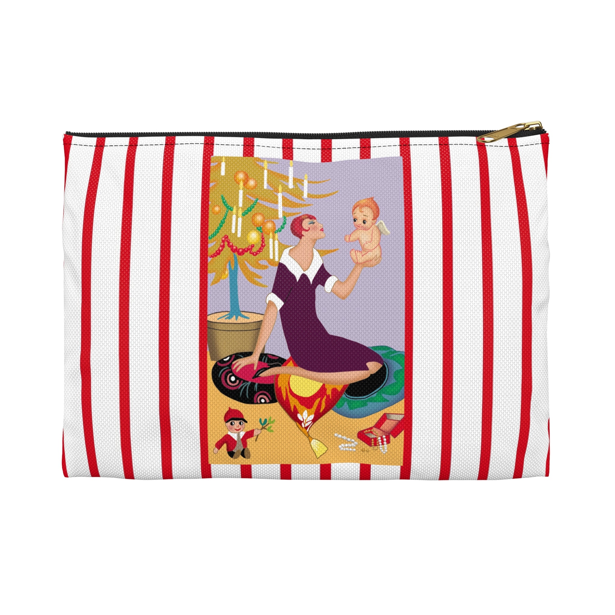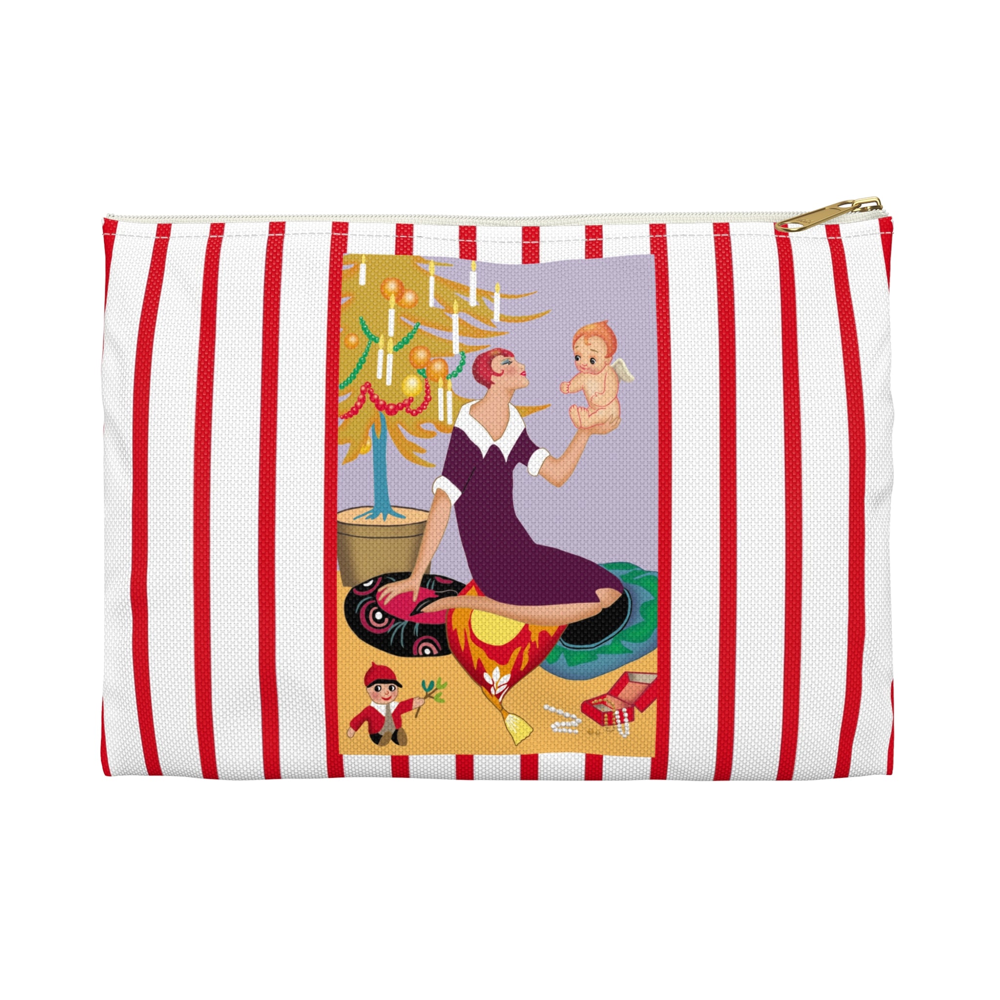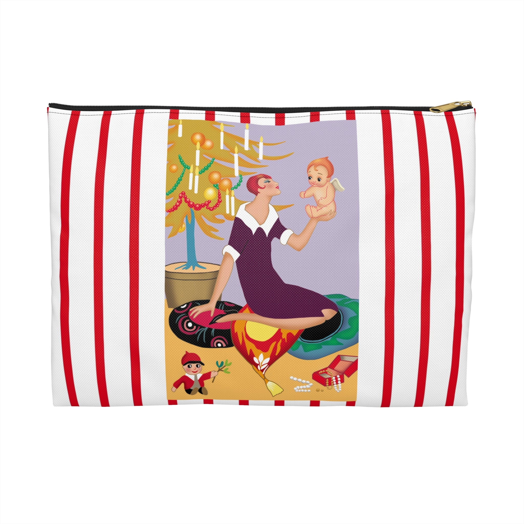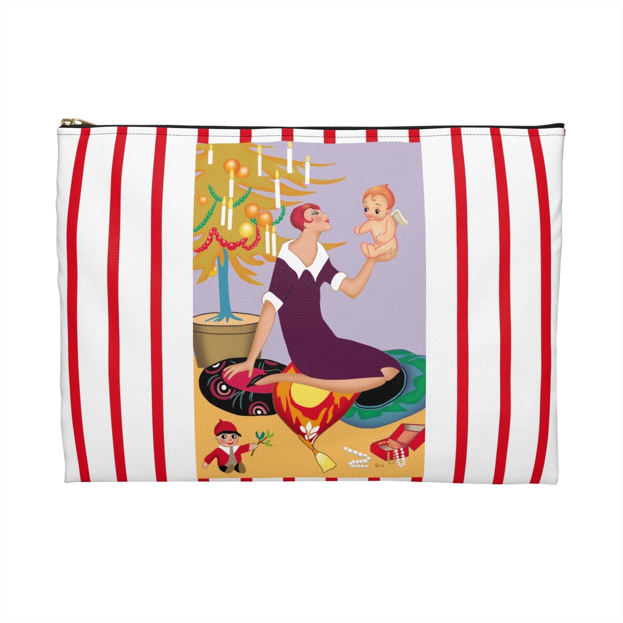 What makes this pouch truly special is the artwork it carries. A graceful woman in a deep plum dress sits elegantly on colorful cushions beside a radiant Christmas tree adorned with glowing candles, golden baubles, and festive garlands. She gently lifts a tiny angel into the air, her joy captured in the warm glow of the scene. At her feet, playful touches—an elf doll, strands of beads, and wrapped gifts—add a festive note. With bold colors, clean lines, and whimsical detail, this Art Deco–inspired design celebrates tradition, joy, and the timeless magic of Christmas, turning a simple pouch into a keepsake.