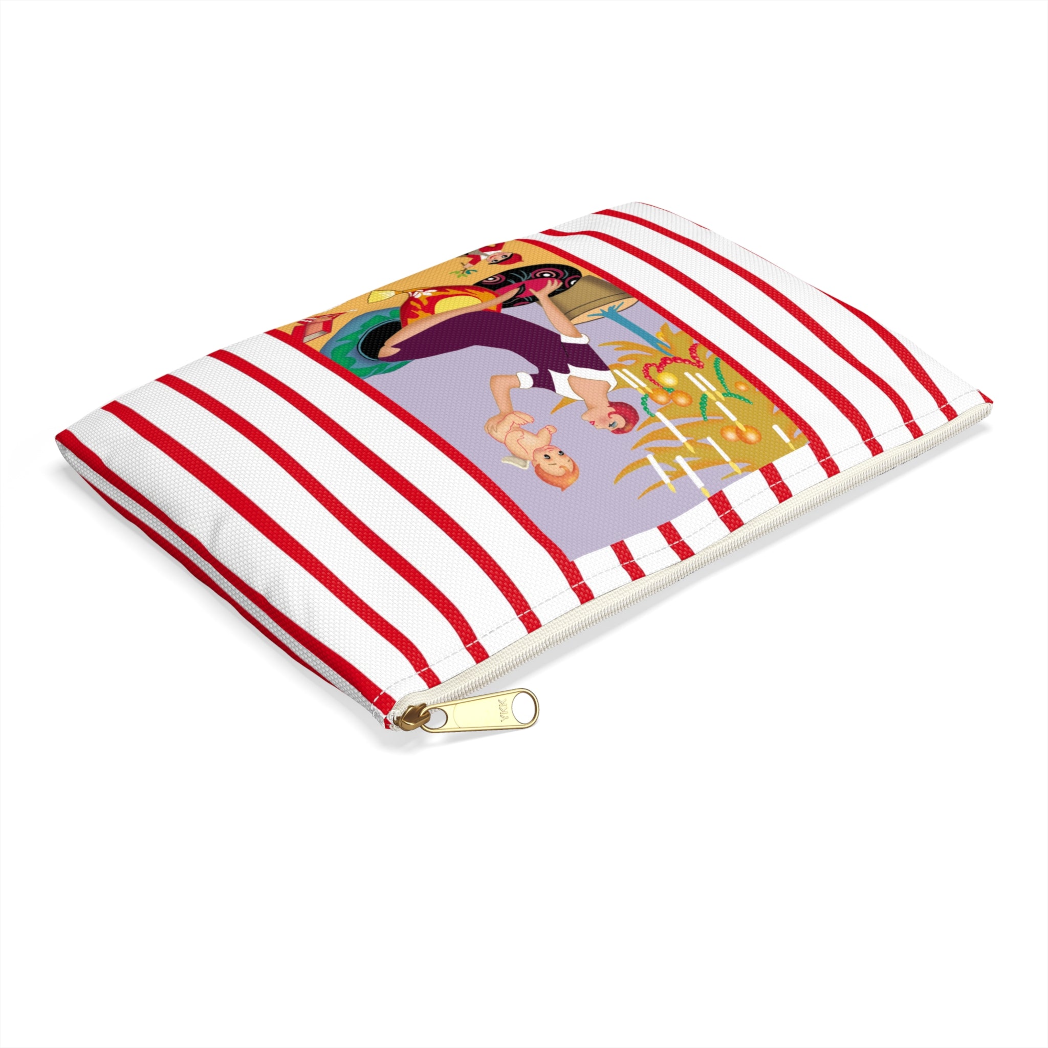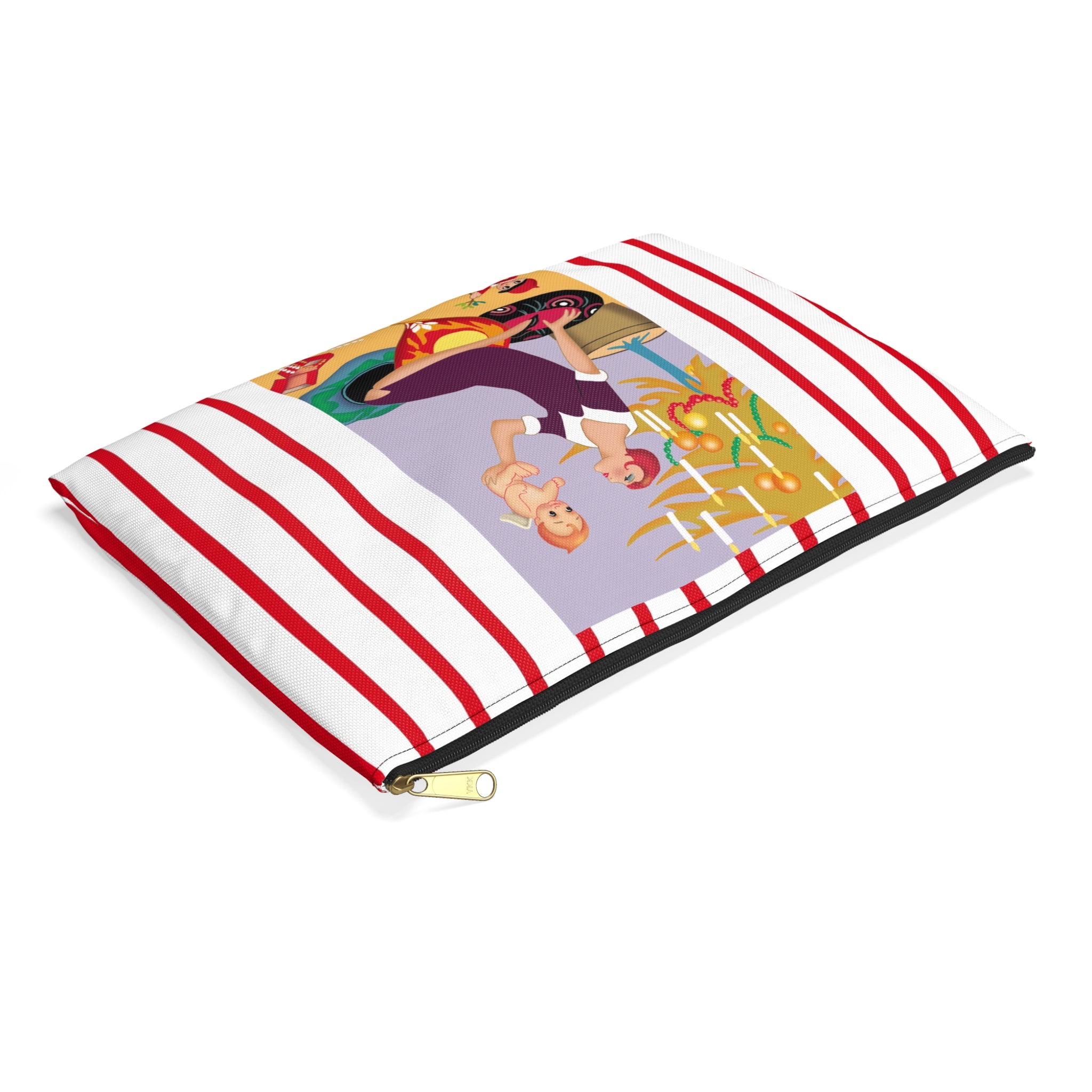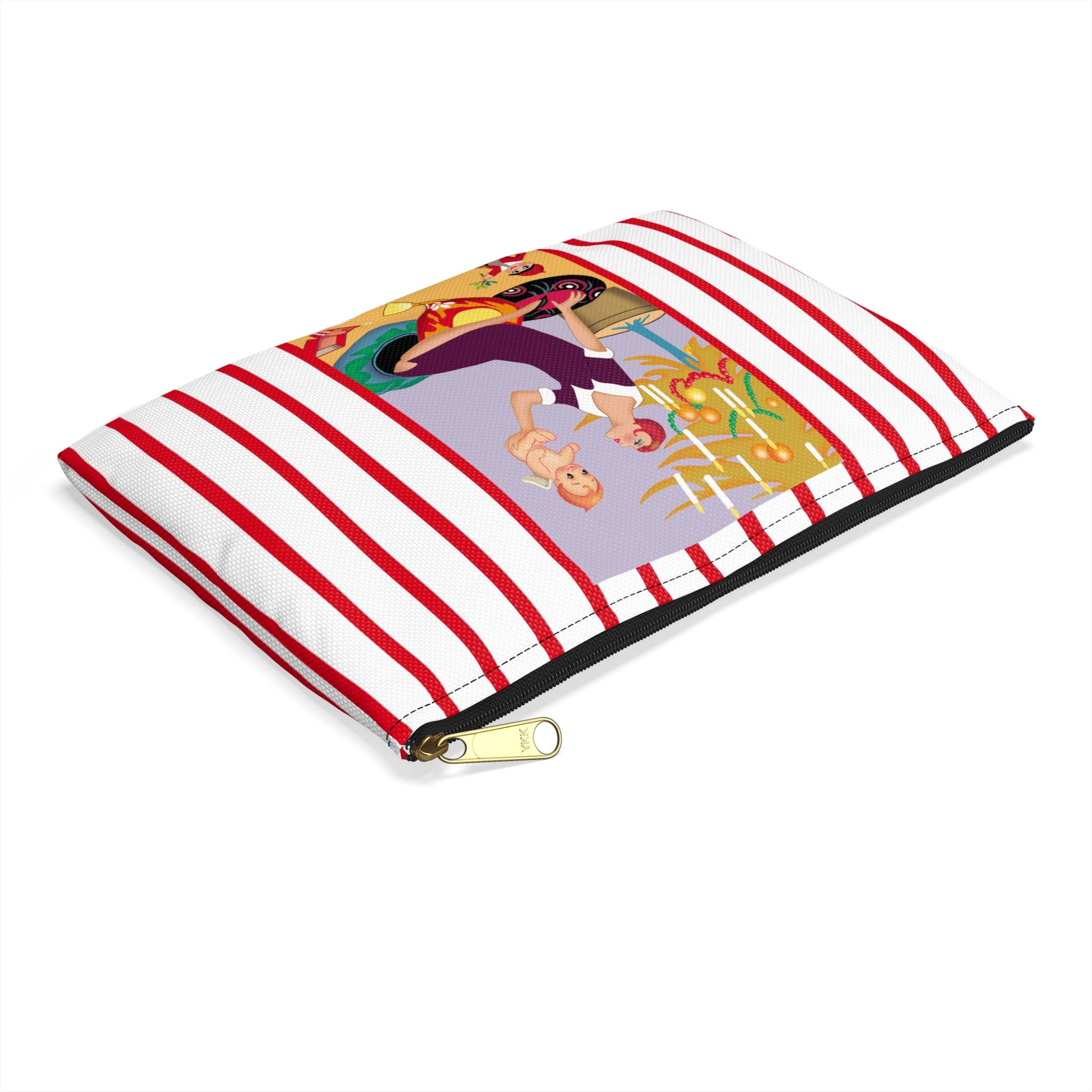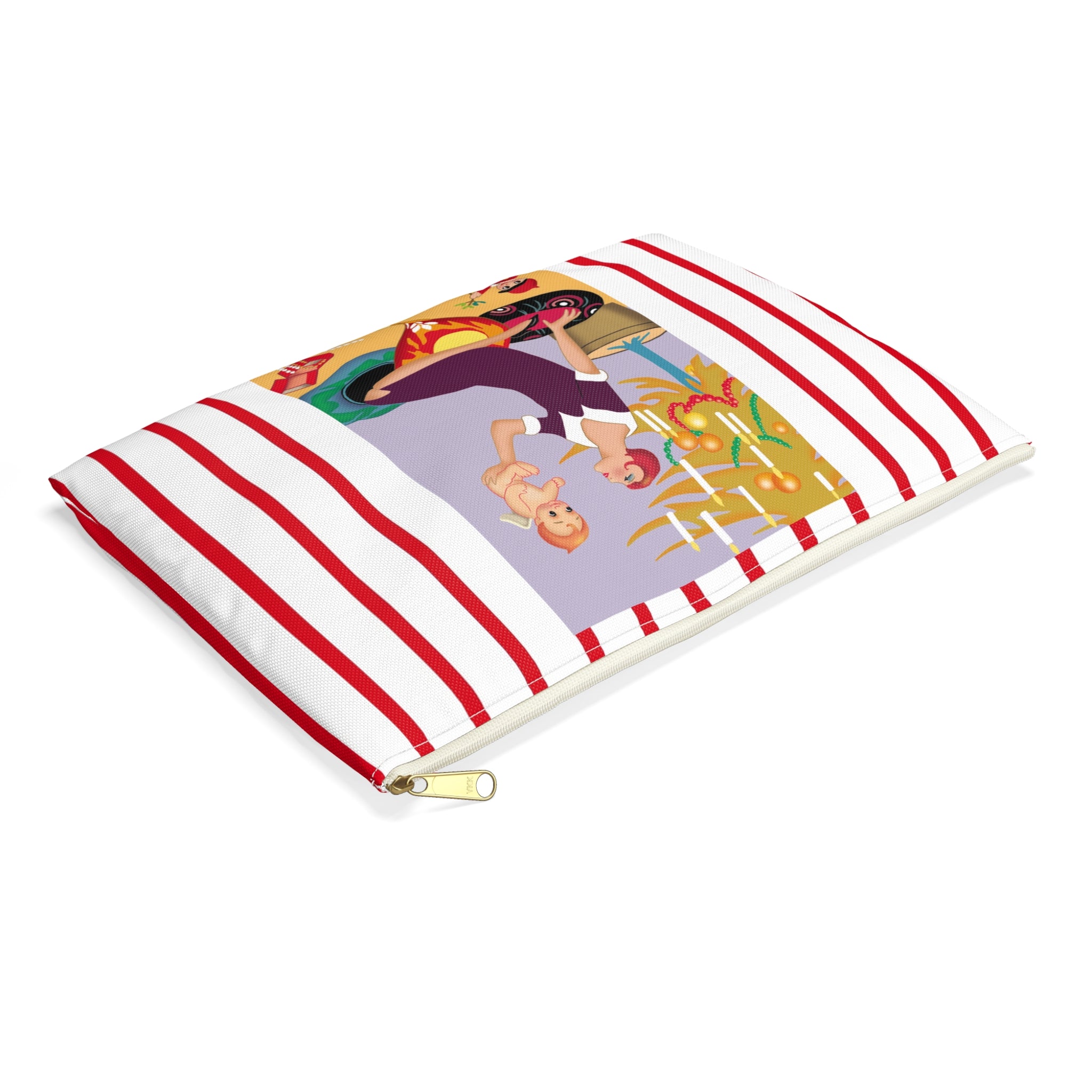 What makes this pouch truly special is the artwork it carries. A graceful woman in a deep plum dress sits elegantly on colorful cushions beside a radiant Christmas tree adorned with glowing candles, golden baubles, and festive garlands. She gently lifts a tiny angel into the air, her joy captured in the warm glow of the scene. At her feet, playful touches—an elf doll, strands of beads, and wrapped gifts—add a festive note. With bold colors, clean lines, and whimsical detail, this Art Deco–inspired design celebrates tradition, joy, and the timeless magic of Christmas, turning a simple pouch into a keepsake.
