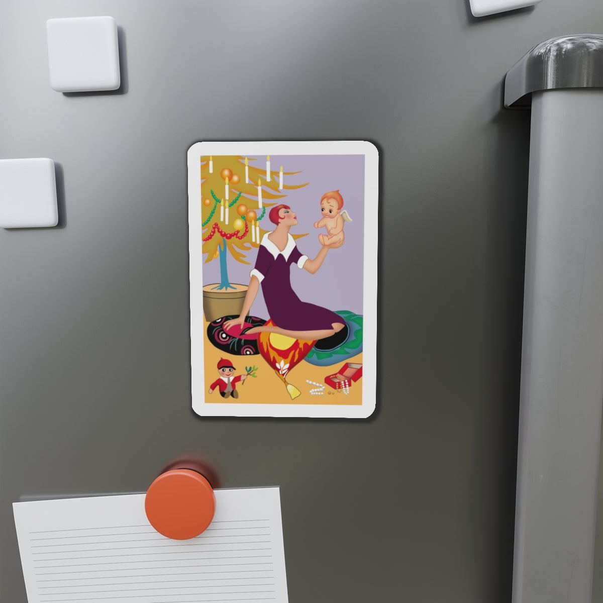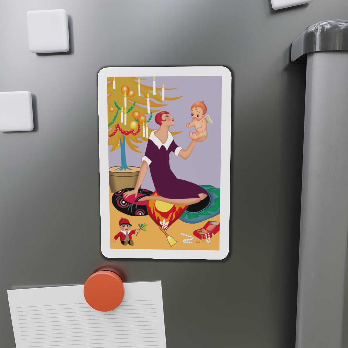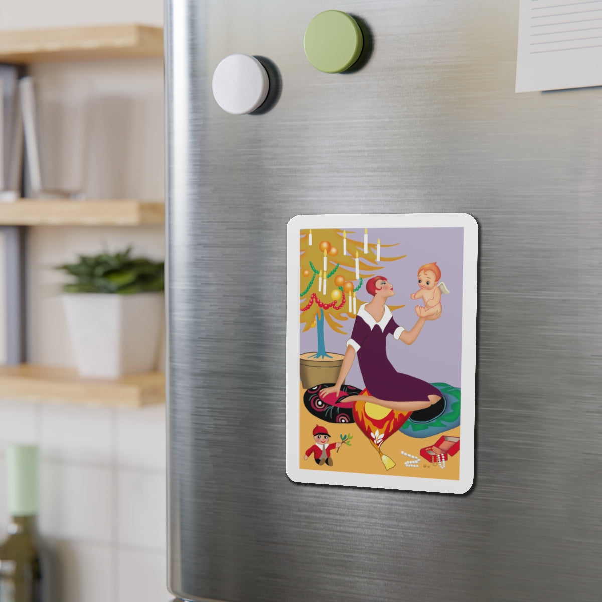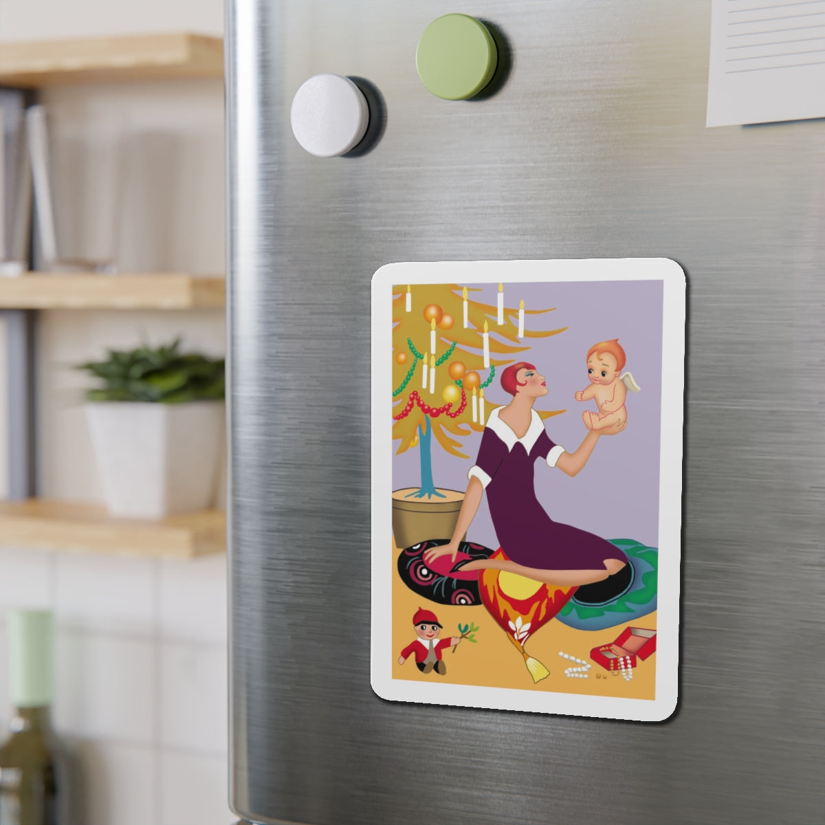 What makes these magnets special is the enchanting artwork they showcase. A graceful woman in a deep plum dress sits elegantly on colorful cushions beside a sparkling Christmas tree glowing with candles, golden baubles, and festive garlands. She tenderly lifts a tiny angel into the air, her expression filled with warmth and joy. At her feet, playful details—an elf doll, strands of beads, and wrapped gifts—complete the festive atmosphere. With its bold colors, clean lines, and whimsical Art Deco style, the scene captures the timeless magic of Christmas while turning a simple magnet into a collectible keepsake.