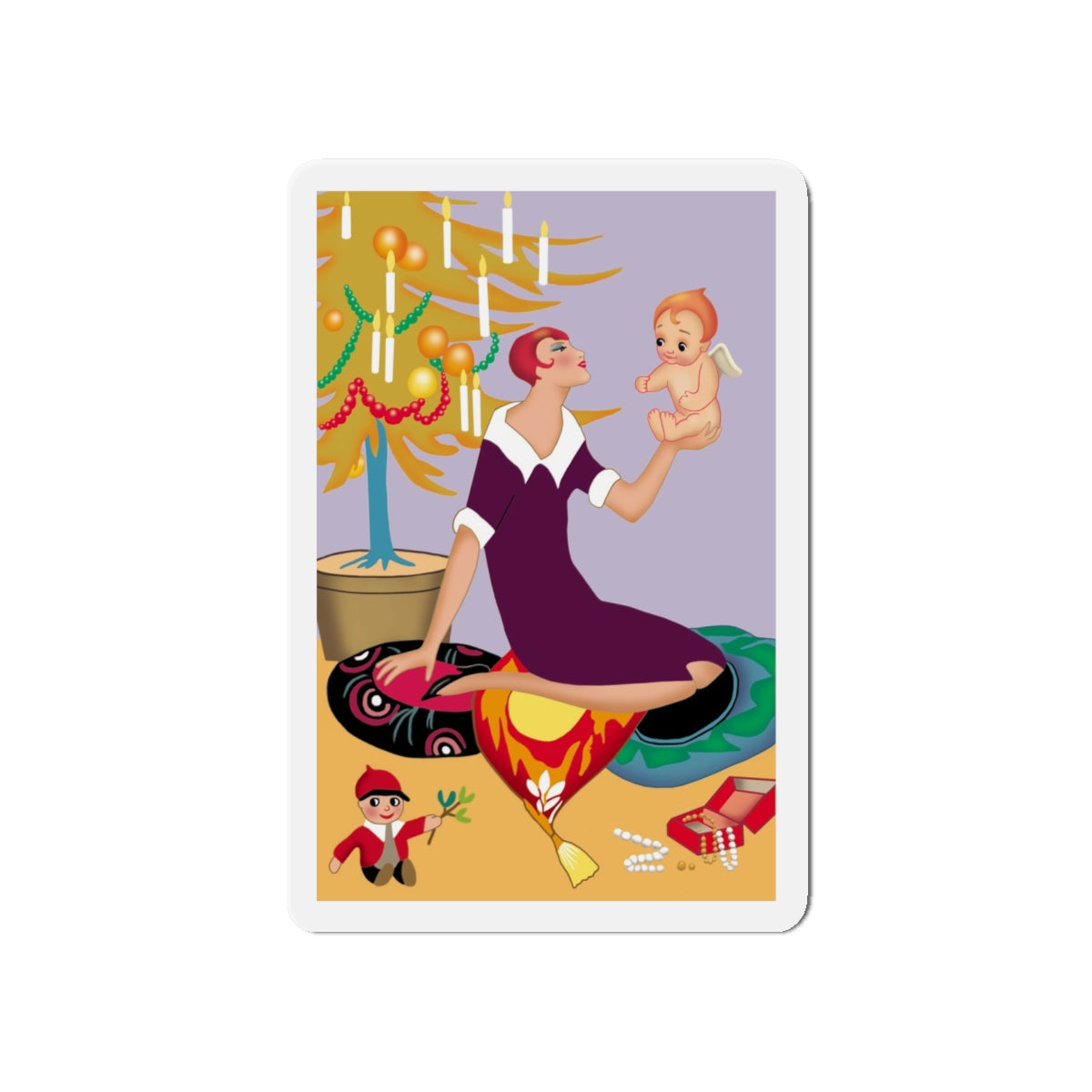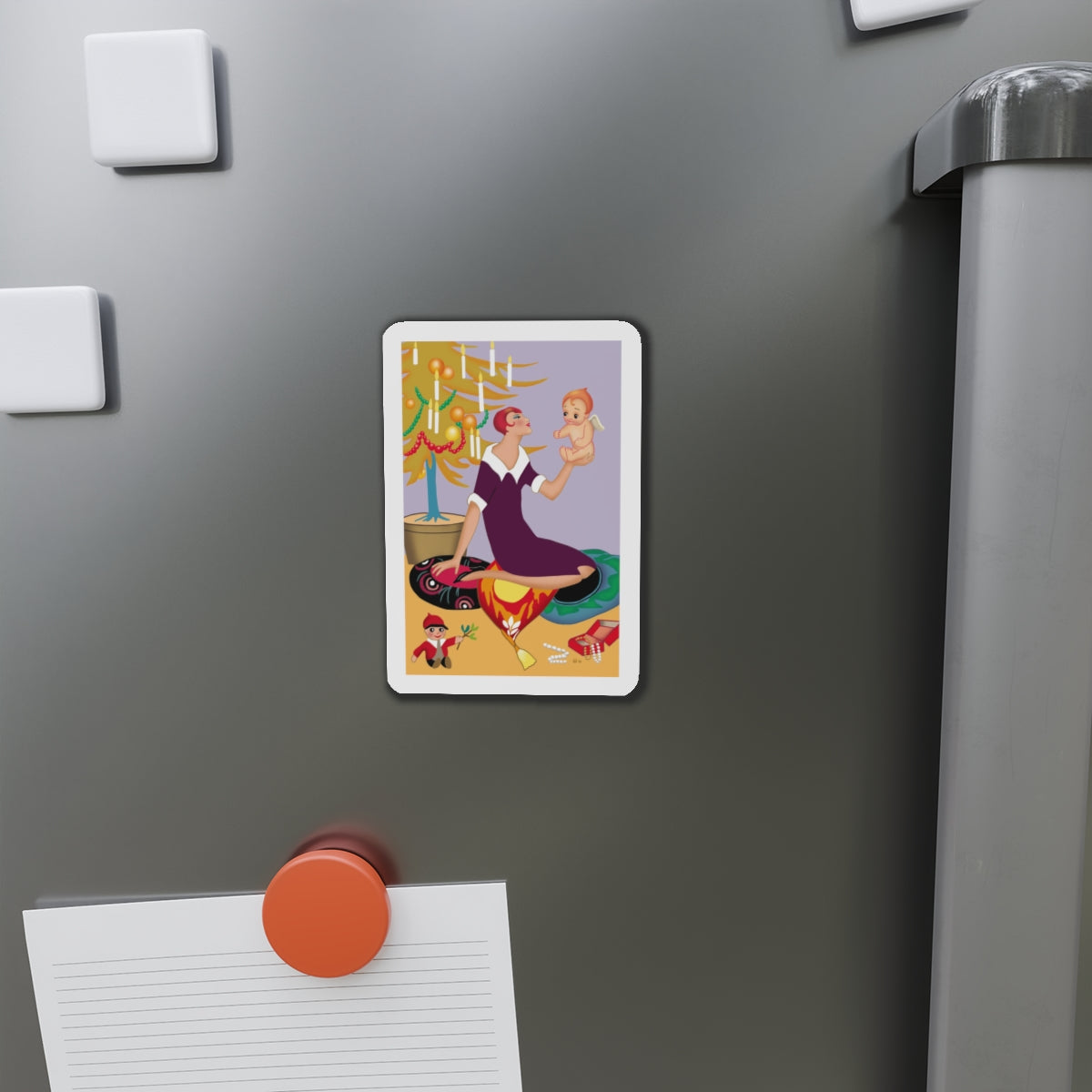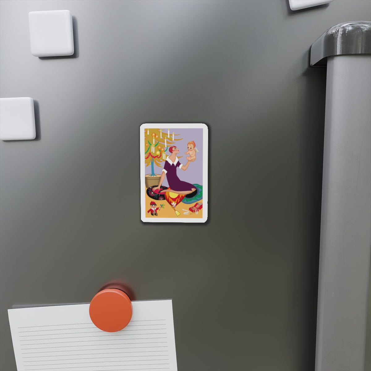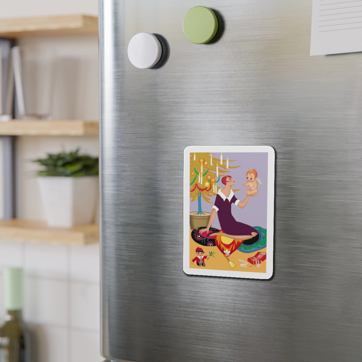 What makes these magnets special is the enchanting artwork they showcase. A graceful woman in a deep plum dress sits elegantly on colorful cushions beside a sparkling Christmas tree glowing with candles, golden baubles, and festive garlands. She tenderly lifts a tiny angel into the air, her expression filled with warmth and joy. At her feet, playful details—an elf doll, strands of beads, and wrapped gifts—complete the festive atmosphere. With its bold colors, clean lines, and whimsical Art Deco style, the scene captures the timeless magic of Christmas while turning a simple magnet into a collectible keepsake.