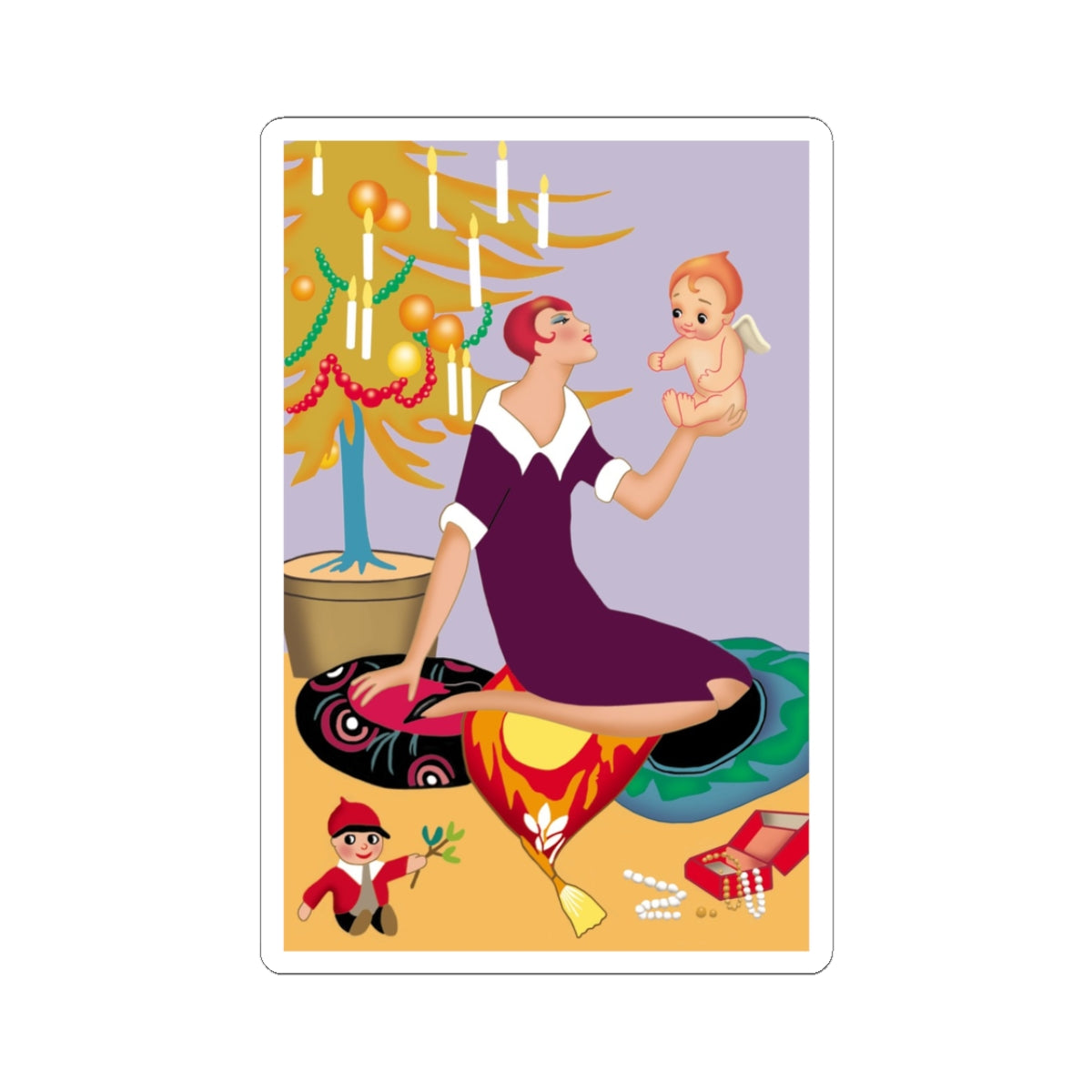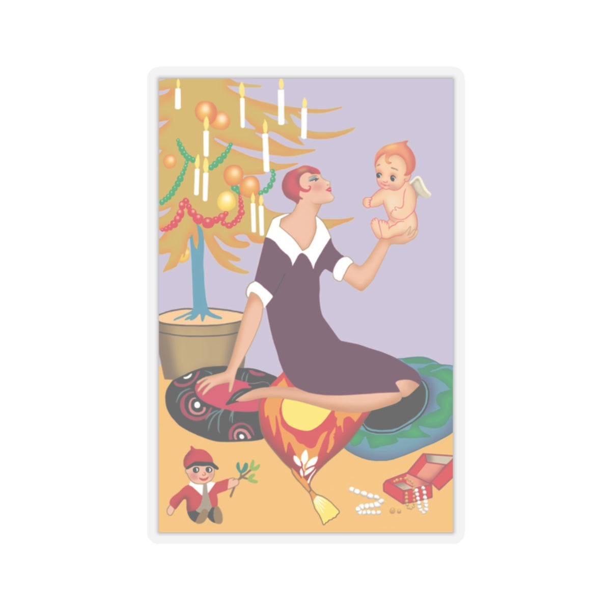 The artwork features a graceful woman in a plum dress beside a radiant Christmas tree, lifting a tiny angel with joy. Surrounded by glowing candles, golden baubles, and playful holiday details, this Art Deco scene captures the timeless magic of Christmas.