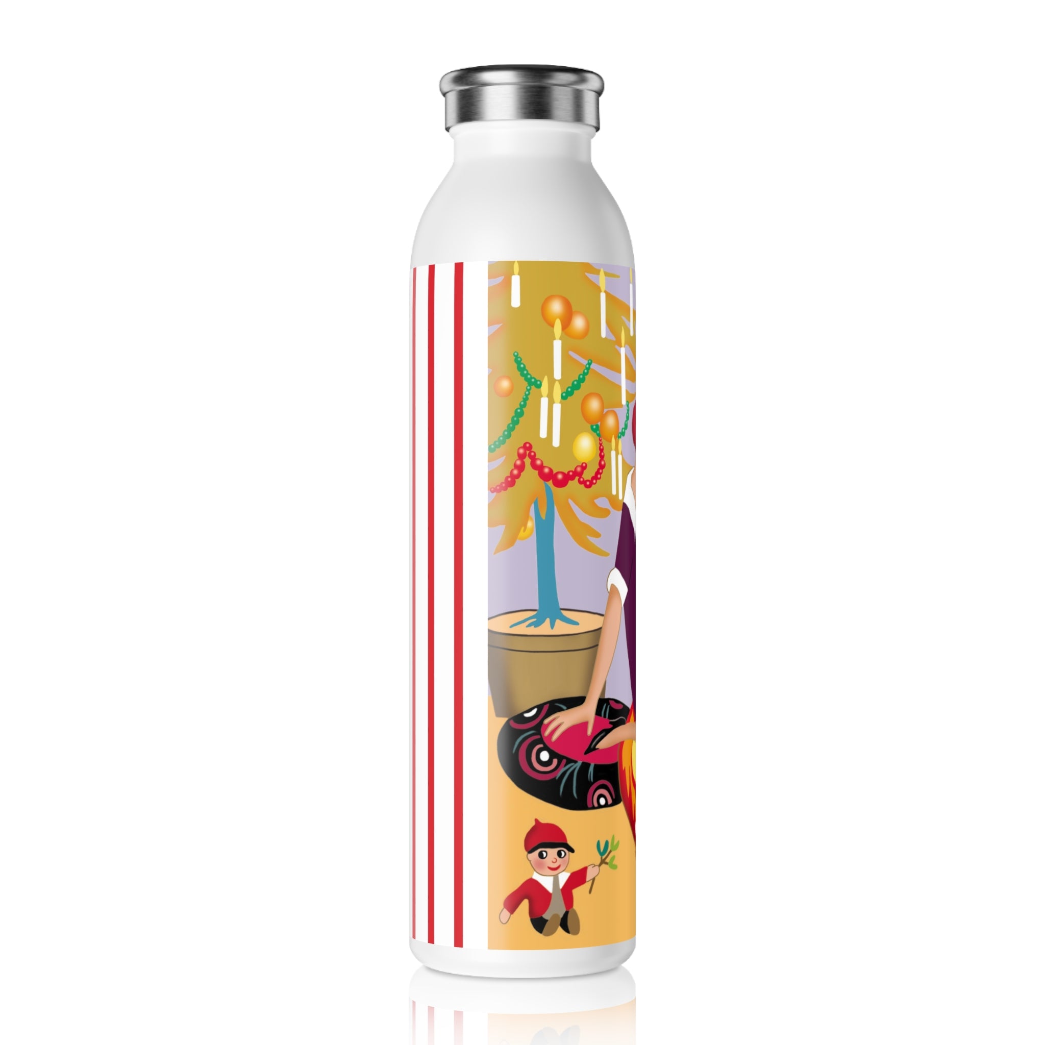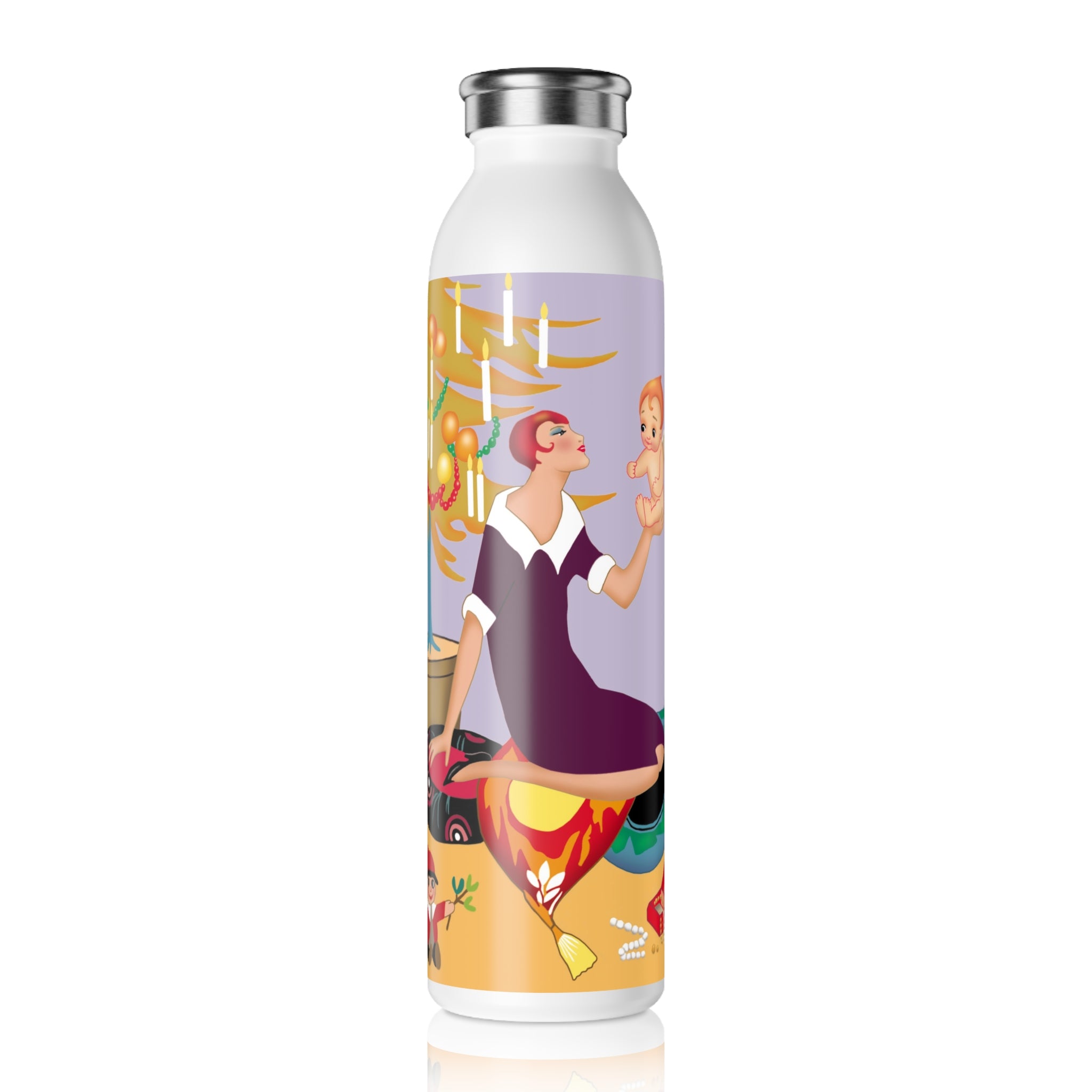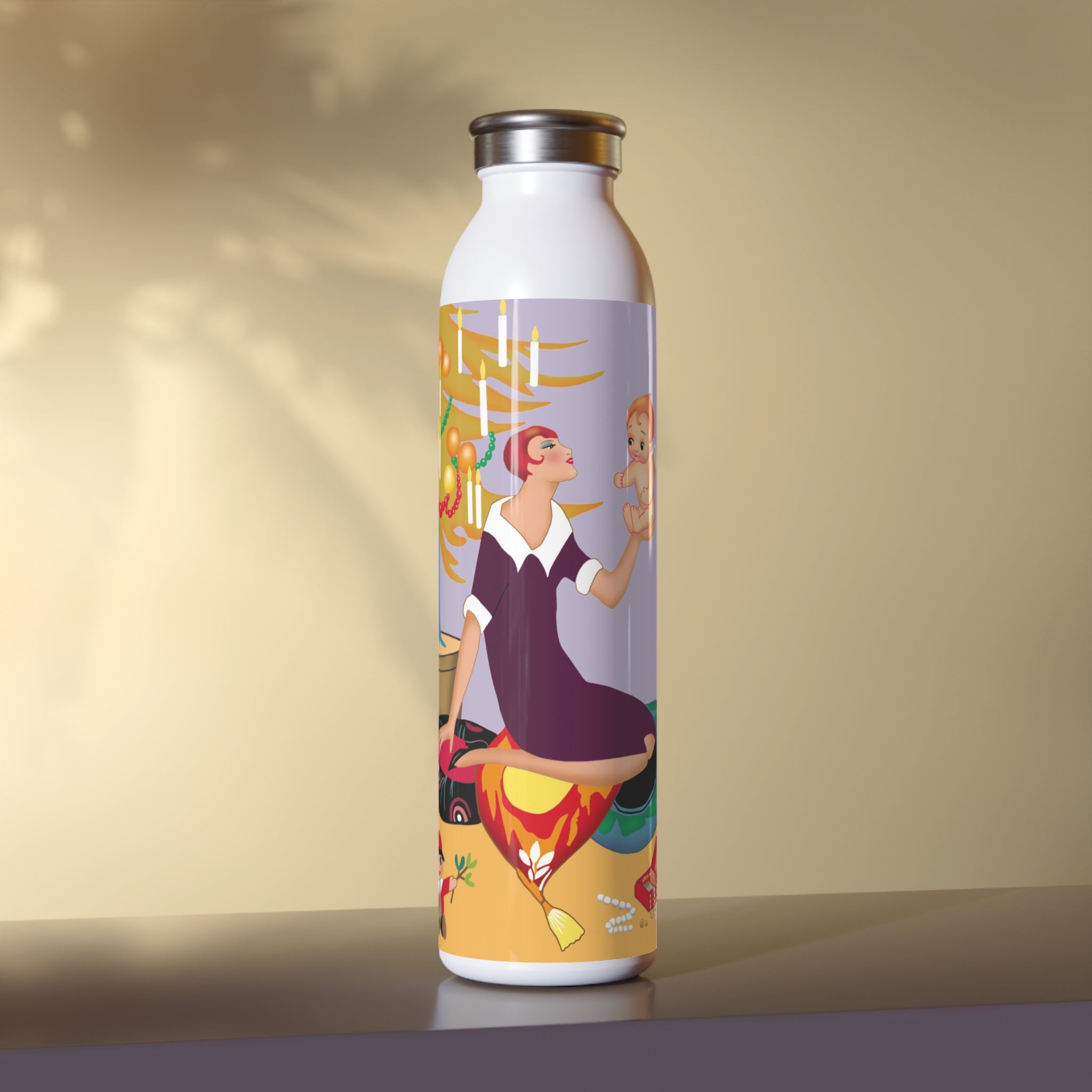 The design elevates this water bottle into a seasonal keepsake. A graceful woman in a deep plum dress sits elegantly on colorful cushions beside a radiant Christmas tree decorated with glowing candles, golden baubles, and festive garlands. She gently lifts a tiny angel into the air, her face glowing with delight. At her feet, playful holiday details—an elf doll, strands of beads, and wrapped gifts—add charm and magic. Bold Art Deco lines and rich jewel tones combine to create a timeless celebration of Christmas joy, turning a functional bottle into a piece of festive elegance.