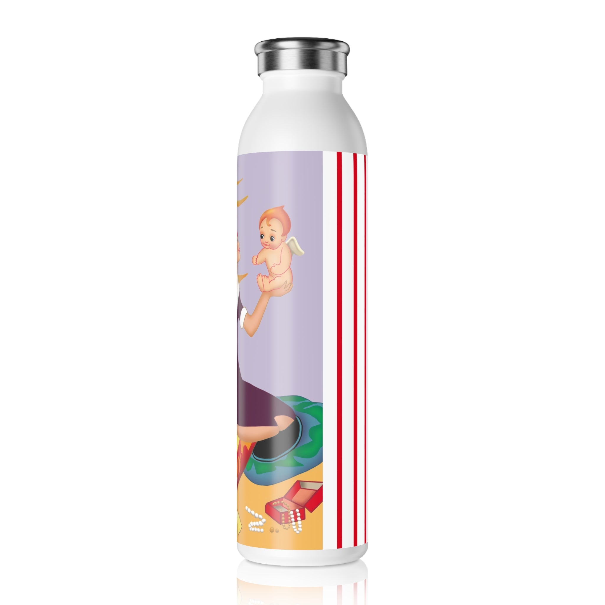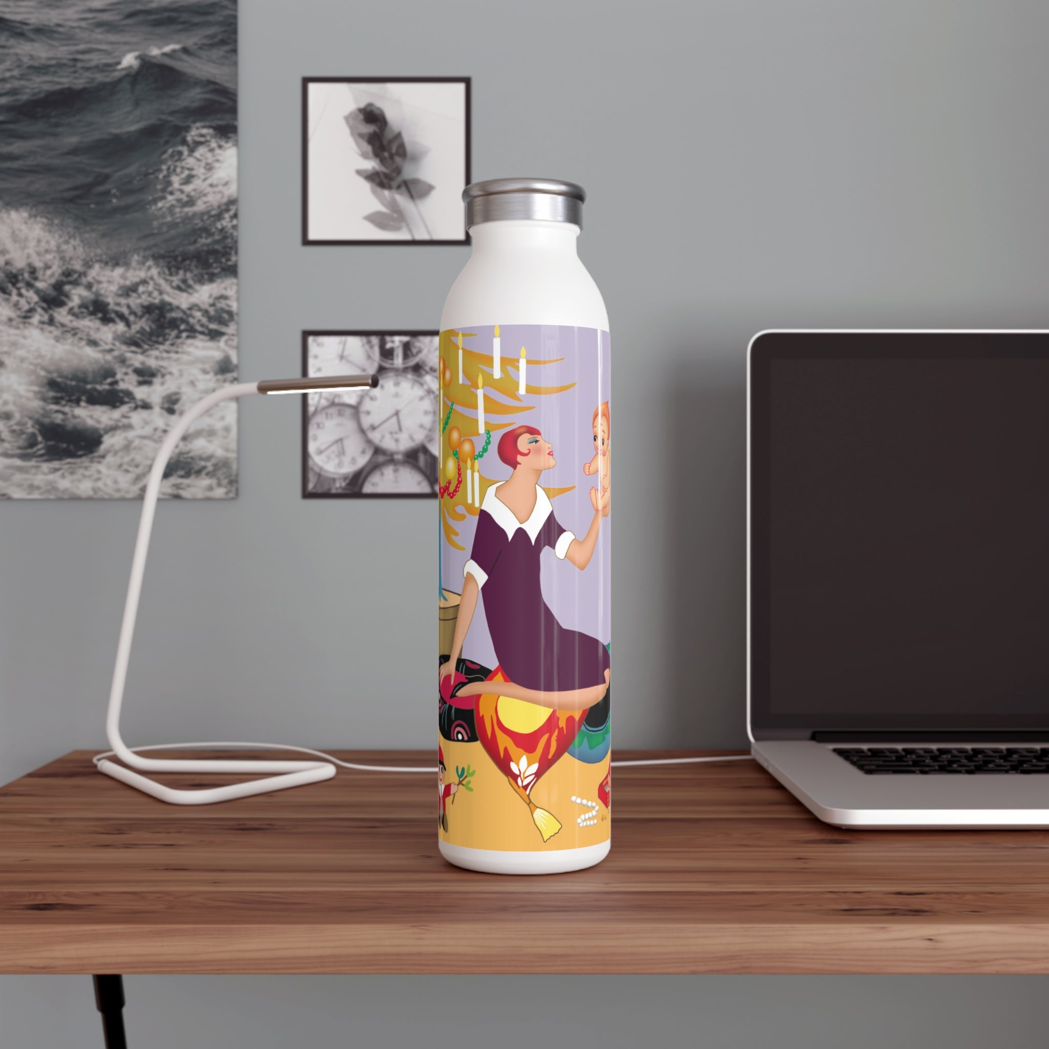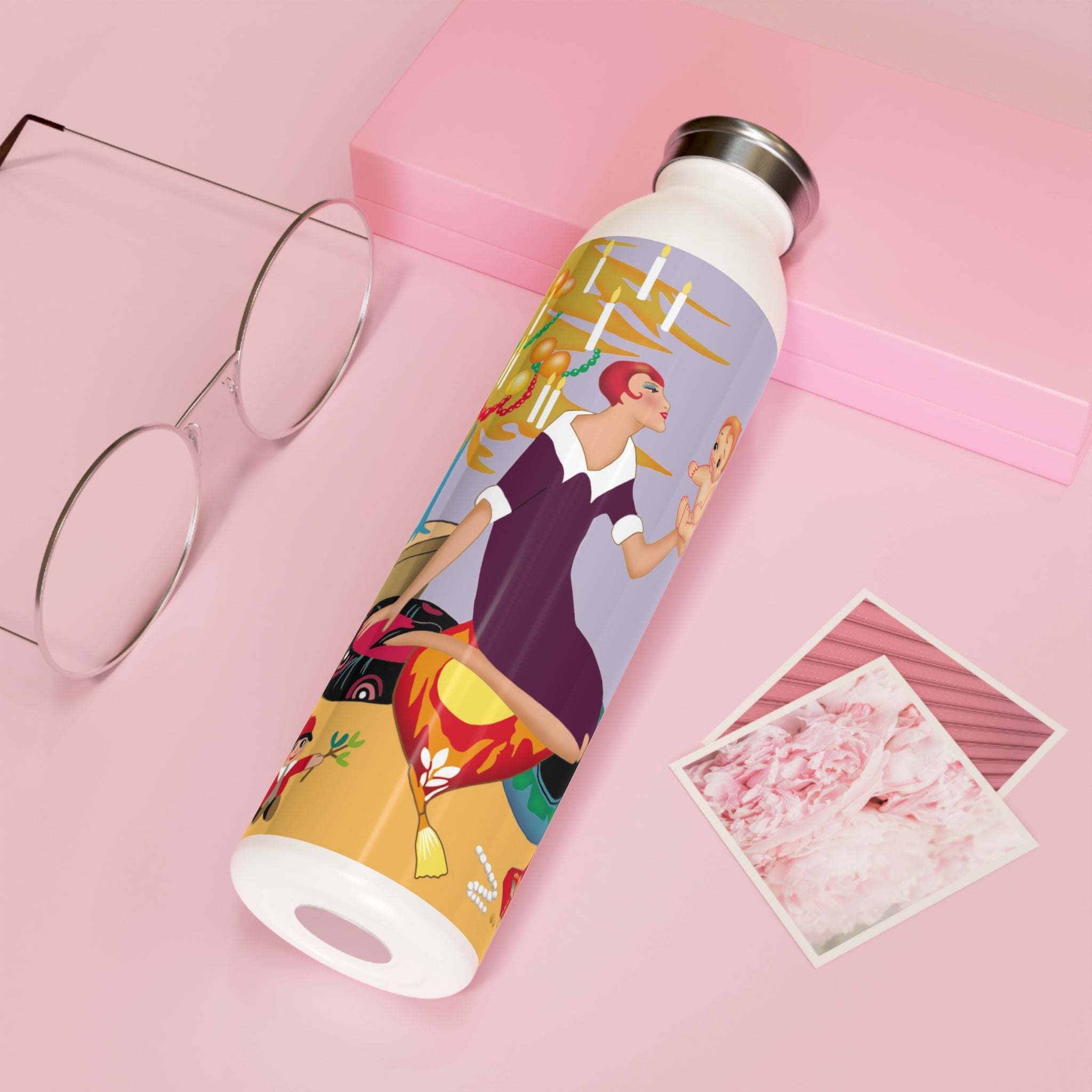 The design elevates this water bottle into a seasonal keepsake. A graceful woman in a deep plum dress sits elegantly on colorful cushions beside a radiant Christmas tree decorated with glowing candles, golden baubles, and festive garlands. She gently lifts a tiny angel into the air, her face glowing with delight. At her feet, playful holiday details—an elf doll, strands of beads, and wrapped gifts—add charm and magic. Bold Art Deco lines and rich jewel tones combine to create a timeless celebration of Christmas joy, turning a functional bottle into a piece of festive elegance.