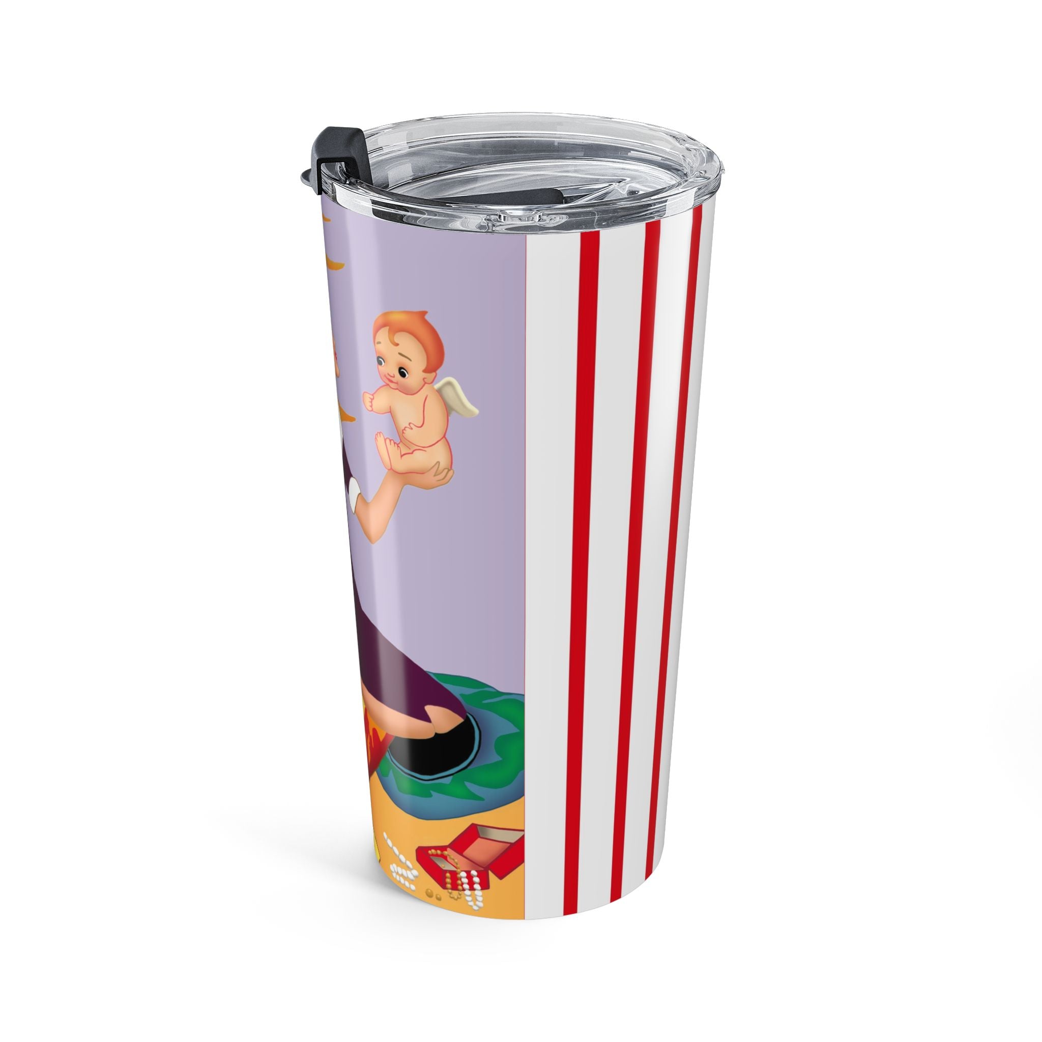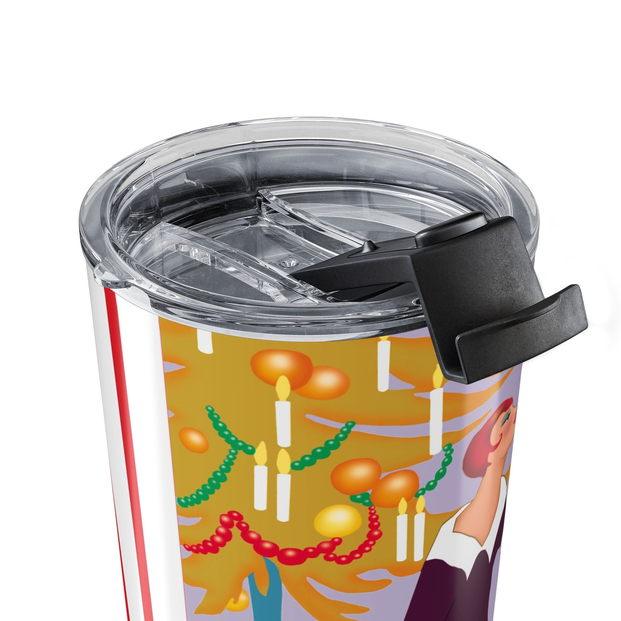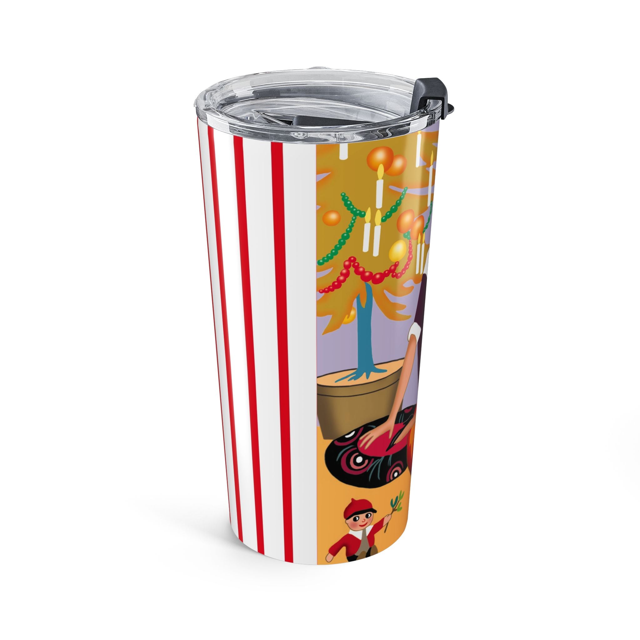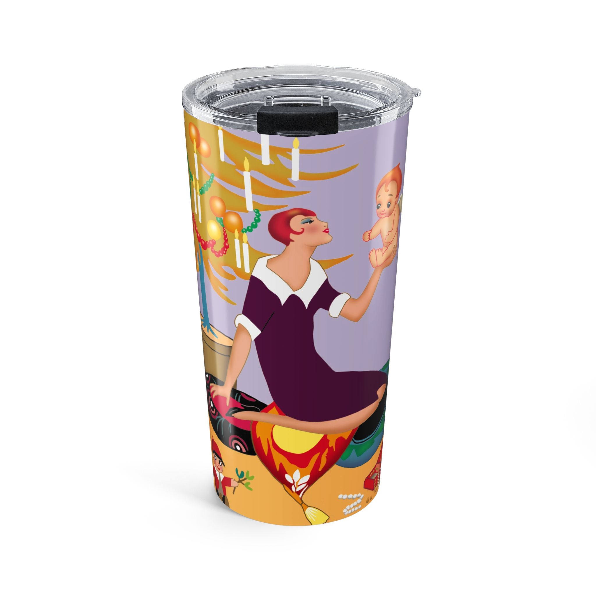 The artwork transforms this tumbler into a holiday keepsake. A graceful woman in a deep plum dress reclines on colorful cushions beside a glowing Christmas tree, its branches adorned with golden baubles, candles, and festive garlands. She tenderly raises a tiny angel, her joy reflected in the warmth of the scene. At her feet, playful holiday details—an elf doll, glittering beads, and wrapped presents—add charm and delight. Bold colors and clean Art Deco lines capture the timeless spirit of Christmas, making every sip feel like part of a glamorous holiday celebration.