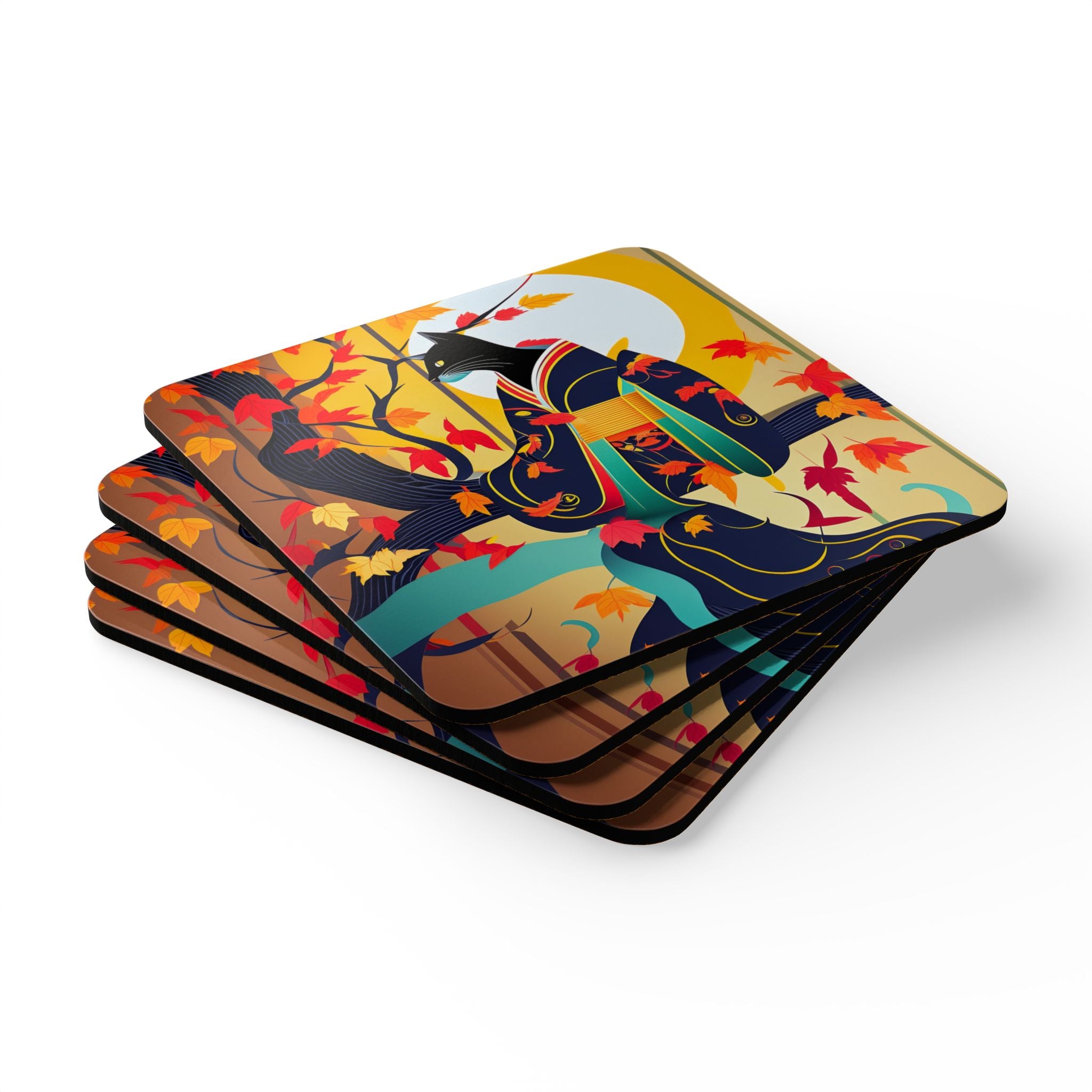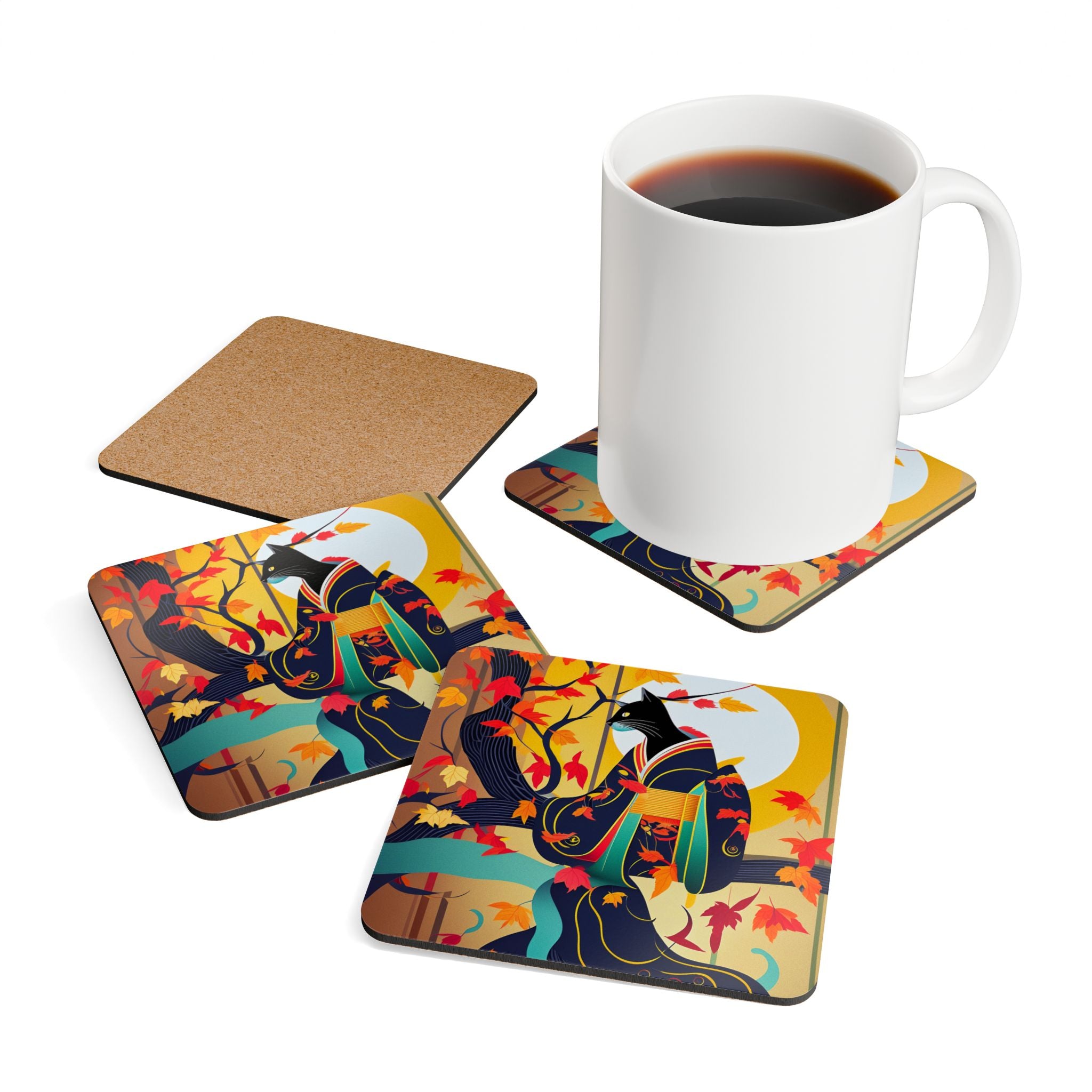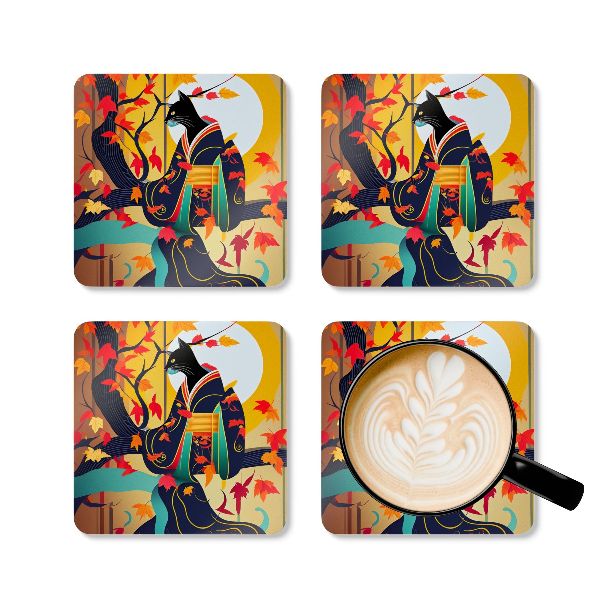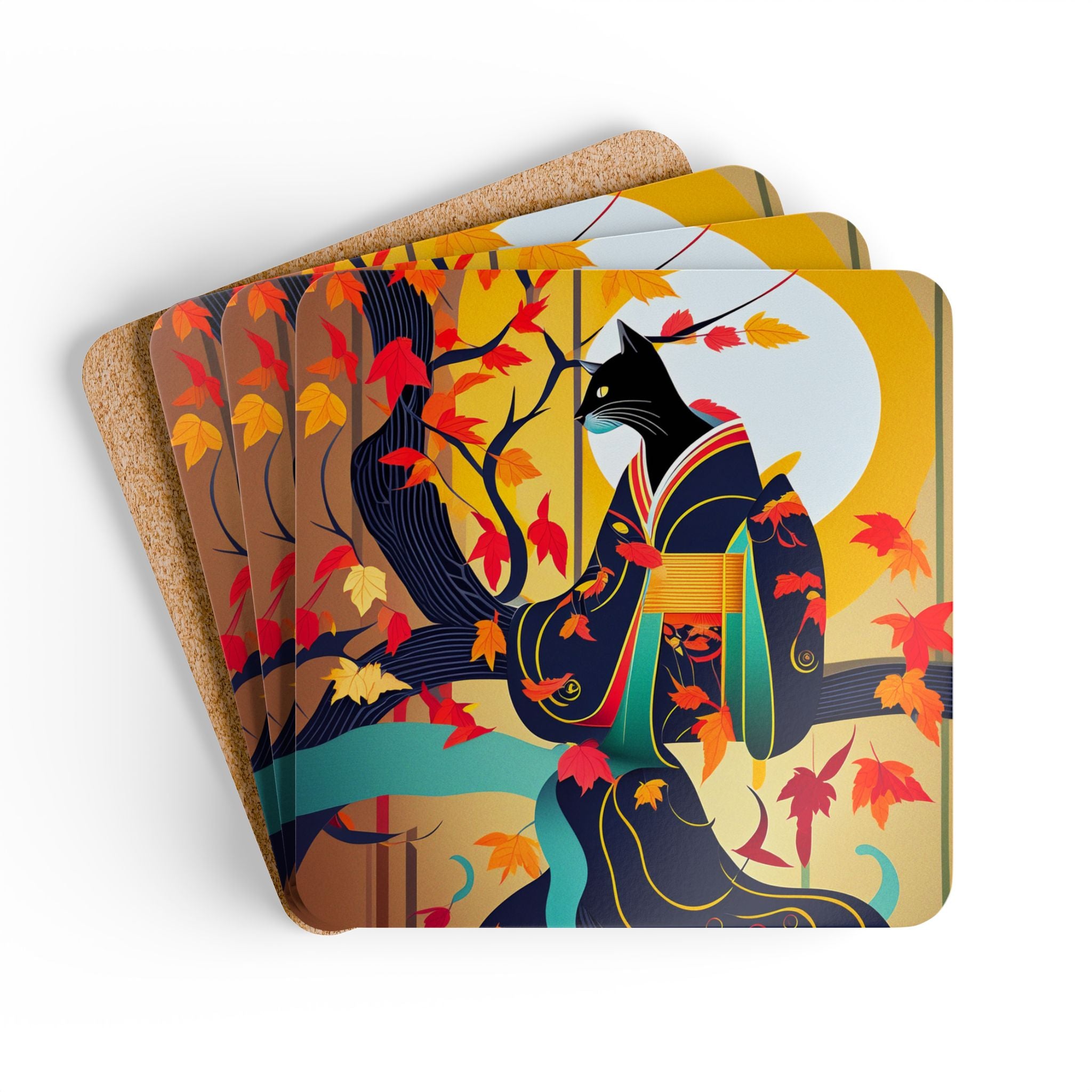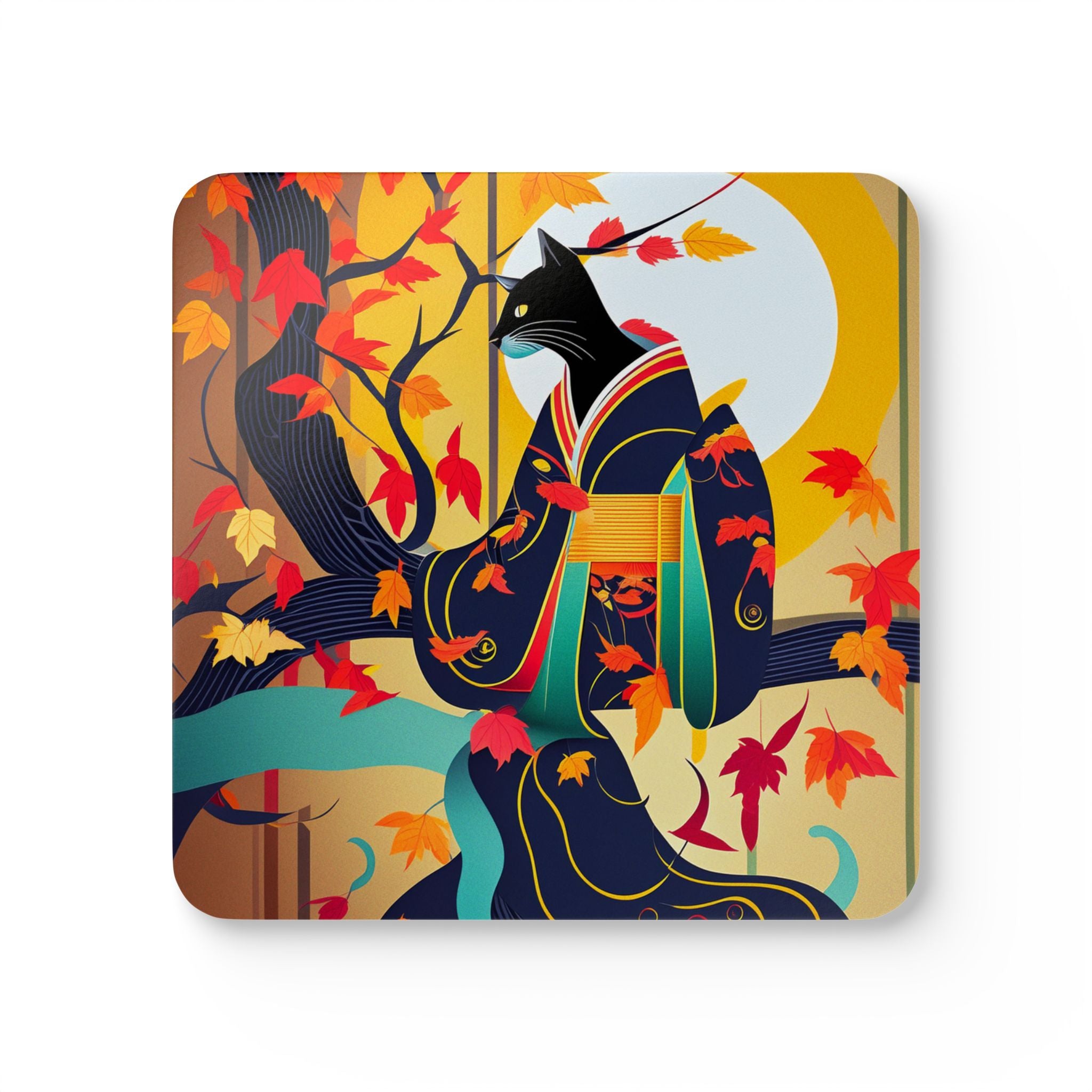 Artwork created, designed and digitally remastered by Sarasvati Designs. A mystical black cat, elegantly dressed in a vibrant, patterned kimono, perches gracefully on a branch of a Japanese maple tree. The kimono features rich autumn hues, complementing the crimson and gold leaves of the tree. Swirling around the cat, the leaves dance in the breeze, creating a magical and serene atmosphere. This enchanting Halloween scene blends traditional Japanese aesthetics with a touch of whimsy and magic.