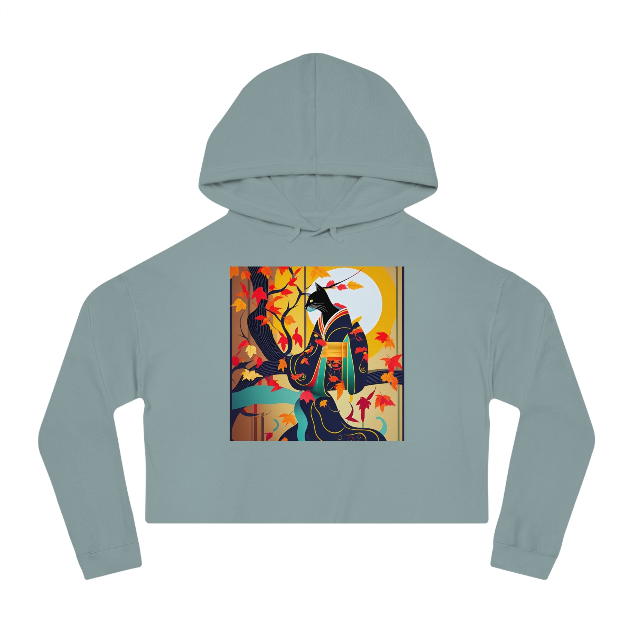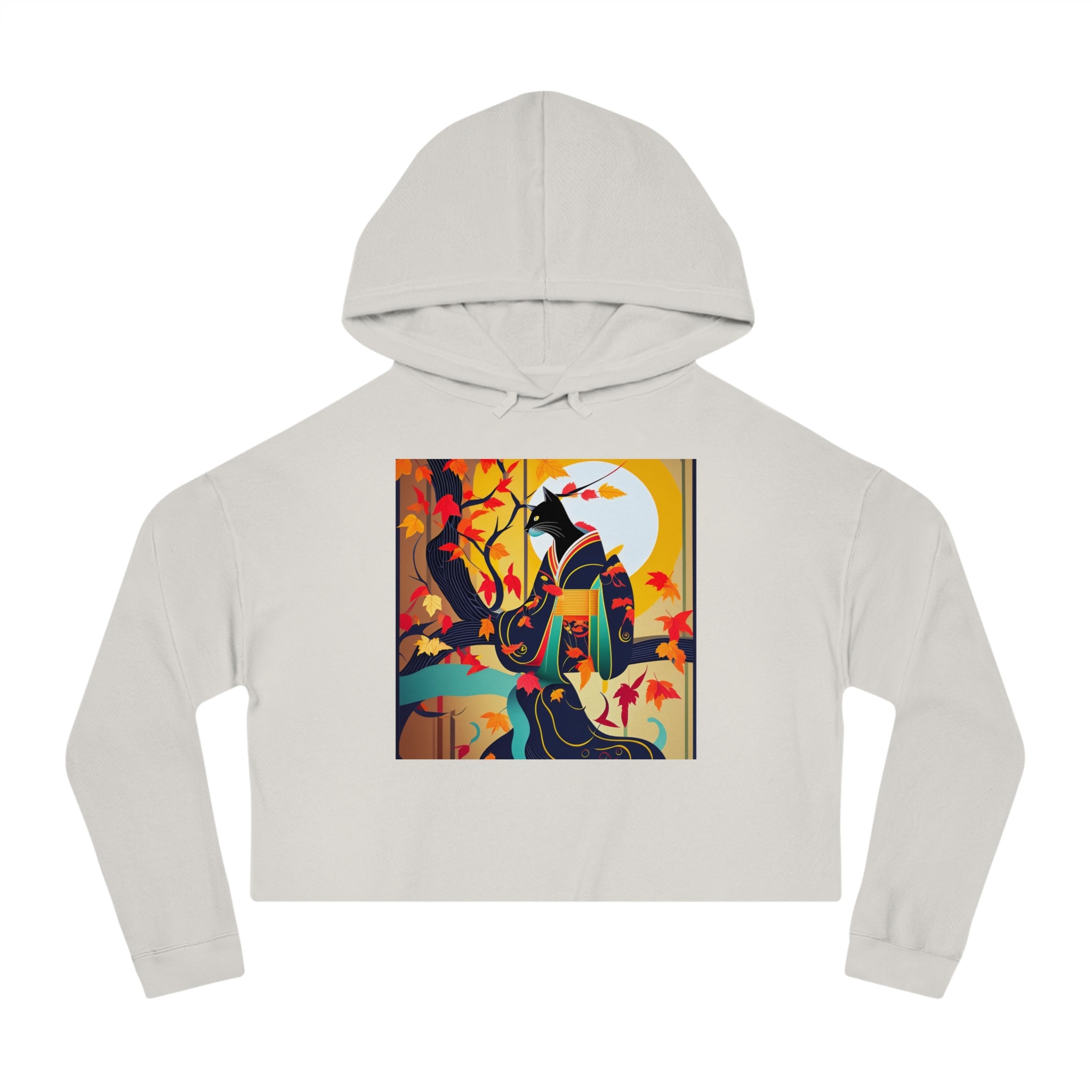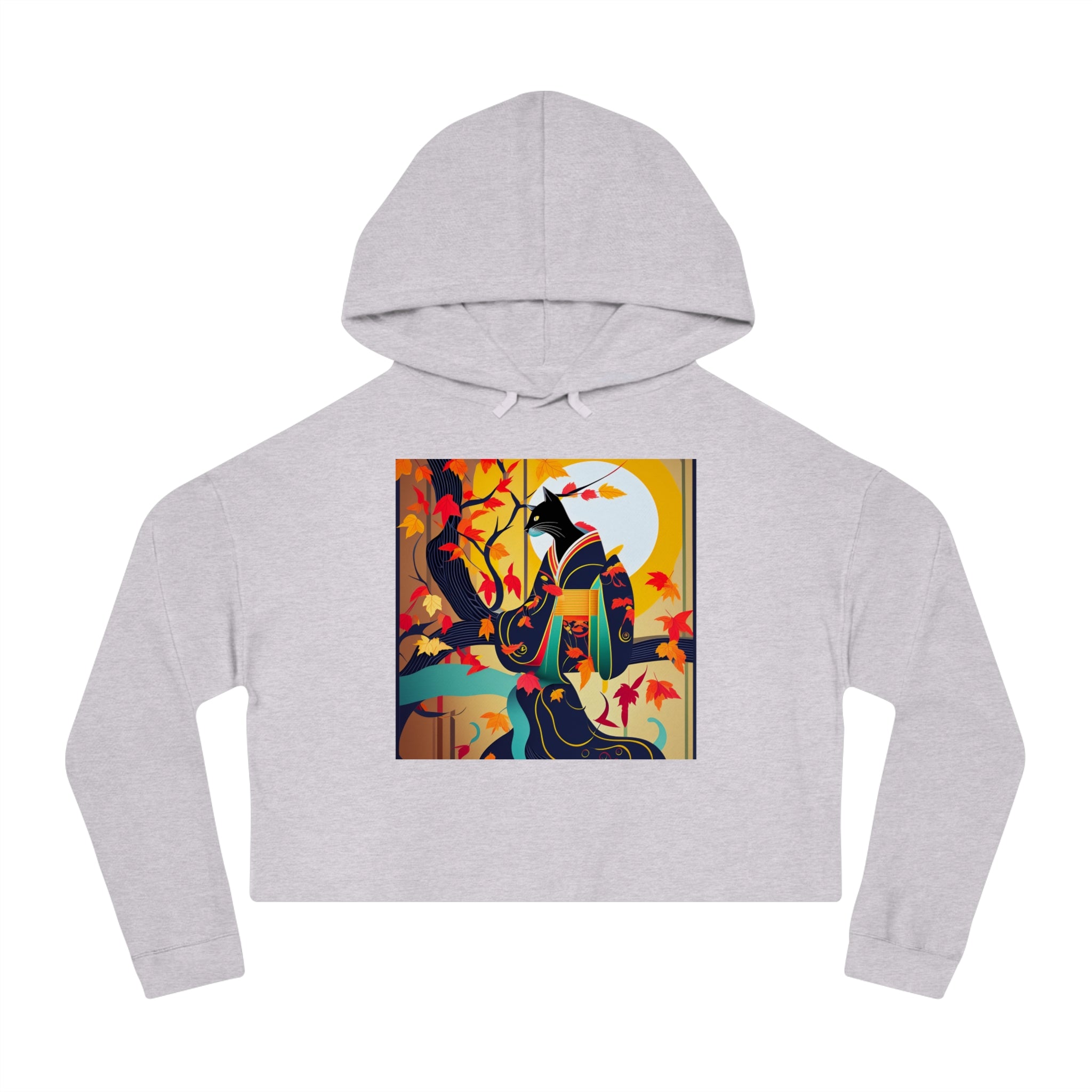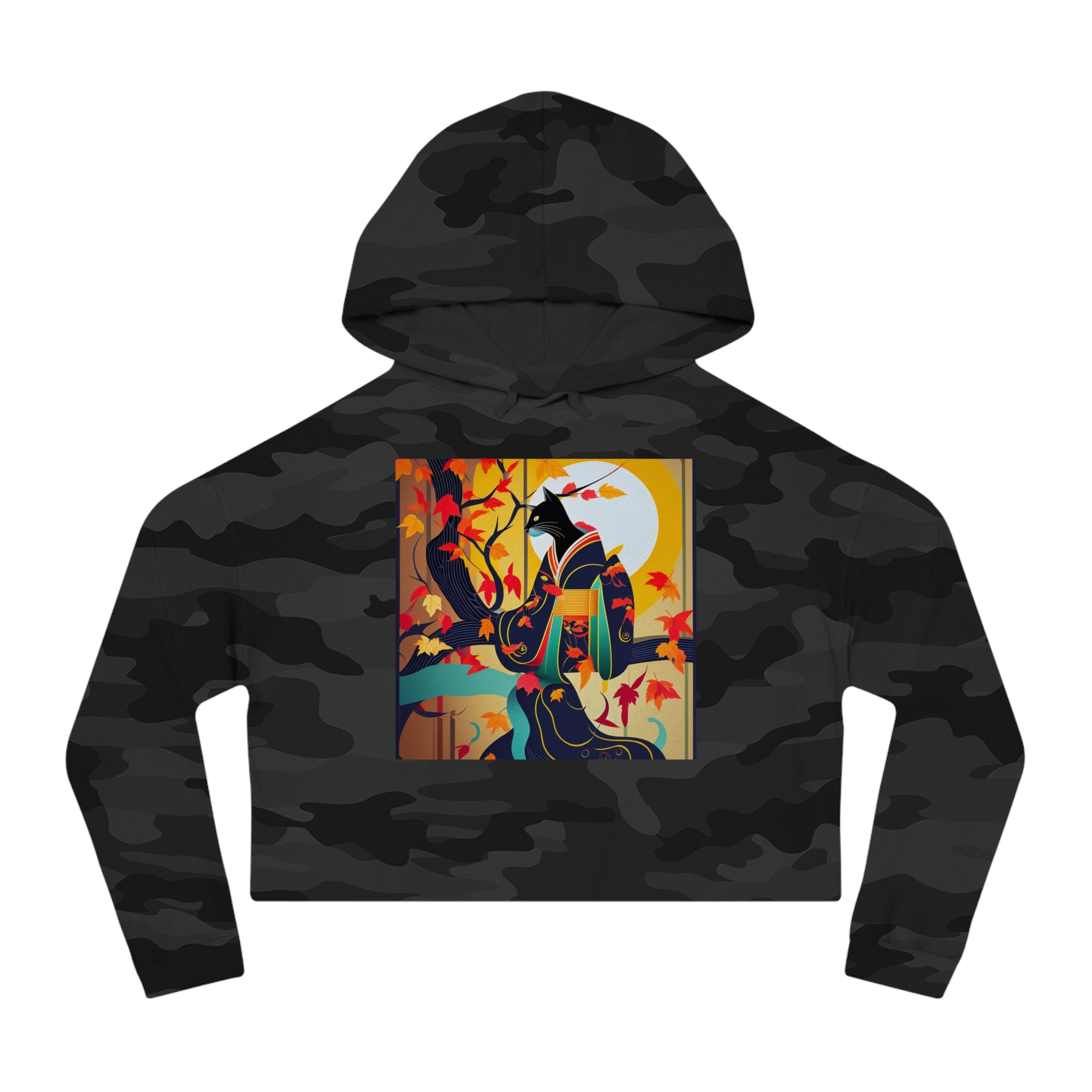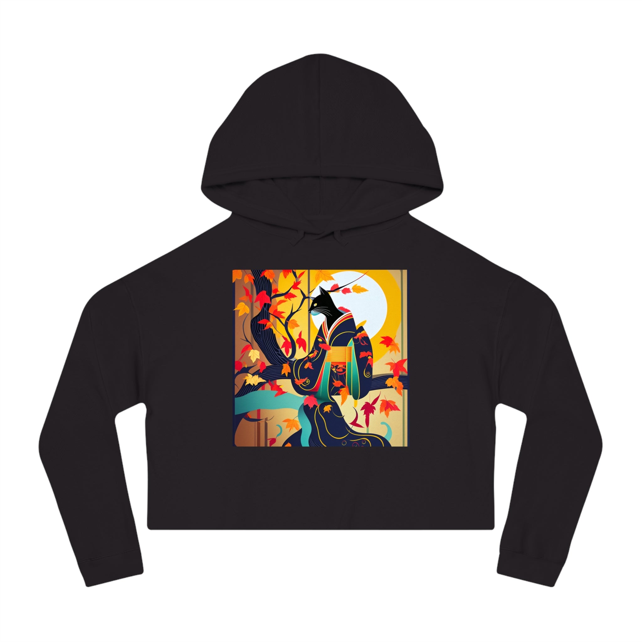 Artwork created, designed and digitally remastered by Sarasvati Designs. A mystical black cat, elegantly dressed in a vibrant, patterned kimono, perches gracefully on a branch of a Japanese maple tree. The kimono features rich autumn hues, complementing the crimson and gold leaves of the tree. Swirling around the cat, the leaves dance in the breeze, creating a magical and serene atmosphere. This enchanting Halloween scene blends traditional Japanese aesthetics with a touch of whimsy and magic.
