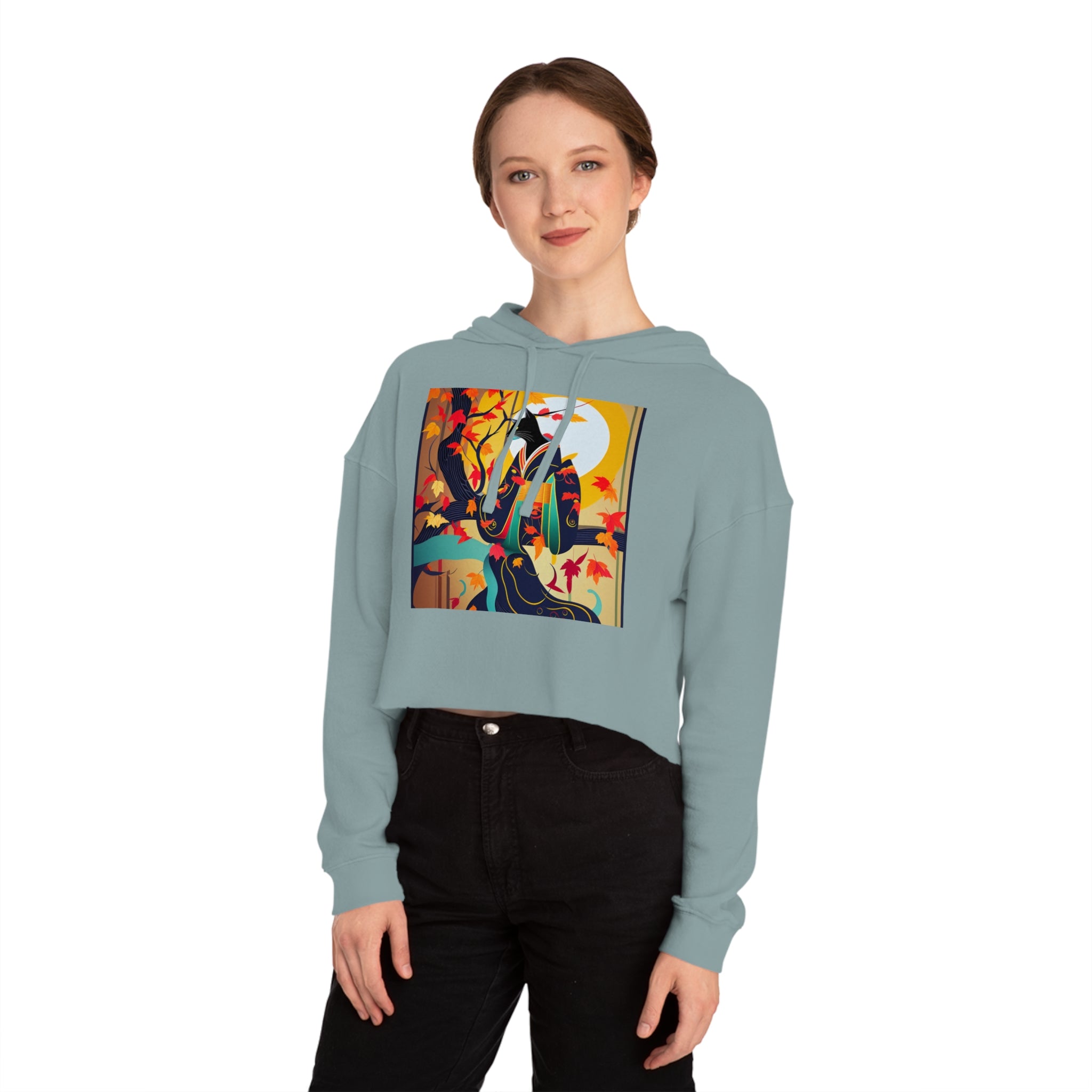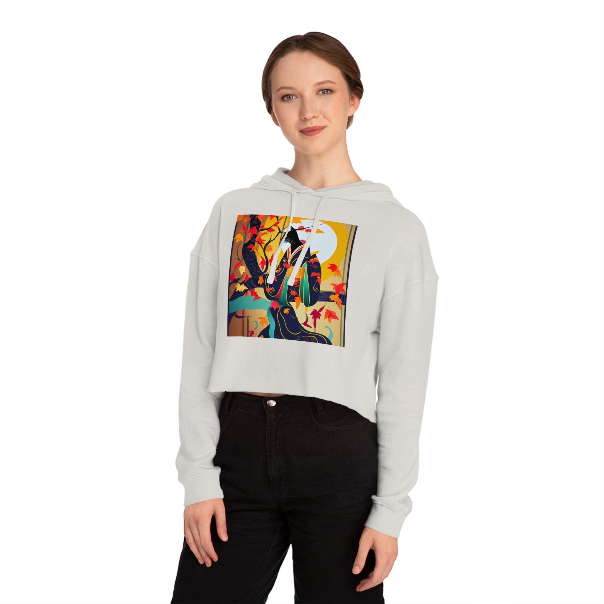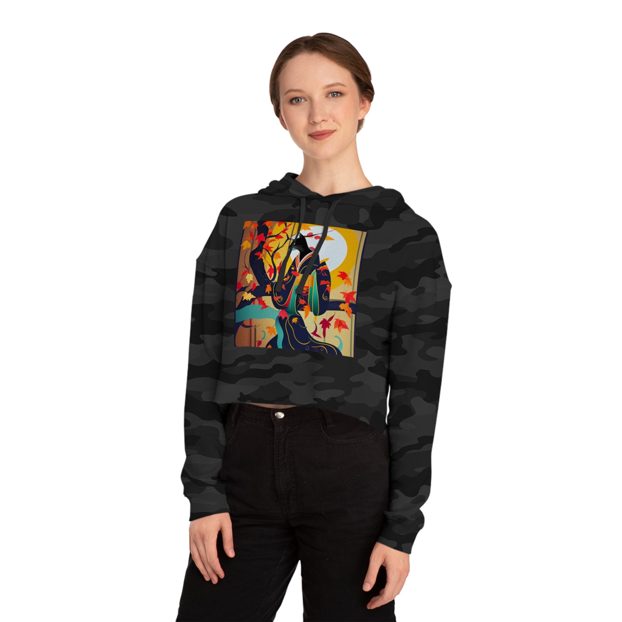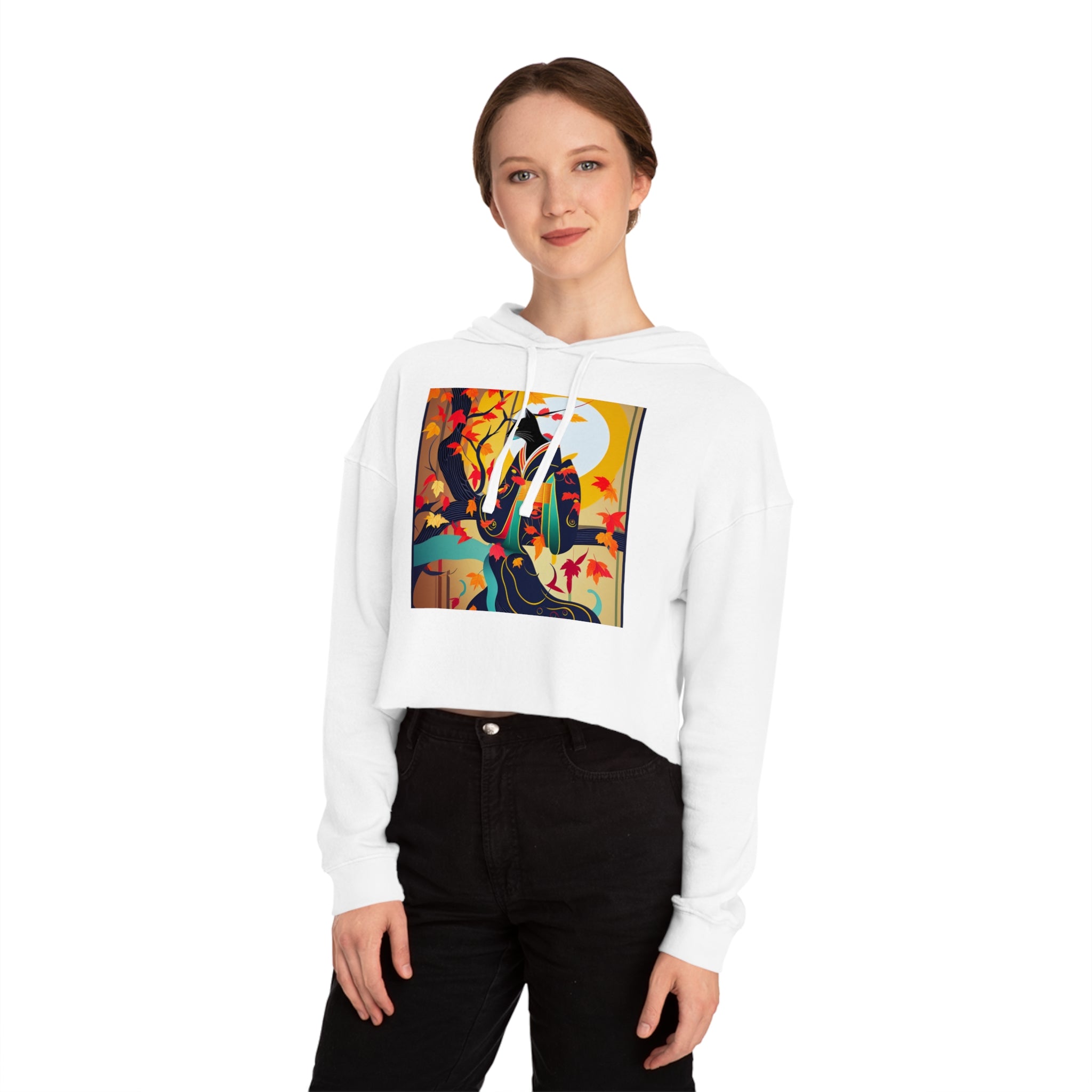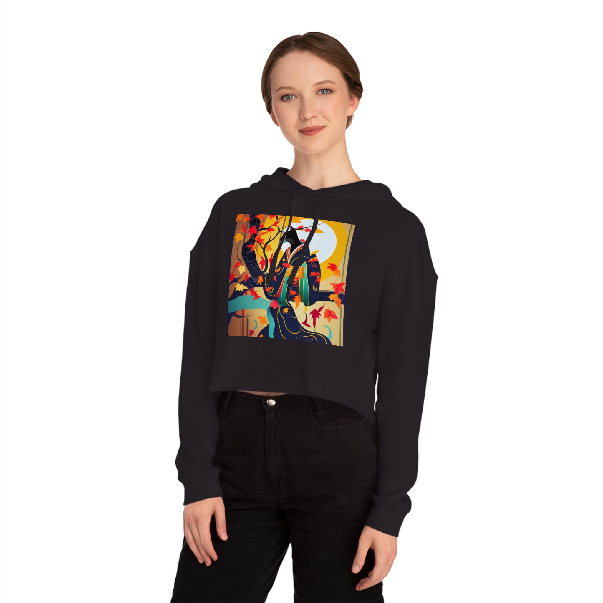 Artwork created, designed and digitally remastered by Sarasvati Designs. A mystical black cat, elegantly dressed in a vibrant, patterned kimono, perches gracefully on a branch of a Japanese maple tree. The kimono features rich autumn hues, complementing the crimson and gold leaves of the tree. Swirling around the cat, the leaves dance in the breeze, creating a magical and serene atmosphere. This enchanting Halloween scene blends traditional Japanese aesthetics with a touch of whimsy and magic.