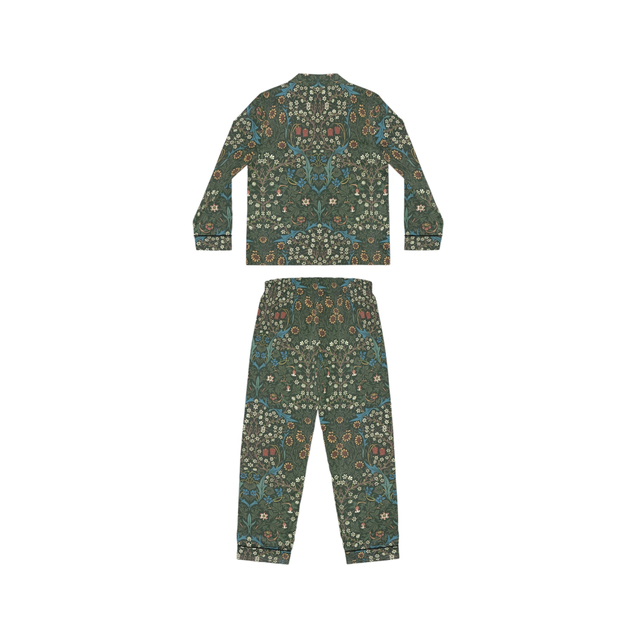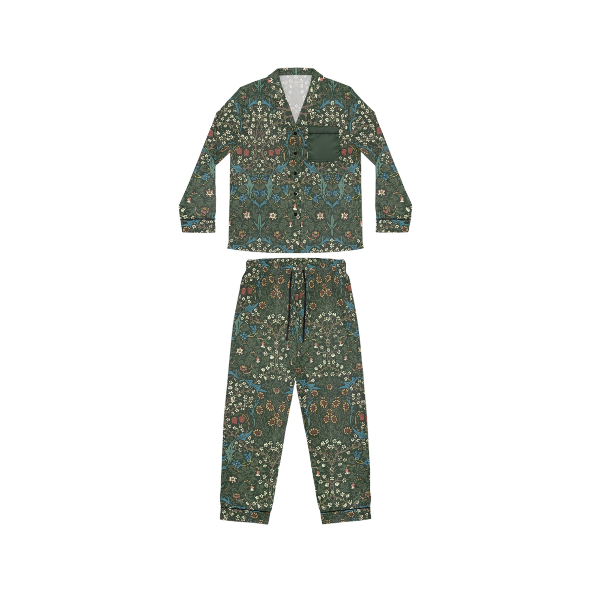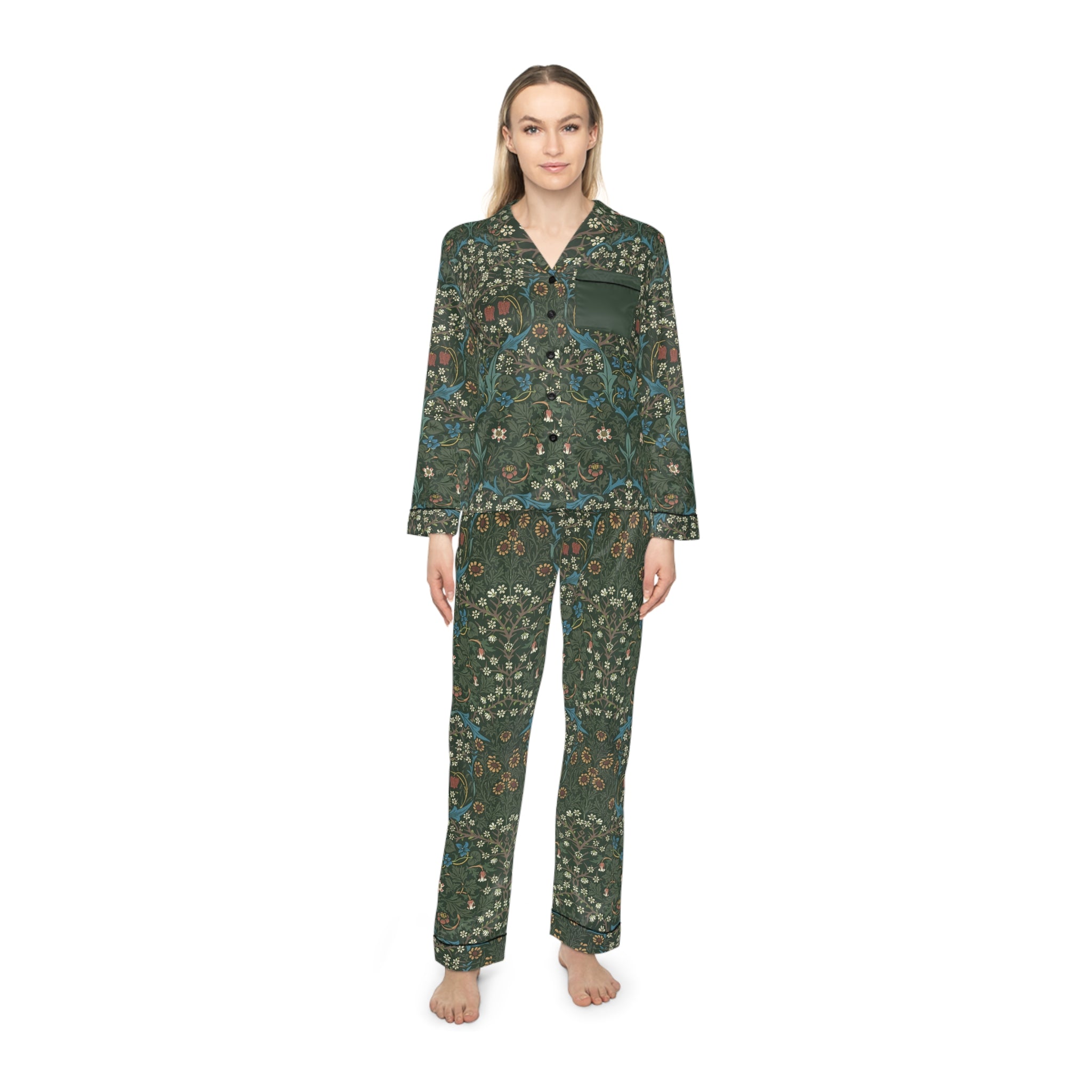 Crafted with a blend of 95% polyester and 5% spandex, these vintage art-designed pajamas offer a luxuriously soft feel. The soft satin fabric contributes to the creation of distinctive pajama sets. Each set is complete with a notch lapel (collar style) and a drawstring waist, ensuring a comfortable and snug fit.