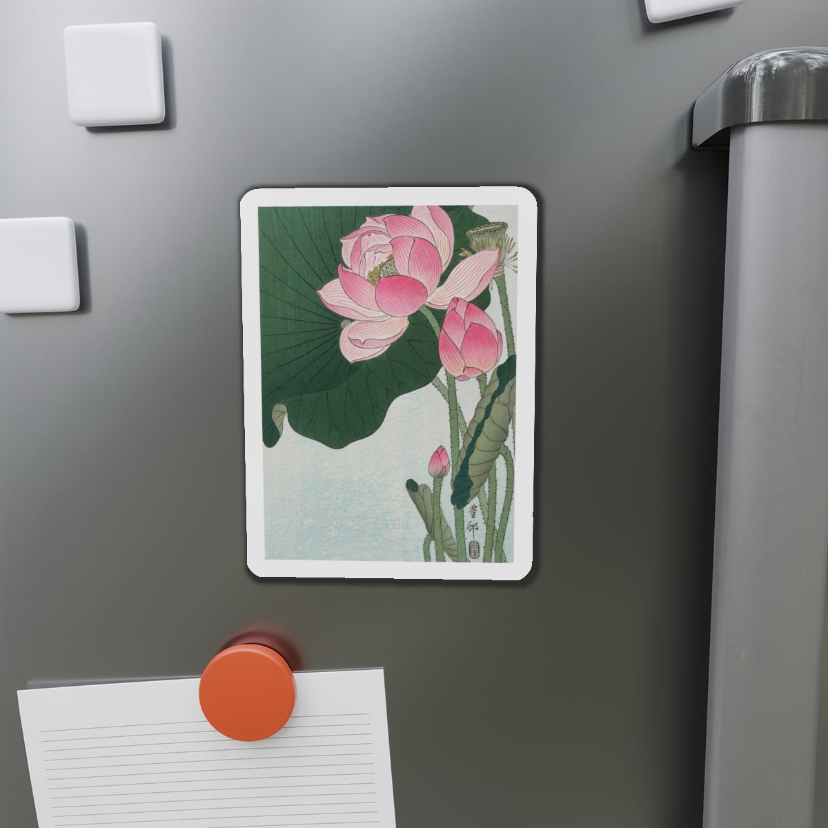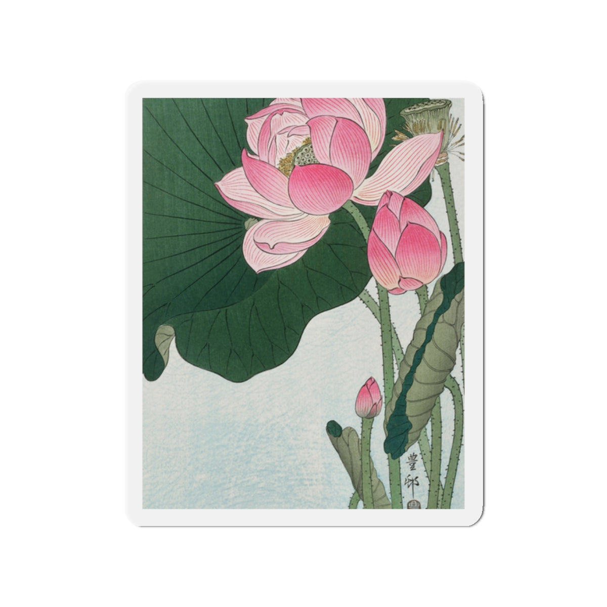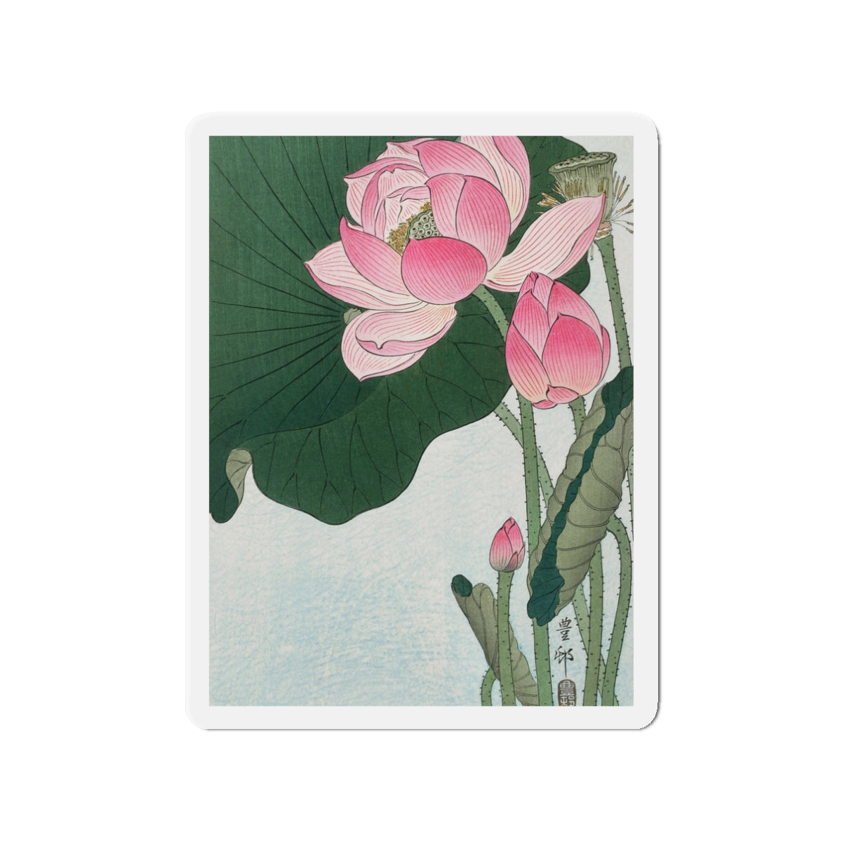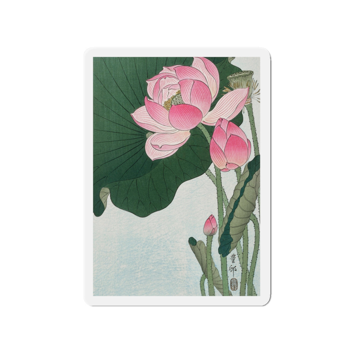 Artwork designed and digitally remastered by Sarasvati Designs. The original artwork, "Blooming Lotus Flowers" by Ohara Koson, is a captivating artwork that showcases the serene beauty of lotus flowers in full bloom. Known for his mastery of nature-inspired subjects, Koson's depiction of lotus flowers in this piece is both delicate and vibrant. Ohara Koson (1877-1945) was a Japanese painter and printmaker known for his exquisite woodblock prints of birds and flowers.