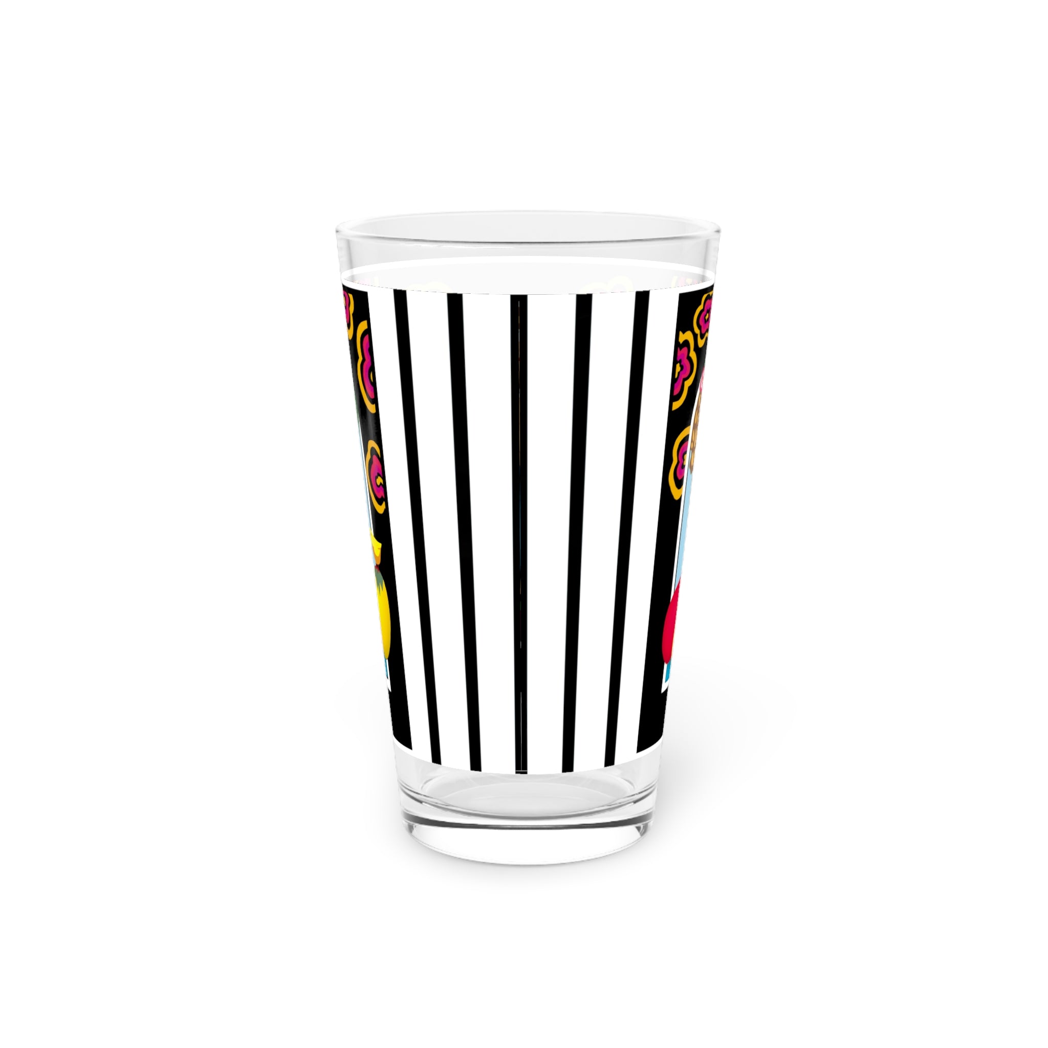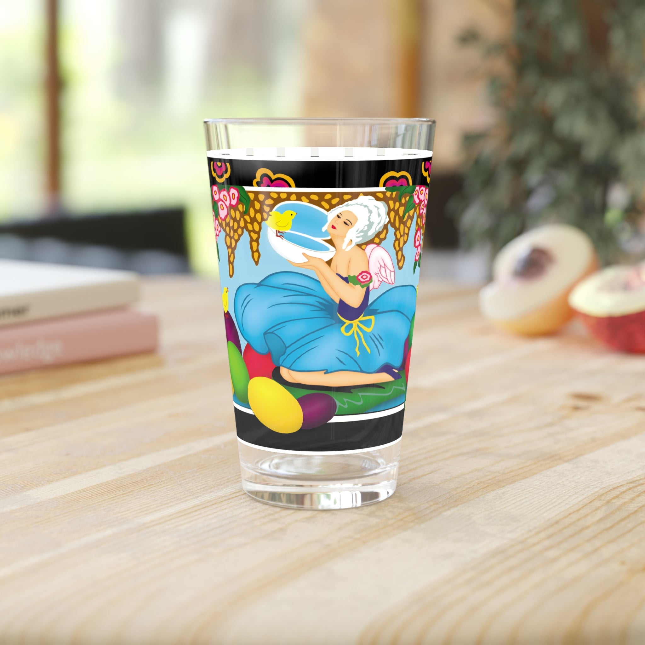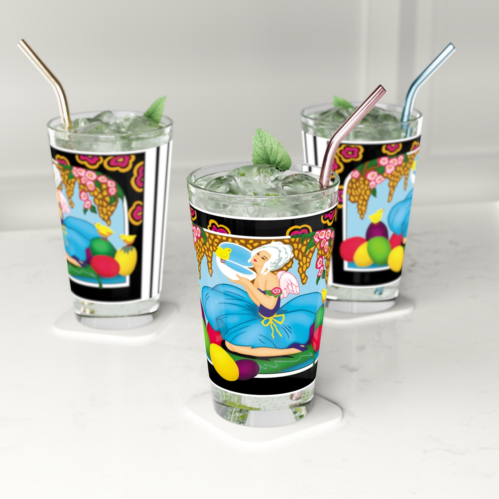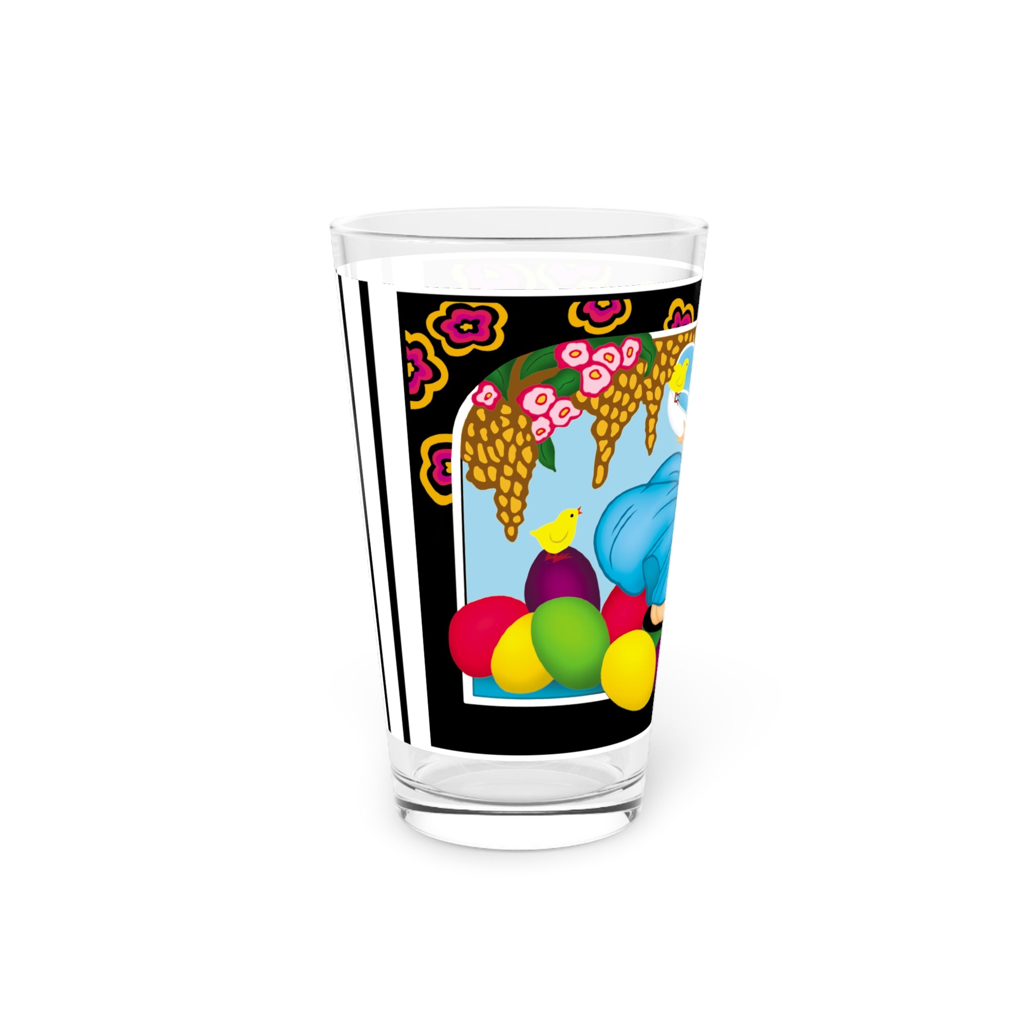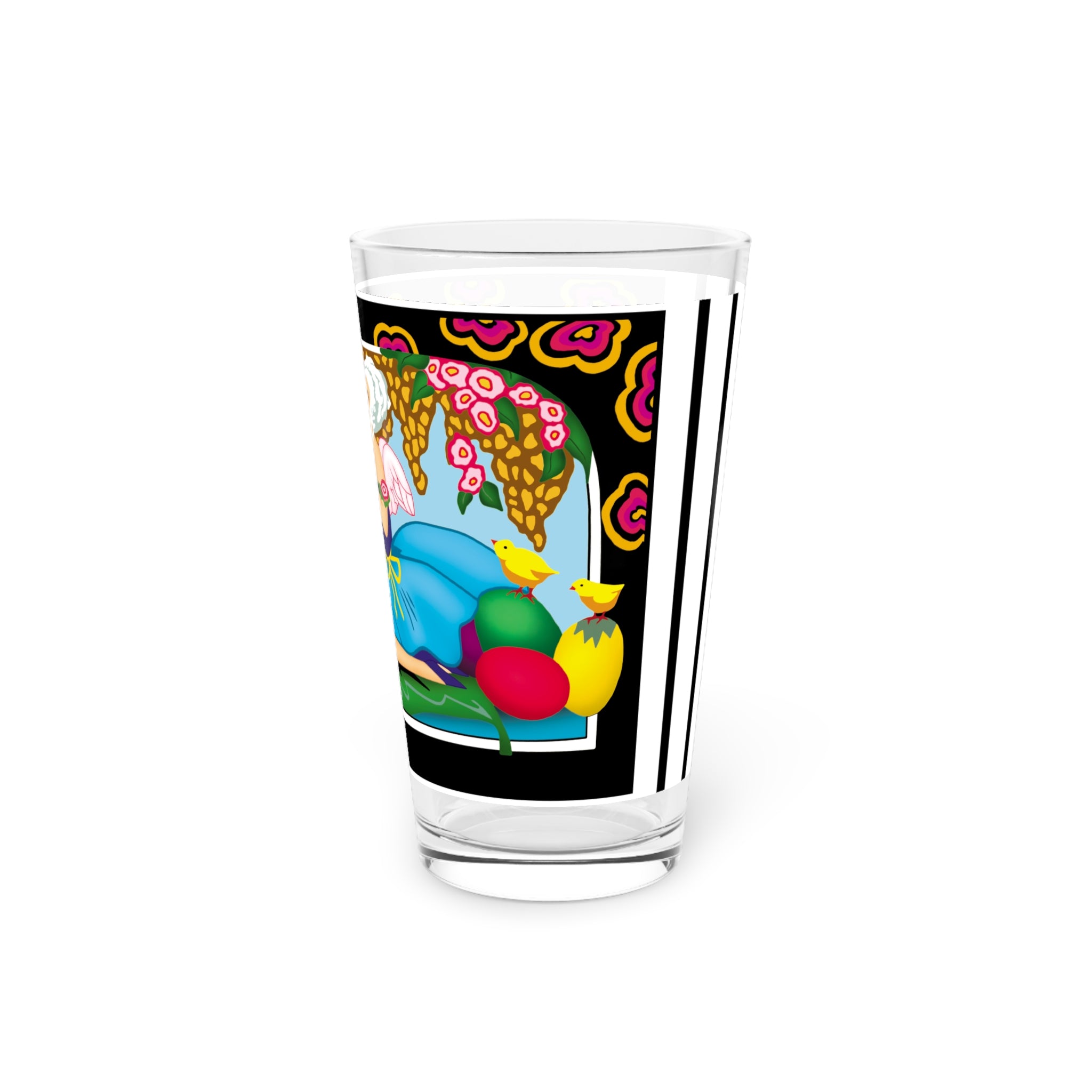 Add a touch of Art Deco elegance to your drinkware collection with this beautifully printed 16oz glass. Featuring a chic woman with intricately styled white hair, she sits gracefully on a vibrant green lawn surrounded by oversized Easter eggs and adorable chicks. Holding a cracked-open white egg with a blue interior, she exudes sophistication while a curious chick perches on the edge. The scene is adorned with hanging flowering plants, creating a whimsical and festive ambiance that makes every sip a celebration of the season.