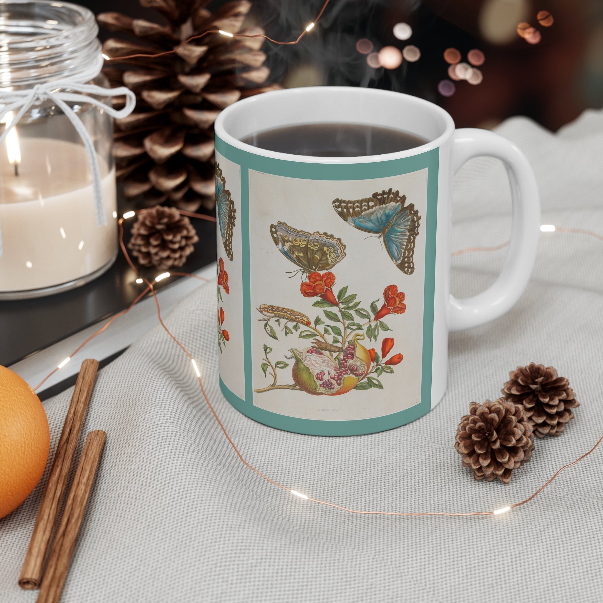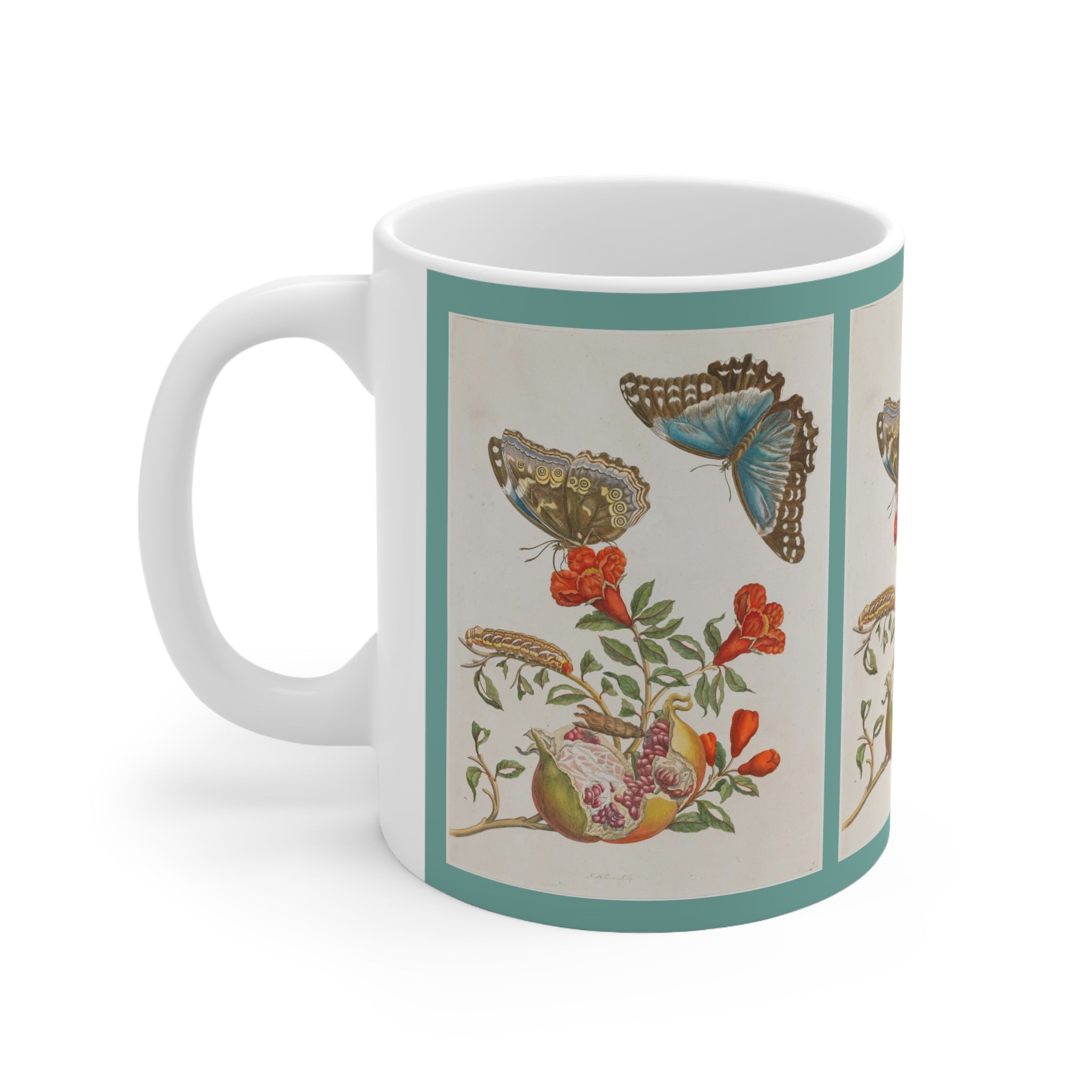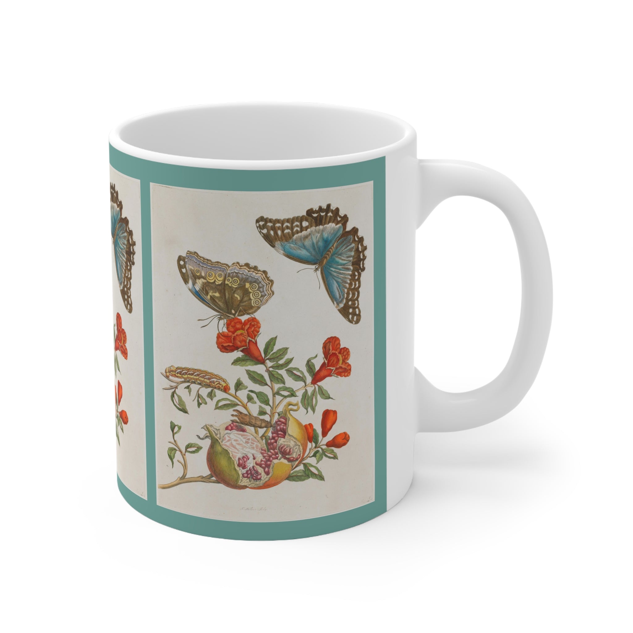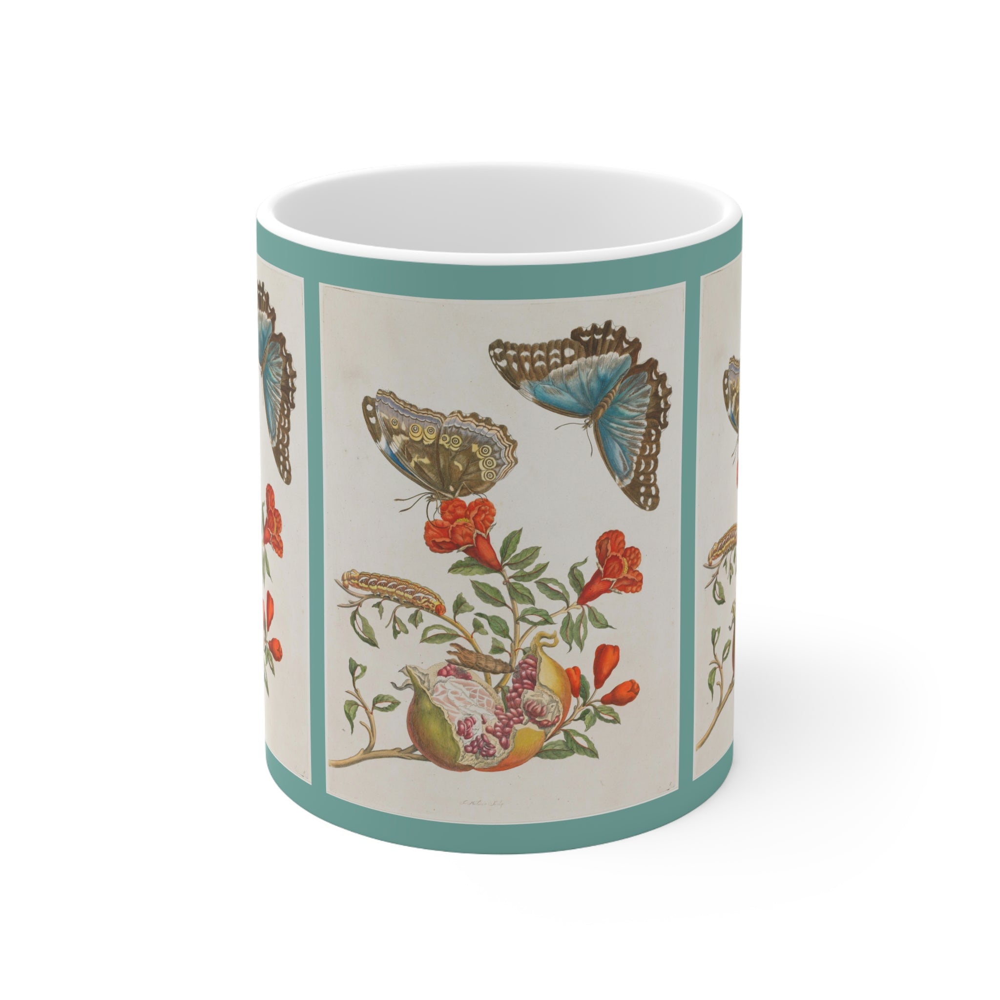 Blue Butterflies and Pomegranate is one of Merian's most famous works. It depicts a pomegranate branch with two Morpho menelaus butterflies, a species native to South America. Merian was one of the first artists to use a microscope to study plants and insects, which allowed her to capture their intricate details with remarkable accuracy.