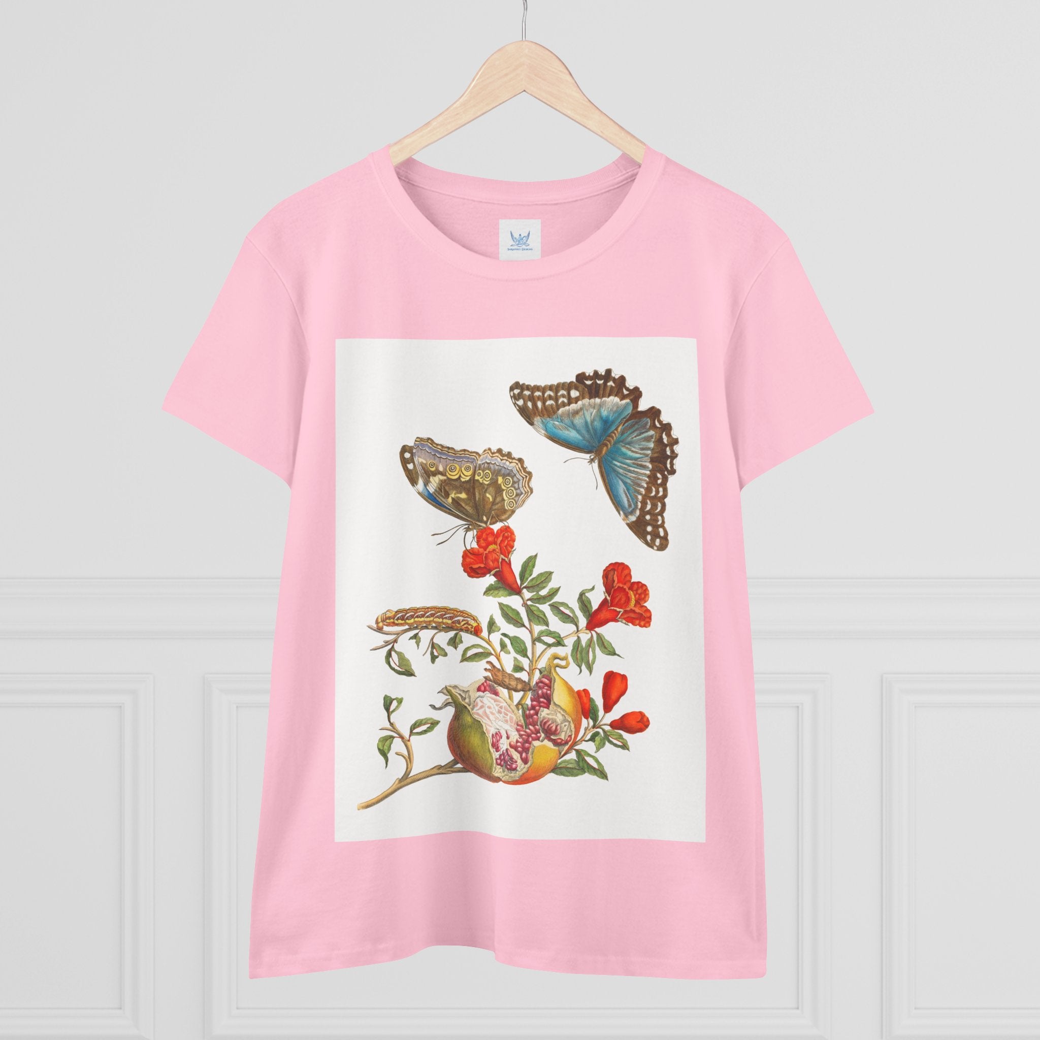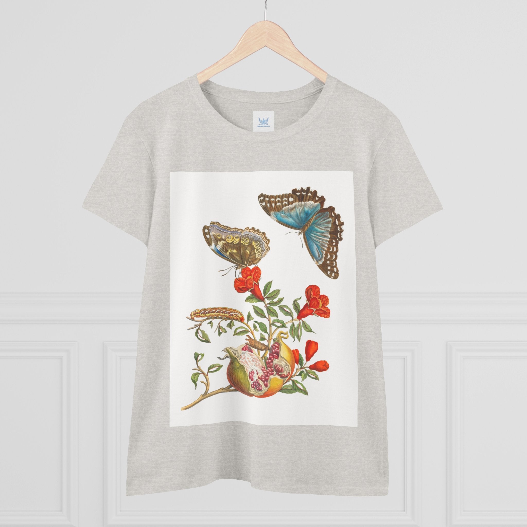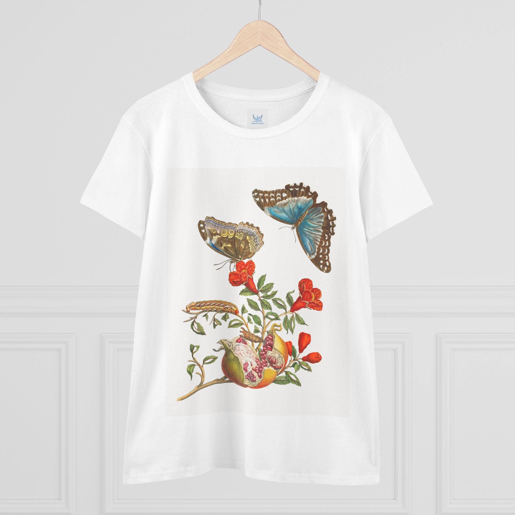 Blue Butterflies and Pomegranate is one of the most celebrated works of pioneering naturalist Maria Sibylla Merian (1647–1717). The illustration depicts a flowering pomegranate branch alongside two vivid Morpho menelaus butterflies, a species native to South America. Merian was among the first artists to use microscopes to study insects and plants, capturing their forms with extraordinary precision and reshaping the scientific study of metamorphosis and natural history through art.
